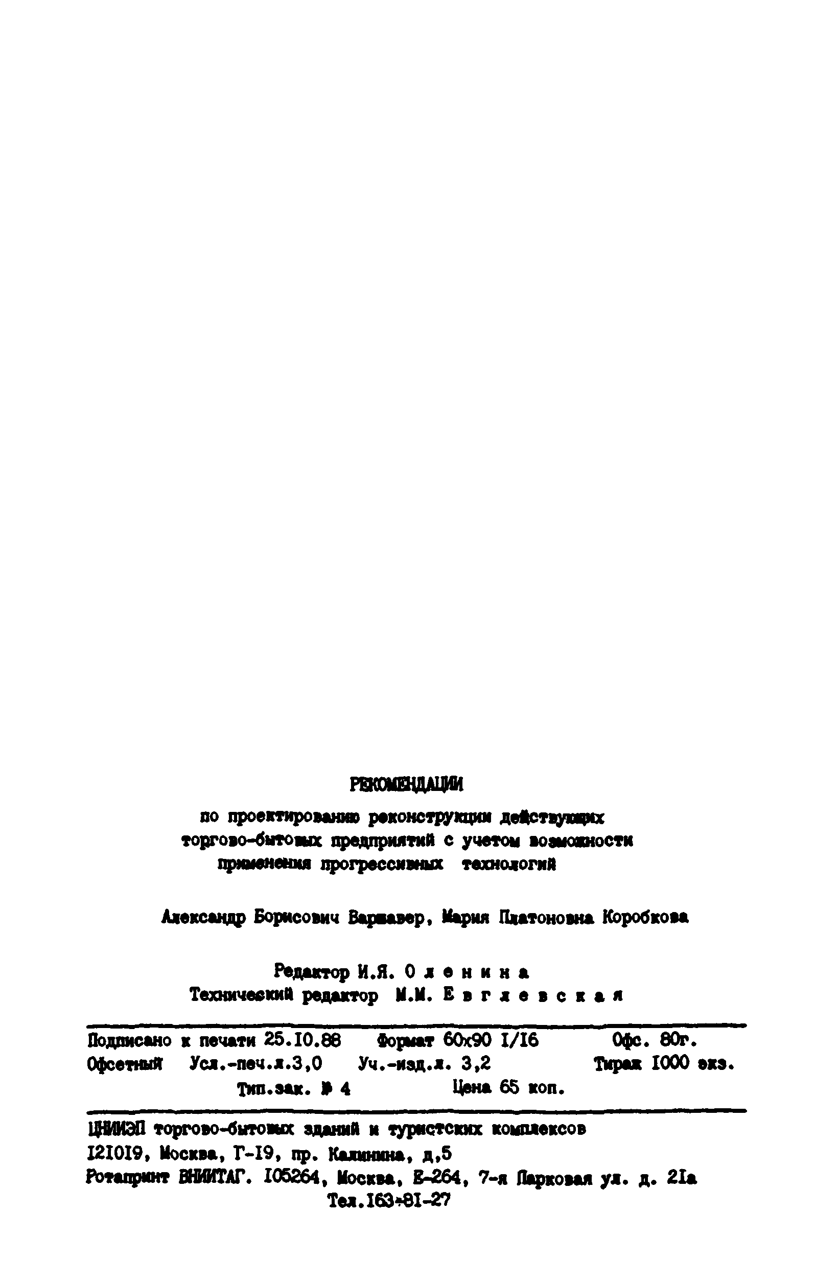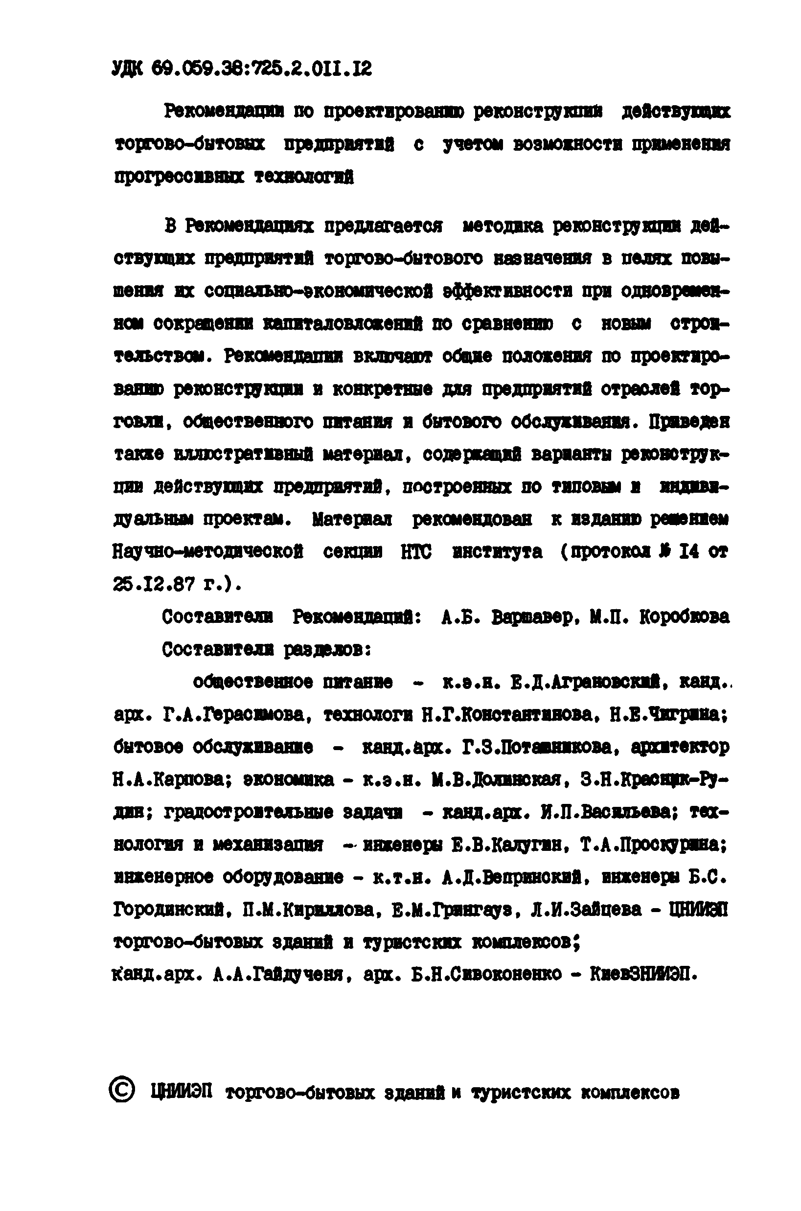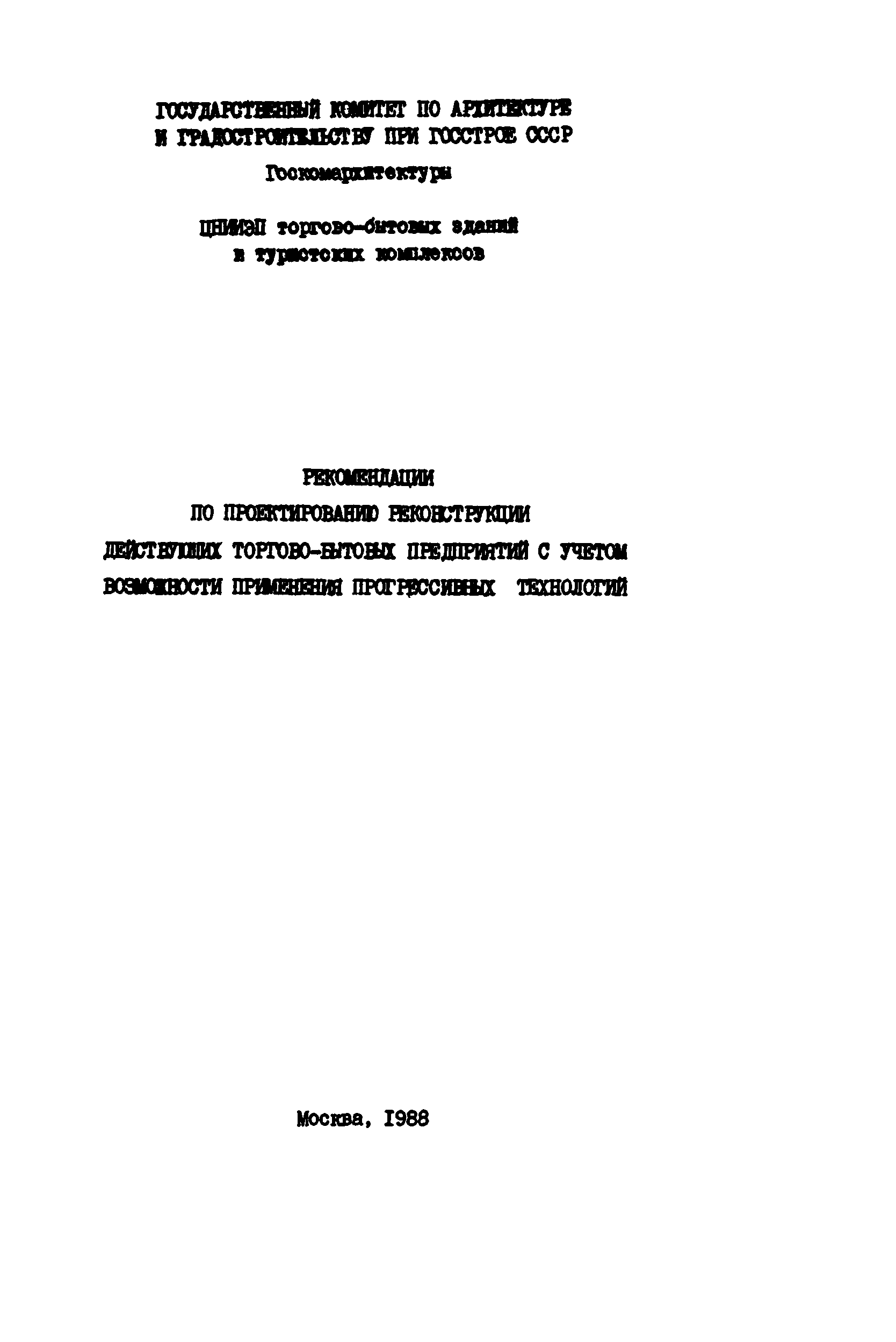| Название рус.: | Рекомендации по проектированию реконструкции действующих торгово-бытовых предприятий с учетом возможности применения прогрессивных технологий |