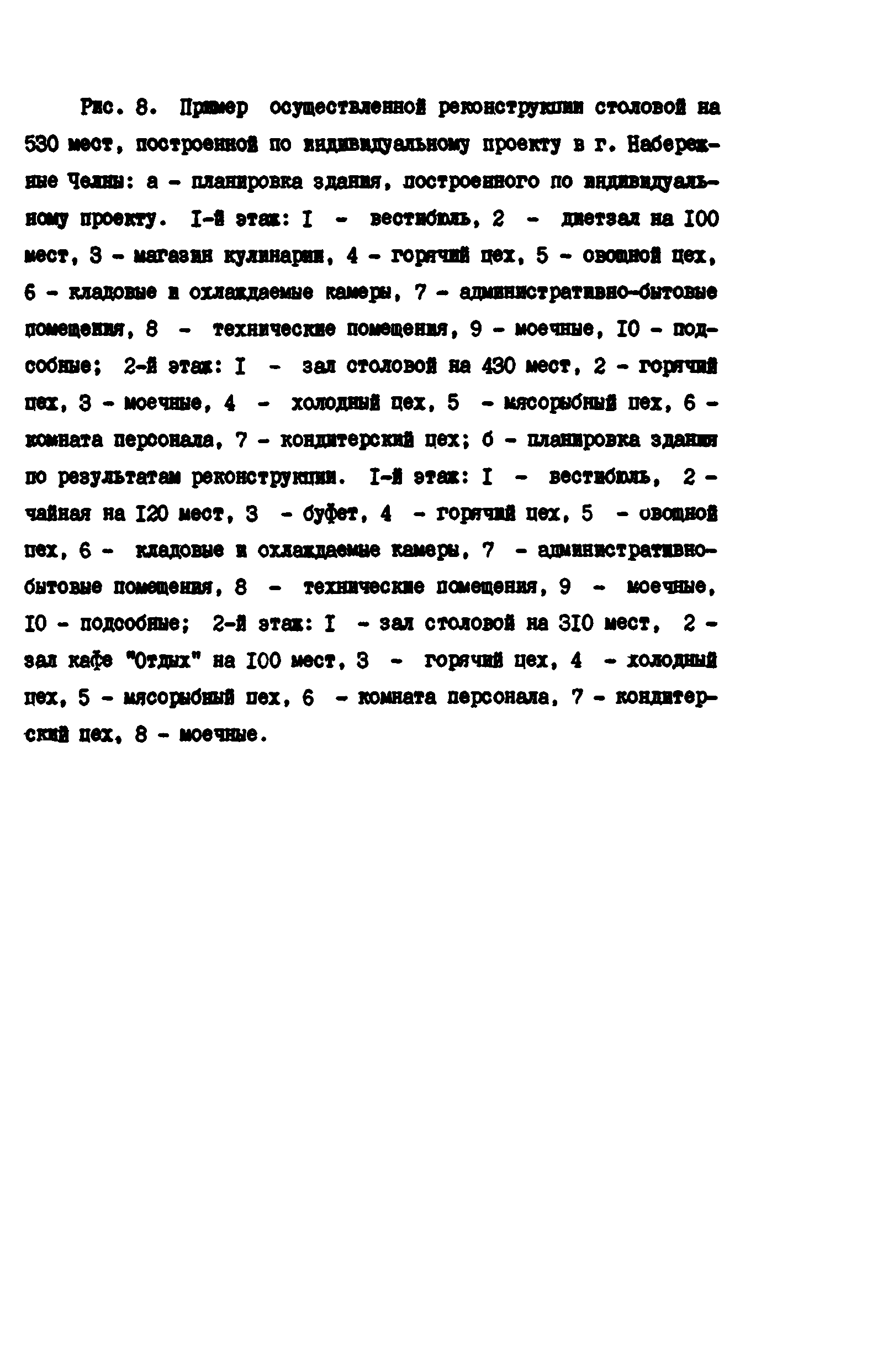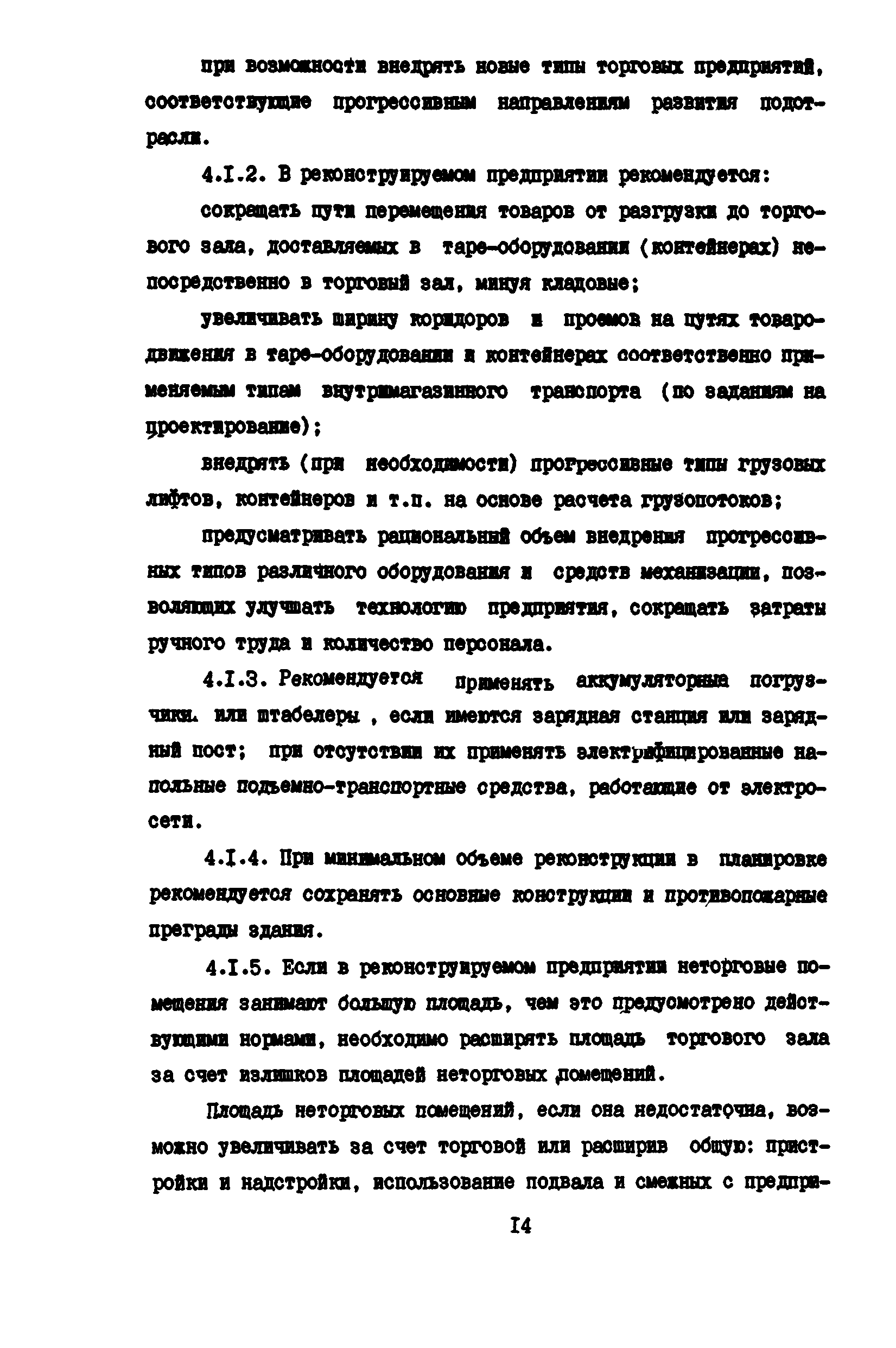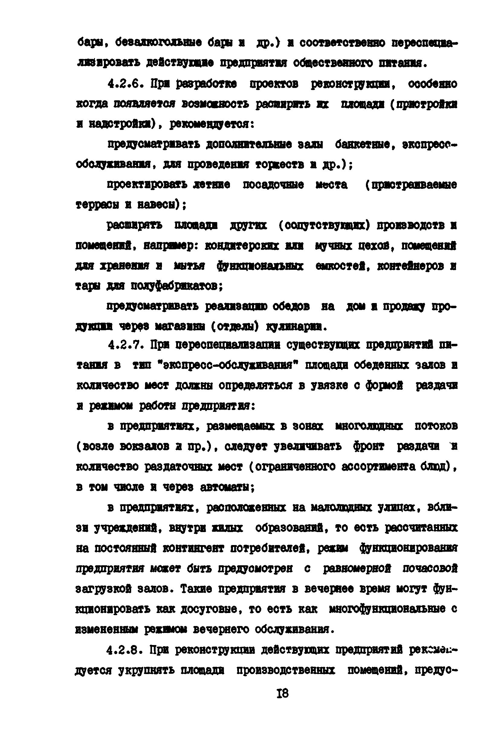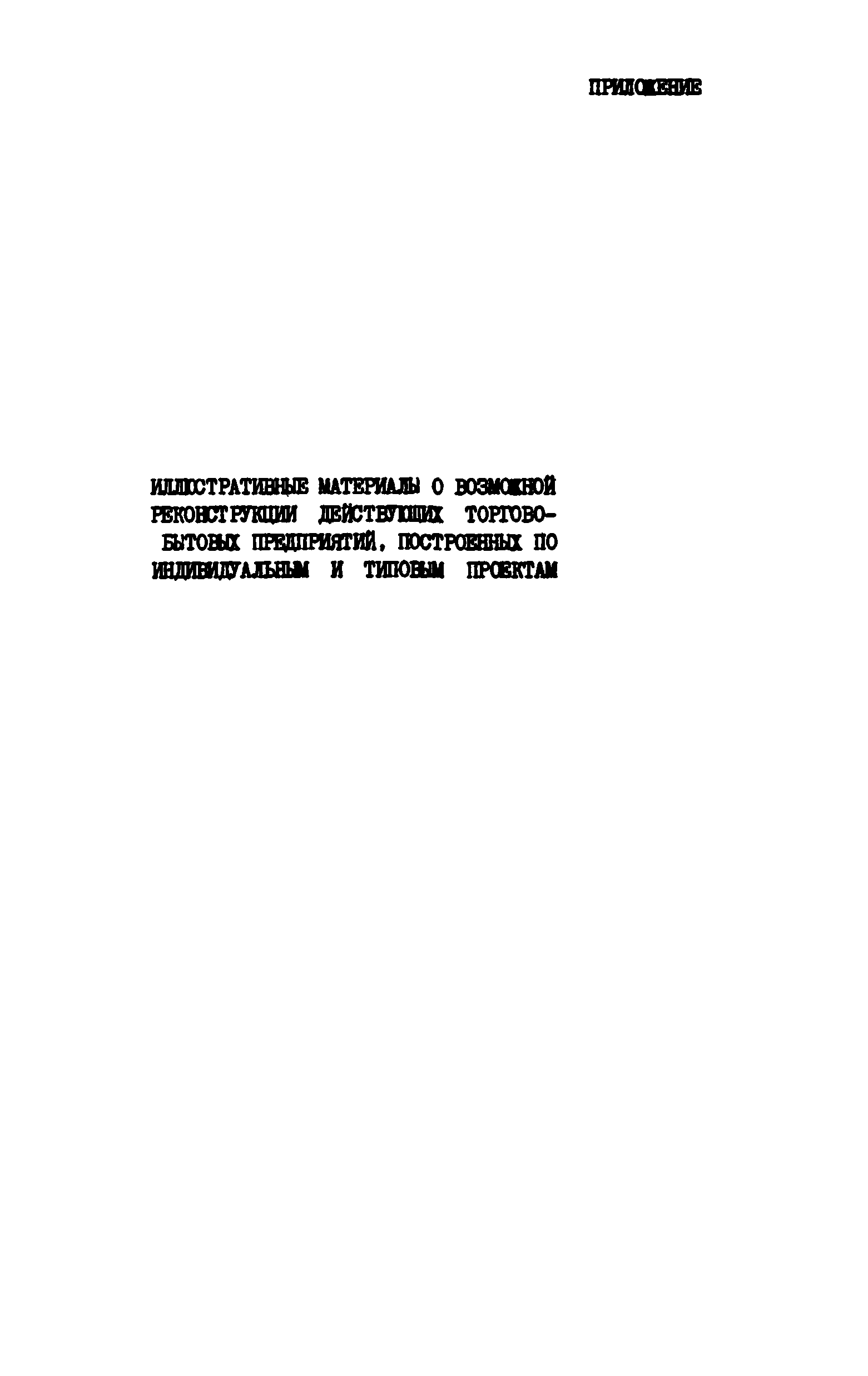 | Оглавление: | Введение 1. Цели и методы реконструкции действующих предприятий 2. Исходные материалы для разработки проектов реконструкции (предпроектные работы) 3. Общие положения по проектированию реконструкции 4. Дополнительные рекомендации по проектированию реконструкции 5. Оценка экономической эффективности капитальных вложений в реконструкцию действующих торгово-бытовых предприятий Приложение. Иллюстративные материалы о возможной реконструкции действующих торгово-бытовых предприятий |