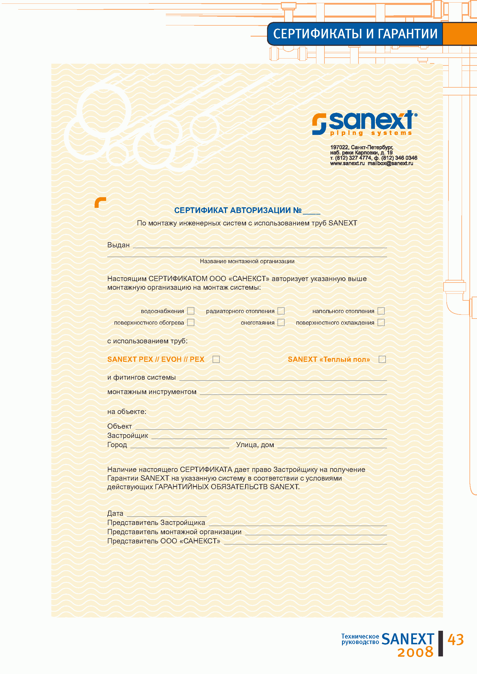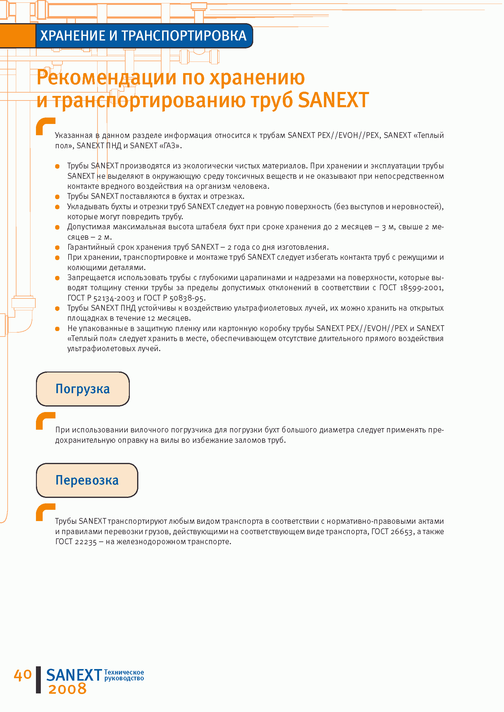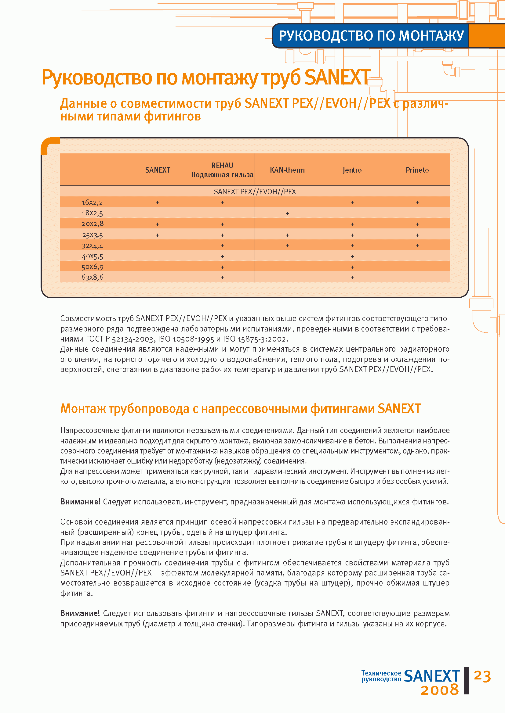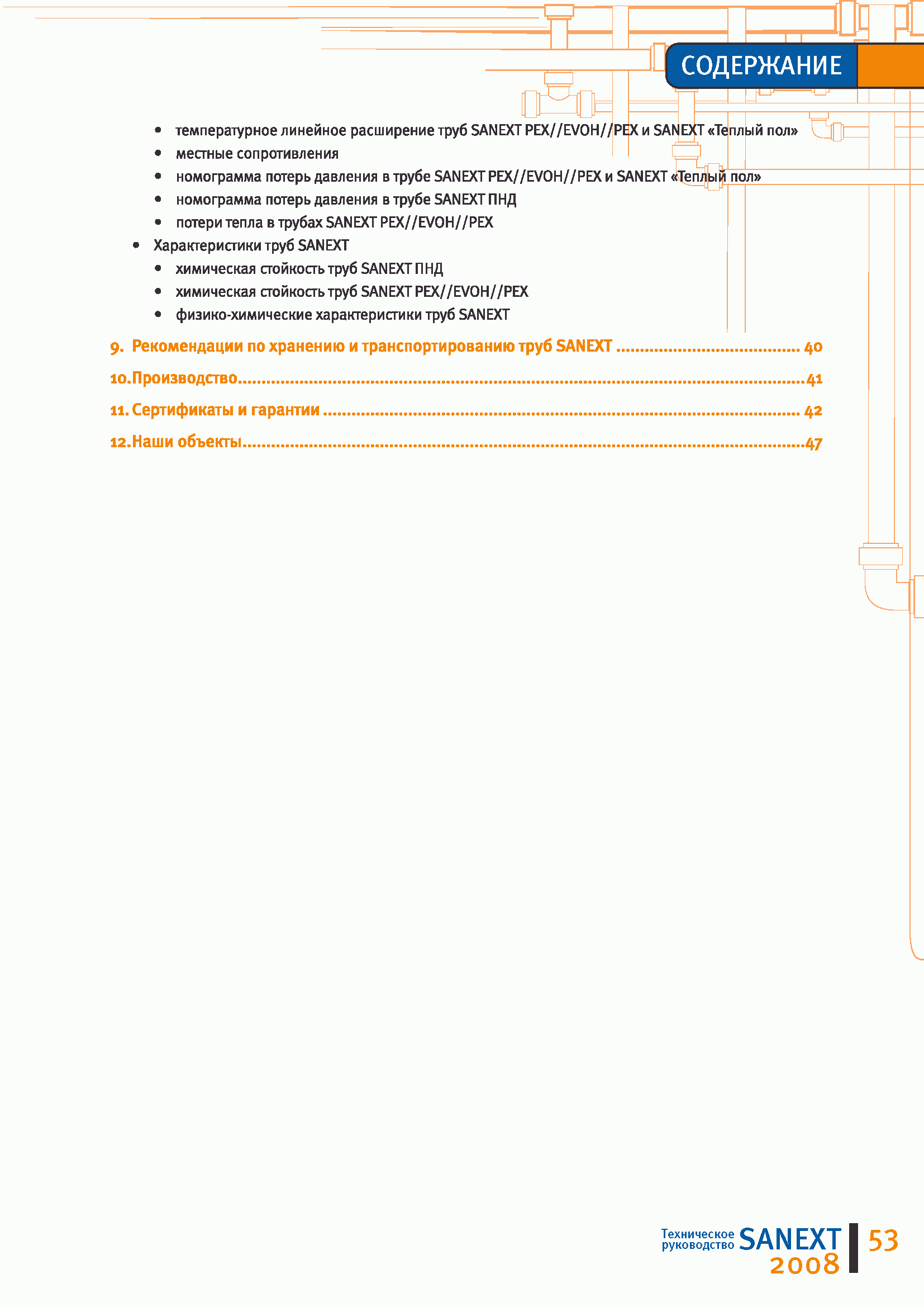 Трубопроводные системы на основе полимерных труб SANEXT. Техническое руководство| Статус: | действует | | Название рус.: | Трубопроводные системы на основе полимерных труб SANEXT. Техническое руководство | | Дата добавления в базу: | 01.09.2013 | | Дата актуализации: | 01.01.2021 | | Оглавление: | 1. Информация о компании 2. SANEXT PEX//EVON//PEX универсальные трубы 3. SANEXT "Теплый пол" 4. SANEXT ПНД (NDPE) 5. SANEXT "Газ" 6. Фитинги SANEXT 7. Руководство по монтажу труб SANEXT 8. Технические данные и информация по проектированию 9. Рекомендации по хранению и транспортированию труб SANEXT 10. Производство 11. Сертификаты и гарантии 12. Наши объекты | | Утверждён: | ООО САНЕКСТ