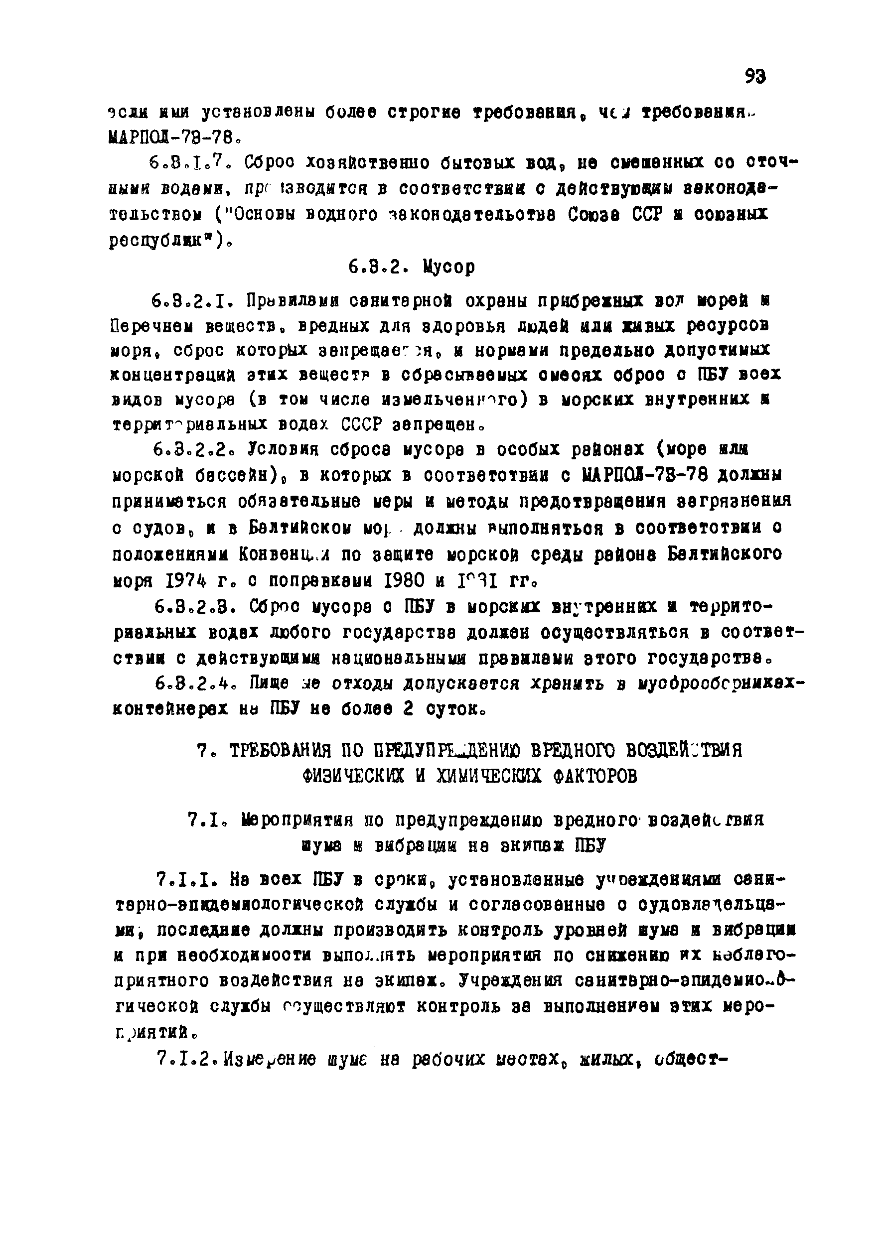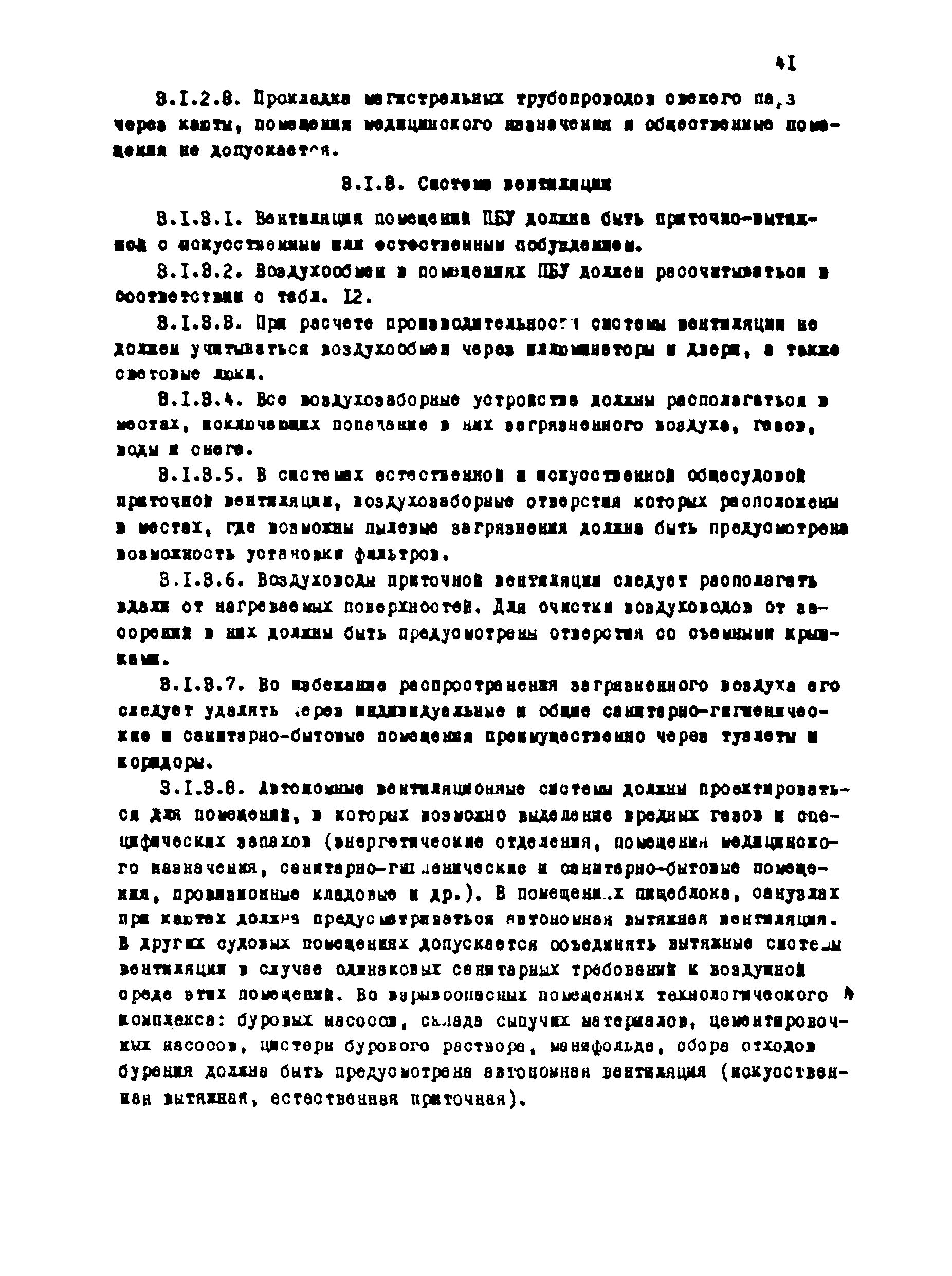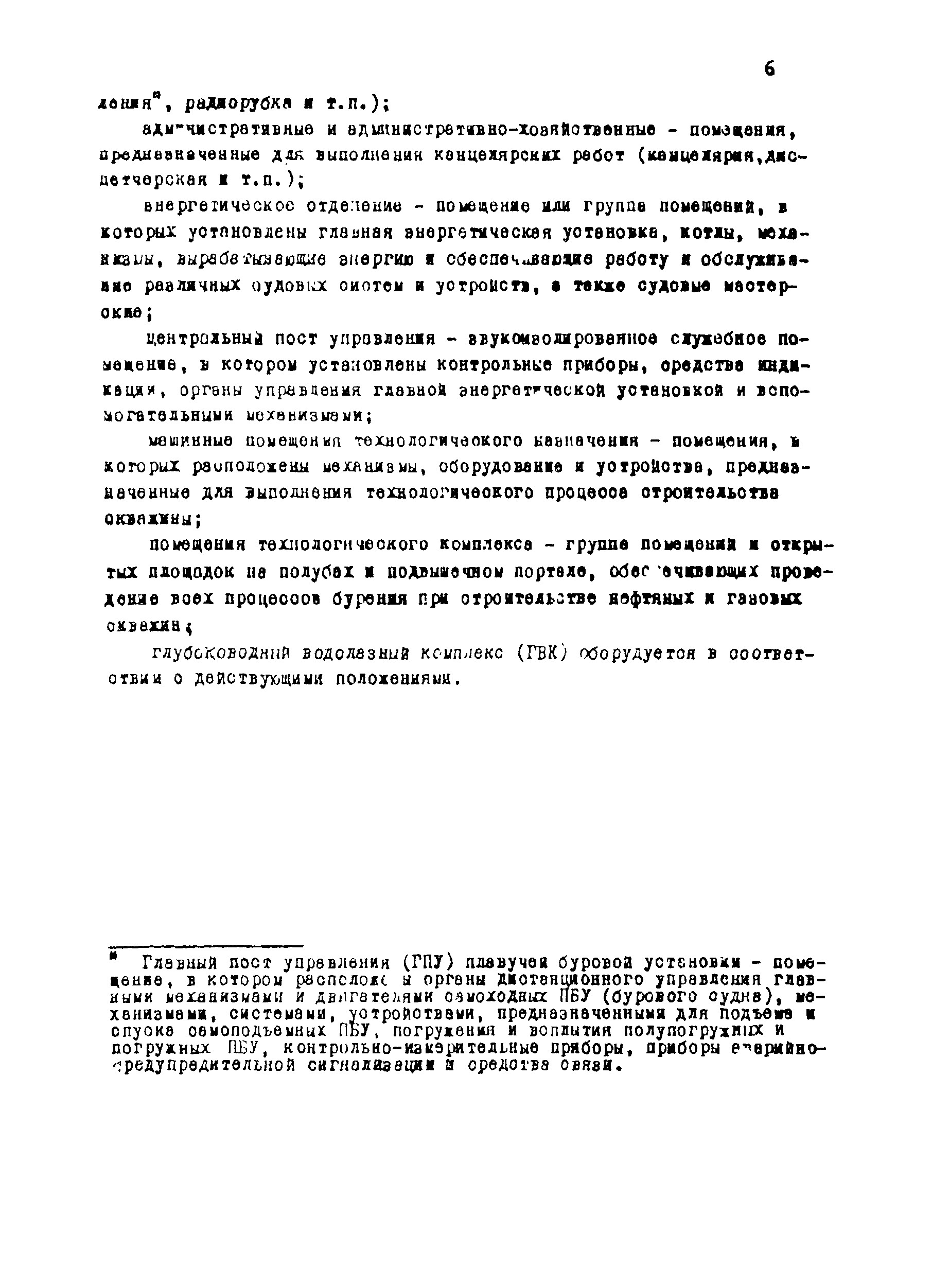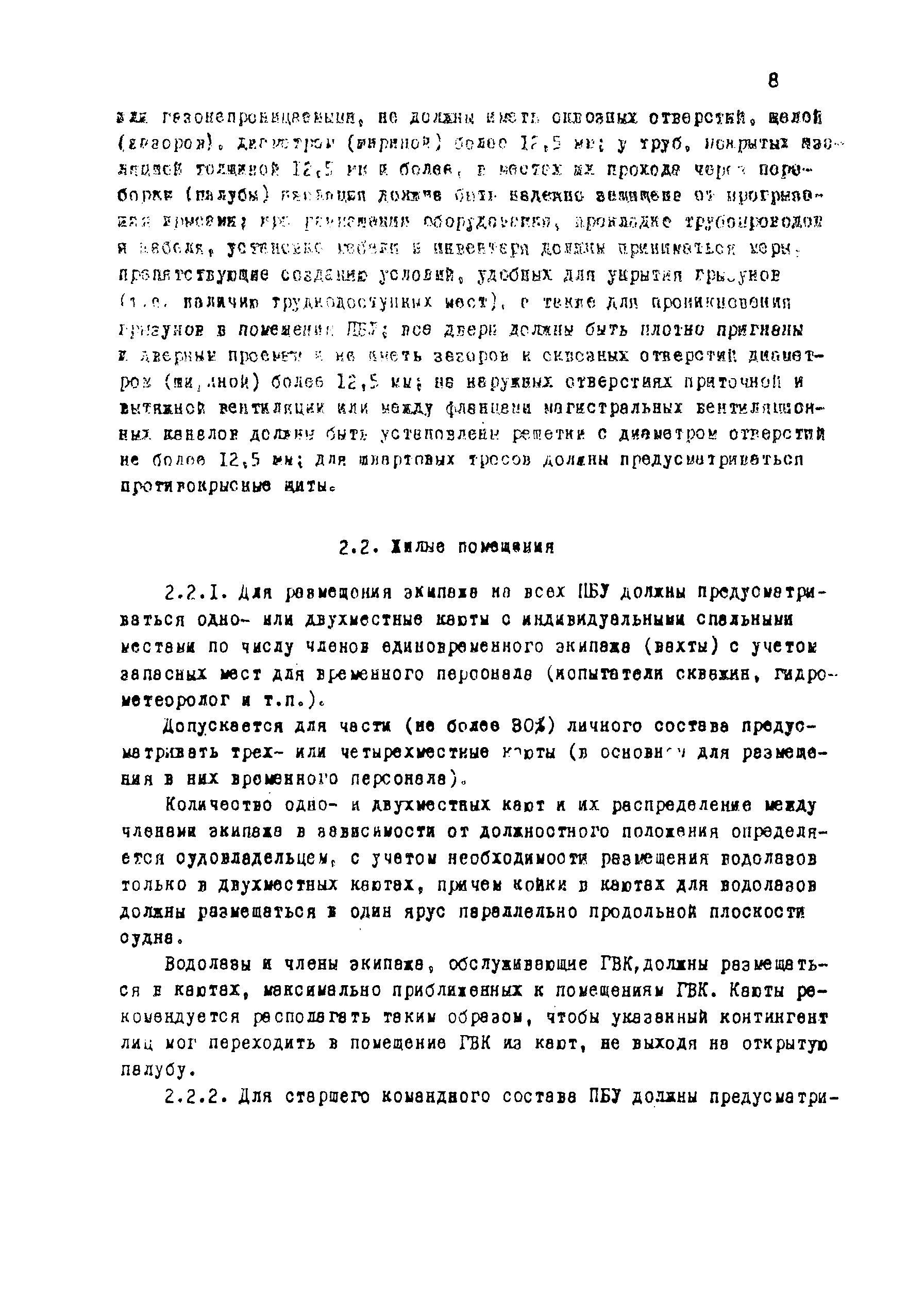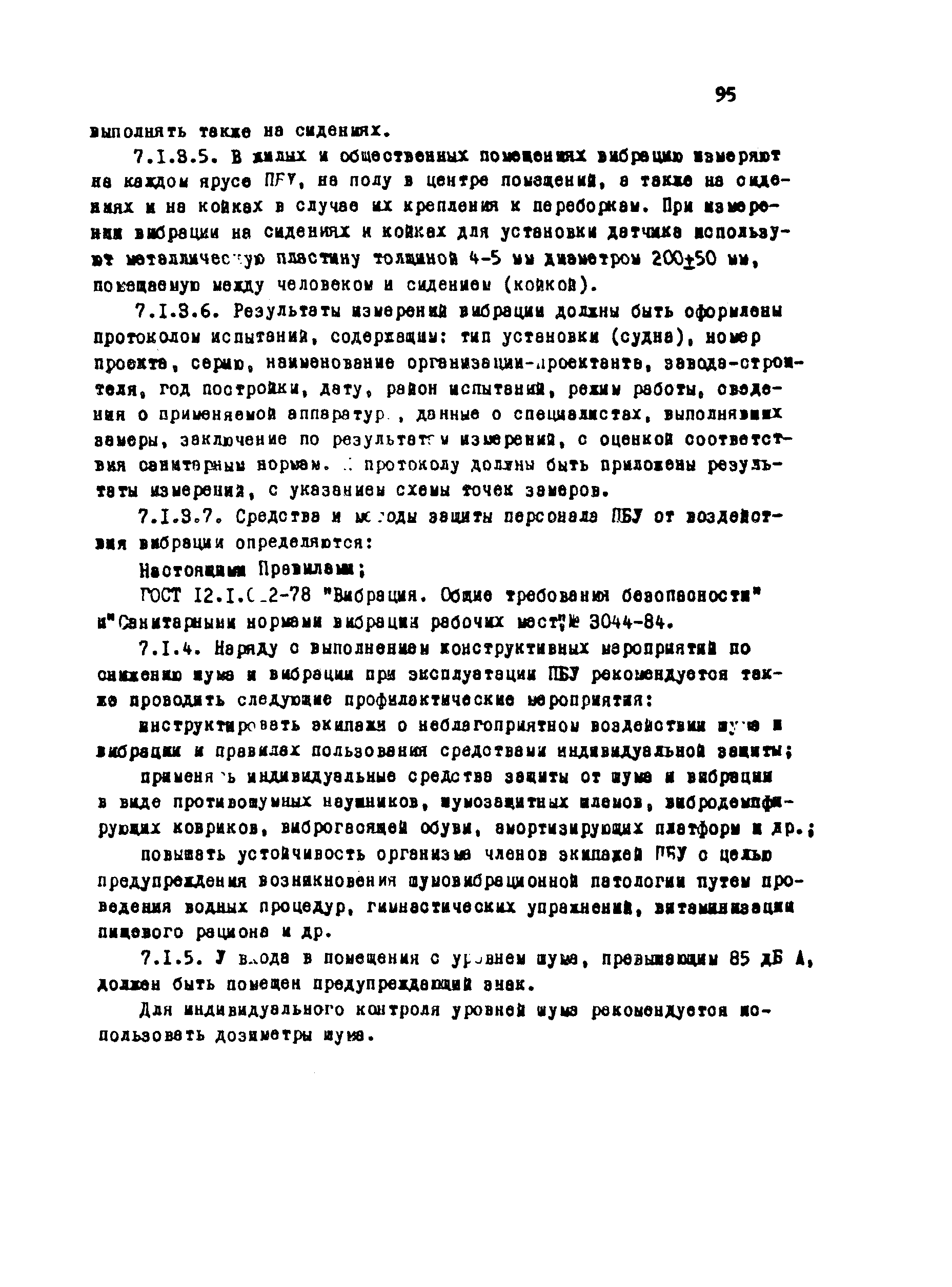 Санитарные правила для плавучих буровых установок| Статус: | отменен в рф | | Название рус.: | Санитарные правила для плавучих буровых установок | | Дата добавления в базу: | 01.09.2013 | | Дата актуализации: | 01.01.2021 | | Дата введения: | 01.01.1987 | | Дата окончания срока действия: | 29.04.2020 | | Область применения: | Правила устанавливают основные санитарно-гигиенические требования по устройству и оборудованию помещений, систем технологического комплекса при проектировании, строительстве, переоборудовании и ремонте плавучих буровых установок, предназначенных для выполнения буровых работ с целью разведки или добычи полезных ресурсов морского дна, а также требования по содержанию ПБУ при эксплуатации в целях создания благоприятных условий для труда, быта и отдыха экипажа, охраны окружающей среды. Действие Правил распространяется на самоходные и несамоходные ПБУ. На все остальные суда Мингазпрома распространяется действие "Санитарных правил для морских судов СССР", № 2641-82. | | Оглавление: | 1. Общие положения 1.1. Назначение и область применения Правил 1.2. Ответственность и контроль за выполнением требований Правил 1.3. Категория ПБУ 1.4. Определения и пояснения Часть 1. Требования к проектированию, строительству, переоборудованию и ремонту ПБУ 2. Помещения ПБУ 2.1. Общие положения 2.2. Жилые помещения 2.3. Общественные помещения 2.4. Санитарно-бытовые помещения 2.5. Санитарно-гигиенические помещения 2.6. Помещения медицинского назначения 2.7. Помещения пищевого блока и продовольственных кладовых 2.8. Служебные помещения 2.9. Помещения энергетических отделений 2.10. Помещения технологического комплекса 3. Системы ПБУ 3.1. Системы отопления, вентиляции и кондиционирования воздуха 3.2. Системы водоснабжения 3.3. Сточные системы 3.4. Устройства для сбора, обработки и удаления мусора 3.5. Система нефтесодержащих вод 3.6. Освещение 4. Защита от вредного воздействия физических и химических факторов 4.1. Защита от вредного воздействия шума и вибрации 4.2. Защита от инфракрасного излучения 4.3. Защита от электромагнитных полей 4.4. Защита от ионизирующих излучений 4.5. Требования к синтетическим полимерным материалам Часть 2. Санитарные требования, подлежащие выполнению при эксплуатации ПБУ 5. Санитарные требования по содержанию помещений ПБУ, приготовлению пищи и личной гигиене 5.1. Содержание помещений ПБУ 5.2. Постельные принадлежности для экипажа 5.3. Санитарные требования по содержанию помещений пищеблока, хранению, кулинарной обработке пищевых продуктов. Правила личной гигиены работников пищеблока 5.4. Требования к организации производственных процессов 6. Требования к эксплуатации судовых систем 6.1. Эксплуатация систем вентиляции и кондиционирования воздуха 6.2. Содержание систем водоснабжения 6.3. Условия удаления сточных, нефтесодержащих вод и мусора 7. Требования по предупреждению вредного воздействия физических и химических факторов 7.1. Мероприятия по предупреждению вредного воздействия шума и вибрации на экипаж ПБУ 7.2. Защита от инфракрасного излучения, электромагнитных полей радиочастот, ионизирующего излучения и статического электричества 7.3. Защита от токсических газов 7.4. Дезинфекция, дезинсекция и дератизация 8. Требования к режиму труда и отдыха экипажа ПБУ 9. Санитарно-противоэпидемическое обеспечение и медицинское обслуживание экипажей ПБУ 9.1. Общие положения 9.2. М