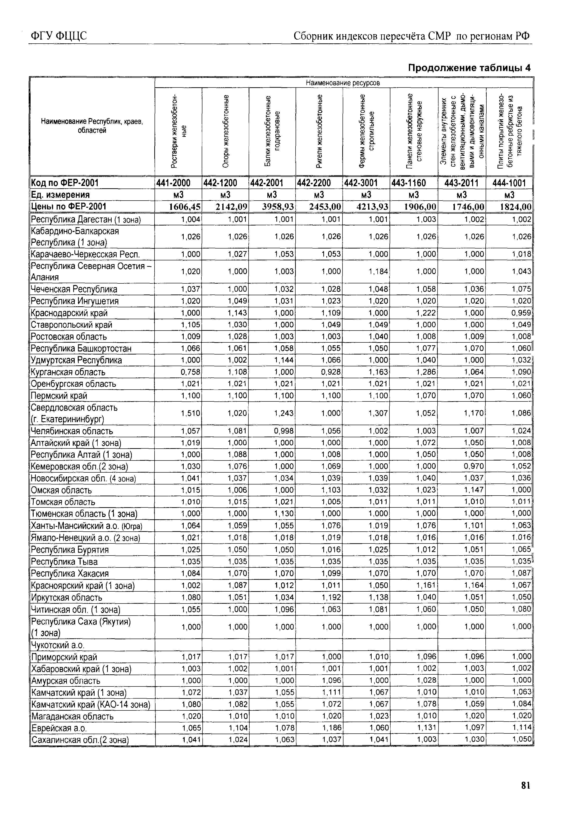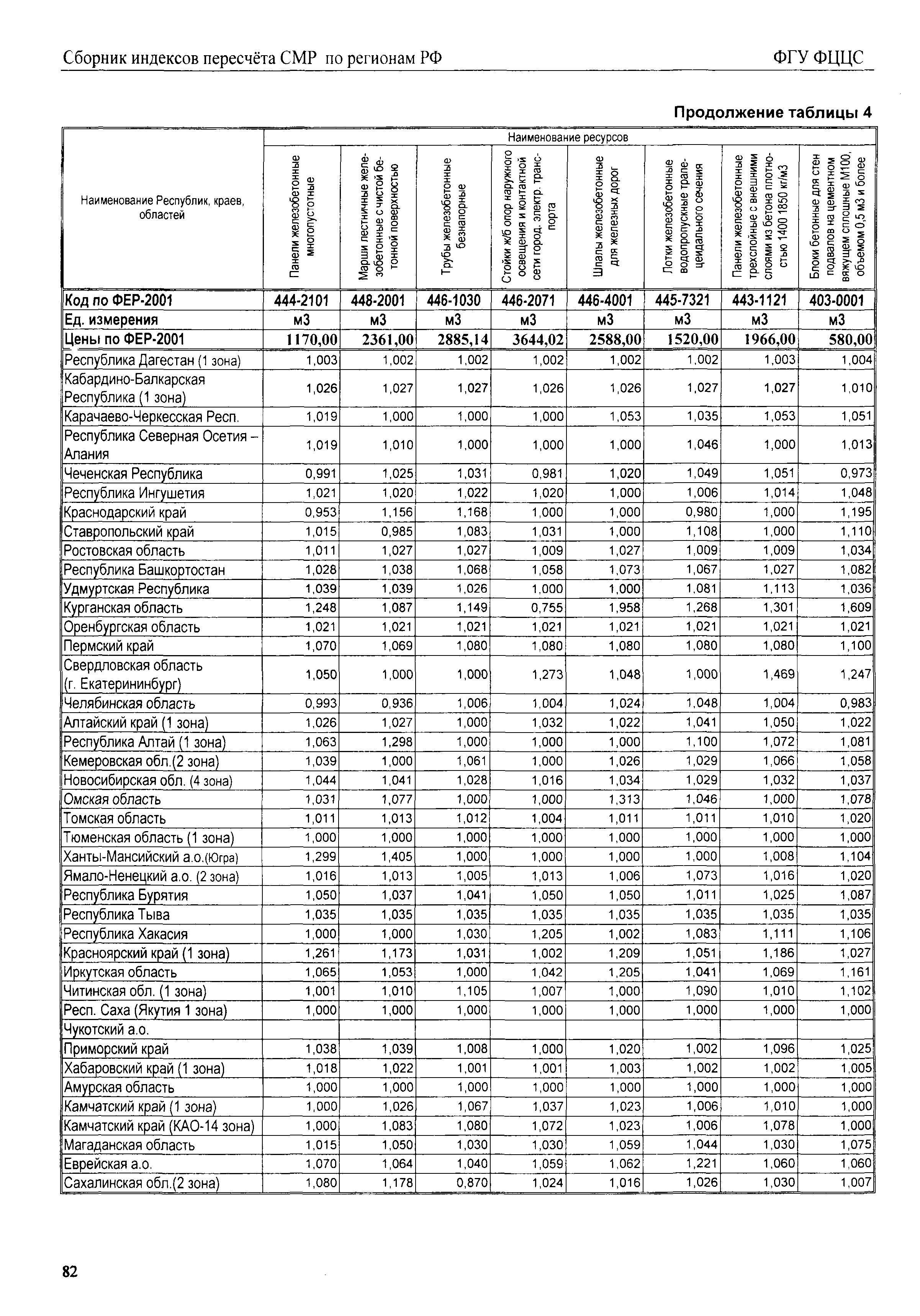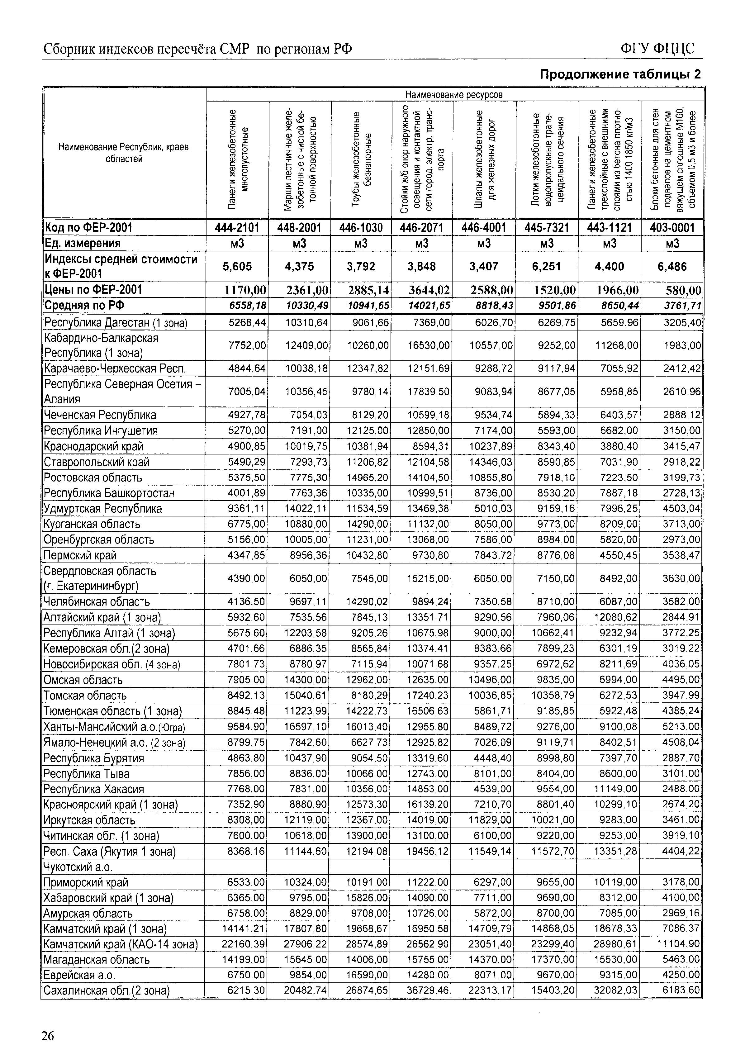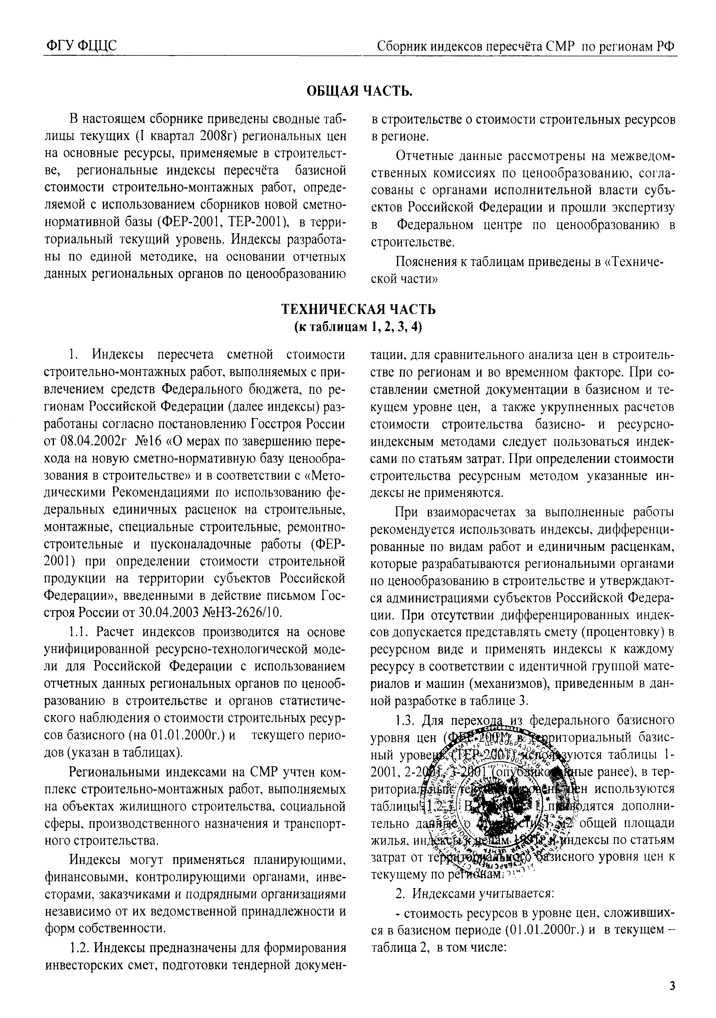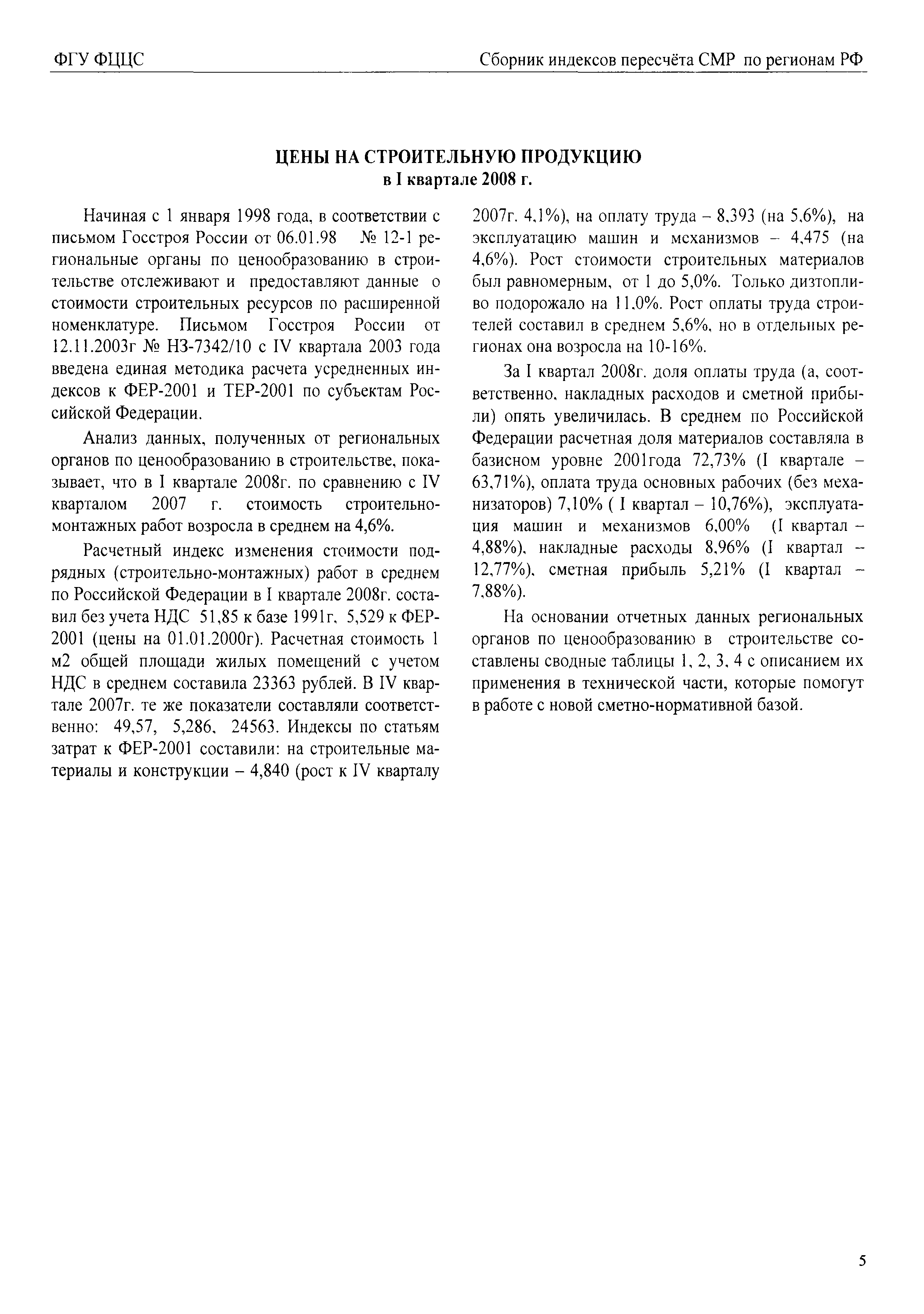 Межрегиональный сборник индексов пересчета сметной стоимости строительно-монтажных работ по субъектам Российской Федерации на I квартал 2008 г.| Статус: | не действует | | Название рус.: | Межрегиональный сборник индексов пересчета сметной стоимости строительно-монтажных работ по субъектам Российской Федерации на I квартал 2008 г. | | Дата добавления в базу: | 01.09.2013 | | Дата актуализации: | 01.09.2013 | | Область применения: | В сборнике приведены сводные таблицы текущих (I квартал 2008 г.) региональных цен на основные ресурсы, применяемые в строительстве, региональные индексы пересчета базисной стоимости строительно-монтажных работ, определяемой с использованием сборников новой сметно-нормативной базы (ФЕР-2001, ТЕР-2001), в территориальный текущий уровень. Индексы разработаны по единой методике, на основании отчетных данных региональных органов по ценообразованию в строительстве о стоимости строительных ресурсов в регионе. | | Оглавление: | Общая часть Техническая часть (к таблицам 1, 2, 3, 4) Цены на строительную продукцию в I квартале 2008г. Анализ роста индексов и стоимости 1 м2 по регионам РФ в I кв. 2008 г. Таблица А Расчетная стоимость 1 м2 общей площади жилья, индексы (без НДС) по регионам Российской Федерации на основании отчетных данных региональных органов по ценообразованию в строительстве за I квартал 2008 г. Таблица 1 Сметная стоимость строительных ресурсов (без НДС) в руб. Таблица 2 Индексы на отдельные виды ресурсов (к заложенным в ФЕР-2001). Таблица 3 Индексы роста стоимости строительных ресурсов к предыдущему кварталу. Таблица 4 Региональные индексы к ФЕР-2001 по видам строительства (без НДС). Таблица 5 Индексы на технологическое оборудование за I квартал 2008 г. Индексы на прочие работы и затраты за I квартал 2008 г. |