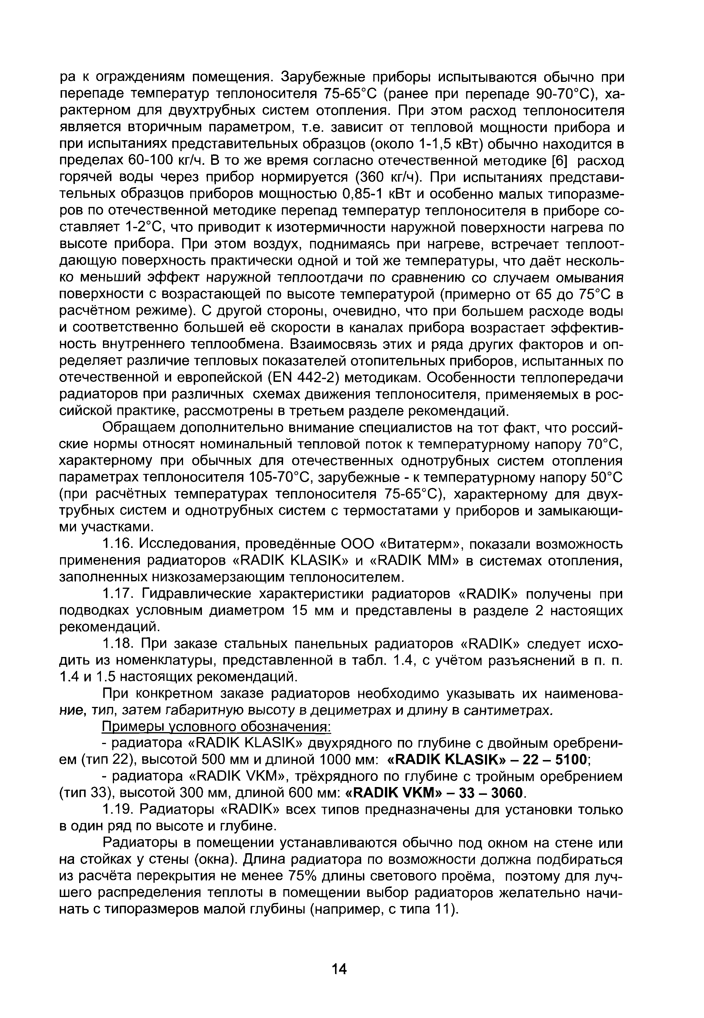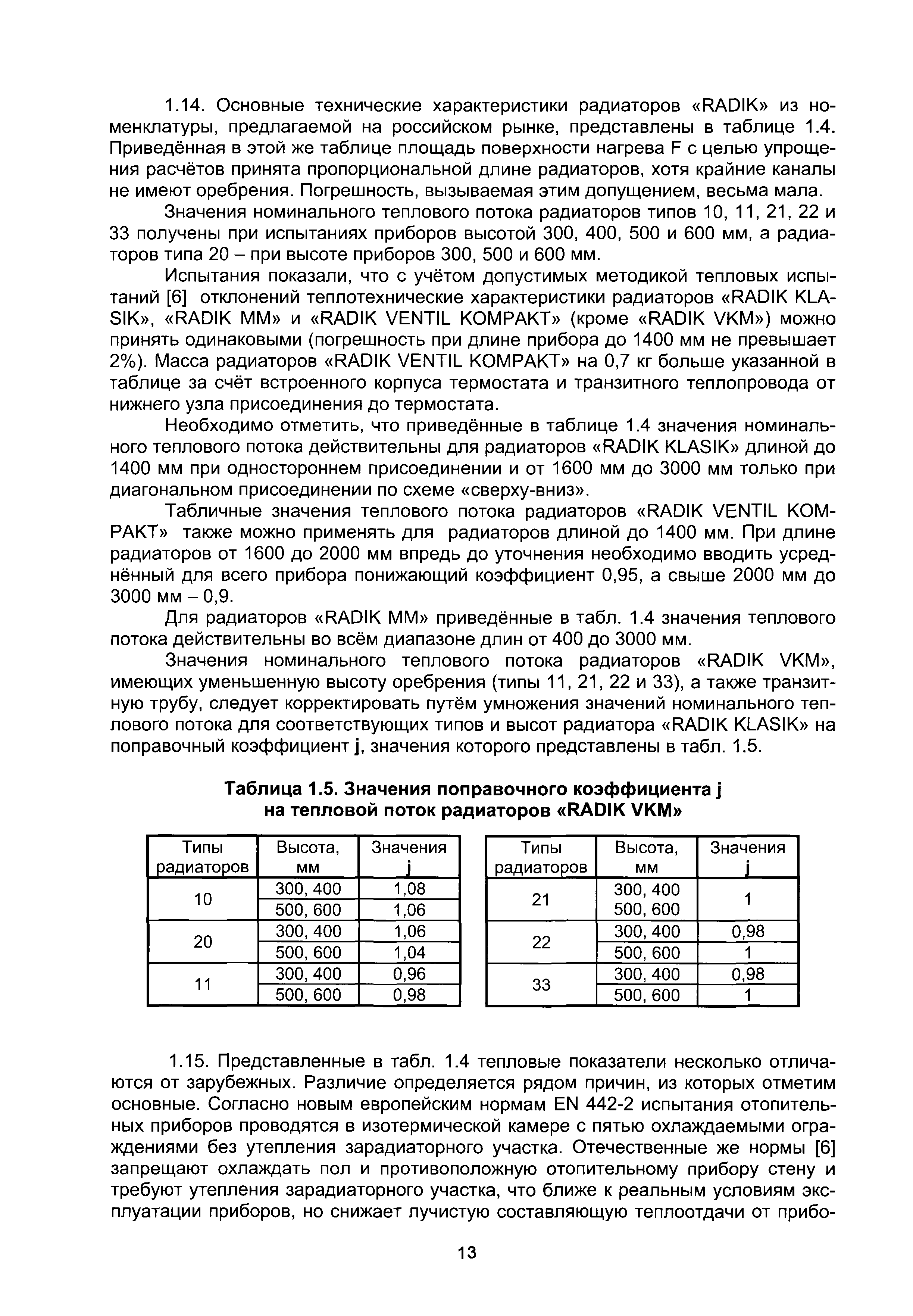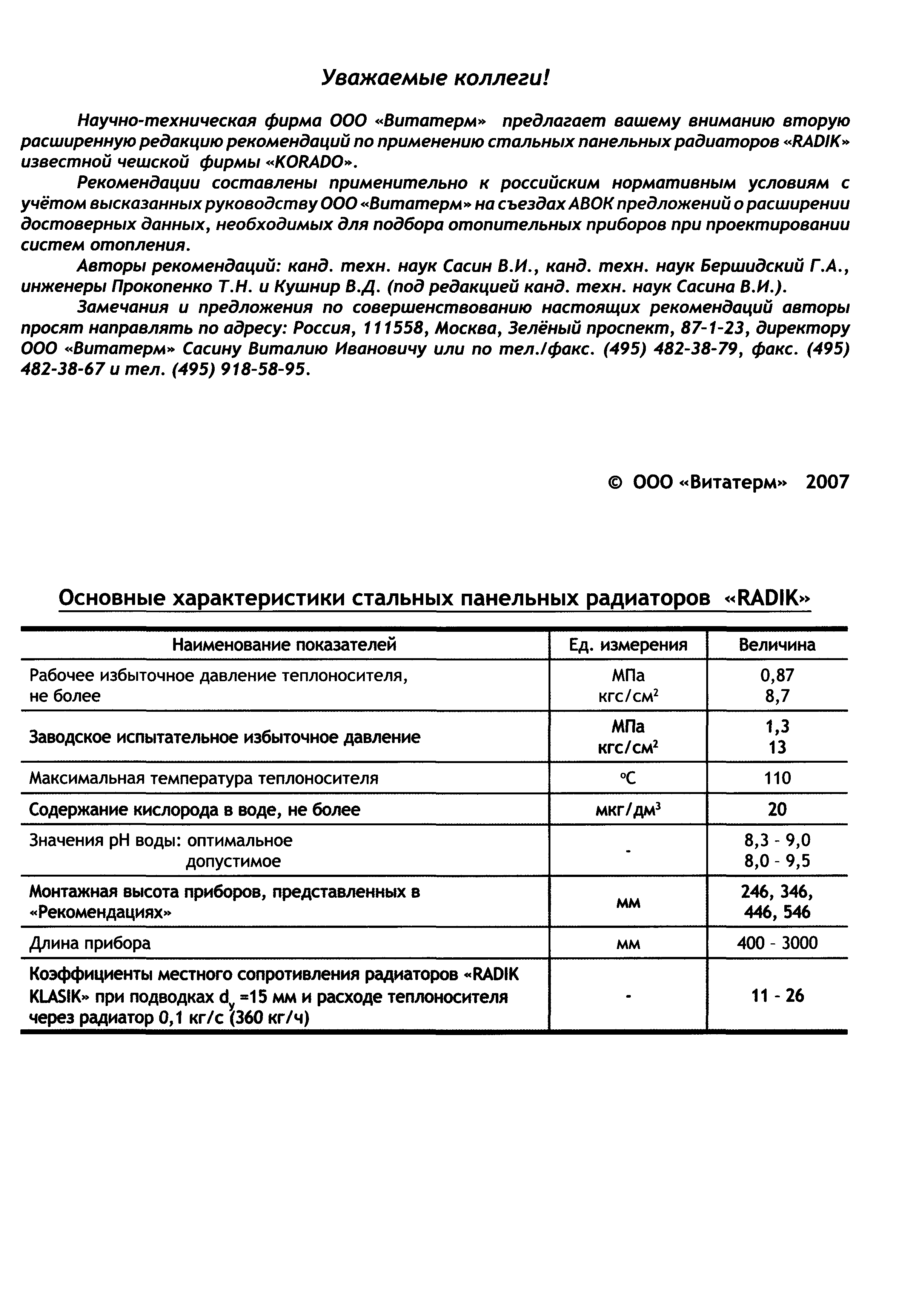 Рекомендации по применению стальных панельных радиаторов "Radik" (вторая редакция)| Статус: | действует | | Название рус.: | Рекомендации по применению стальных панельных радиаторов "Radik" (вторая редакция) | | Дата добавления в базу: | 01.09.2013 | | Дата актуализации: | 01.01.2021 | | Оглавление: | 1. Основные технические характеристики стальных панельных радиаторов "RADIK" 2. Гидравлический расчет 3. Тепловой расчет 4. Пример расчёта этажестояка однотрубной системы водяного отопления 5. Указания по монтажу стальных панельных радиаторов фирмы "RADIK" и основные требования к их эксплуатации 6. Список используемой литературы Приложение 1 Приложение 2 Приложение 3 | | Разработан: | ООО ВИТАТЕРМ