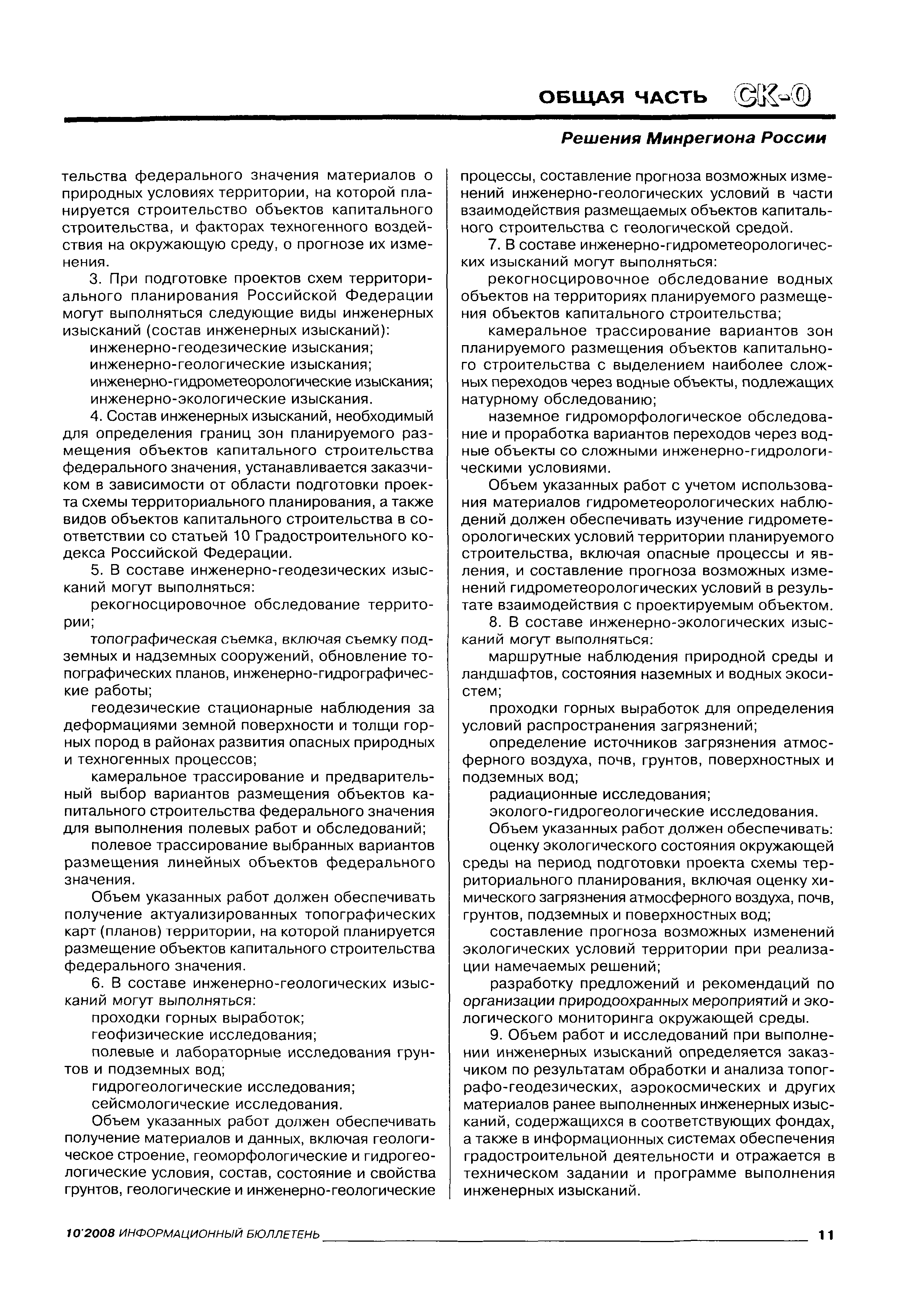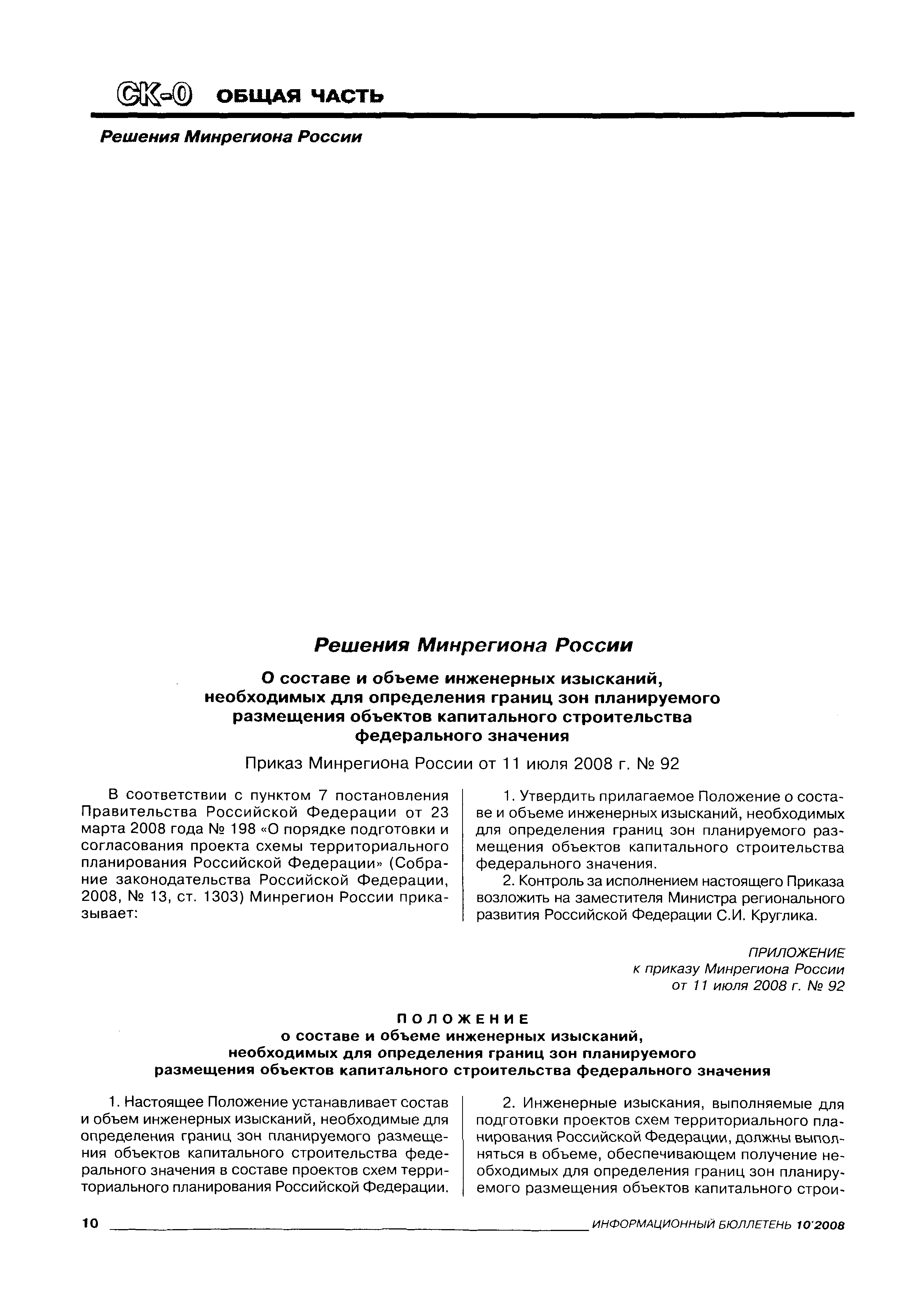 Положение о составе и объеме инженерных изысканий, необходимых для определения границ зон планируемого размещения объектов капитального строительства федерального значения| Статус: | действует | | Название рус.: | Положение о составе и объеме инженерных изысканий, необходимых для определения границ зон планируемого размещения объектов капитального строительства федерального значения | | Дата добавления в базу: | 01.09.2013 | | Дата актуализации: | 01.01.2021 | | Дата введения: | 26.08.2008 | | Область применения: | Положение устанавливает состав и объем инженерных изысканий, необходимые для определения границ зон планируемого размещения объектов капитального строительства федерального значения в составе проектов схем территориального планирования Российской Федерации. | | Утверждён: | 11.07.2008 Минрегион России (92)