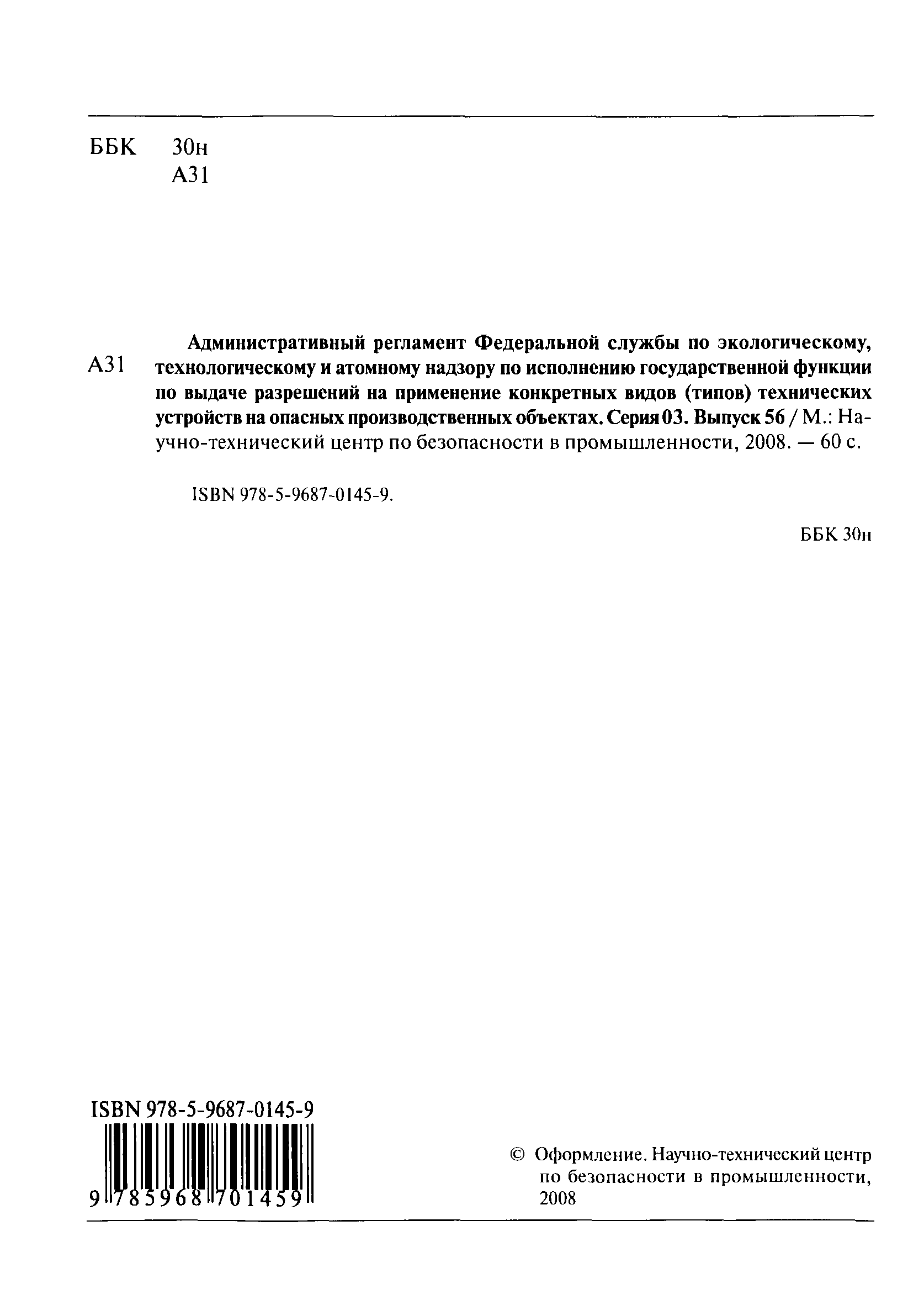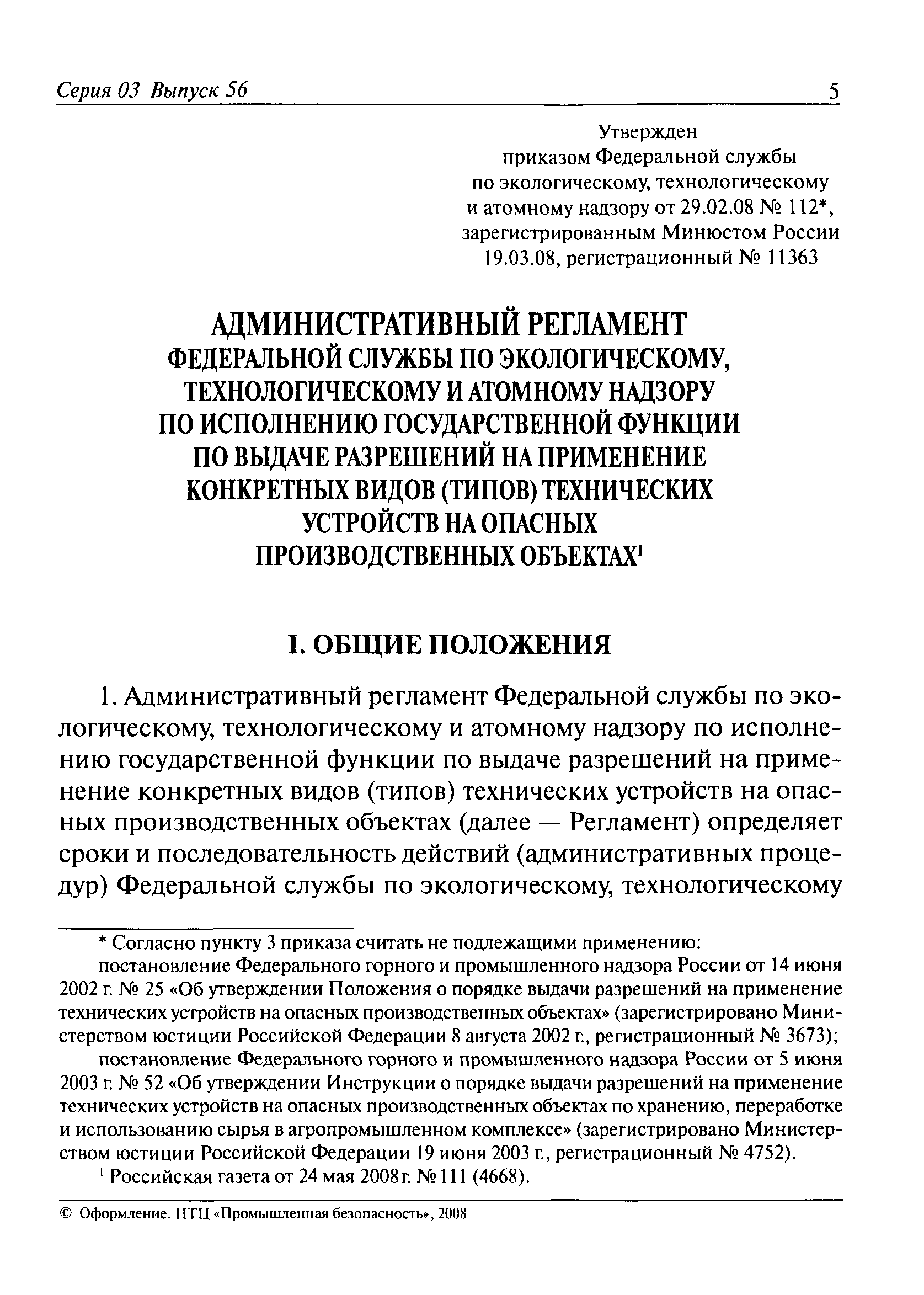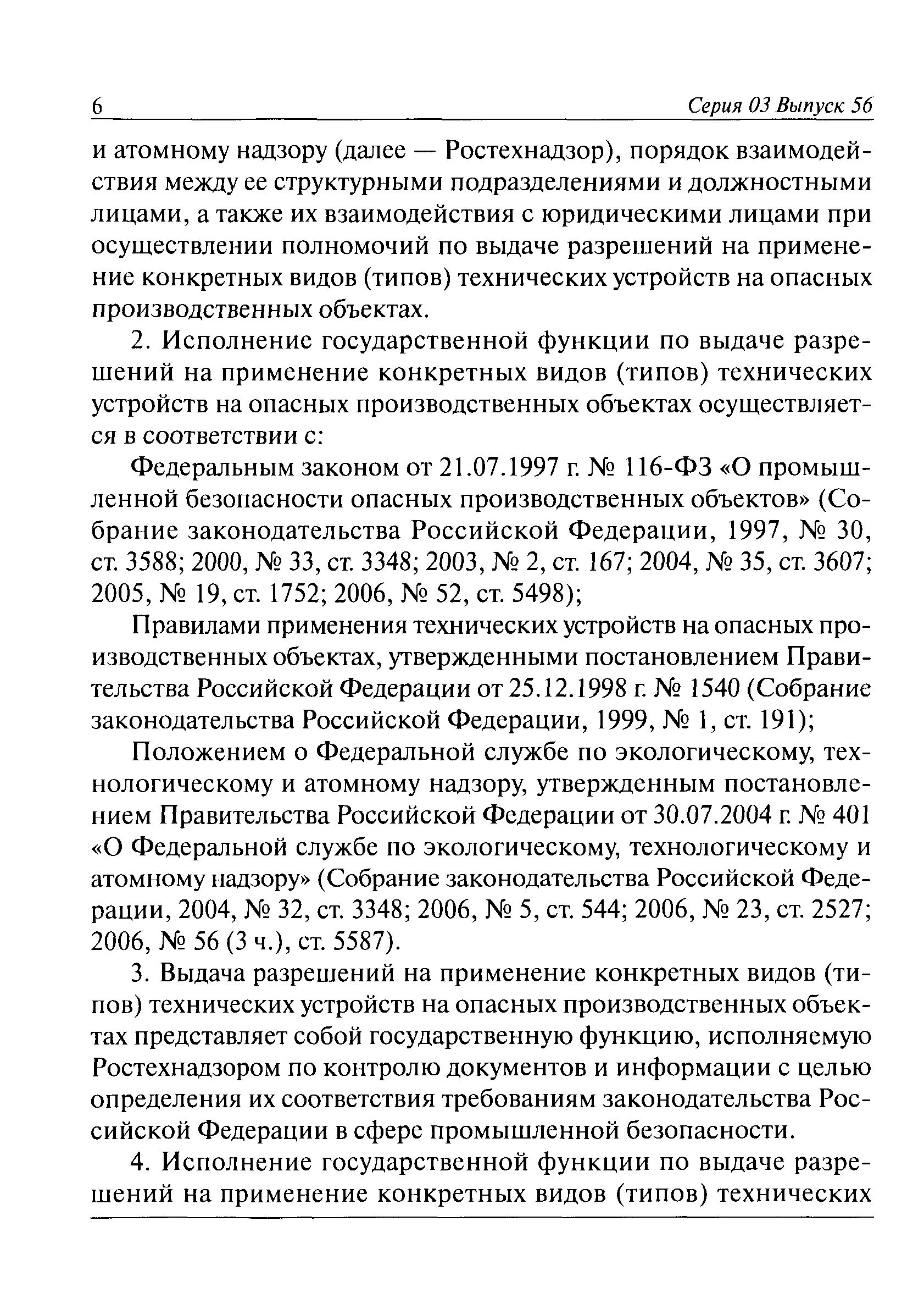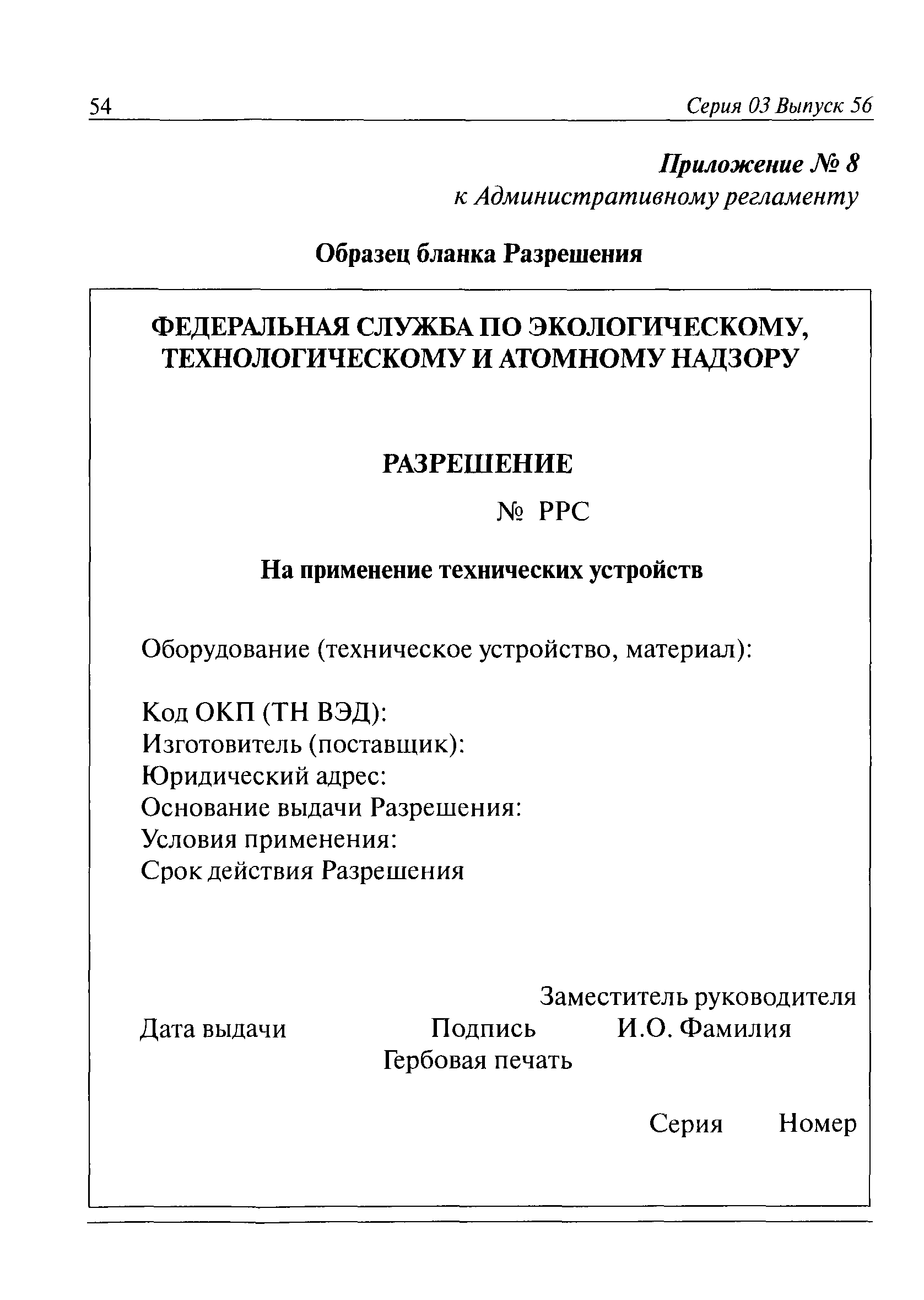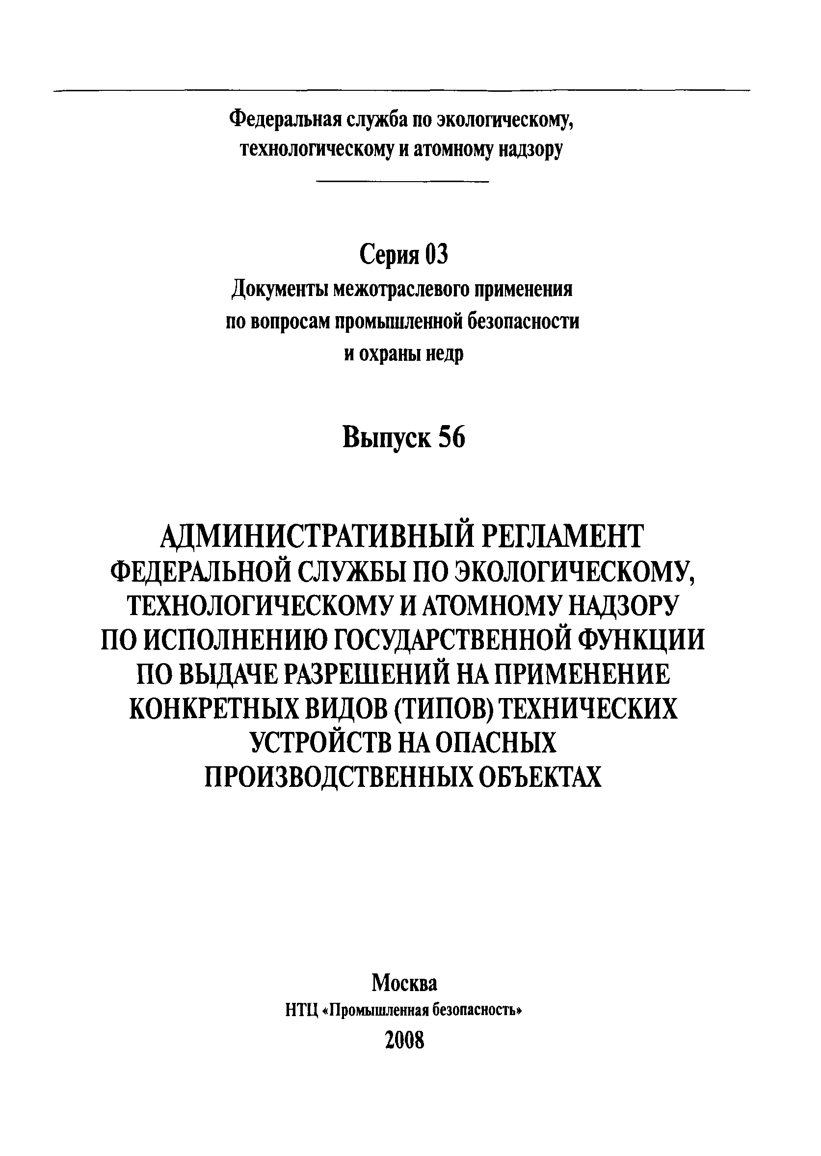 | Название рус.: | Административный регламент Федеральной службы по экологическому, технологическому и атомному надзору по исполнению государственной функции по выдаче разрешений на применение конкретных видов (типов) технических устройств на опасных производственных объектах |