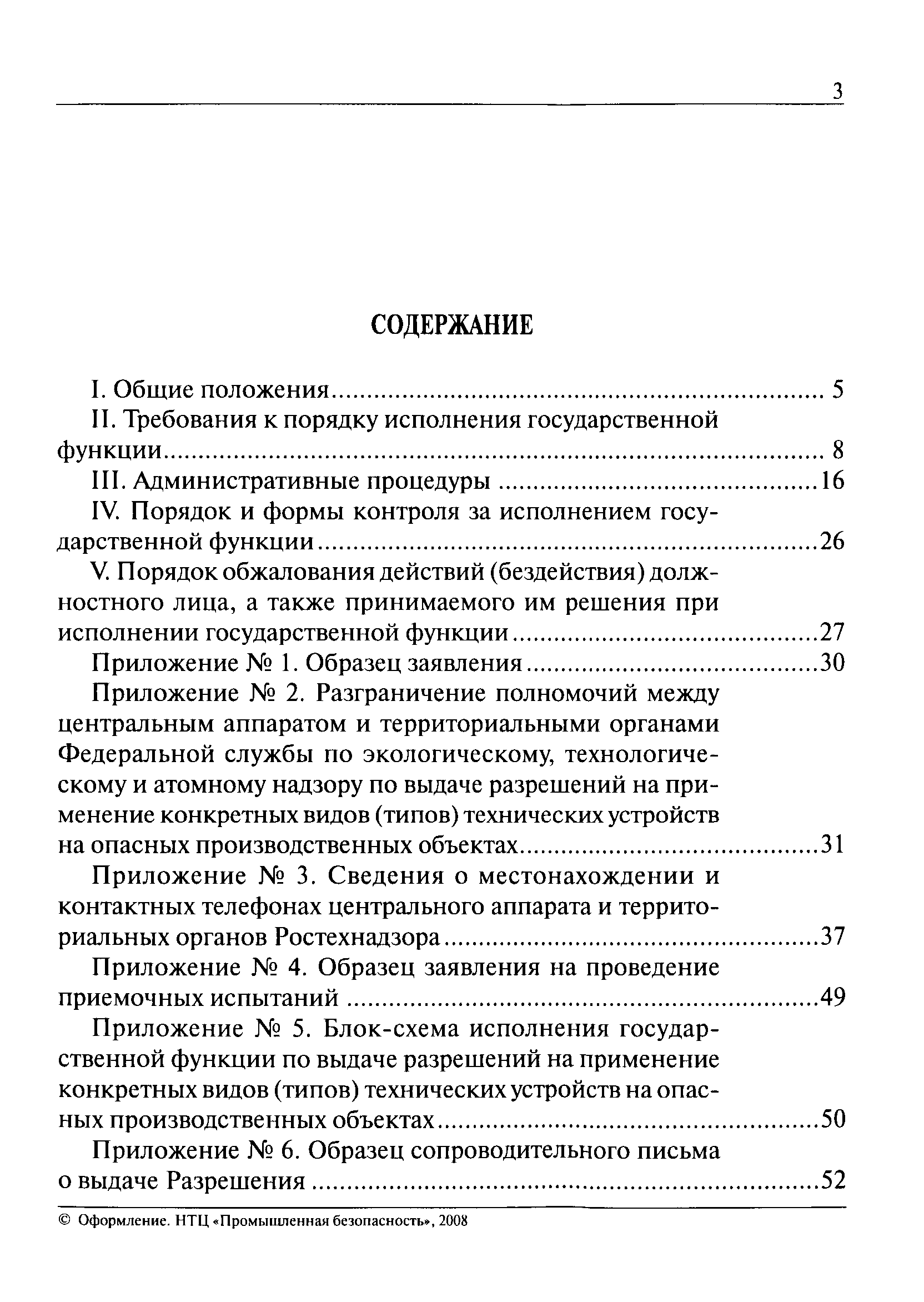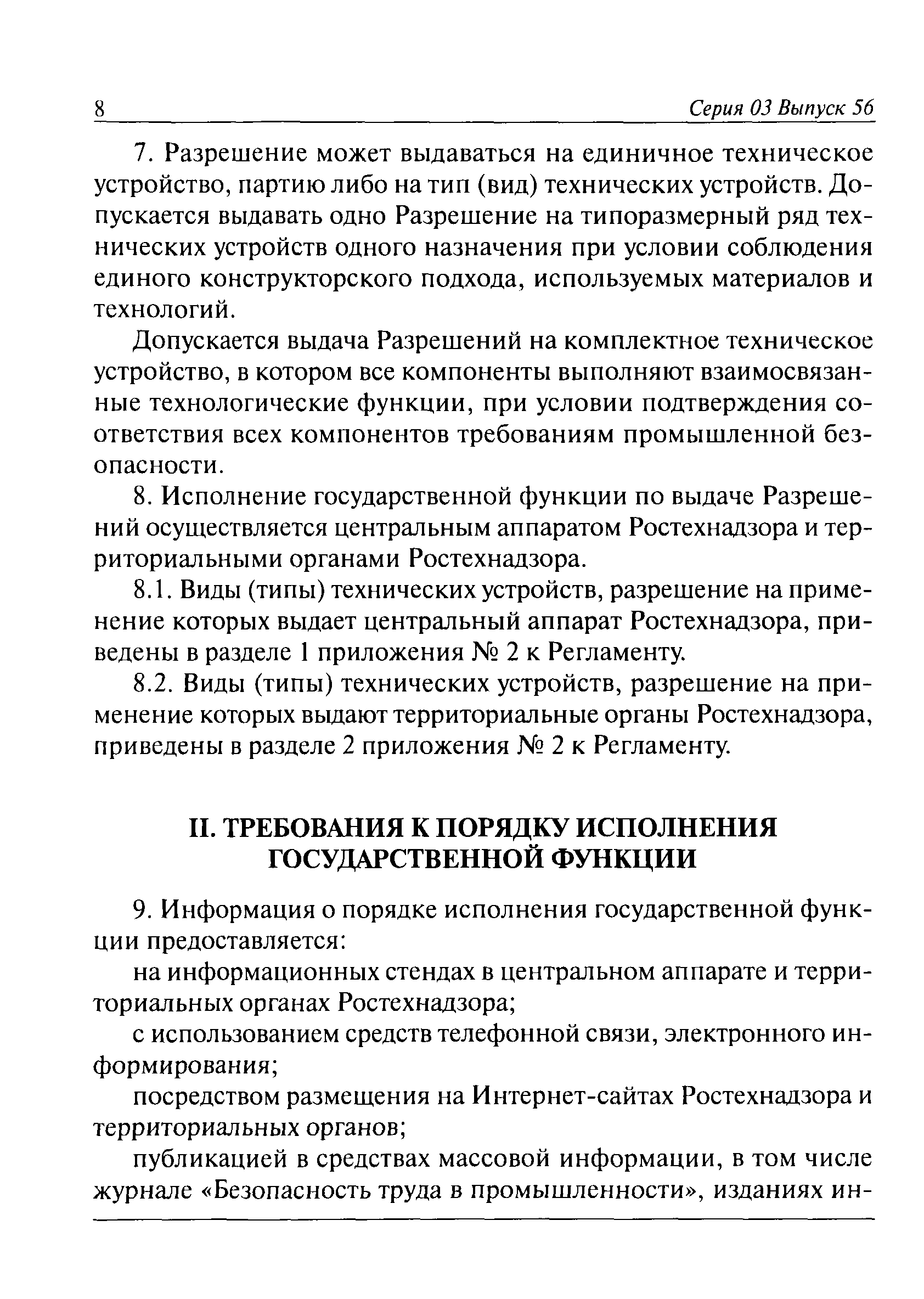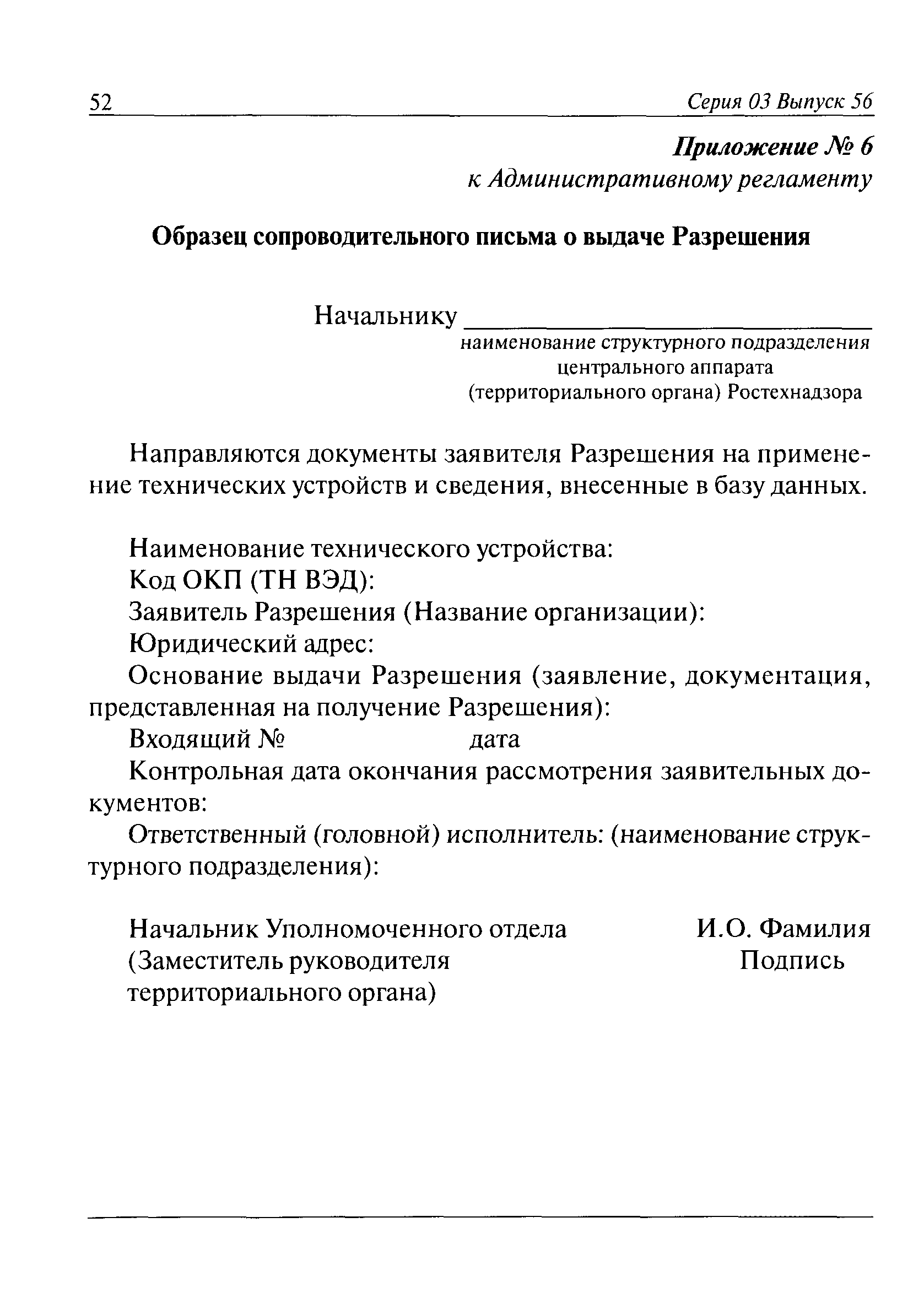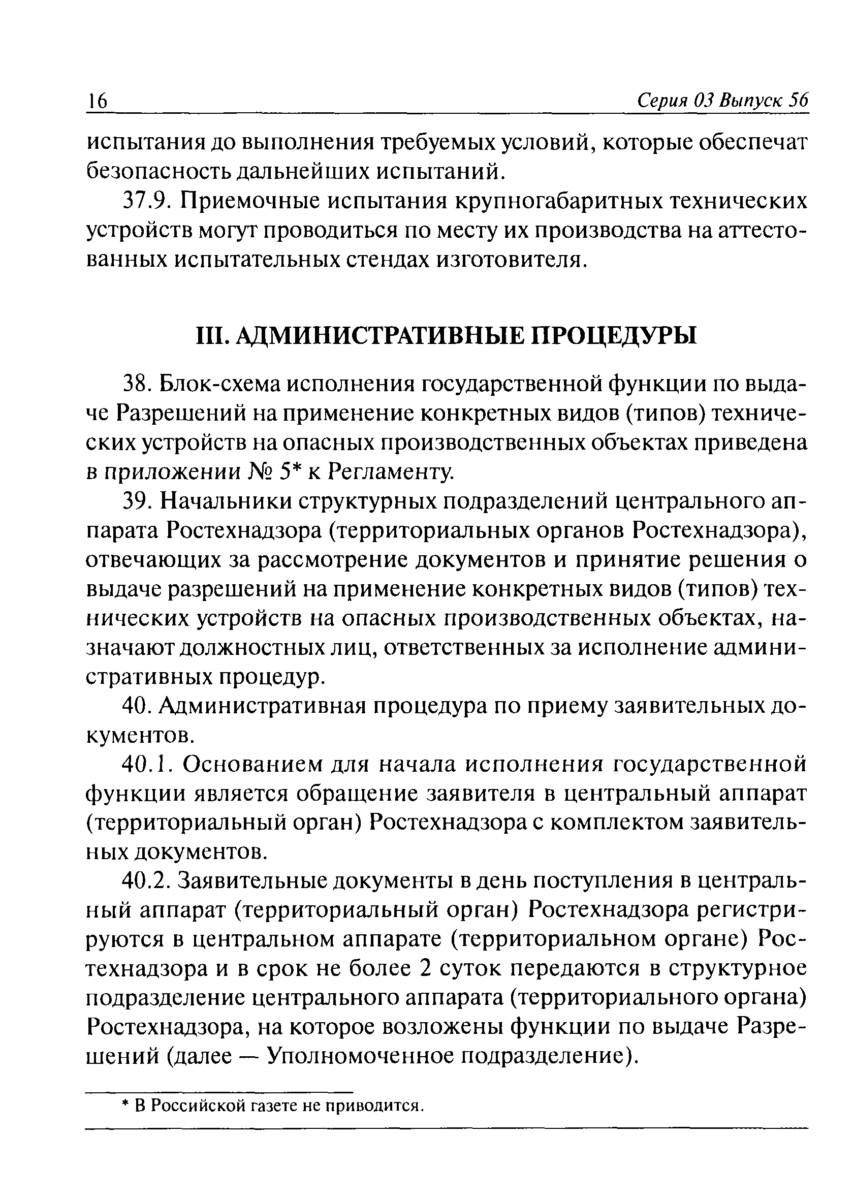 | Оглавление: | I. Общие положения II. Требования к порядку исполнения государственной функции III. Административные процедуры IV. Порядок и формы контроля за исполнением государственной функции V. Порядок обжалования действий (бездействия) должностного лица, а также принимаемого им решения при исполнении государственной функции Приложение № 1. Образец заявления Приложение № 2. Разграничение полномочий между центральным аппаратом и территориальными органами Федеральной службы по экологическому, технологическому и атомному надзору по выдаче разрешений на применение конкретных видов (типов) технических устройств на опасных производственных объектах 1. Виды (типы) технических устройств, разрешение на применение которых выдает центральный аппарат Федеральной службы по экологическому, технологическому и атомному надзору 2. Виды (типы) технических устройств, разрешение на применение которых выдают территориальные органы Федеральной службы по экологическому, технологическому и атомному надзору Приложение № 3. Сведения о местонахождении и контактных телефонах центрального аппарата и территориальных органов Ростехнадзора Центральный аппарат Ростехнадзора Территориальные органы Ростехнадзора Приложение № 4. Образец заявления на проведение приемочных испытаний Приложение № 5. Блок-схема исполнения государственной функции по выдаче разрешений на применение конкретных видов (типов) технических устройств на опасных производственных объектах Прием заявительных документов Рассмотрение заявительных документов и принятие решения о выдаче или об отказе в выдаче Разрешений Оформление, регистрация и выдача Разрешений Приложение № 6. Образец сопроводительного письма о выдаче Разрешения Приложение № 7. Образец проекта Разрешения Приложение № 8. Образец бланка Разрешения Приложение № 9. Образец бланка приложения к Разрешению Приложение № 10. Структура регистрационного номера Разрешения |