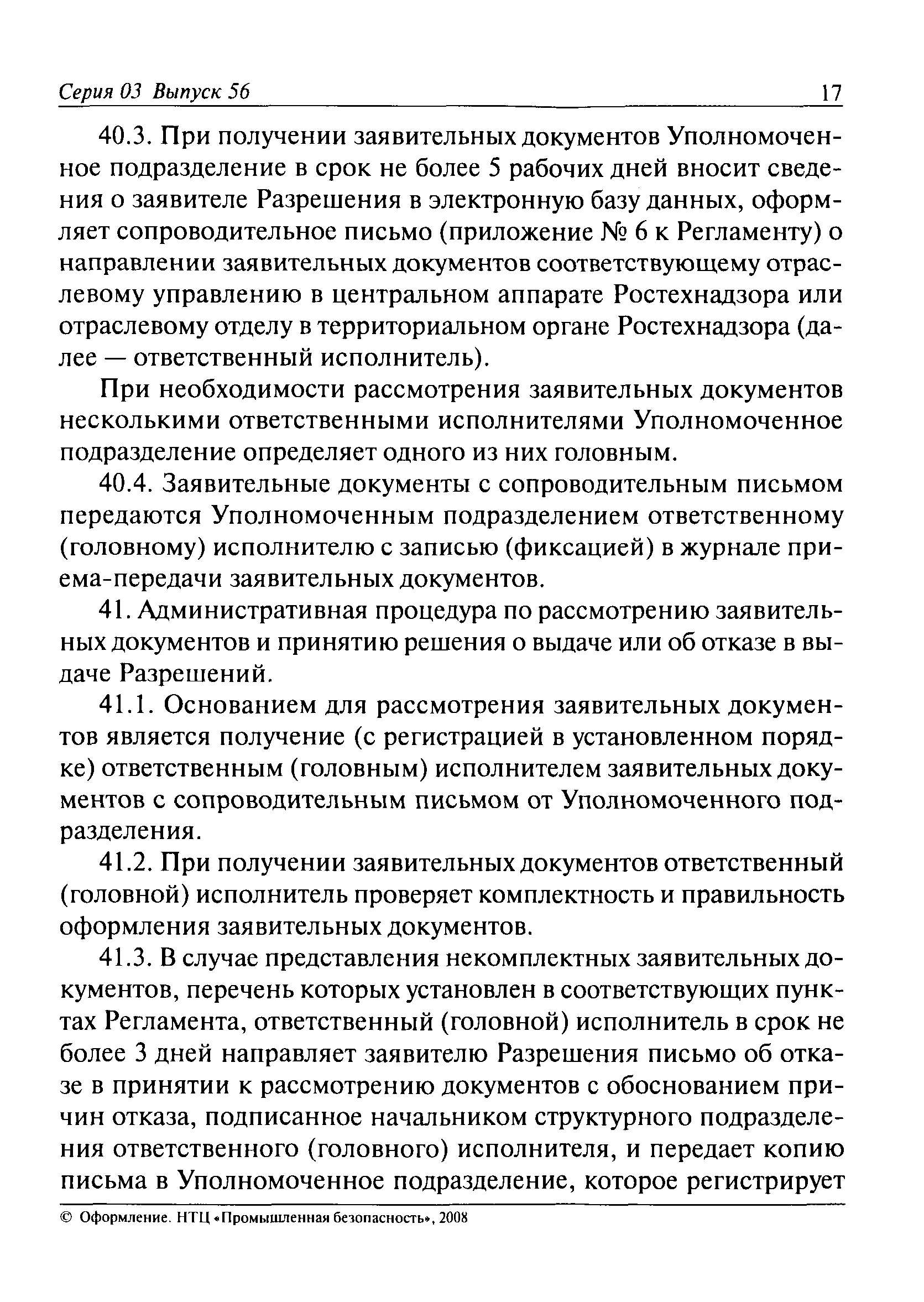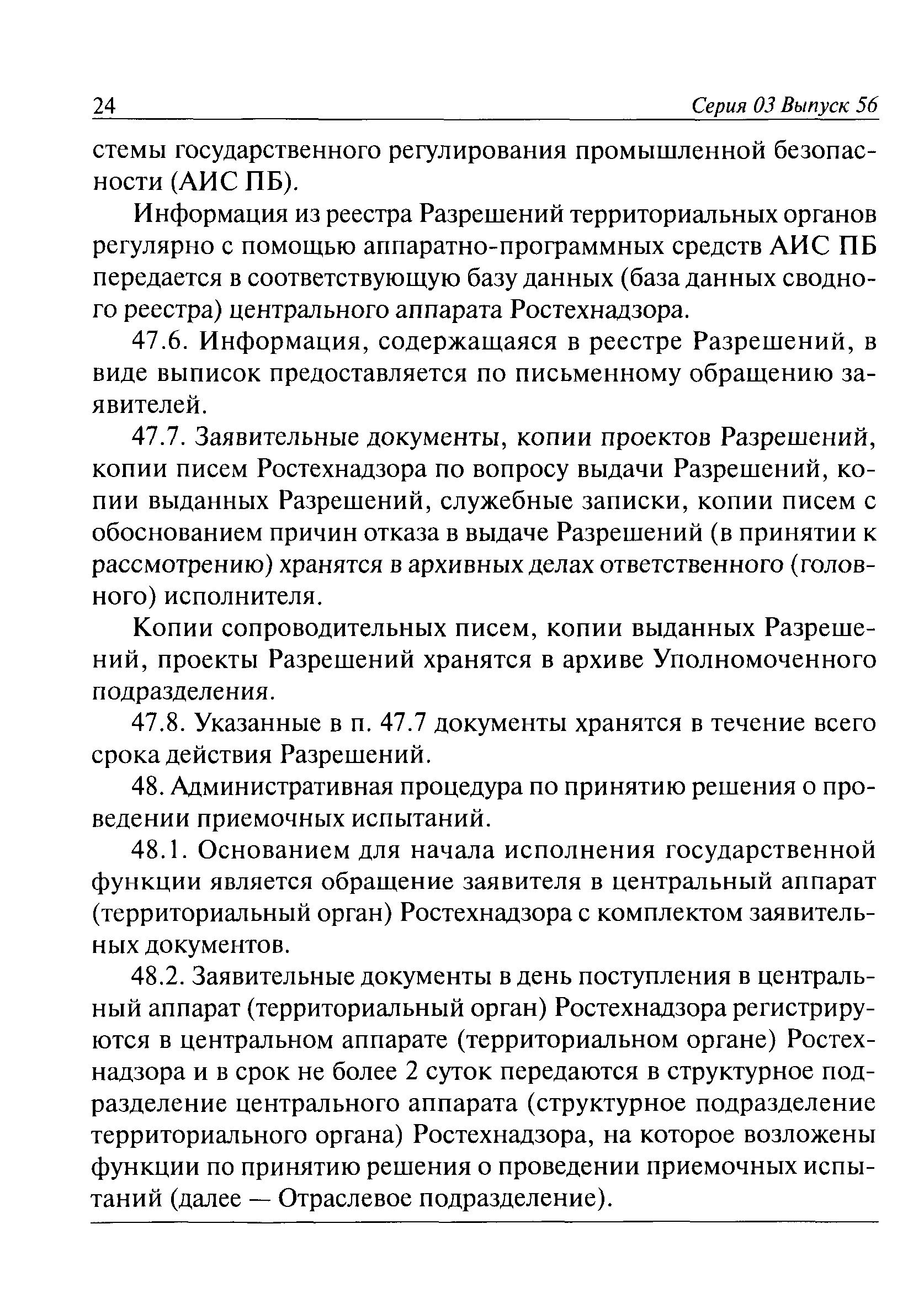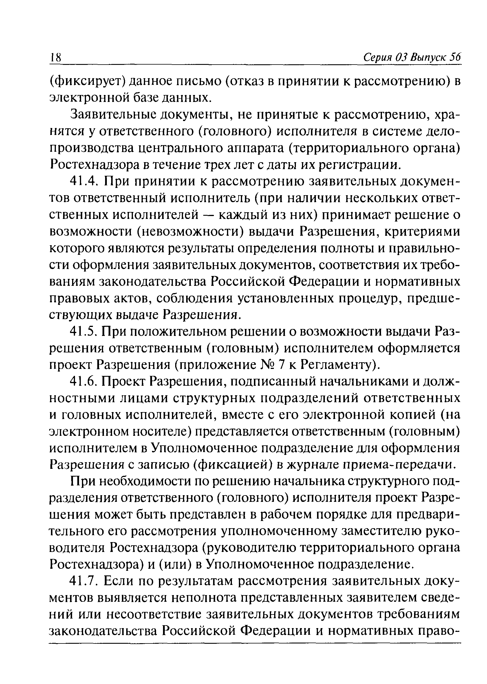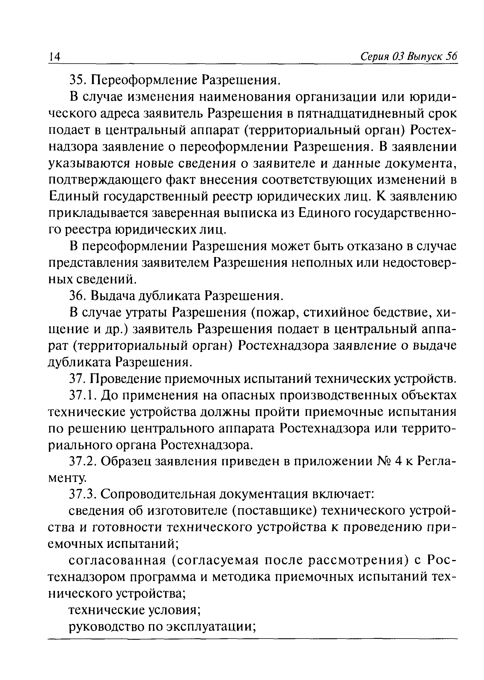 | Оглавление: | I. Общие положения II. Требования к порядку исполнения государственной функции III. Административные процедуры IV. Порядок и формы контроля за исполнением государственной функции V. Порядок обжалования действий (бездействия) должностного лица, а также принимаемого им решения при исполнении государственной функции Приложение № 1. Образец заявления Приложение № 2. Разграничение полномочий между центральным аппаратом и территориальными органами Федеральной службы по экологическому, технологическому и атомному надзору по выдаче разрешений на применение конкретных видов (типов) технических устройств на опасных производственных объектах 1. Виды (типы) технических устройств, разрешение на применение которых выдает центральный аппарат Федеральной службы по экологическому, технологическому и атомному надзору 2. Виды (типы) технических устройств, разрешение на применение которых выдают территориальные органы Федеральной службы по экологическому, технологическому и атомному надзору Приложение № 3. Сведения о местонахождении и контактных телефонах центрального аппарата и территориальных органов Ростехнадзора Центральный аппарат Ростехнадзора Территориальные органы Ростехнадзора Приложение № 4. Образец заявления на проведение приемочных испытаний Приложение № 5. Блок-схема исполнения государственной функции по выдаче разрешений на применение конкретных видов (типов) технических устройств на опасных производственных объектах Прием заявительных документов Рассмотрение заявительных документов и принятие решения о выдаче или об отказе в выдаче Разрешений Оформление, регистрация и выдача Разрешений Приложение № 6. Образец сопроводительного письма о выдаче Разрешения Приложение № 7. Образец проекта Разрешения Приложение № 8. Образец бланка Разрешения Приложение № 9. Образец бланка приложения к Разрешению Приложение № 10. Структура регистрационного номера Разрешения |