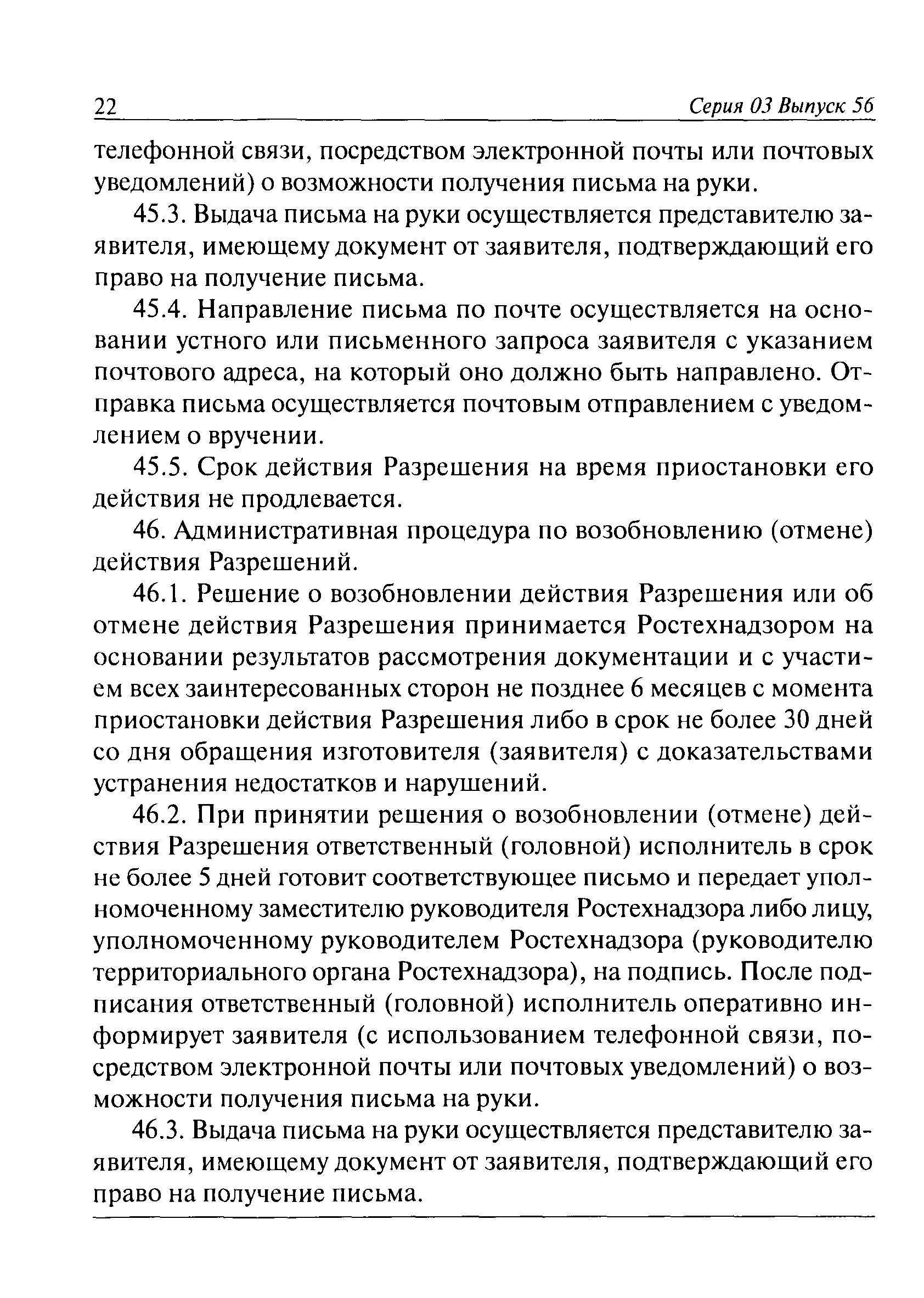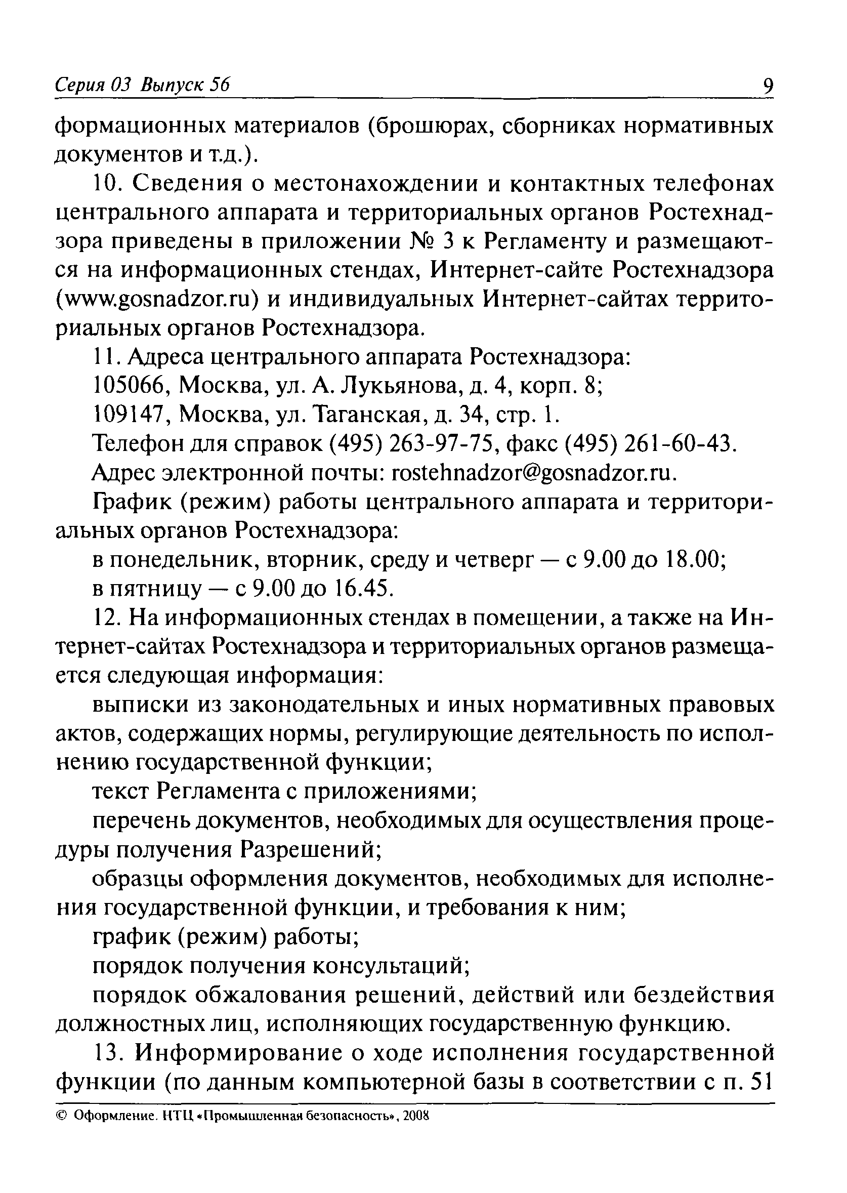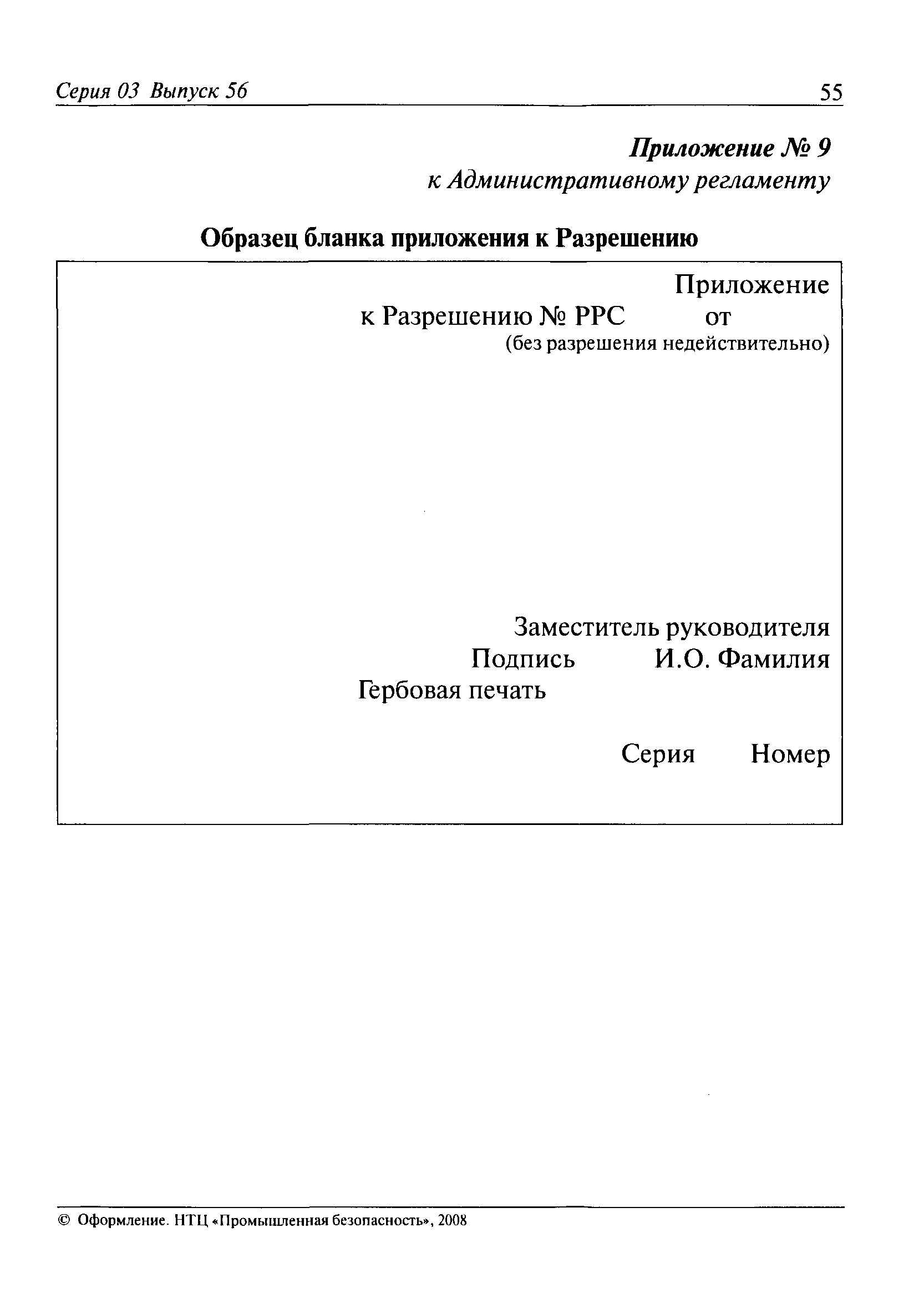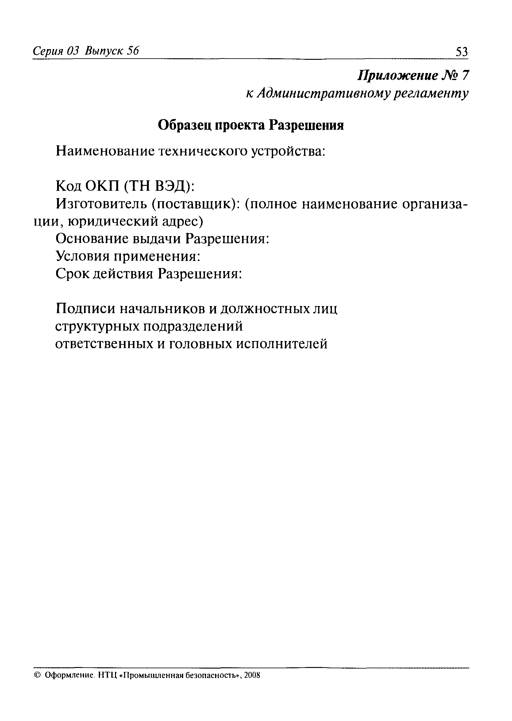 | Оглавление: | I. Общие положения II. Требования к порядку исполнения государственной функции III. Административные процедуры IV. Порядок и формы контроля за исполнением государственной функции V. Порядок обжалования действий (бездействия) должностного лица, а также принимаемого им решения при исполнении государственной функции Приложение № 1. Образец заявления Приложение № 2. Разграничение полномочий между центральным аппаратом и территориальными органами Федеральной службы по экологическому, технологическому и атомному надзору по выдаче разрешений на применение конкретных видов (типов) технических устройств на опасных производственных объектах 1. Виды (типы) технических устройств, разрешение на применение которых выдает центральный аппарат Федеральной службы по экологическому, технологическому и атомному надзору 2. Виды (типы) технических устройств, разрешение на применение которых выдают территориальные органы Федеральной службы по экологическому, технологическому и атомному надзору Приложение № 3. Сведения о местонахождении и контактных телефонах центрального аппарата и территориальных органов Ростехнадзора Центральный аппарат Ростехнадзора Территориальные органы Ростехнадзора Приложение № 4. Образец заявления на проведение приемочных испытаний Приложение № 5. Блок-схема исполнения государственной функции по выдаче разрешений на применение конкретных видов (типов) технических устройств на опасных производственных объектах Прием заявительных документов Рассмотрение заявительных документов и принятие решения о выдаче или об отказе в выдаче Разрешений Оформление, регистрация и выдача Разрешений Приложение № 6. Образец сопроводительного письма о выдаче Разрешения Приложение № 7. Образец проекта Разрешения Приложение № 8. Образец бланка Разрешения Приложение № 9. Образец бланка приложения к Разрешению Приложение № 10. Структура регистрационного номера Разрешения |