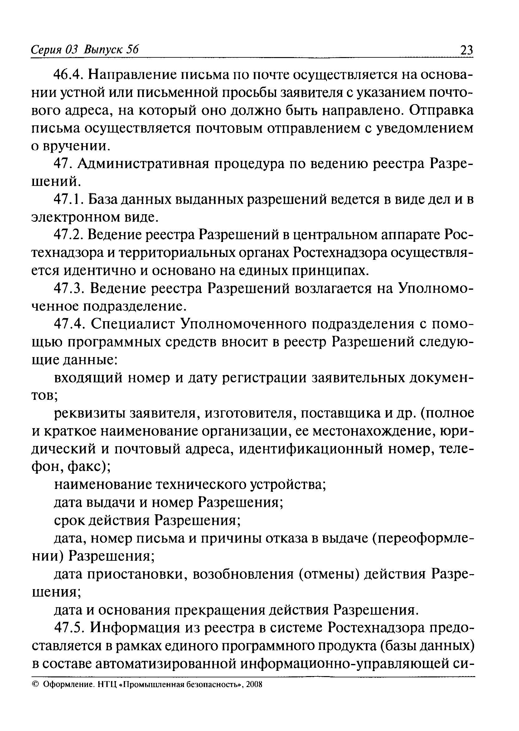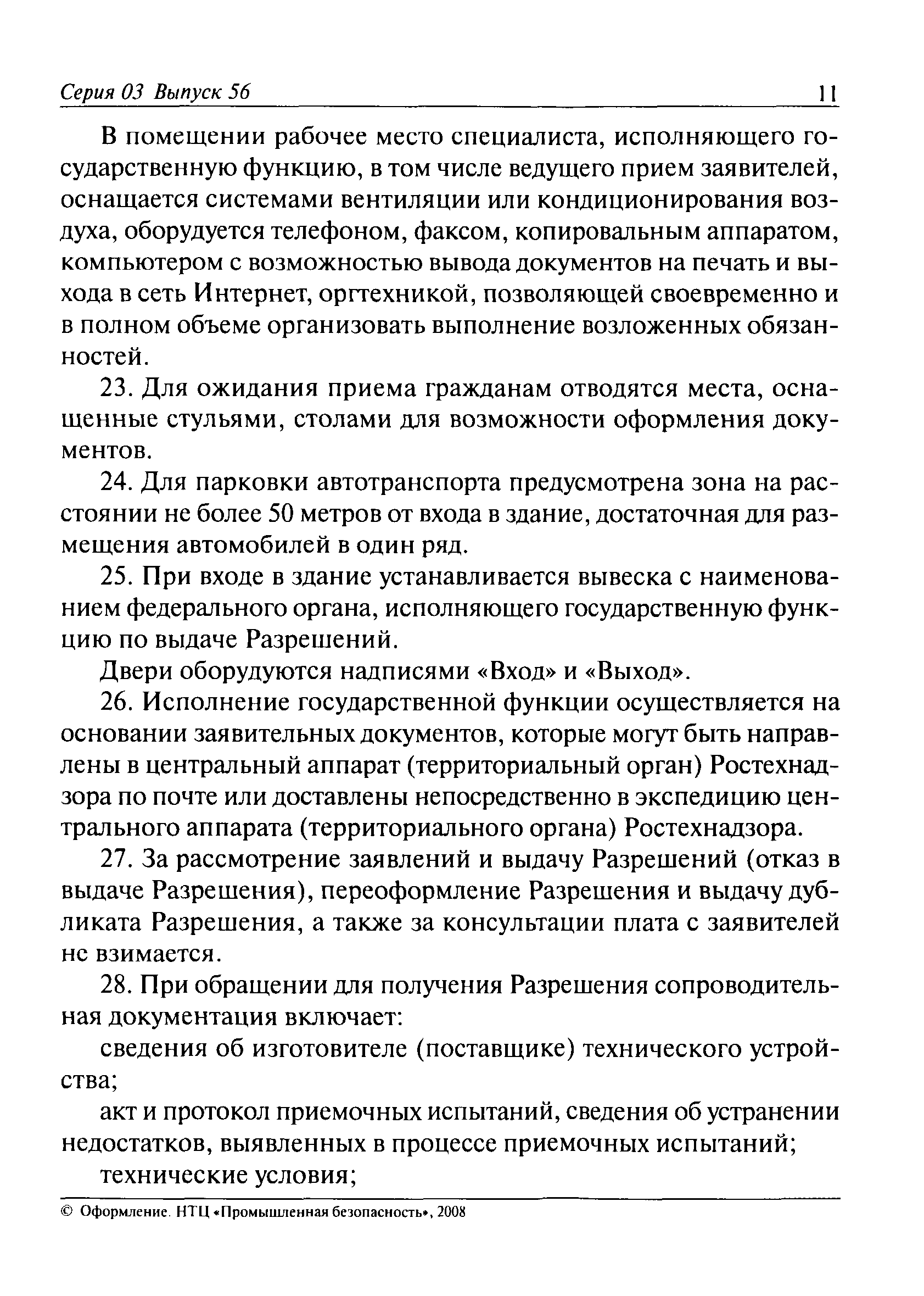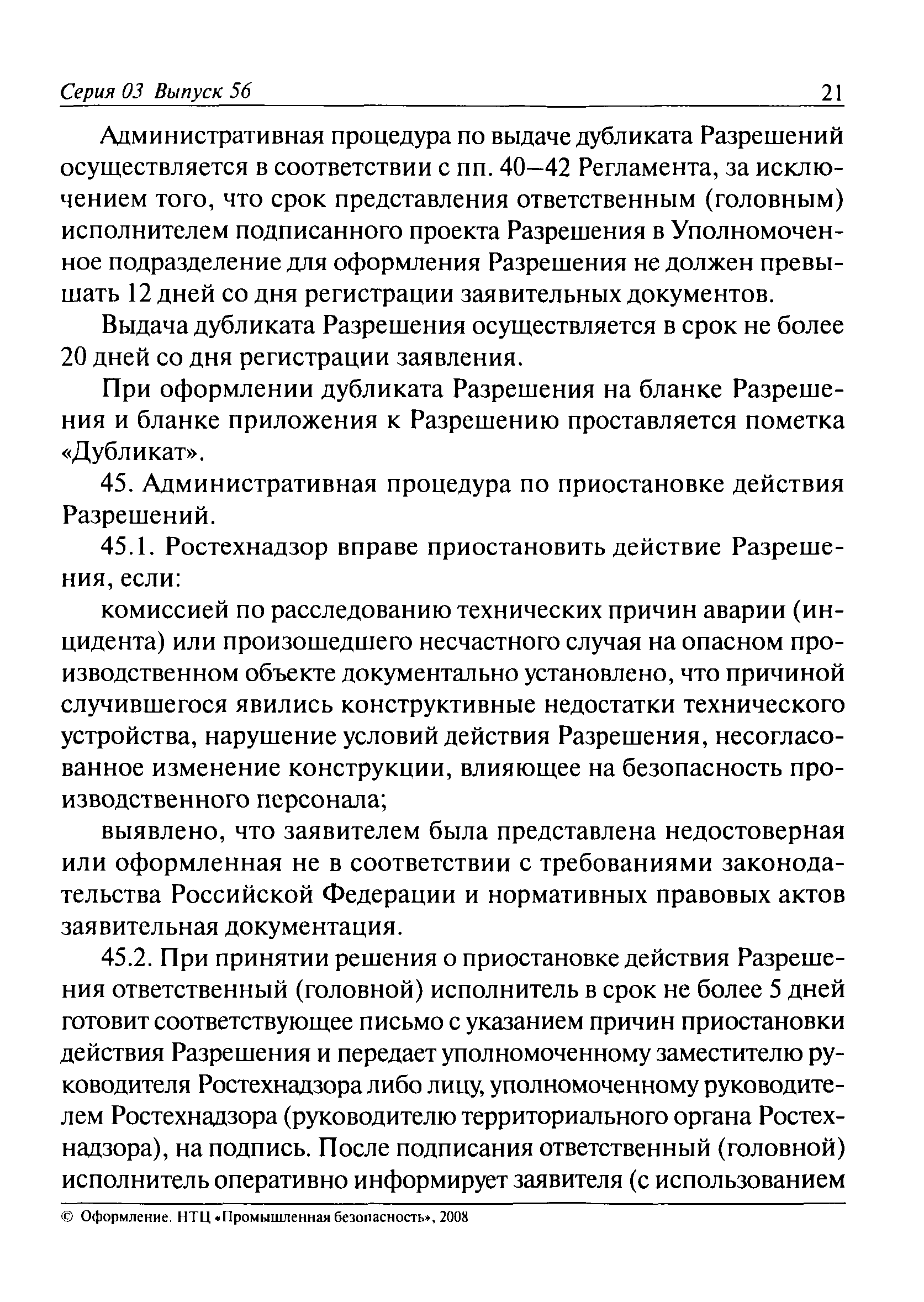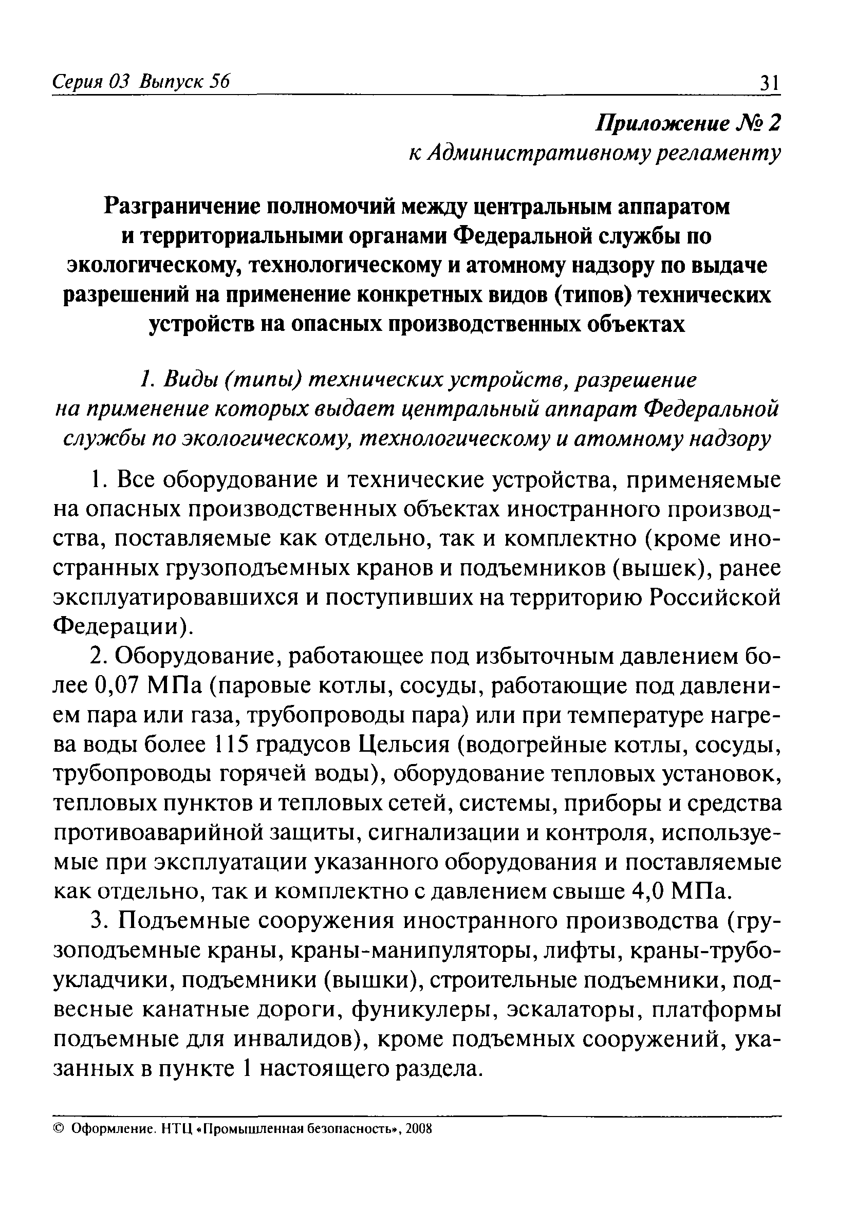 | Оглавление: | I. Общие положения II. Требования к порядку исполнения государственной функции III. Административные процедуры IV. Порядок и формы контроля за исполнением государственной функции V. Порядок обжалования действий (бездействия) должностного лица, а также принимаемого им решения при исполнении государственной функции Приложение № 1. Образец заявления Приложение № 2. Разграничение полномочий между центральным аппаратом и территориальными органами Федеральной службы по экологическому, технологическому и атомному надзору по выдаче разрешений на применение конкретных видов (типов) технических устройств на опасных производственных объектах 1. Виды (типы) технических устройств, разрешение на применение которых выдает центральный аппарат Федеральной службы по экологическому, технологическому и атомному надзору 2. Виды (типы) технических устройств, разрешение на применение которых выдают территориальные органы Федеральной службы по экологическому, технологическому и атомному надзору Приложение № 3. Сведения о местонахождении и контактных телефонах центрального аппарата и территориальных органов Ростехнадзора Центральный аппарат Ростехнадзора Территориальные органы Ростехнадзора Приложение № 4. Образец заявления на проведение приемочных испытаний Приложение № 5. Блок-схема исполнения государственной функции по выдаче разрешений на применение конкретных видов (типов) технических устройств на опасных производственных объектах Прием заявительных документов Рассмотрение заявительных документов и принятие решения о выдаче или об отказе в выдаче Разрешений Оформление, регистрация и выдача Разрешений Приложение № 6. Образец сопроводительного письма о выдаче Разрешения Приложение № 7. Образец проекта Разрешения Приложение № 8. Образец бланка Разрешения Приложение № 9. Образец бланка приложения к Разрешению Приложение № 10. Структура регистрационного номера Разрешения |