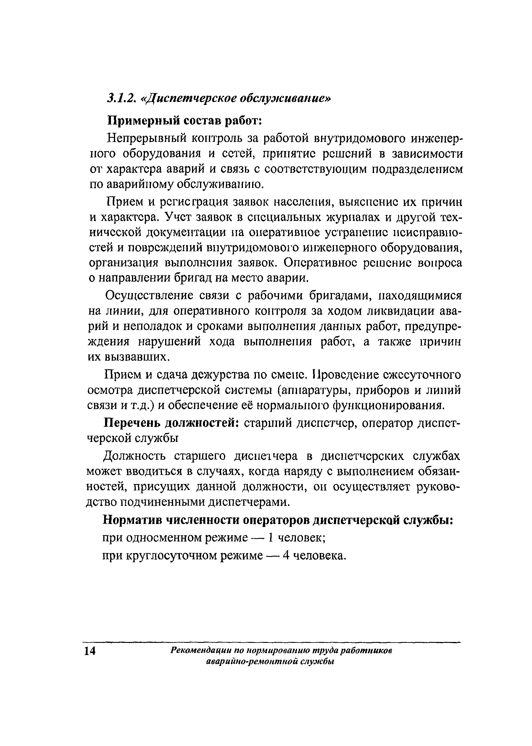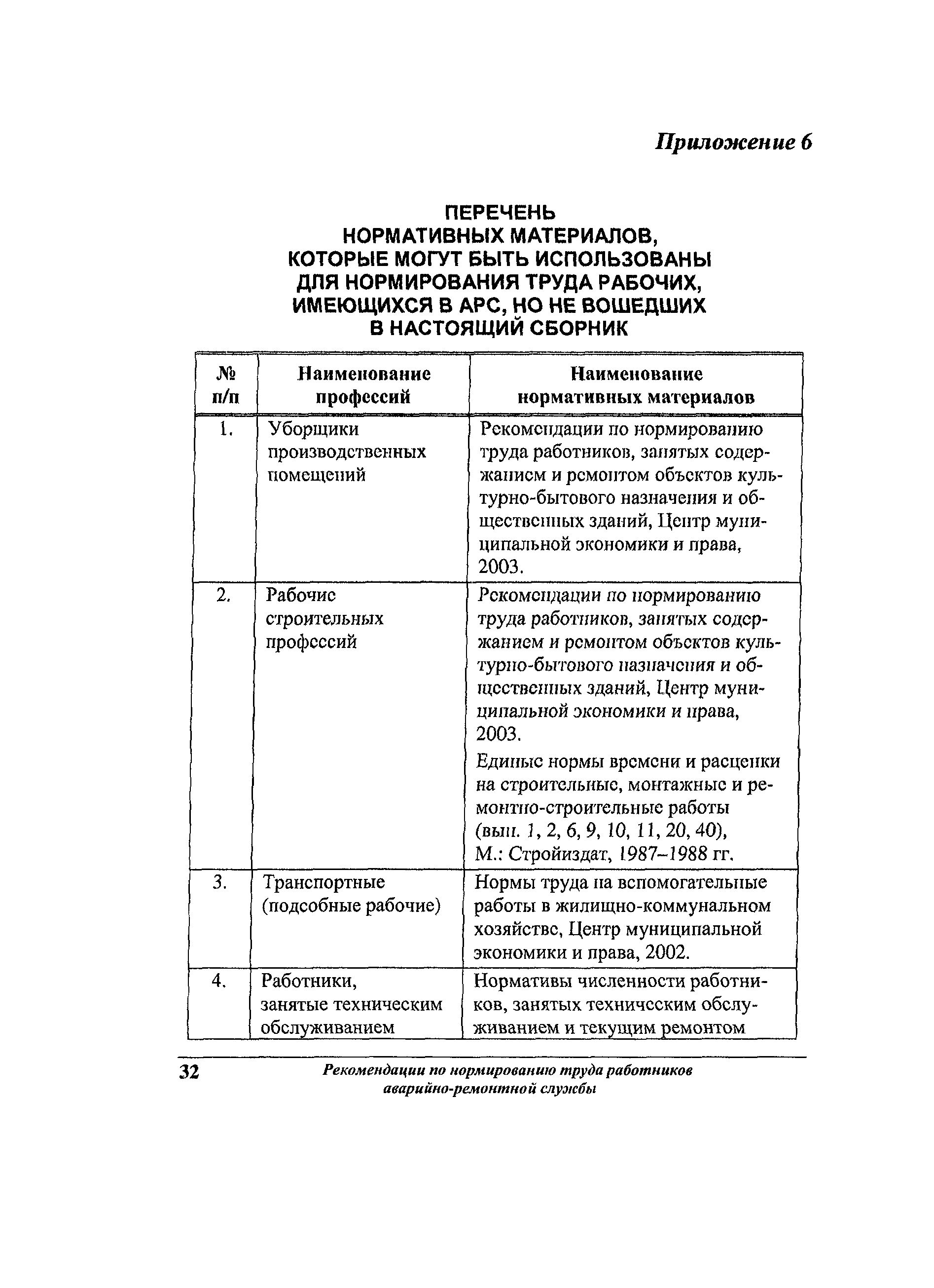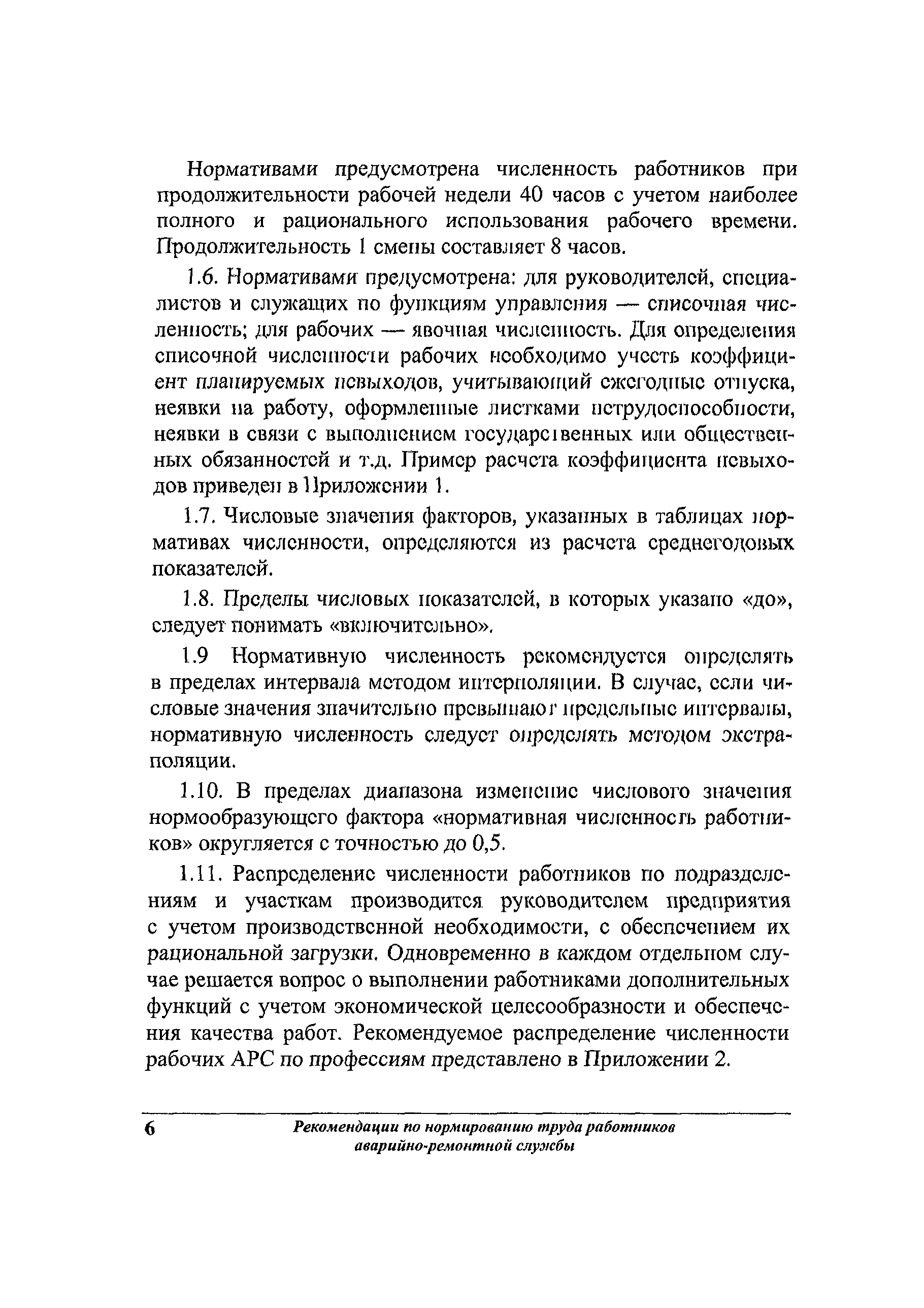 Рекомендации по нормированию труда работников аварийно-ремонтной службы жилищного хозяйства| Статус: | не действует | | Название рус.: | Рекомендации по нормированию труда работников аварийно-ремонтной службы жилищного хозяйства | | Дата добавления в базу: | 01.09.2013 | | Дата актуализации: | 01.09.2013 | | Область применения: | Предназначены для АРС, имеющих статус юридического лица независимо от формы собственности, а также для подразделений, входящих в состав организаций, занятых содержанием и ремонтом общего имущества многоквартирных домов. | | Оглавление: | 1 Общие положения 2 Организация работ аварийно-ремонтной службы жилищного хозяйства 3 Нормативы численности Приложение 1. Пример расчета коэффициента невыходов Приложение 2. Рекомендуемое распределение нормативной численности рабочих аварийно-ремонтной службы по профессиям Приложение 3. Перечень районов температурных зон по РФ Приложение 4. Перечень районов Крайнего Севера и местностей, приравненных к районам Крайнего Севера Приложение 5. Пример расчета нормативной численности руководителей, специалистов, служащих и рабочих аварийно-ремонтной службы Приложение 6. Перечень нормативных материалов, которые могут быть использованы для нормирования труда рабочих, имеющихся в АРС, но не вошедших в настоящий сборник |