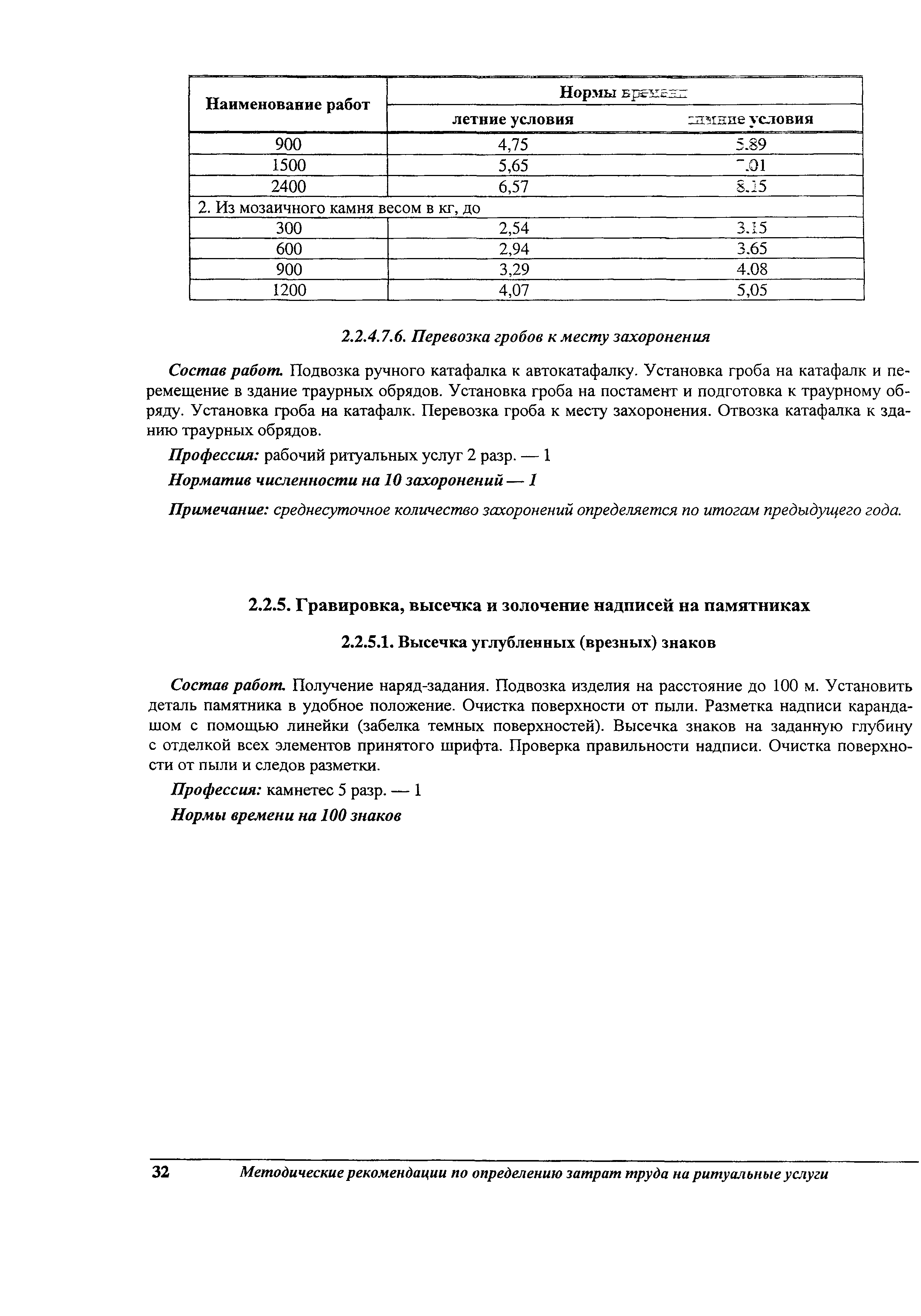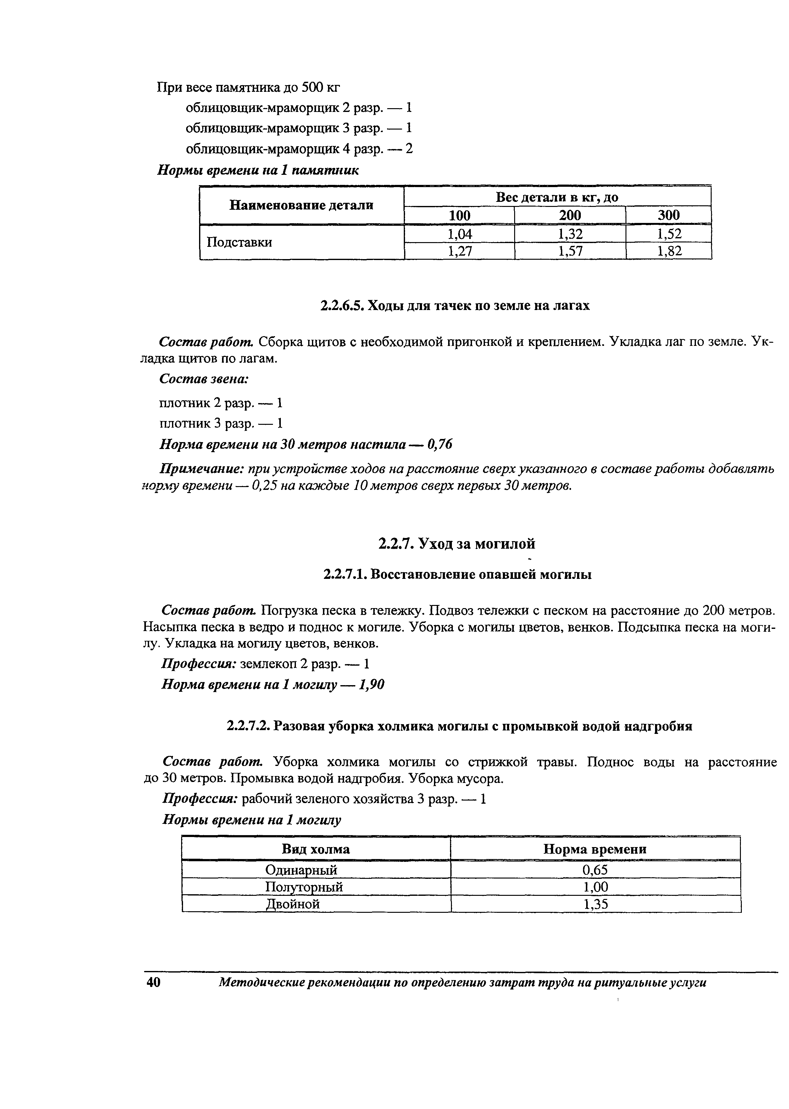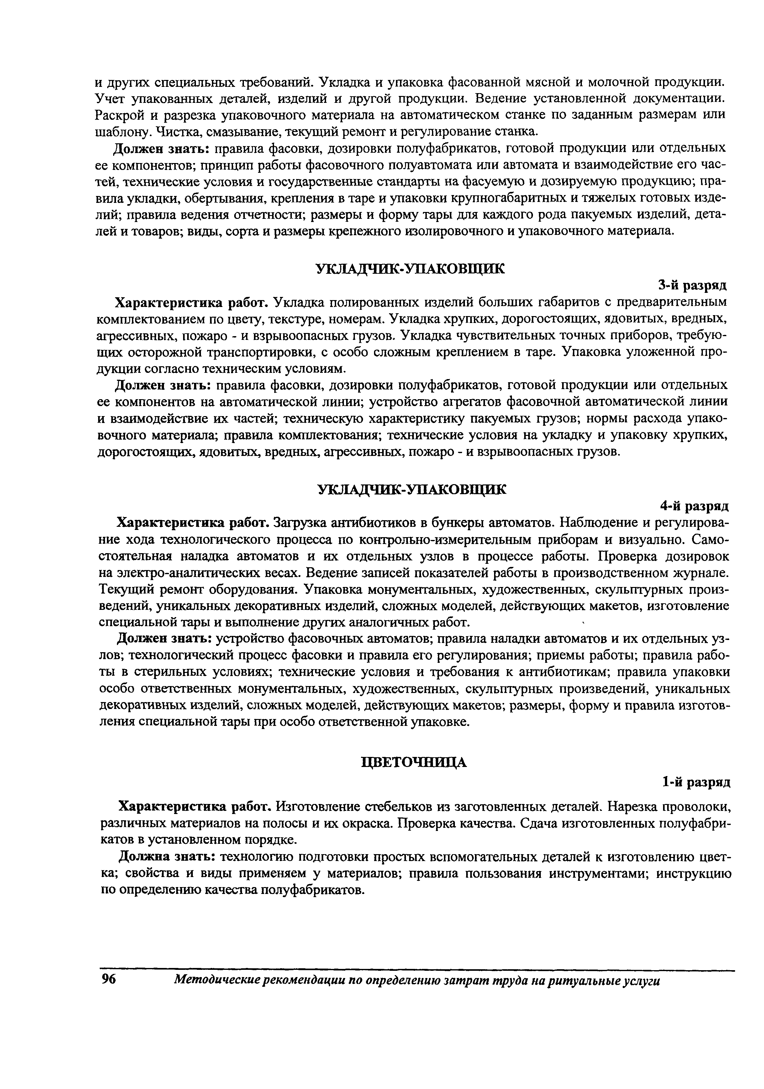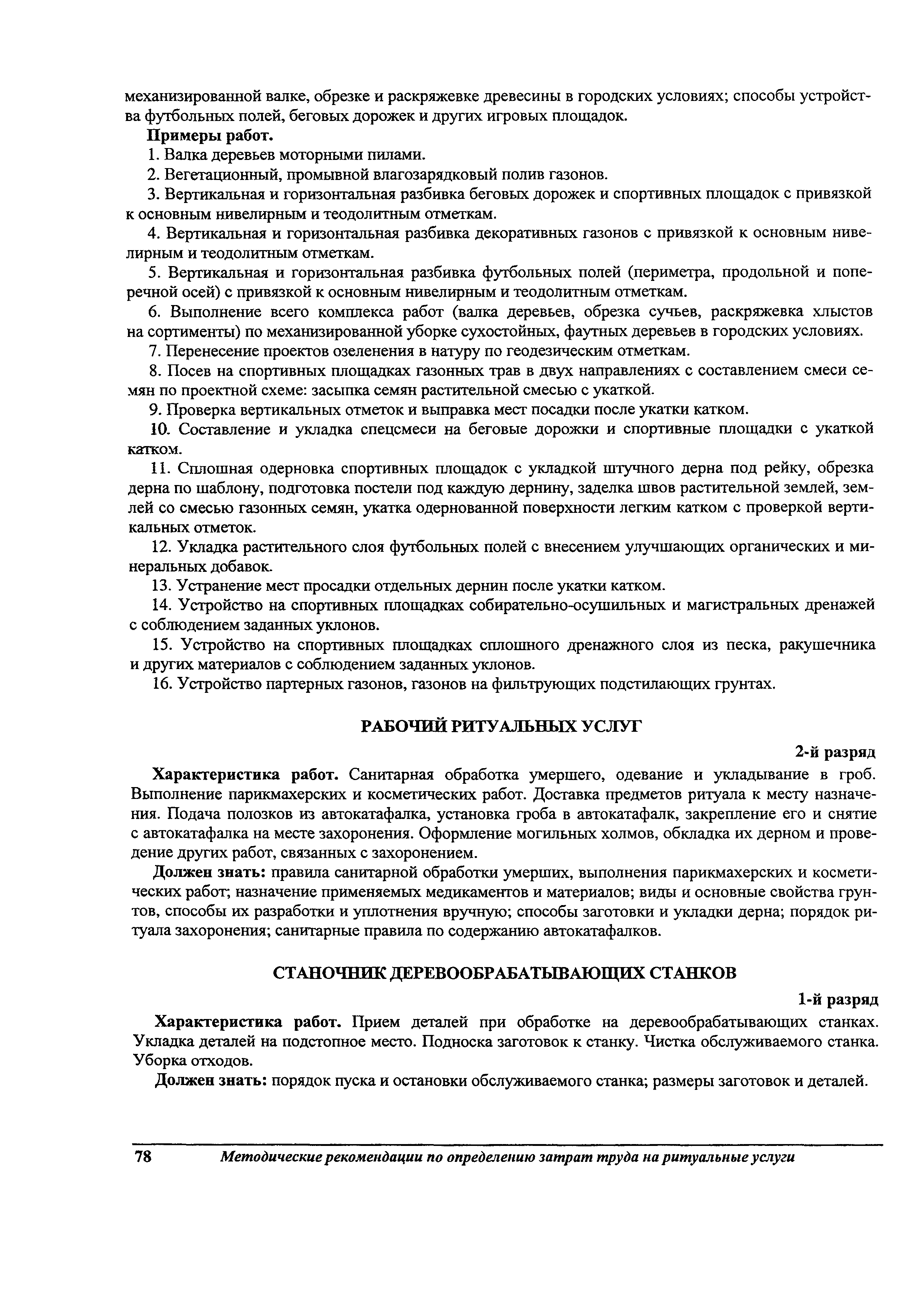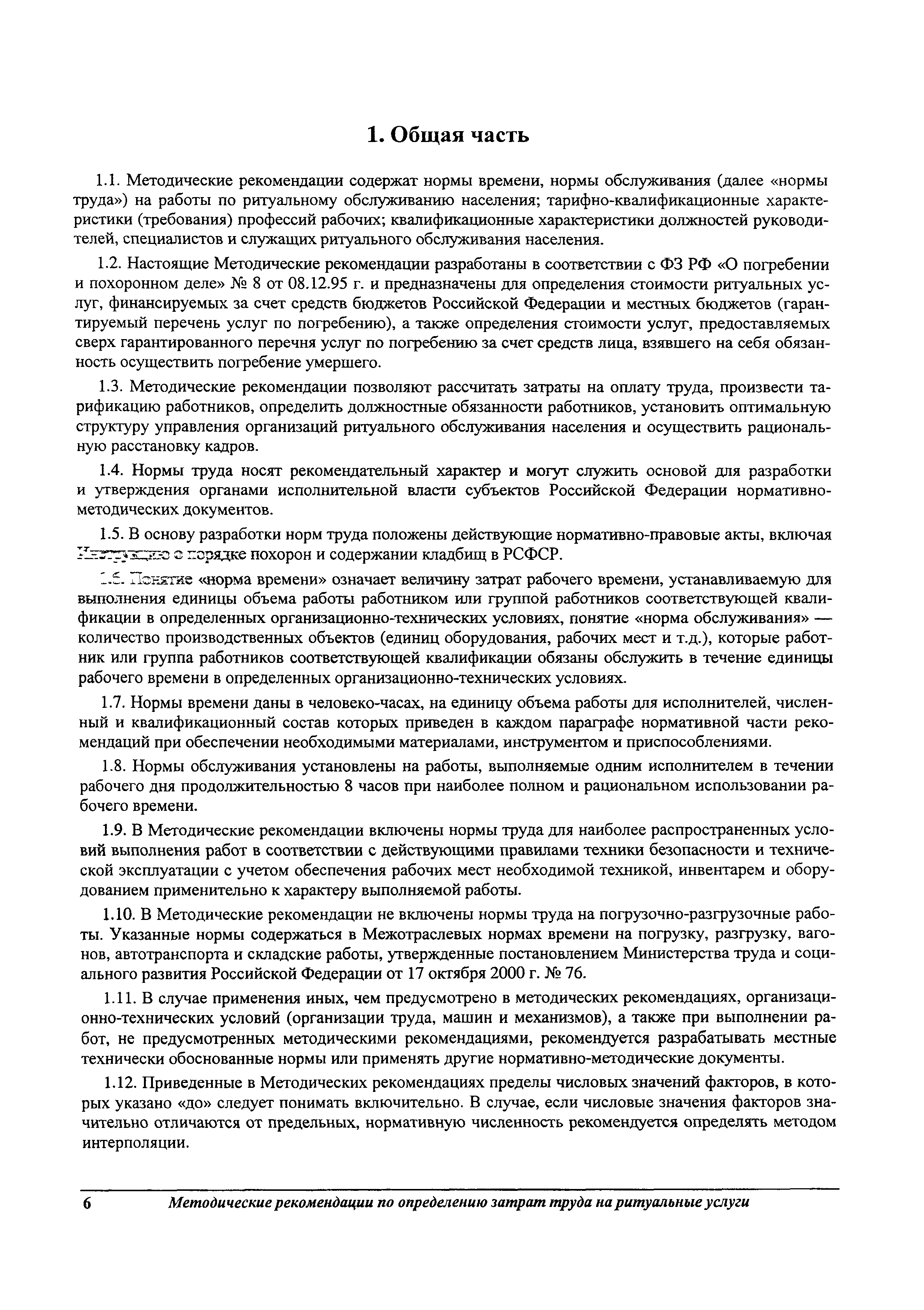 Методические рекомендации по определению затрат труда на оказание ритуальных услуг| Статус: | не действует | | Название рус.: | Методические рекомендации по определению затрат труда на оказание ритуальных услуг | | Дата добавления в базу: | 01.09.2013 | | Дата актуализации: | 01.09.2013 | | Область применения: | Предназначены для определения стоимости ритуальных услуг, финансируемых за счет средств бюджетов Российской Федерации и местных бюджетов (гарантируемый перечень услуг по погребению), а также определения стоимости услуг, предоставляемых сверх гарантированного перечня услуг по погребению за счет средств лица, взявшего на себя обязанность осуществить погребение умершего. | | Оглавление: | 1 Общая часть 2 Нормативная часть 2.1. Нормы обслуживания на работы по ритуальному обслуживанию населения 2.2. Нормы времени на работы по ритуальному обслуживанию населения 2.3. Тарифно-квалификационные характеристики работников ритуального обслуживания населения |