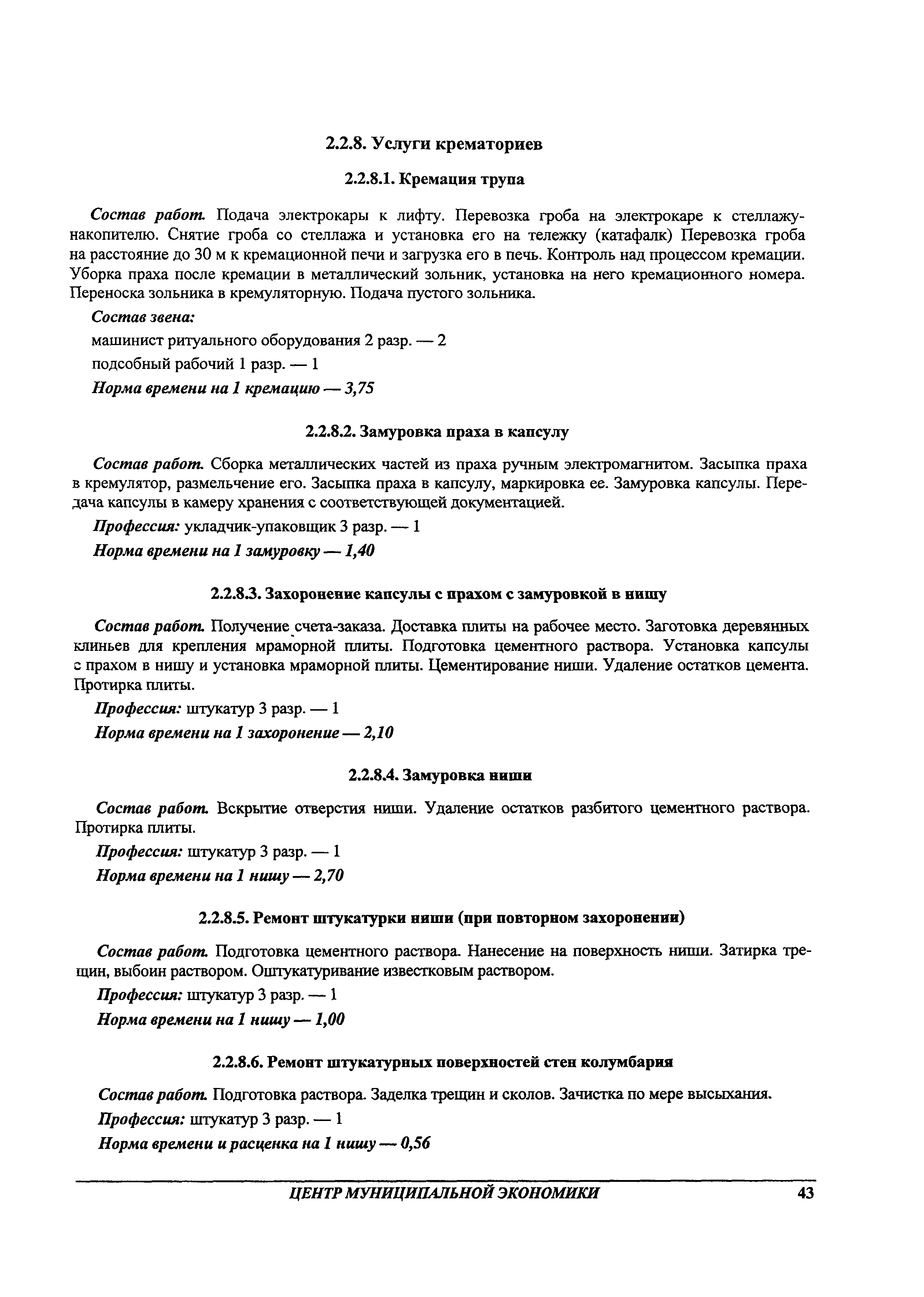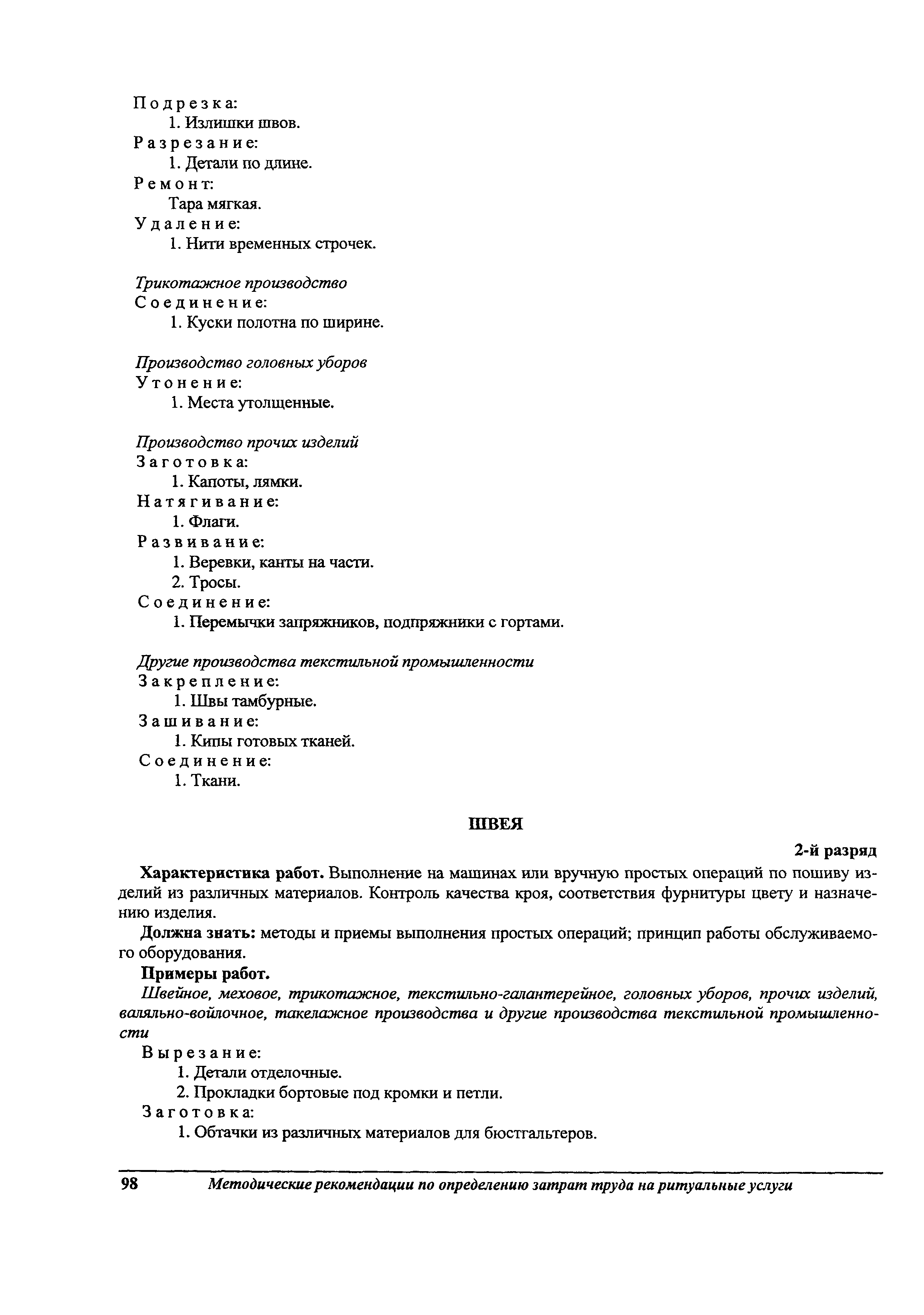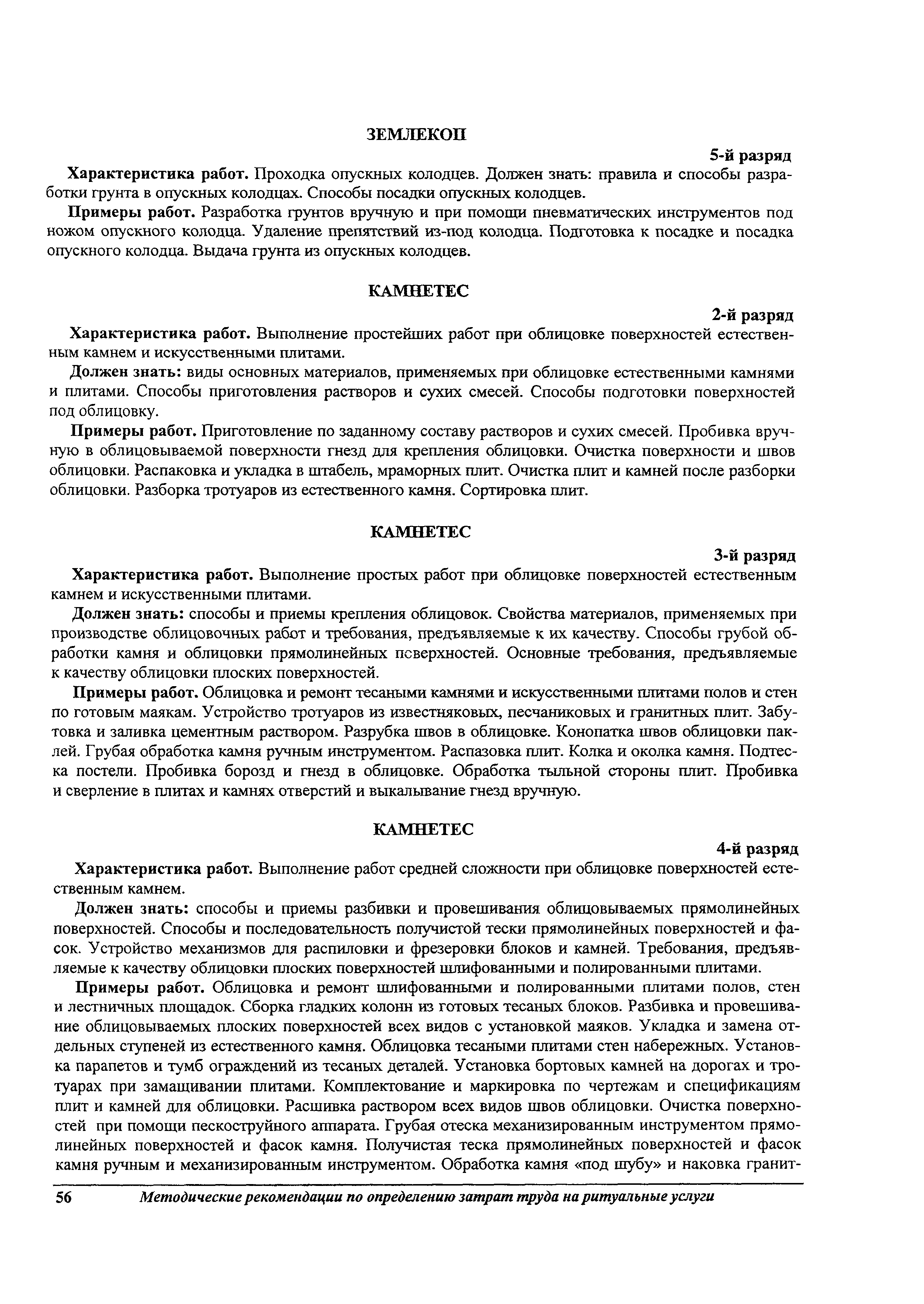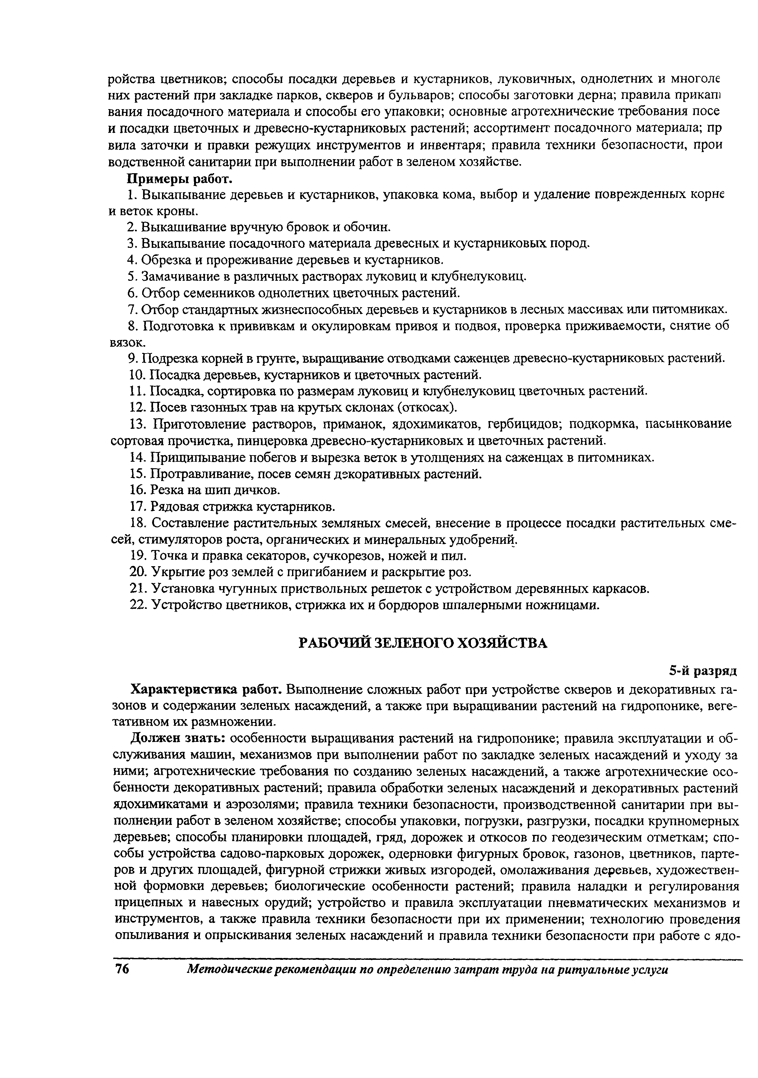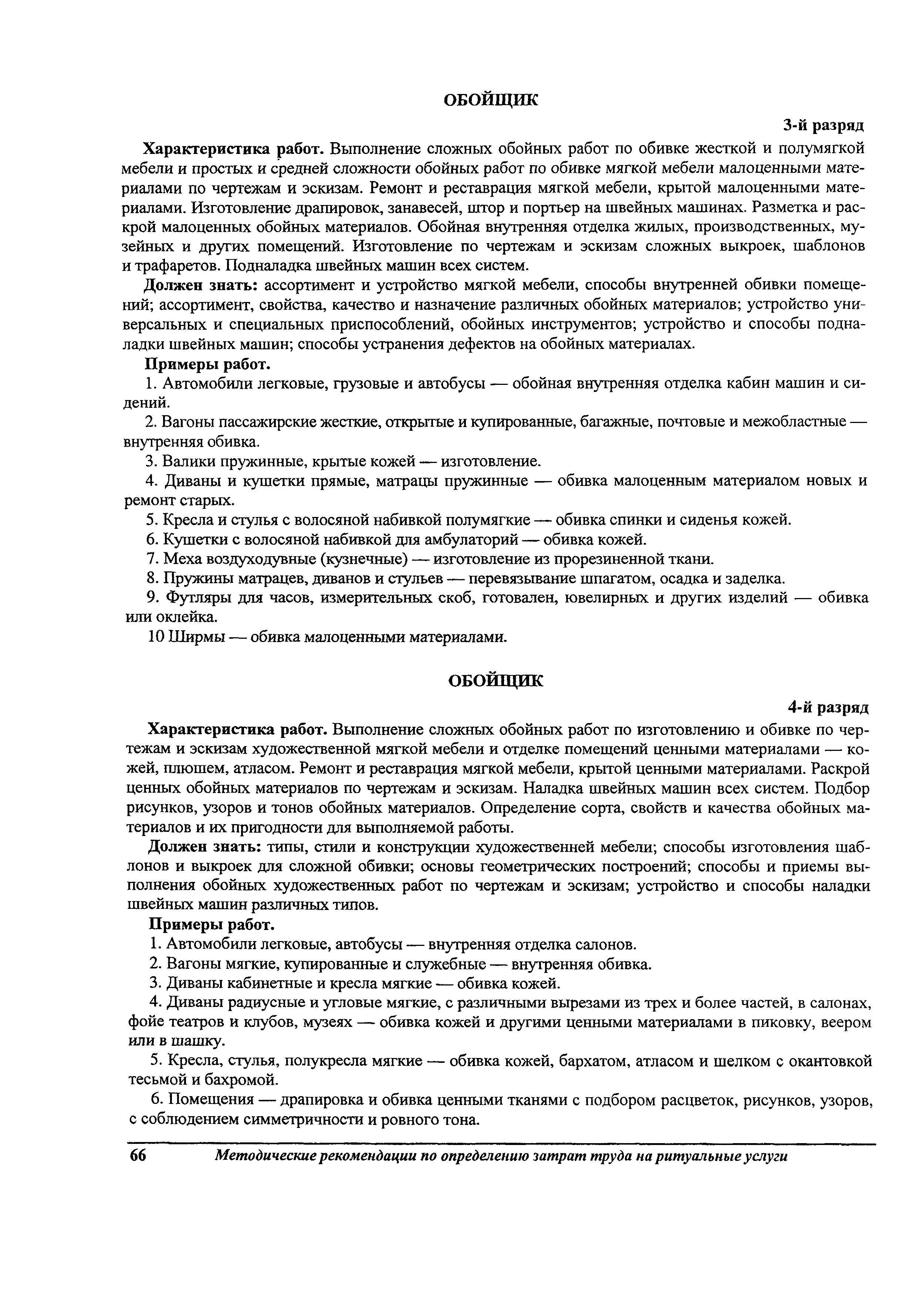 Методические рекомендации по определению затрат труда на оказание ритуальных услуг| Статус: | не действует | | Название рус.: | Методические рекомендации по определению затрат труда на оказание ритуальных услуг | | Дата добавления в базу: | 01.09.2013 | | Дата актуализации: | 01.09.2013 | | Область применения: | Предназначены для определения стоимости ритуальных услуг, финансируемых за счет средств бюджетов Российской Федерации и местных бюджетов (гарантируемый перечень услуг по погребению), а также определения стоимости услуг, предоставляемых сверх гарантированного перечня услуг по погребению за счет средств лица, взявшего на себя обязанность осуществить погребение умершего. | | Оглавление: | 1 Общая часть 2 Нормативная часть 2.1. Нормы обслуживания на работы по ритуальному обслуживанию населения 2.2. Нормы времени на работы по ритуальному обслуживанию населения 2.3. Тарифно-квалификационные характеристики работников ритуального обслуживания населения |