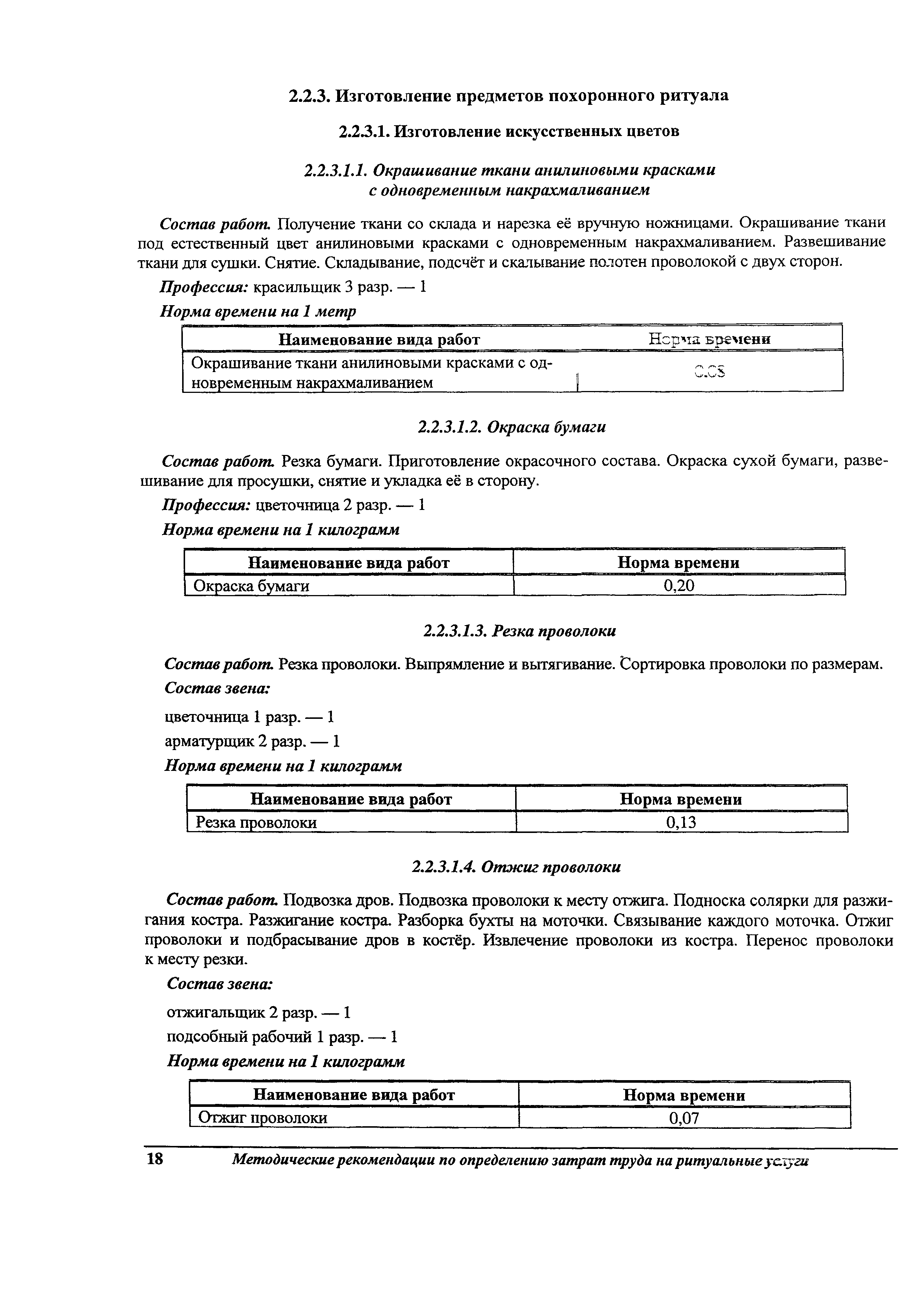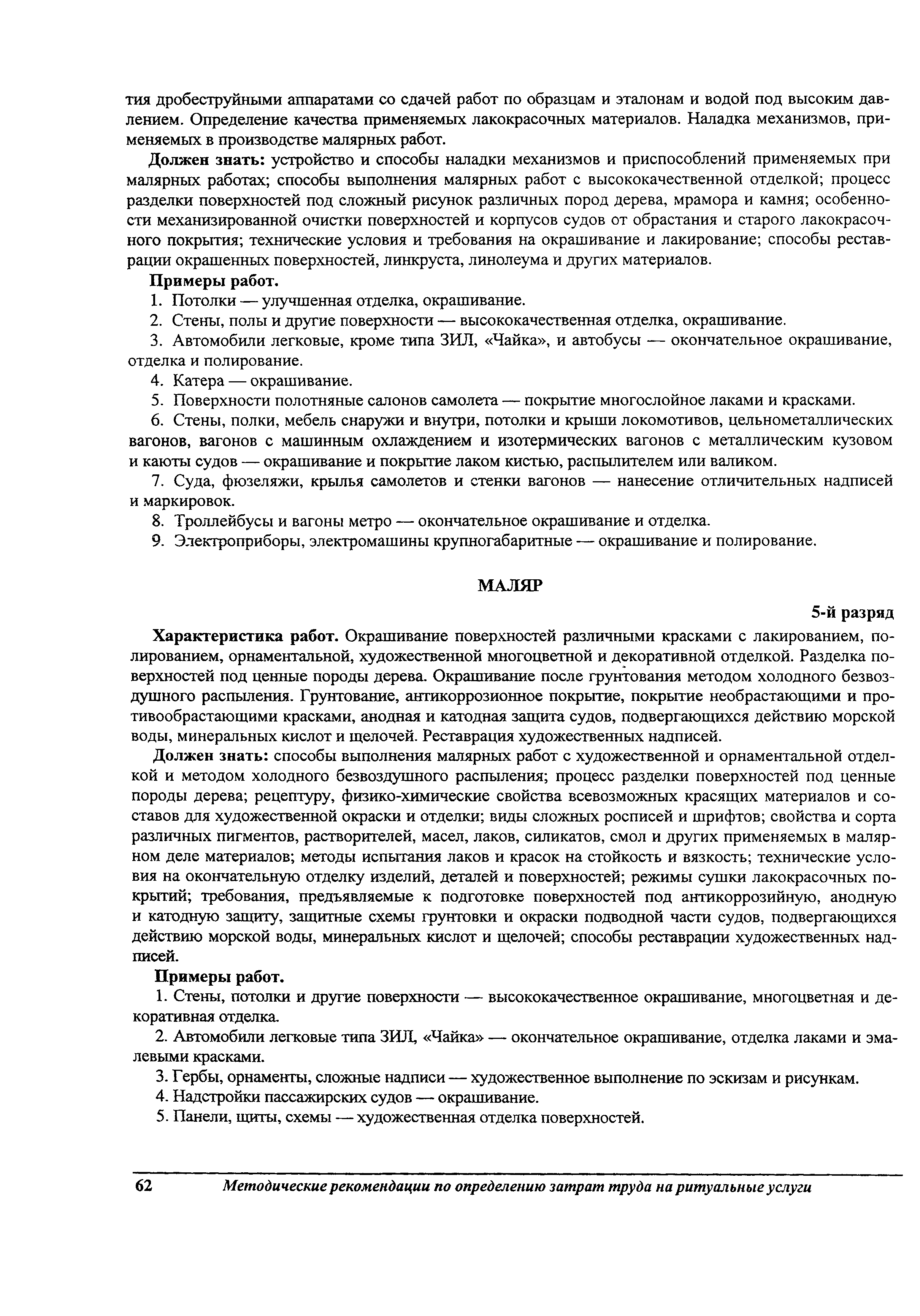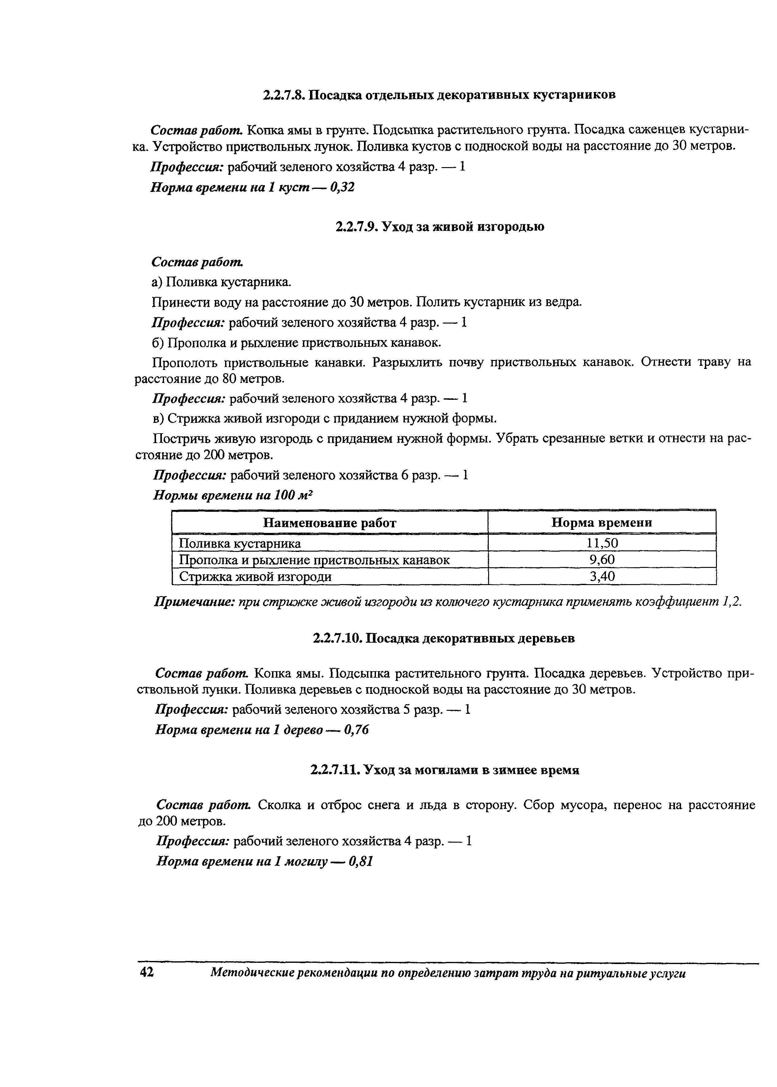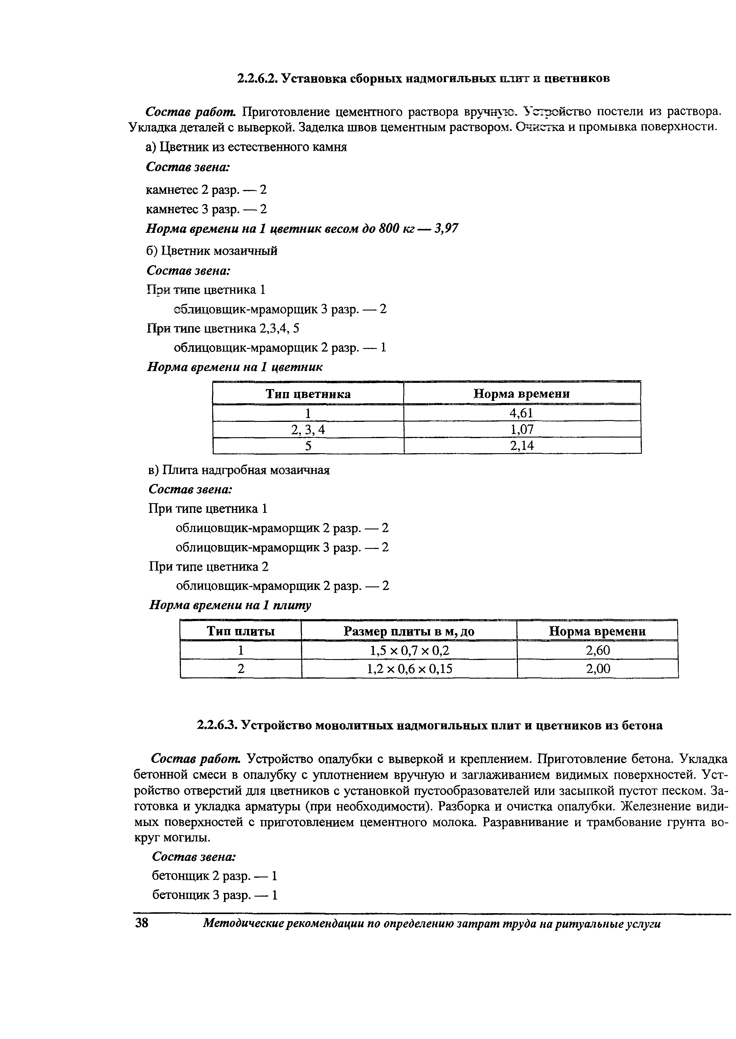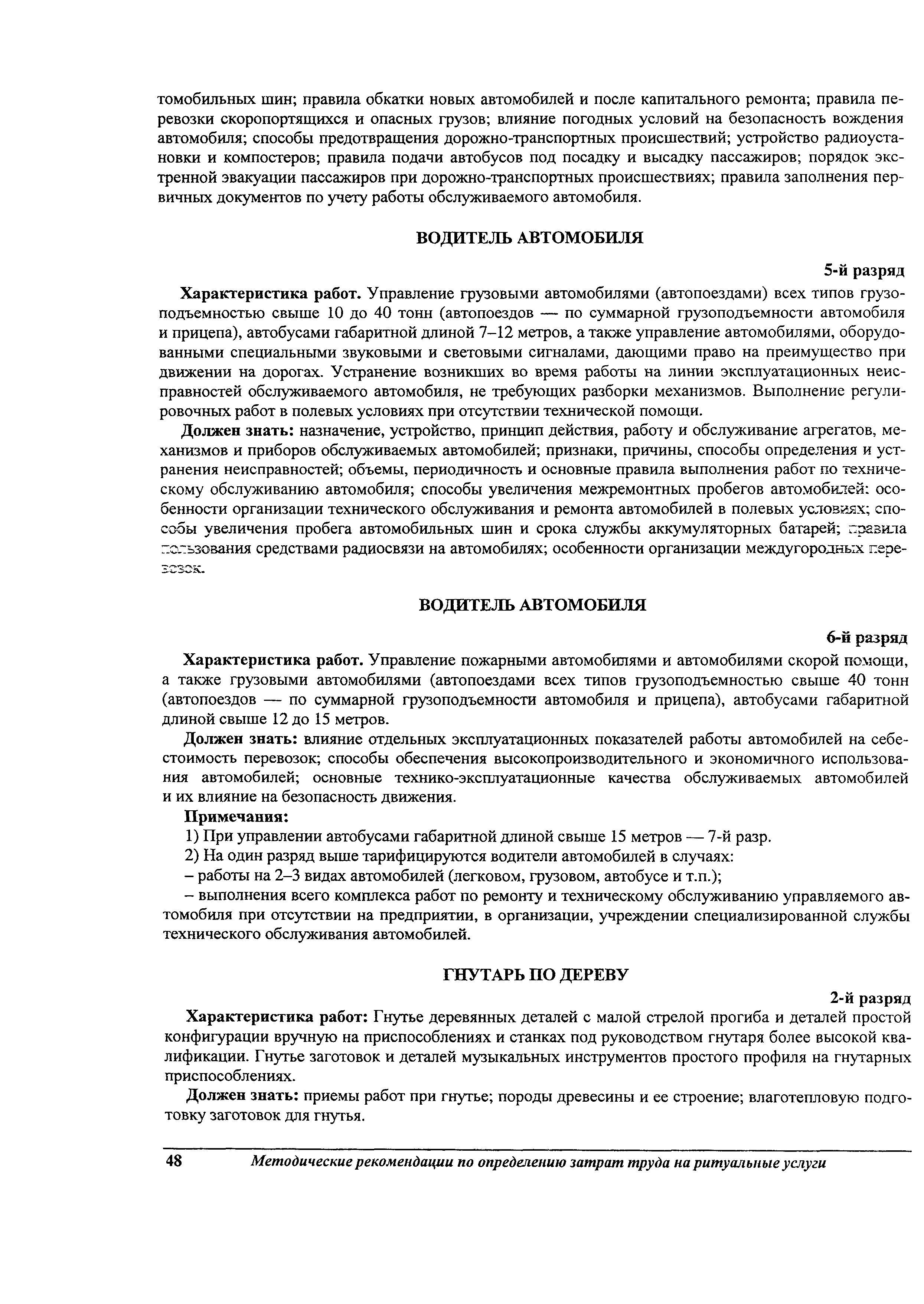 Методические рекомендации по определению затрат труда на оказание ритуальных услуг| Статус: | не действует | | Название рус.: | Методические рекомендации по определению затрат труда на оказание ритуальных услуг | | Дата добавления в базу: | 01.09.2013 | | Дата актуализации: | 01.09.2013 | | Область применения: | Предназначены для определения стоимости ритуальных услуг, финансируемых за счет средств бюджетов Российской Федерации и местных бюджетов (гарантируемый перечень услуг по погребению), а также определения стоимости услуг, предоставляемых сверх гарантированного перечня услуг по погребению за счет средств лица, взявшего на себя обязанность осуществить погребение умершего. | | Оглавление: | 1 Общая часть 2 Нормативная часть 2.1. Нормы обслуживания на работы по ритуальному обслуживанию населения 2.2. Нормы времени на работы по ритуальному обслуживанию населения 2.3. Тарифно-квалификационные характеристики работников ритуального обслуживания населения |