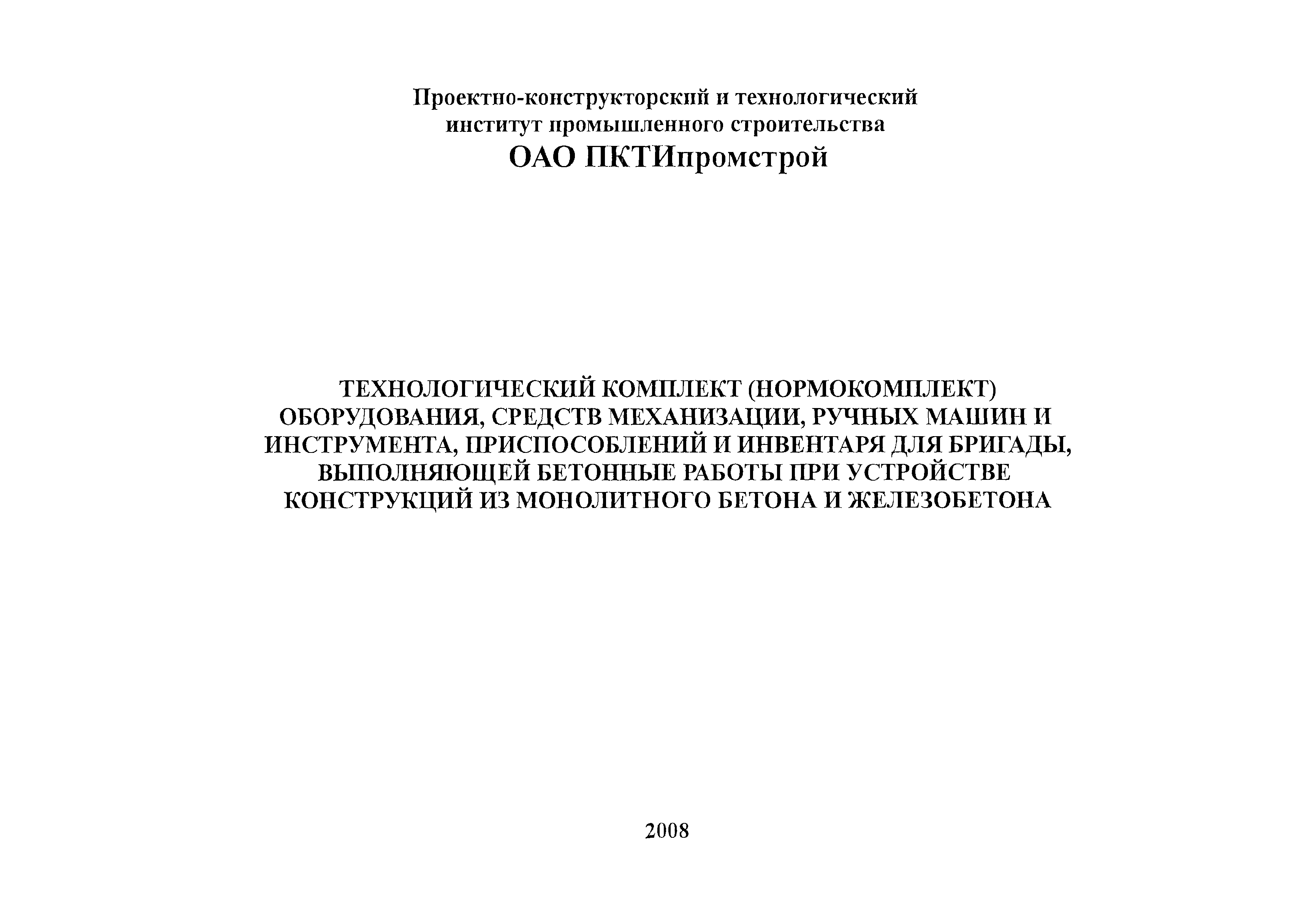 | Название рус.: | Технологический комплект (нормокомплект) оборудования, средств механизации, ручных машин и инструмента, приспособлений и инвентаря для бригады, выполняющей бетонные работы при устройстве конструкций из монолитного бетона и железобетона |
