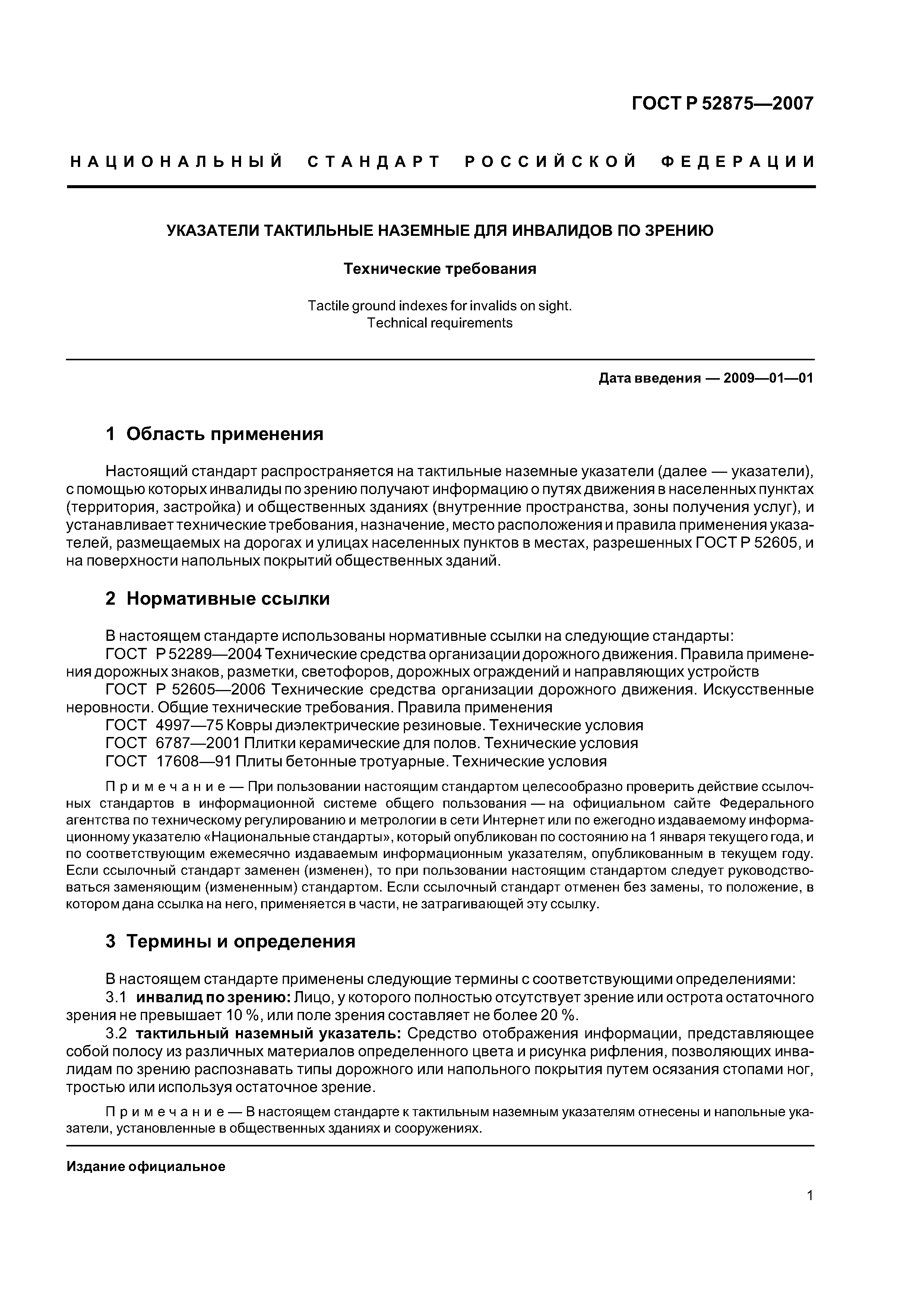 | Область применения: | Стандарт распространяется на тактильные наземные указатели, с помощью которых инвалиды по зрению получают информацию о путях движения в населенных пунктах (территория, застройка) и общественных зданиях (внутренние пространства, зоны получения услуг), и устанавливает технические требования, назначение, место расположения и правила применения указателей, размещаемых на дорогах населенных пунктов в местах, разрешенных ГОСТ Р 52605, и на поверхности напольных покрытий общественных зданий. |