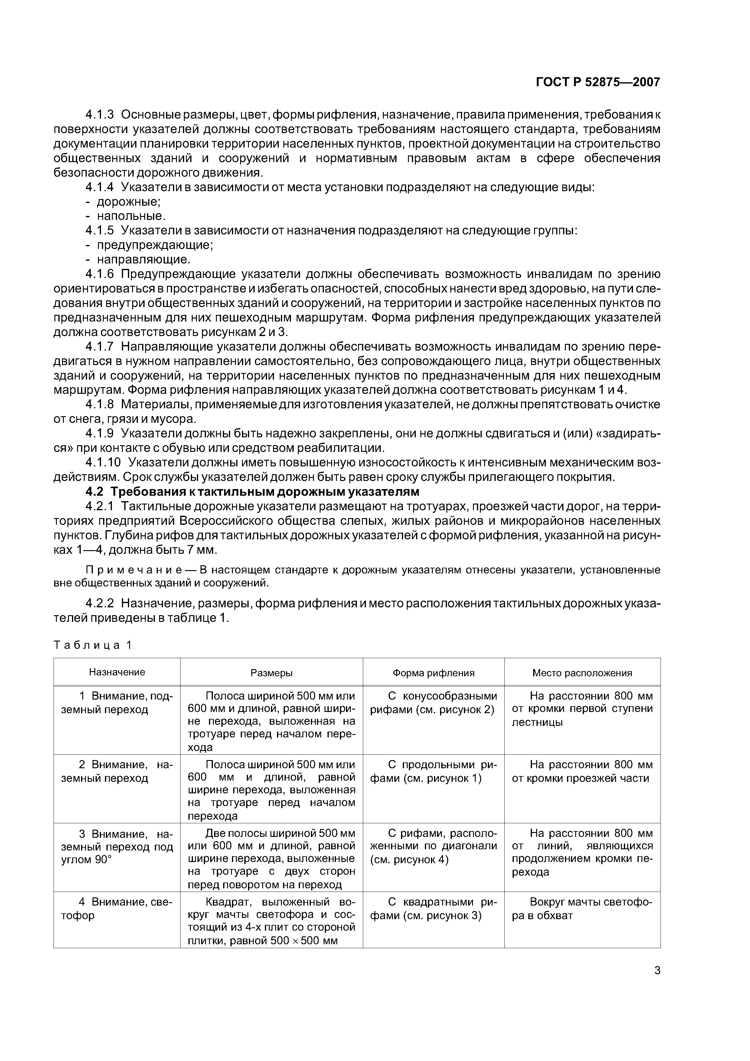 | Оглавление: | 1 Область применения 2 Нормативные ссылки 3 Термины и определения 4 Технические требования 4.1 Общие положения 4.2 Требования к тактильным дорожным указателям 4.3 Требования к тактильным напольным указателям |