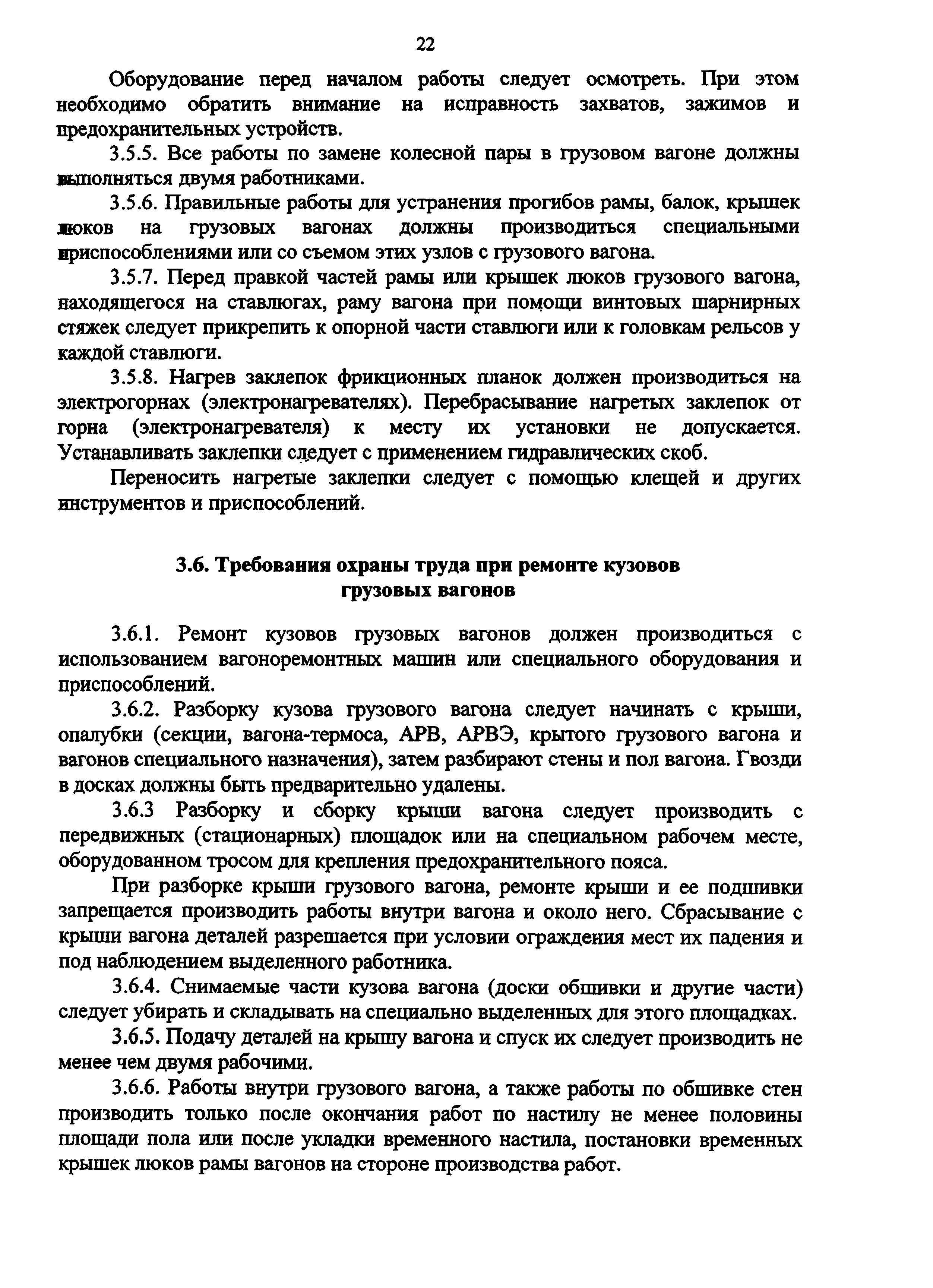 Инструкция по охране труда для осмотрщика вагонов, осмотрщика-ремонтника вагонов и слесаря по ремонту подвижного состава в вагонном хозяйстве ОАО "РЖД"| Статус: | заменен | | Название рус.: | Инструкция по охране труда для осмотрщика вагонов, осмотрщика-ремонтника вагонов и слесаря по ремонту подвижного состава в вагонном хозяйстве ОАО "РЖД" | | Дата добавления в базу: | 01.09.2013 | | Дата актуализации: | 01.01.2021 | | Дата введения: | 15.02.2014 | | Область применения: | Инструкция разработана на основе правил по охране труда при техническом обслуживании и ремонте грузовых вагонов и рефрижераторного подвижного состава, утвержденных МПС России 3 октября 1996 года ПОТ РО-32-ЦВ-400-96, других нормативных актов по вопросам охраны труда, и устанавливает основные требования охраны труда для осмотрщика вагонов, осмотрщика-ремонтника вагонов и слесаря по ремонту подвижного состава, занятых на работах по техническому обслуживанию и ремонту грузовых вагонов на пунктах технического обслуживания грузовых вагонов, контрольных постах, пунктах перестановки вагонов и в грузовых вагонных депо ОАО "РЖД" | | Оглавление: | 1. Общие требования охраны труда 2. Требования охраны труда перед началом работы 3. Требования охраны труда во время работы 4. Требования охраны труда в аварийных ситуациях 5. Требования охраны труда по окончании работы | | Разработан: | ФГУП ВНИИЖТ МПС России ПКБ ЦВ ОАО РЖД