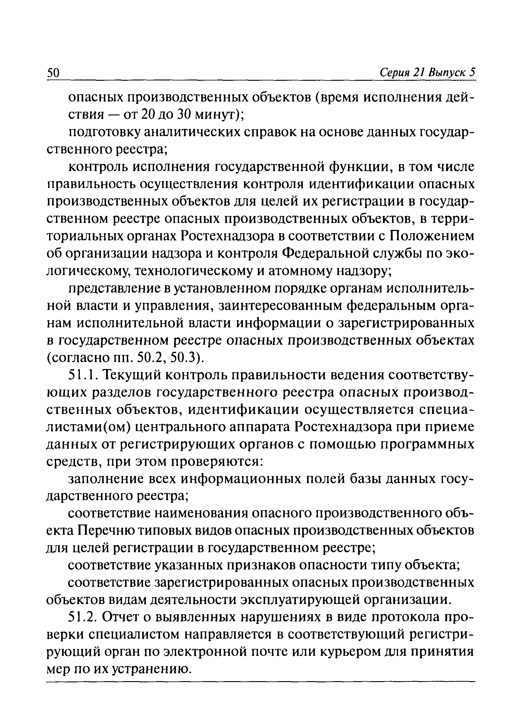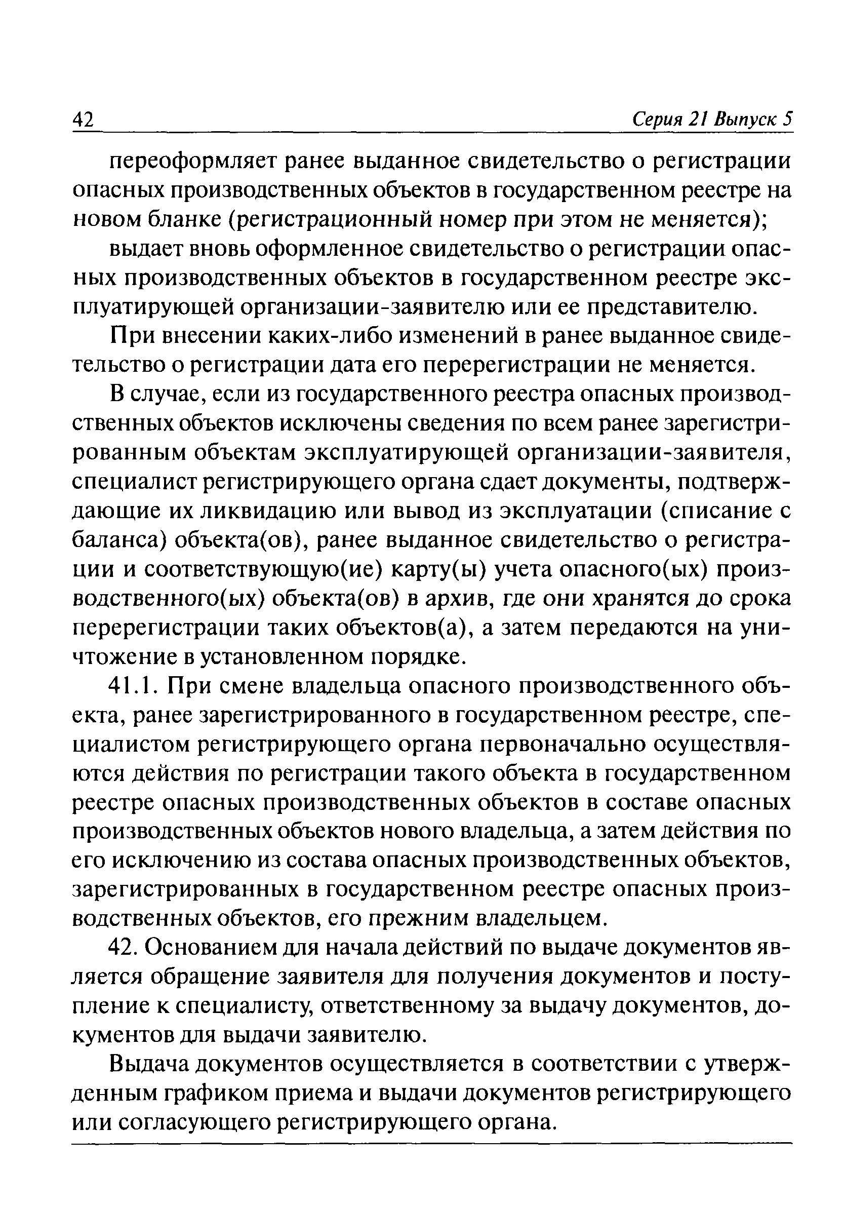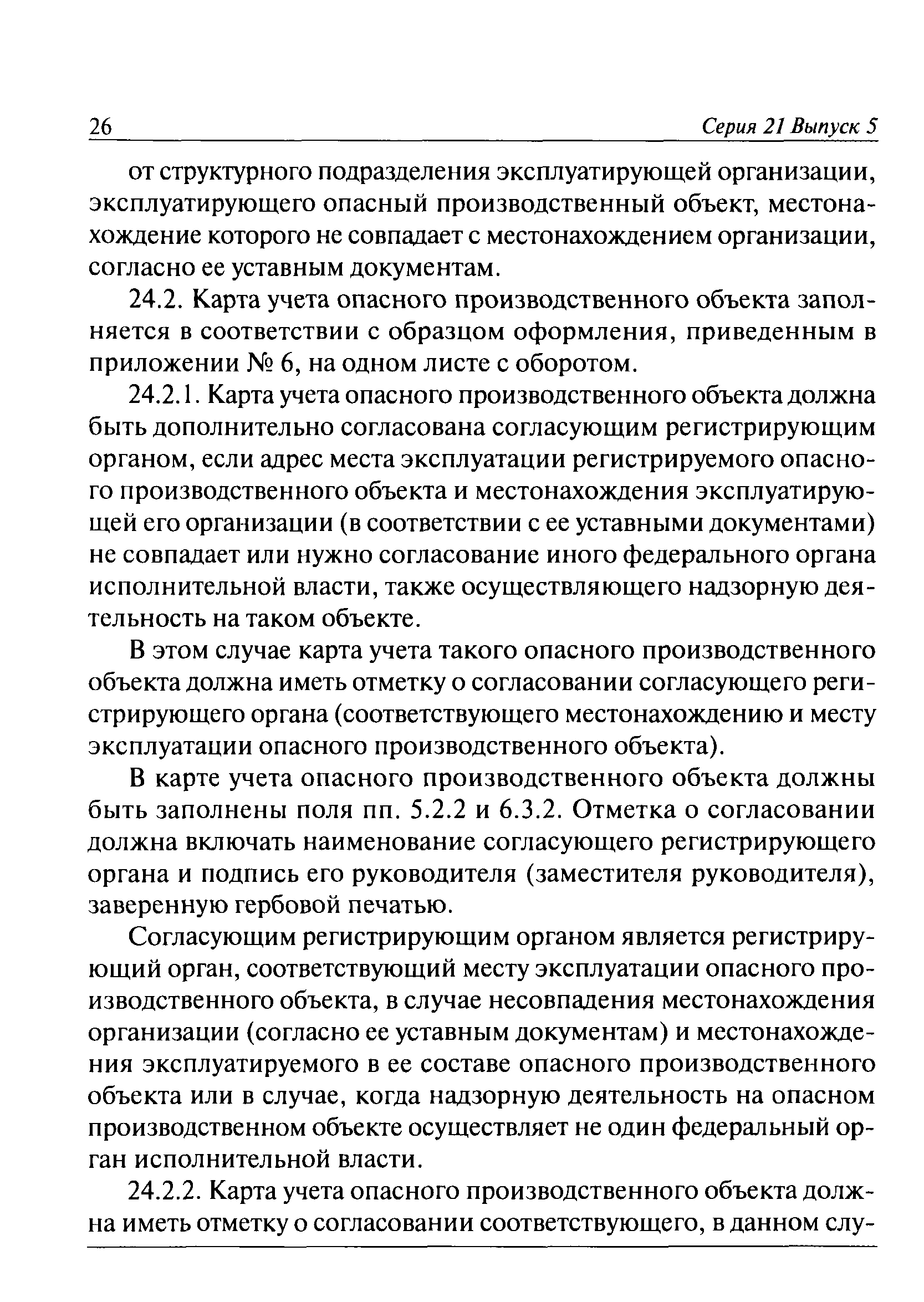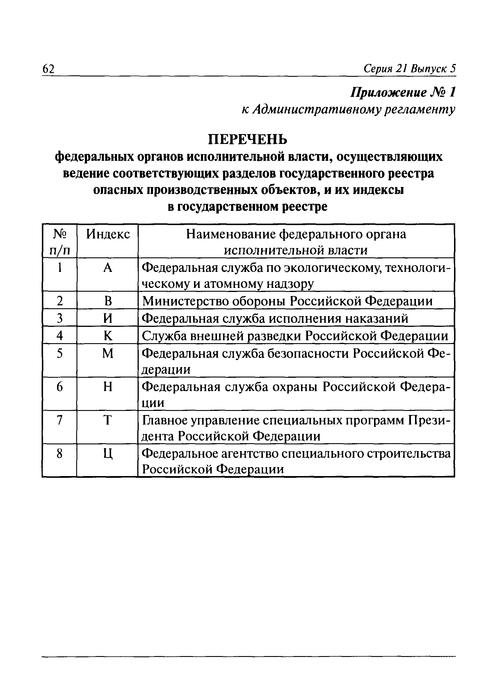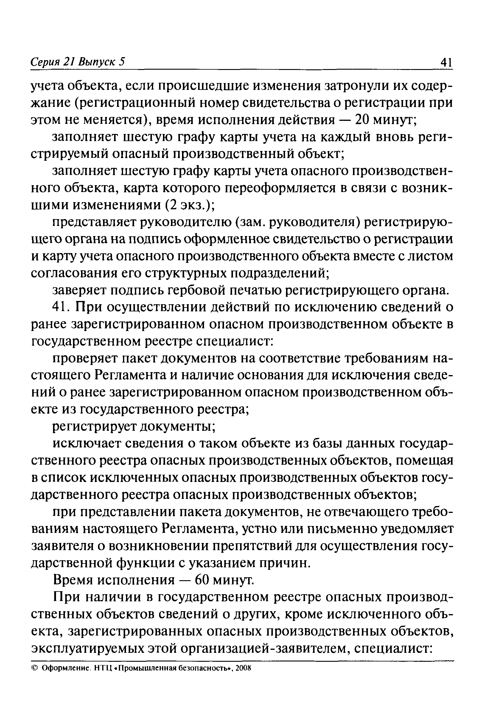 | Оглавление: | I. Общие положения II. Требования к порядку исполнения государственной функции III. Административные процедуры Приложение № 1. Перечень федеральных органов исполнительной власти, осуществляющих ведение соответствующих разделов государственного реестра опасных производственных объектов, и их индексы в государственном реестре Приложение № 2. Перечень кодов (индексов) субъектов Российской Федерации Приложение № 3. Список территориальных органов Ростехнадзора Приложение № 4. Блок схема исполнения государственной функции по регистрации опасных производственных объектов и ведению государственного реестра опасных производственных объектов Приложение № 5. Образец Заявления эксплуатирующей организации Приложение № 6. Образец Карты учета объекта в государственном реестре опасных производственных объектов Требования к порядку оформления карты учета Приложение № 7. Образец оформления документа Приложение № 8. Критерии идентификации Приложение № 9. Образец бланка Свидетельства о регистрации |