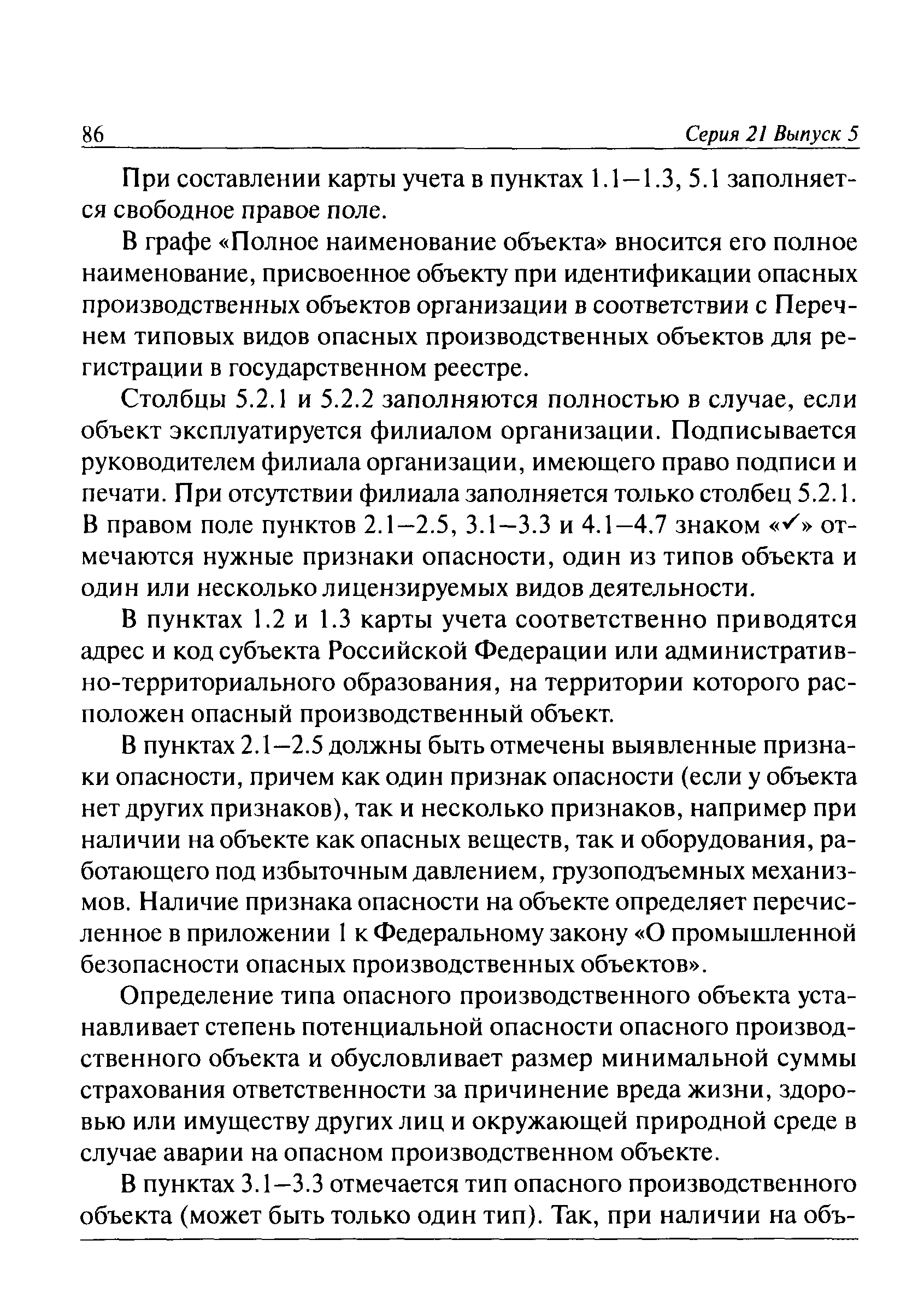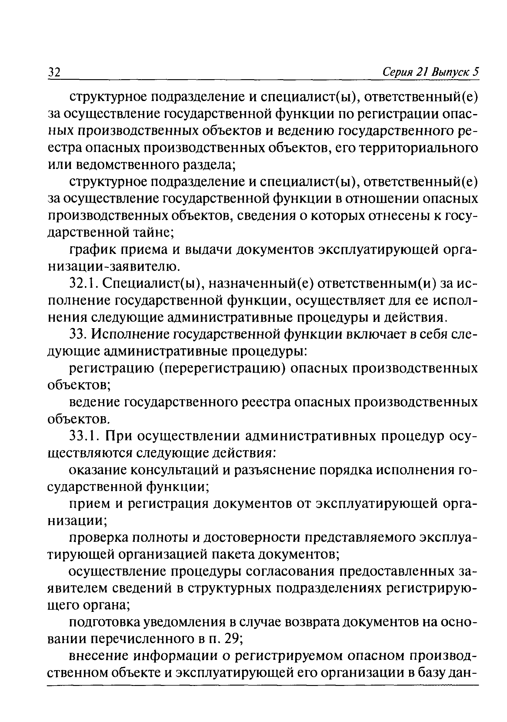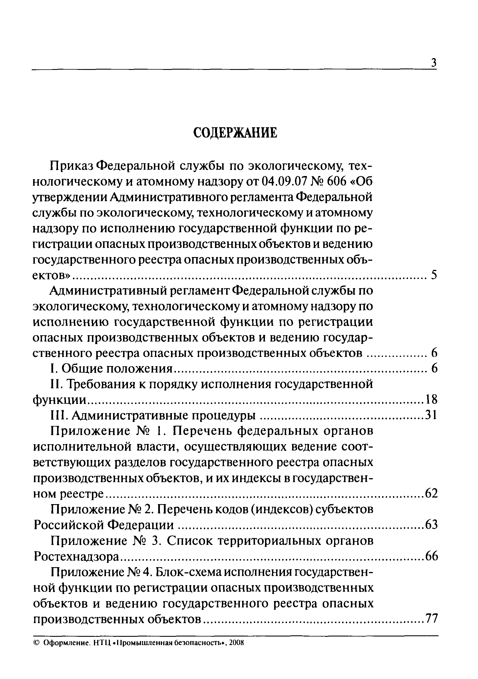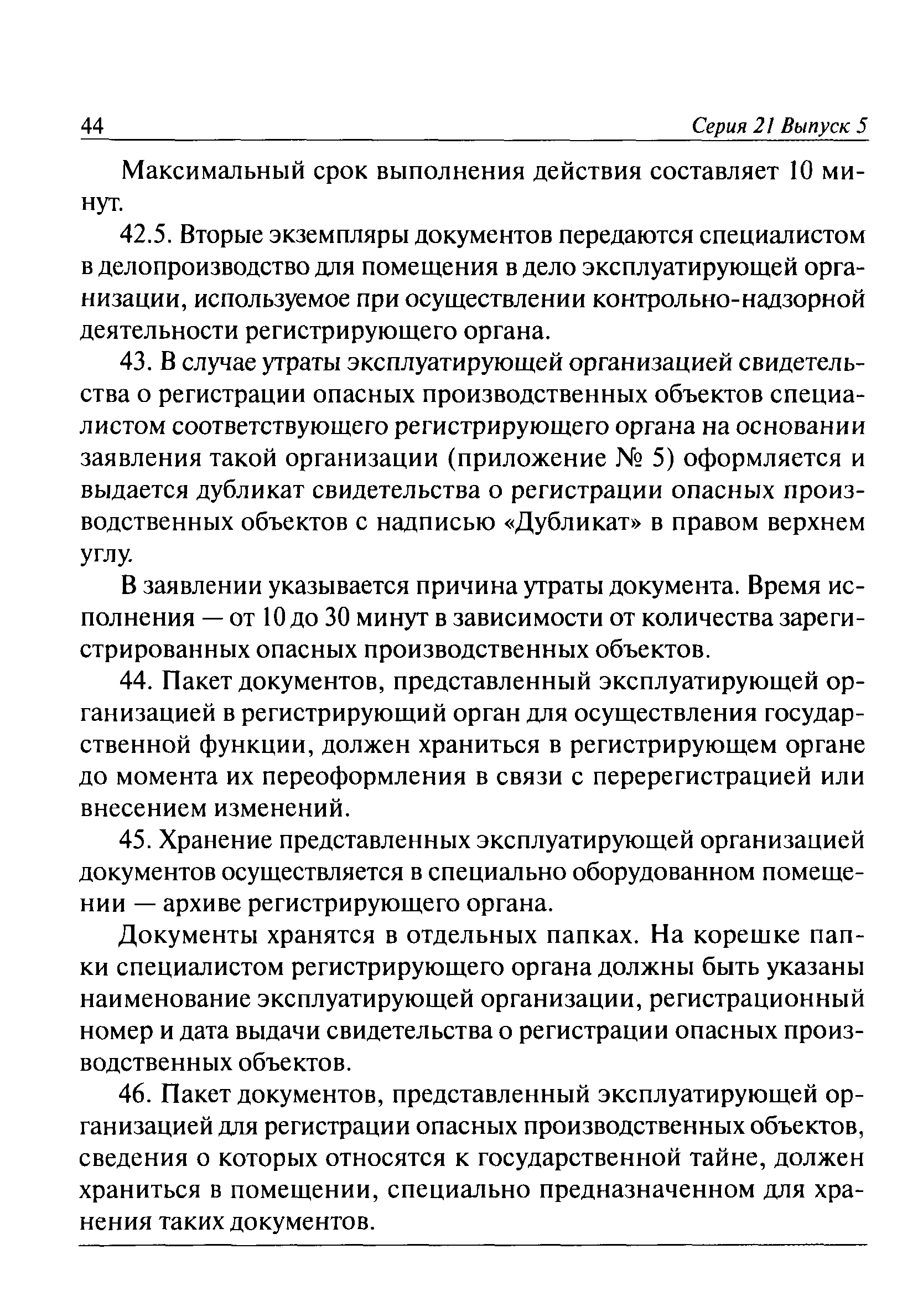 | Оглавление: | I. Общие положения II. Требования к порядку исполнения государственной функции III. Административные процедуры Приложение № 1. Перечень федеральных органов исполнительной власти, осуществляющих ведение соответствующих разделов государственного реестра опасных производственных объектов, и их индексы в государственном реестре Приложение № 2. Перечень кодов (индексов) субъектов Российской Федерации Приложение № 3. Список территориальных органов Ростехнадзора Приложение № 4. Блок схема исполнения государственной функции по регистрации опасных производственных объектов и ведению государственного реестра опасных производственных объектов Приложение № 5. Образец Заявления эксплуатирующей организации Приложение № 6. Образец Карты учета объекта в государственном реестре опасных производственных объектов Требования к порядку оформления карты учета Приложение № 7. Образец оформления документа Приложение № 8. Критерии идентификации Приложение № 9. Образец бланка Свидетельства о регистрации |