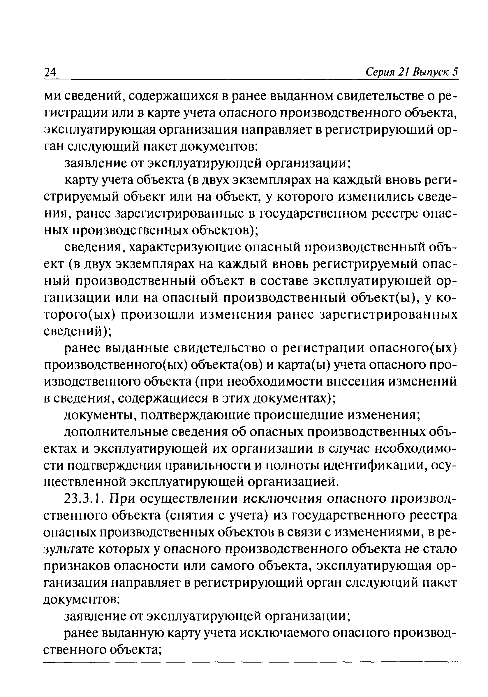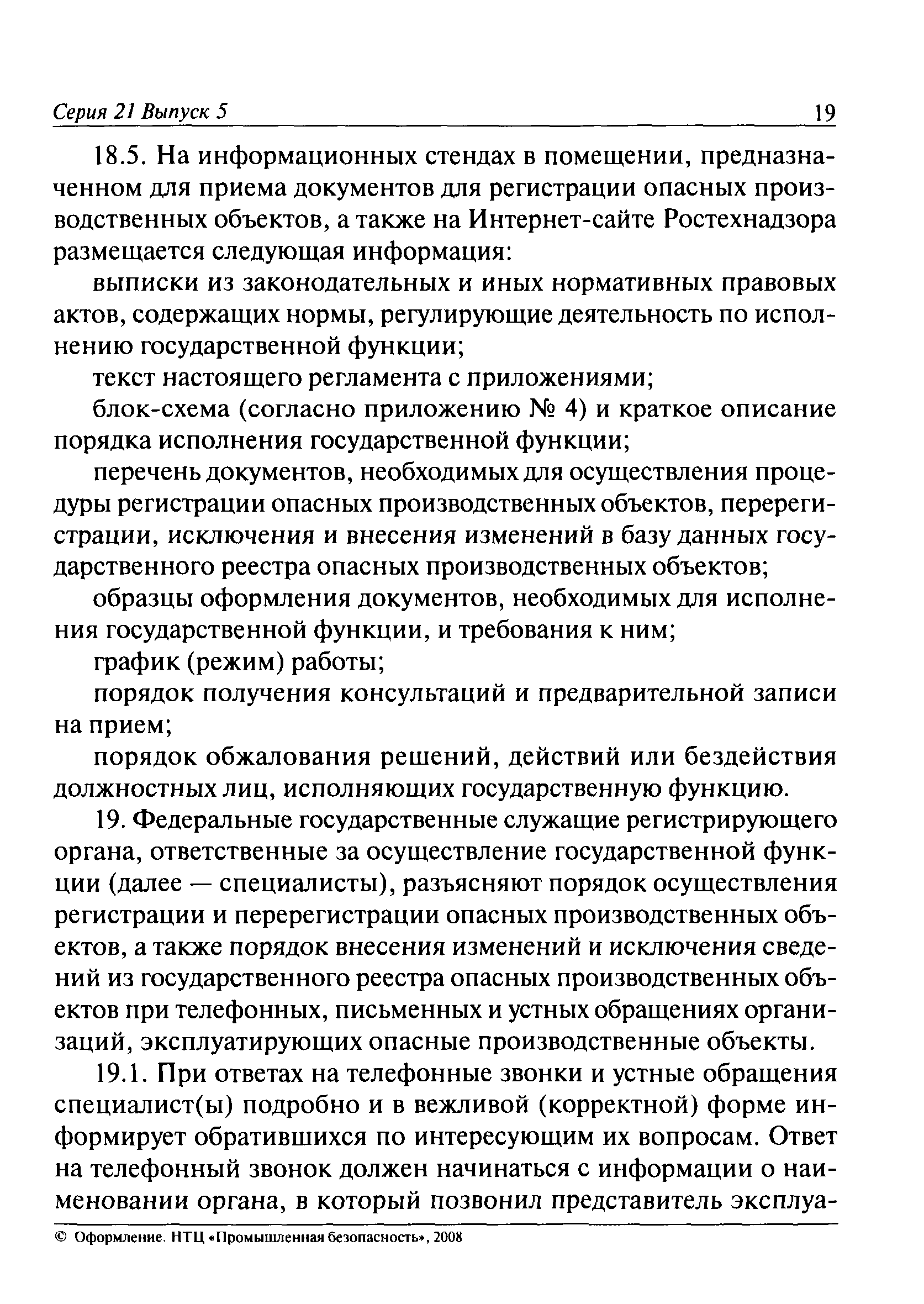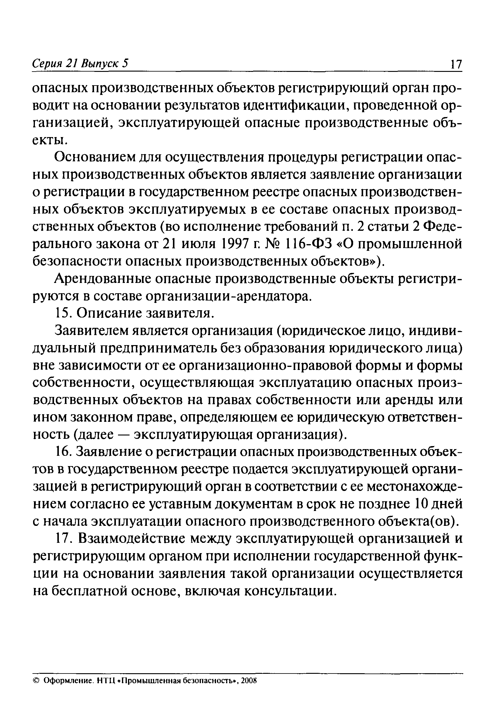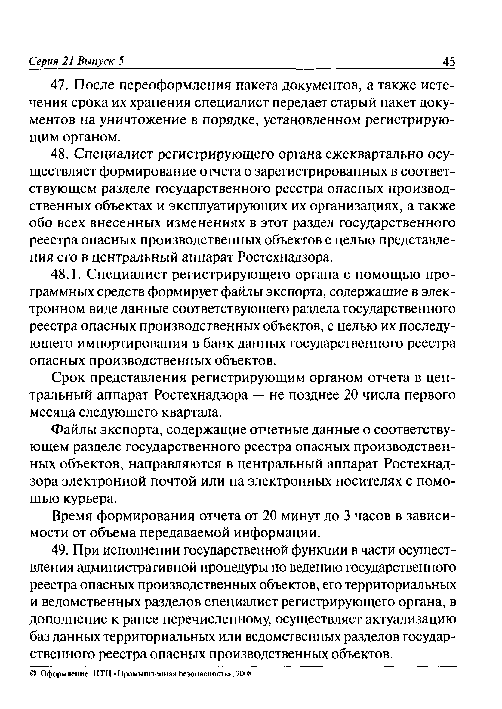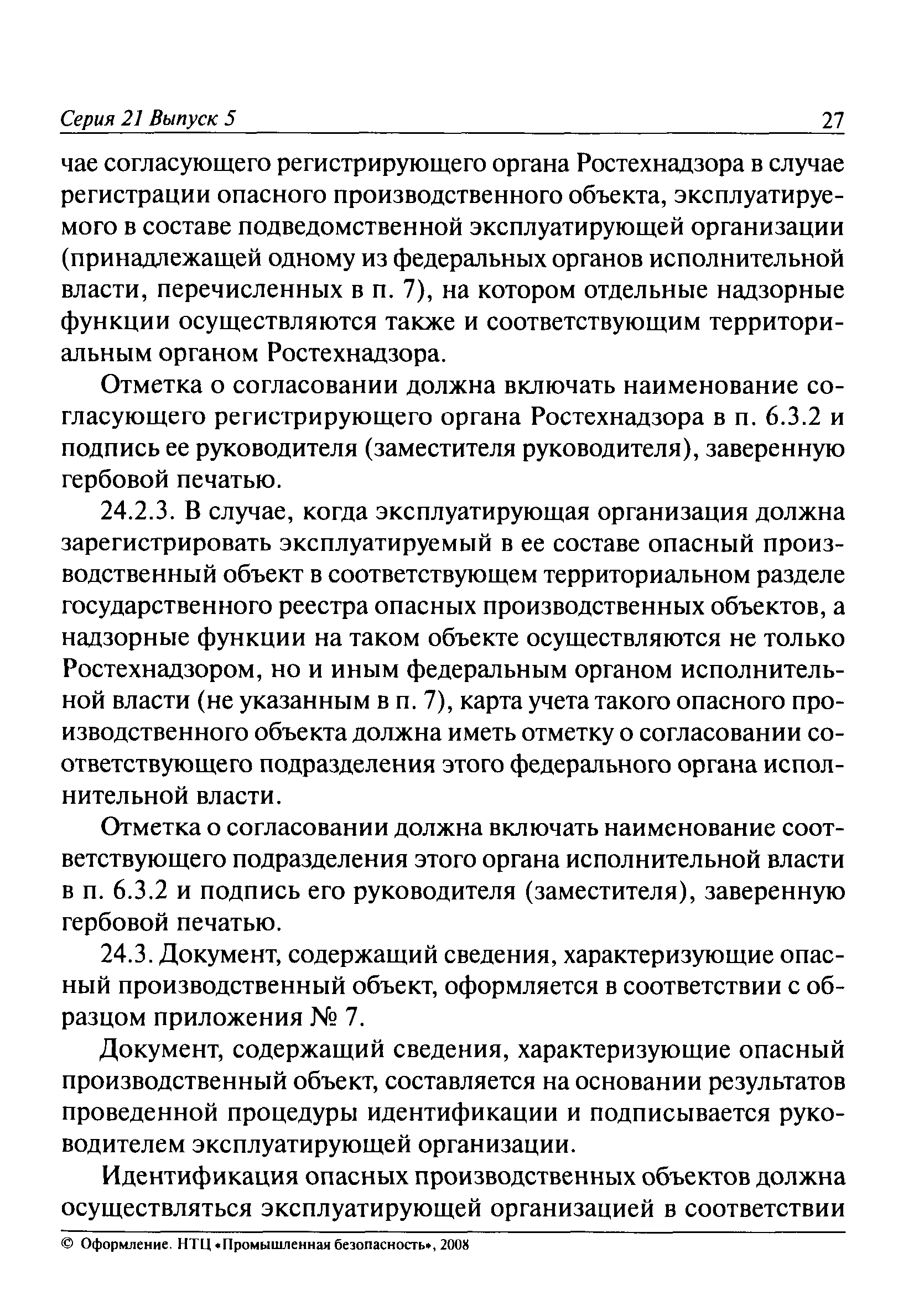 | Оглавление: | I. Общие положения II. Требования к порядку исполнения государственной функции III. Административные процедуры Приложение № 1. Перечень федеральных органов исполнительной власти, осуществляющих ведение соответствующих разделов государственного реестра опасных производственных объектов, и их индексы в государственном реестре Приложение № 2. Перечень кодов (индексов) субъектов Российской Федерации Приложение № 3. Список территориальных органов Ростехнадзора Приложение № 4. Блок схема исполнения государственной функции по регистрации опасных производственных объектов и ведению государственного реестра опасных производственных объектов Приложение № 5. Образец Заявления эксплуатирующей организации Приложение № 6. Образец Карты учета объекта в государственном реестре опасных производственных объектов Требования к порядку оформления карты учета Приложение № 7. Образец оформления документа Приложение № 8. Критерии идентификации Приложение № 9. Образец бланка Свидетельства о регистрации |