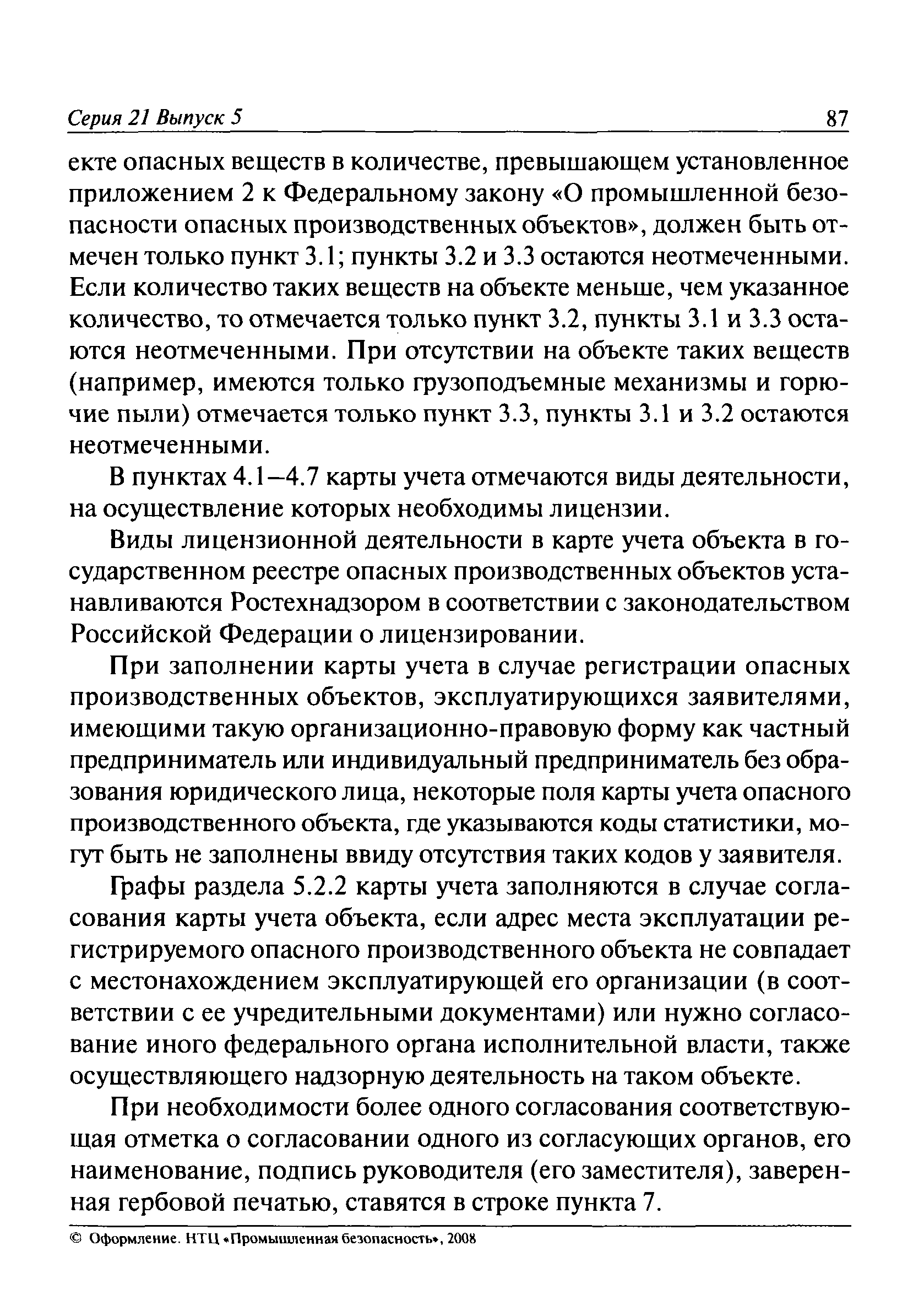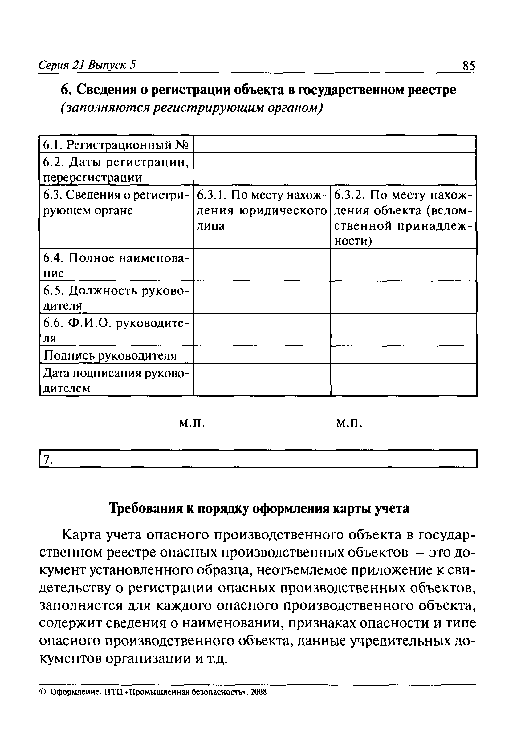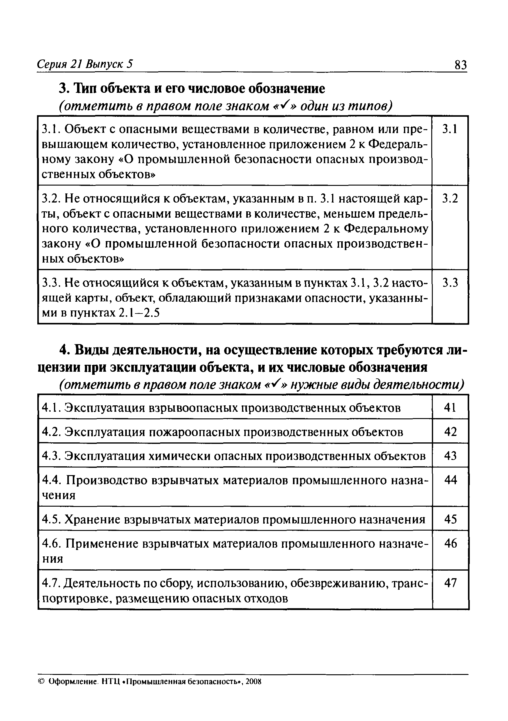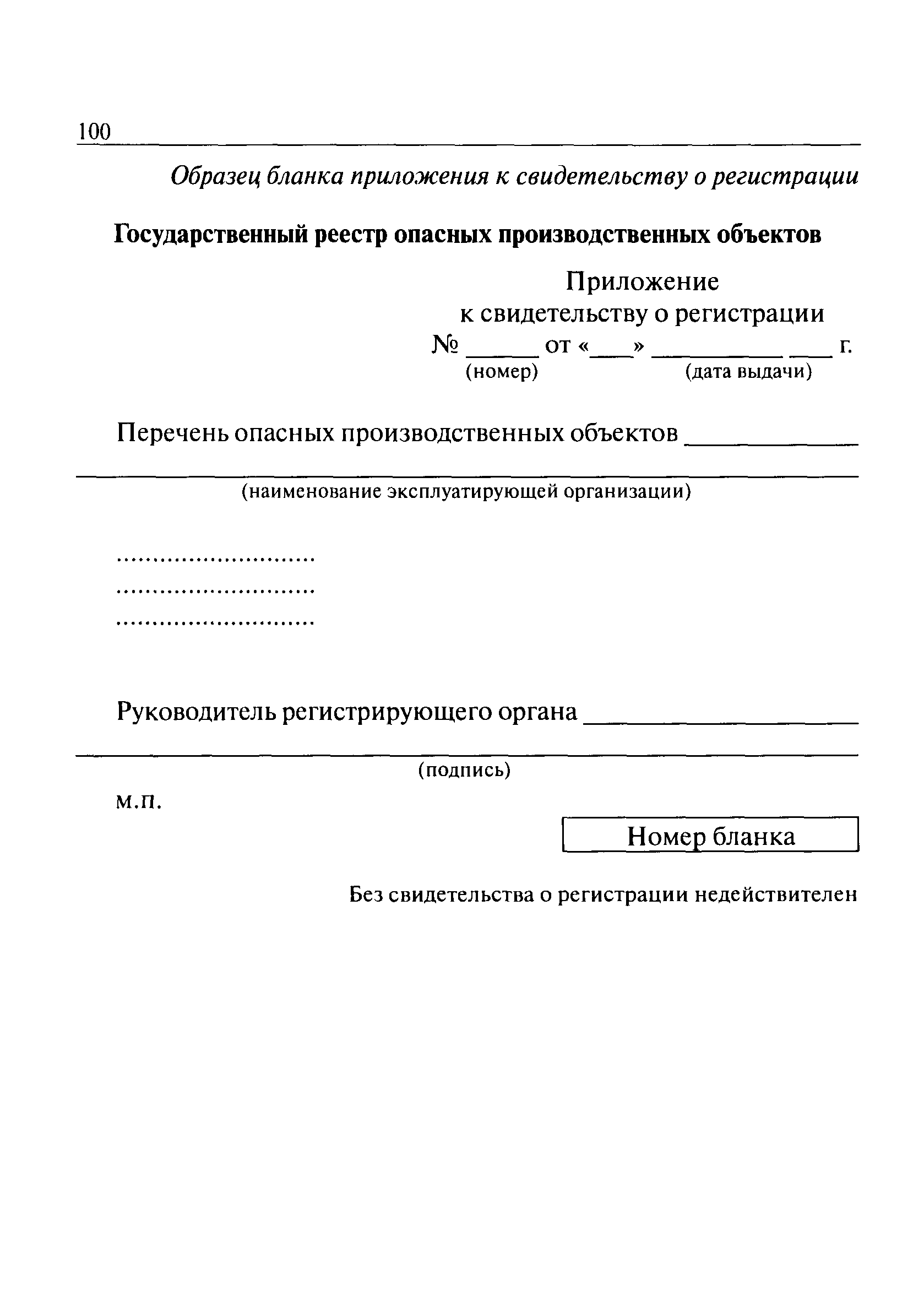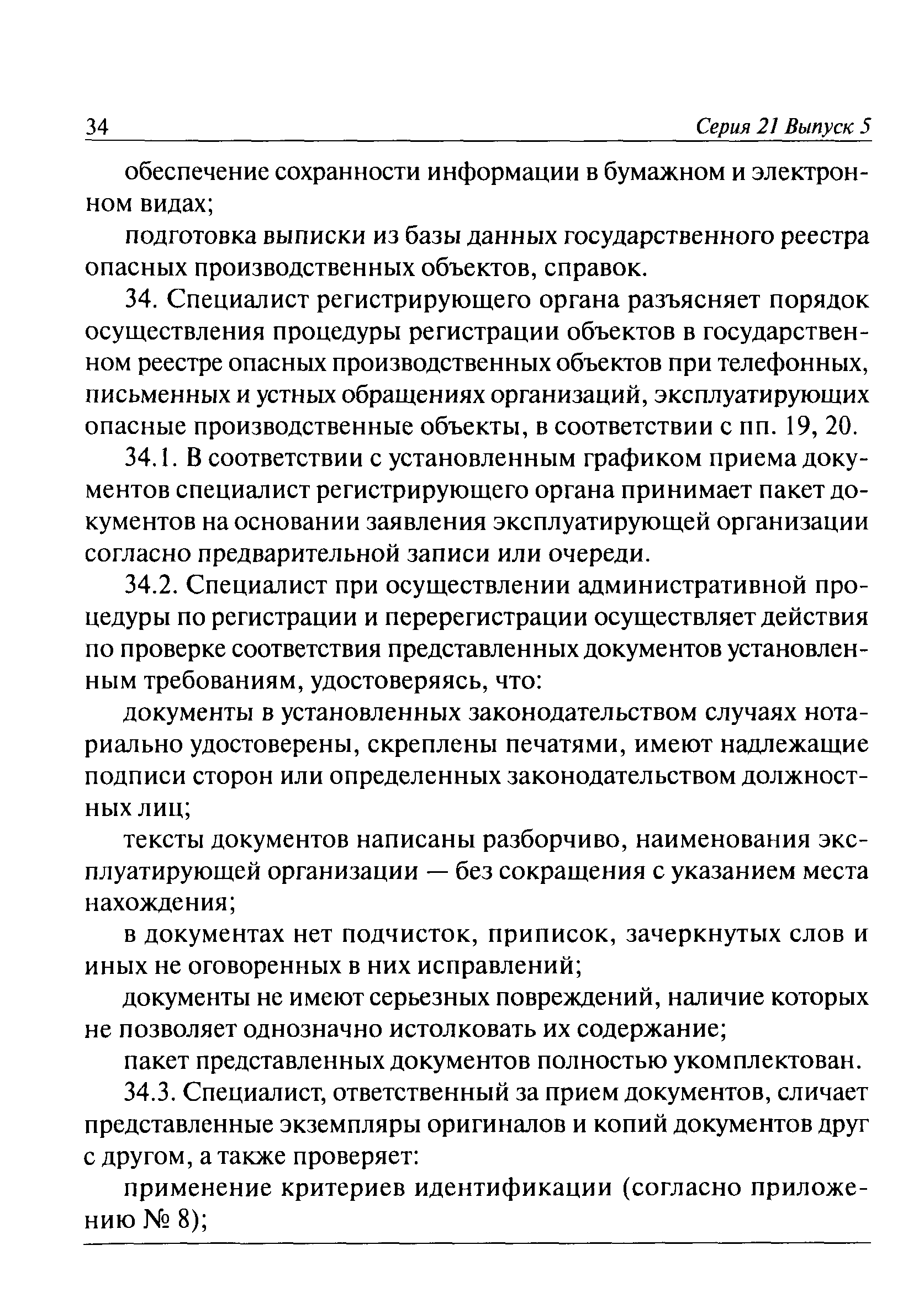 | Оглавление: | I. Общие положения II. Требования к порядку исполнения государственной функции III. Административные процедуры Приложение № 1. Перечень федеральных органов исполнительной власти, осуществляющих ведение соответствующих разделов государственного реестра опасных производственных объектов, и их индексы в государственном реестре Приложение № 2. Перечень кодов (индексов) субъектов Российской Федерации Приложение № 3. Список территориальных органов Ростехнадзора Приложение № 4. Блок схема исполнения государственной функции по регистрации опасных производственных объектов и ведению государственного реестра опасных производственных объектов Приложение № 5. Образец Заявления эксплуатирующей организации Приложение № 6. Образец Карты учета объекта в государственном реестре опасных производственных объектов Требования к порядку оформления карты учета Приложение № 7. Образец оформления документа Приложение № 8. Критерии идентификации Приложение № 9. Образец бланка Свидетельства о регистрации |