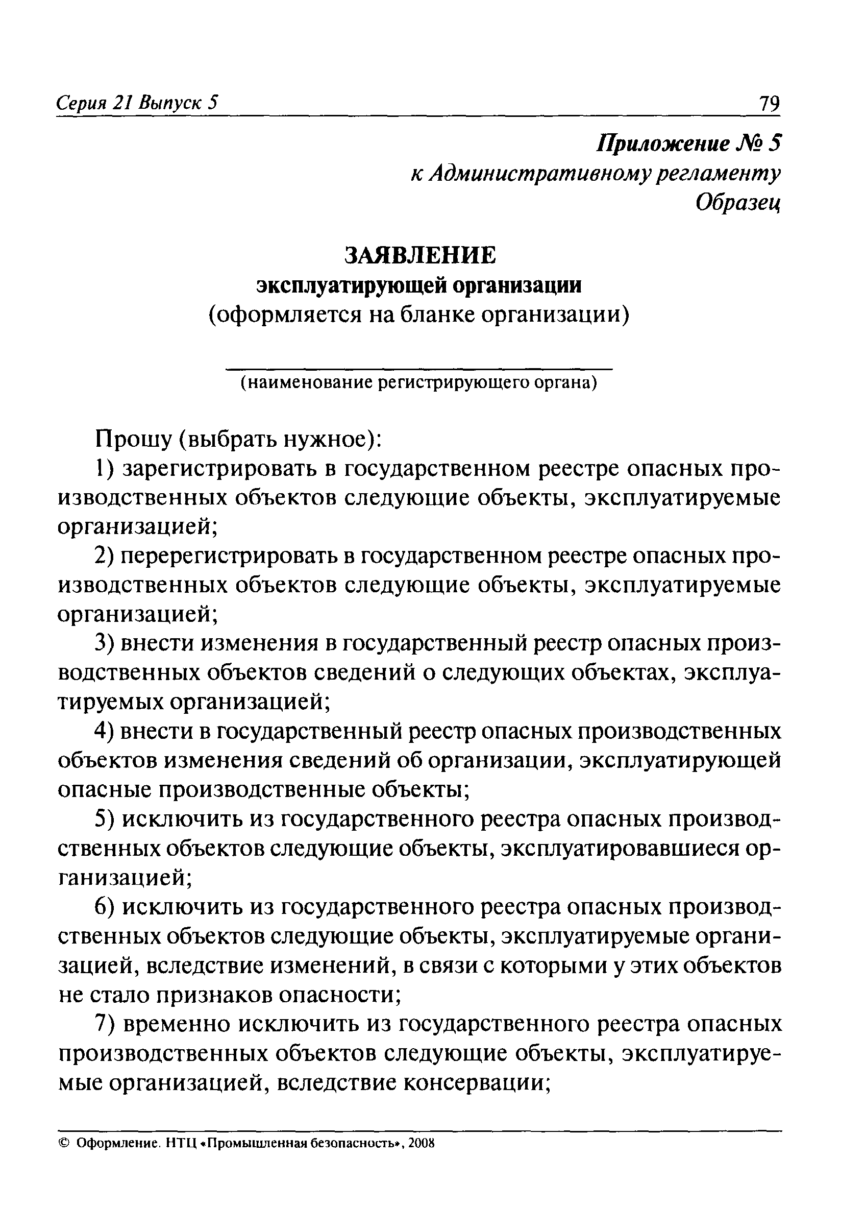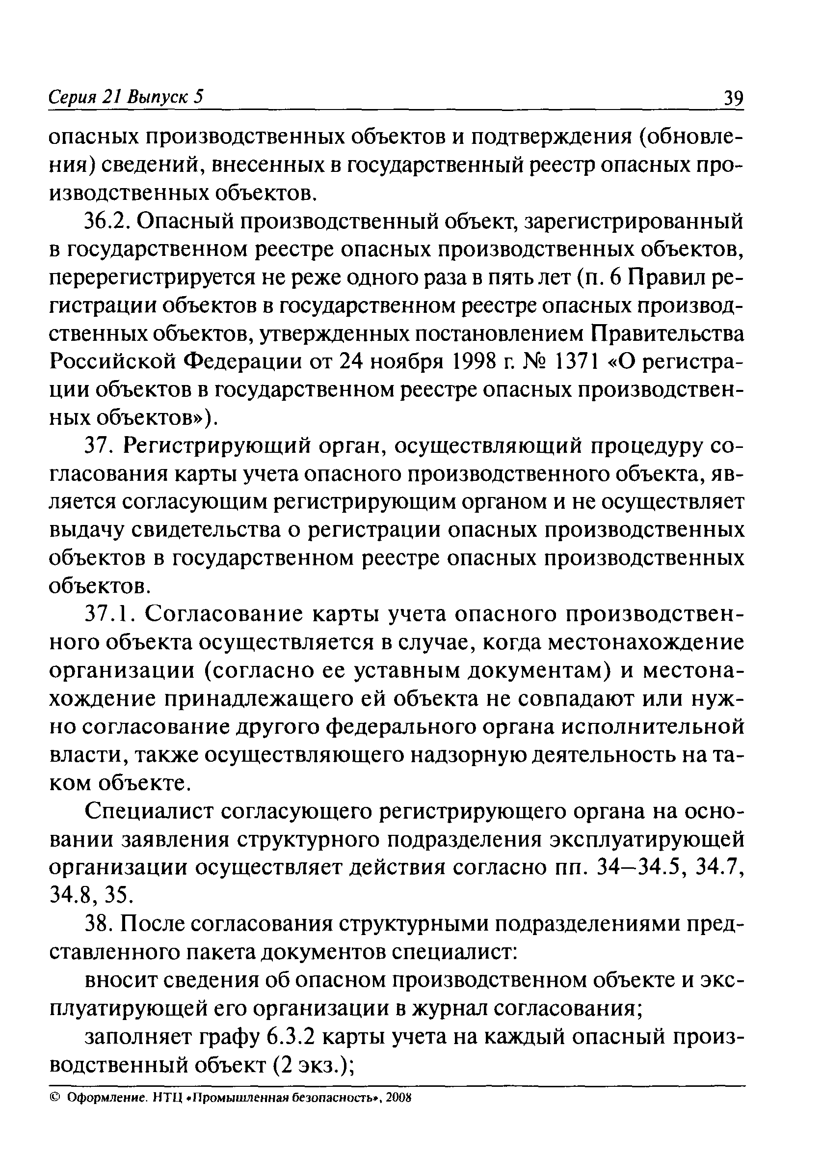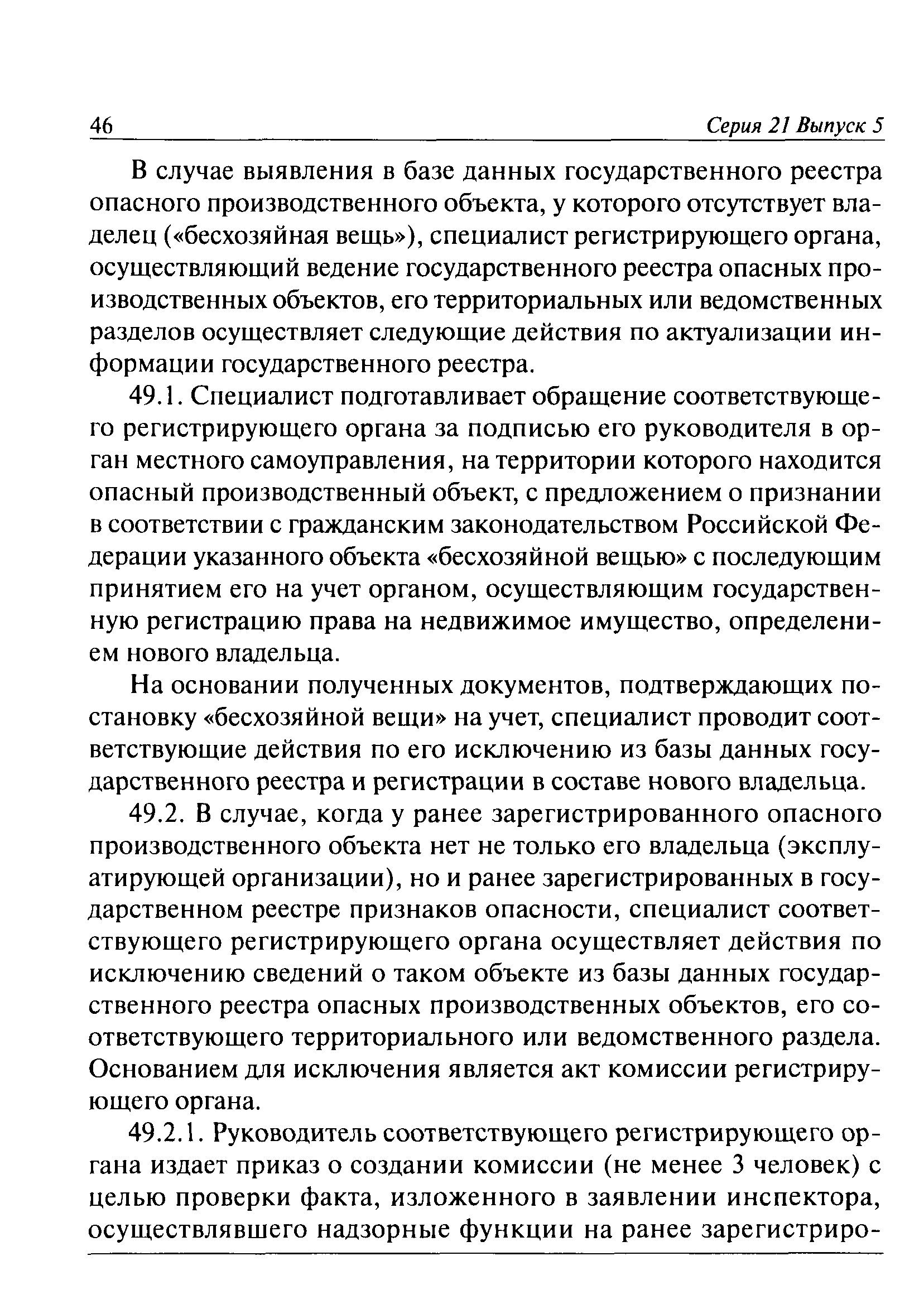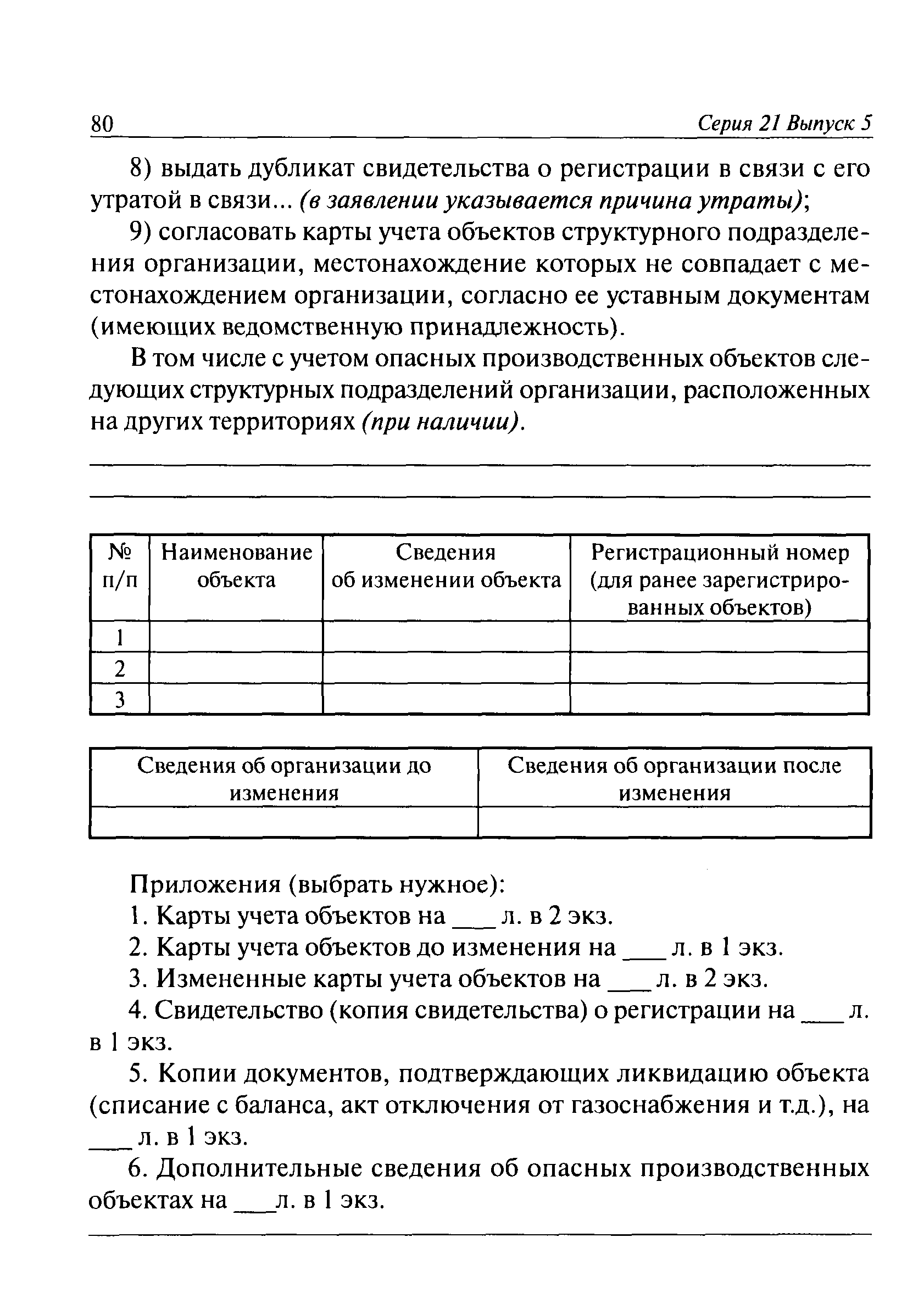 | Оглавление: | I. Общие положения II. Требования к порядку исполнения государственной функции III. Административные процедуры Приложение № 1. Перечень федеральных органов исполнительной власти, осуществляющих ведение соответствующих разделов государственного реестра опасных производственных объектов, и их индексы в государственном реестре Приложение № 2. Перечень кодов (индексов) субъектов Российской Федерации Приложение № 3. Список территориальных органов Ростехнадзора Приложение № 4. Блок схема исполнения государственной функции по регистрации опасных производственных объектов и ведению государственного реестра опасных производственных объектов Приложение № 5. Образец Заявления эксплуатирующей организации Приложение № 6. Образец Карты учета объекта в государственном реестре опасных производственных объектов Требования к порядку оформления карты учета Приложение № 7. Образец оформления документа Приложение № 8. Критерии идентификации Приложение № 9. Образец бланка Свидетельства о регистрации |