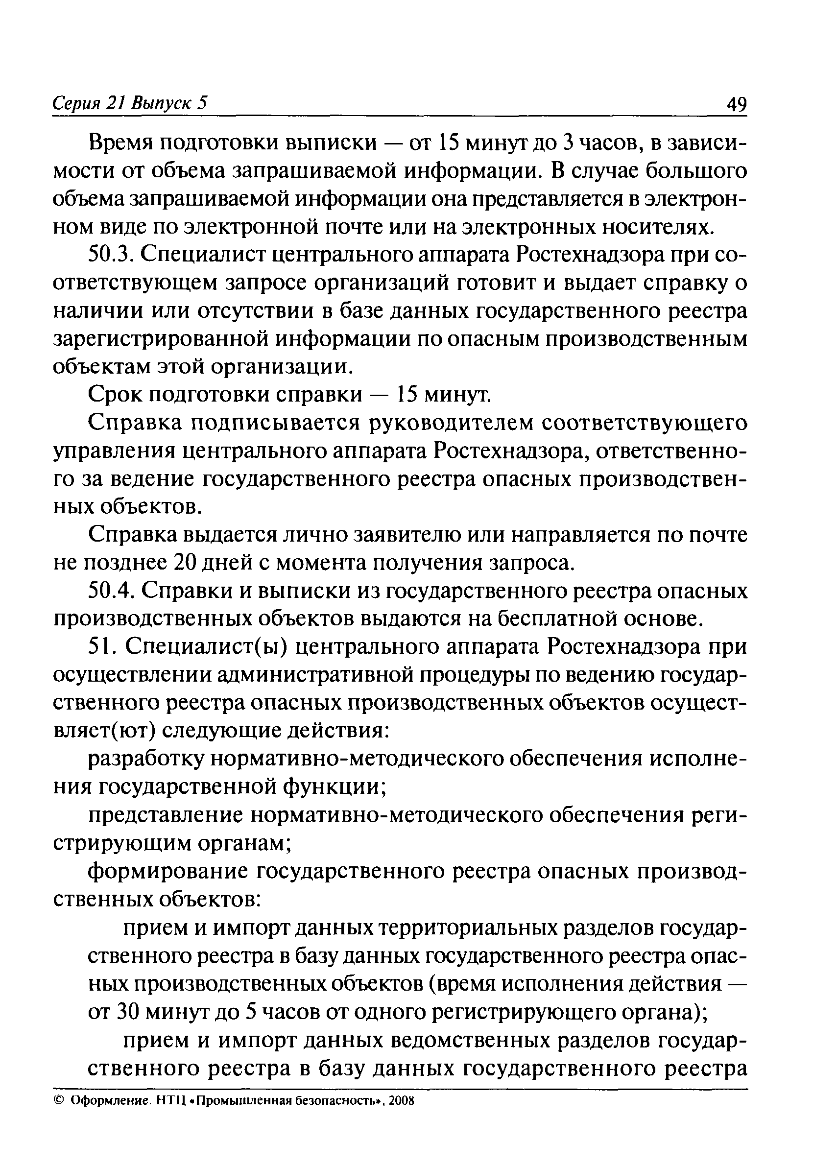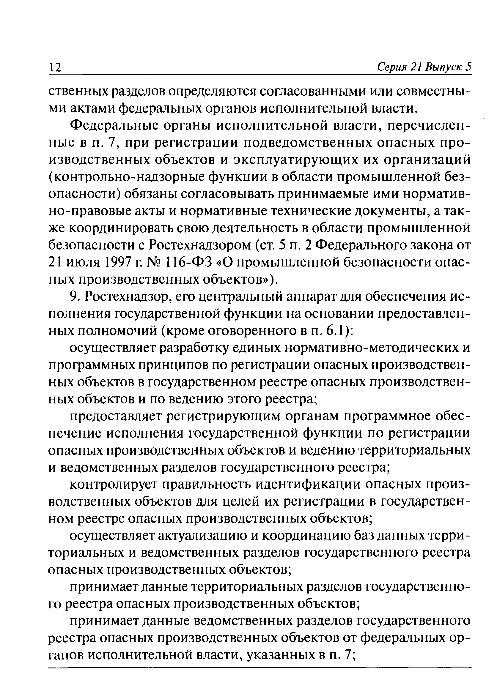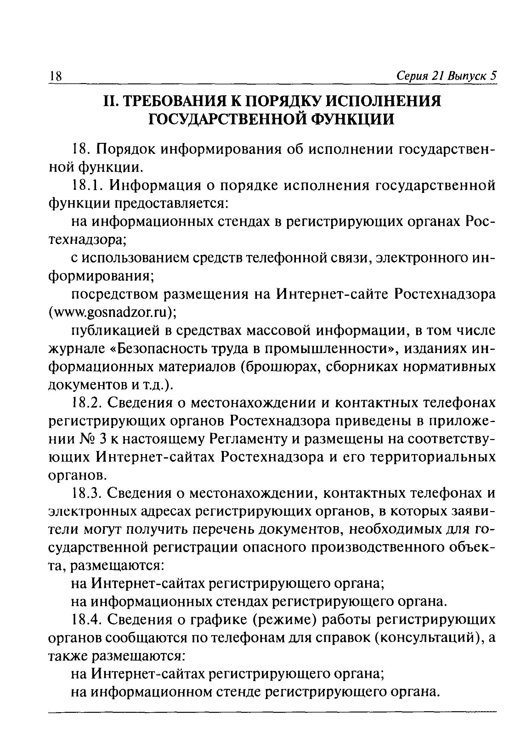 | Область применения: | Регламент определяет: порядок и сроки осуществления действий (административных процедур) при регистрации опасных производственных объектов и ведении государственного реестра опасных производственных объектов; порядок взаимодействия Ростехнадзора, его территориальных органов, осуществляющих государственную функцию по регистрации опасных производственных объектов и ведению территориальных разделов государственного реестра опасных производственных объектов, с иными федеральными органами исполнительной власти, которым предоставлено право регистрации подведомственных опасных производственных объектов и ведение ведомственных разделов государственного реестра опасных производственных объектов. |