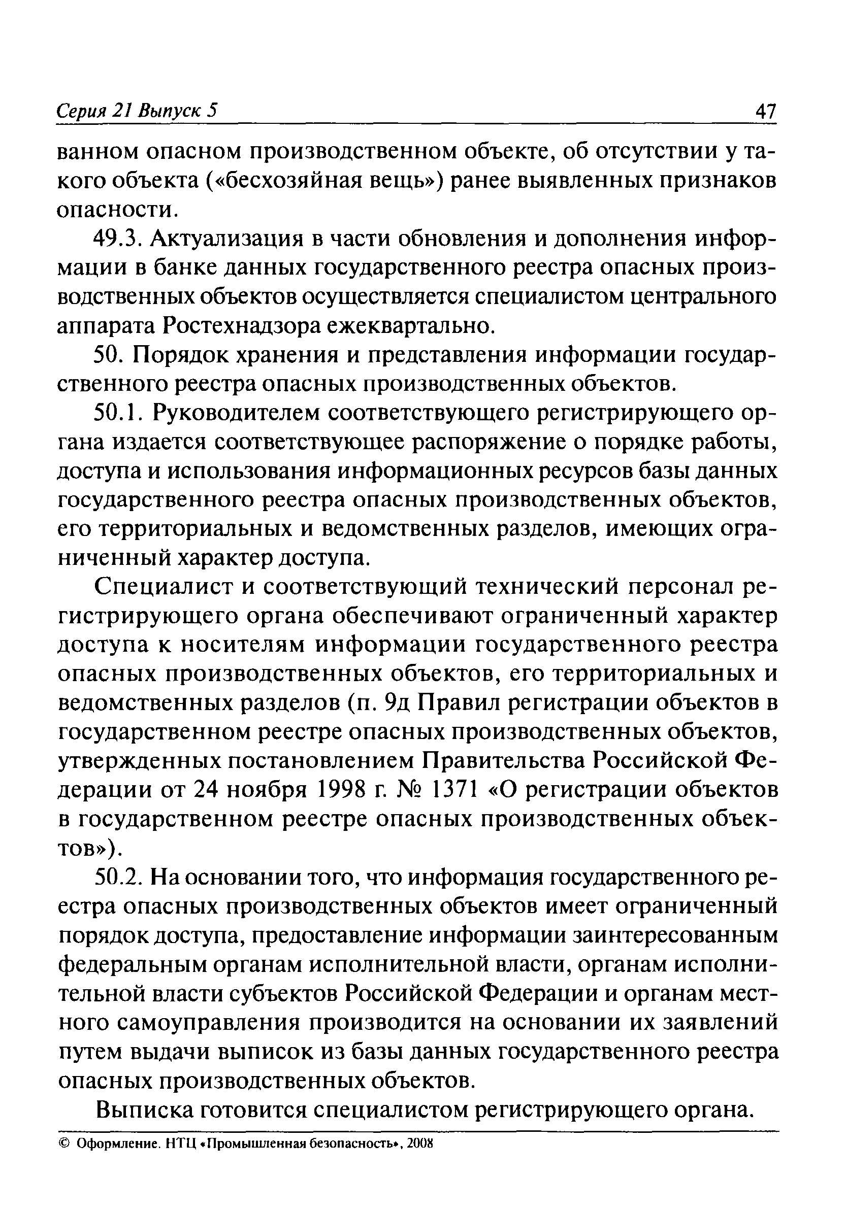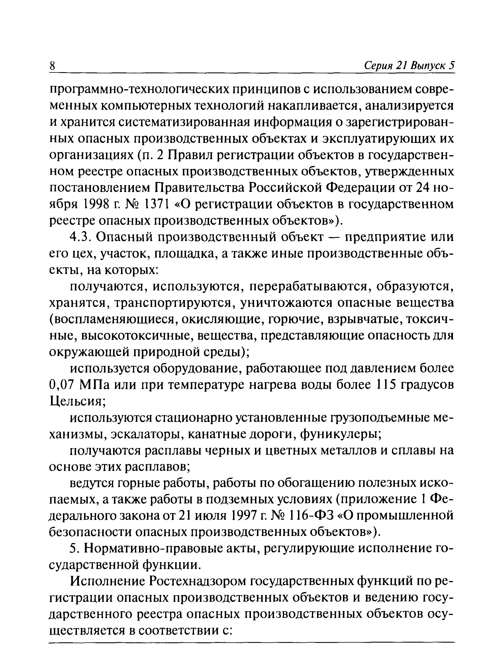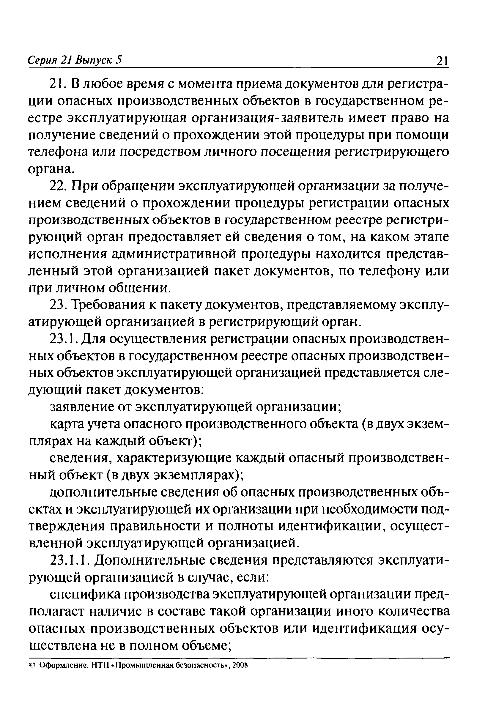 | Область применения: | Регламент определяет: порядок и сроки осуществления действий (административных процедур) при регистрации опасных производственных объектов и ведении государственного реестра опасных производственных объектов; порядок взаимодействия Ростехнадзора, его территориальных органов, осуществляющих государственную функцию по регистрации опасных производственных объектов и ведению территориальных разделов государственного реестра опасных производственных объектов, с иными федеральными органами исполнительной власти, которым предоставлено право регистрации подведомственных опасных производственных объектов и ведение ведомственных разделов государственного реестра опасных производственных объектов. |
