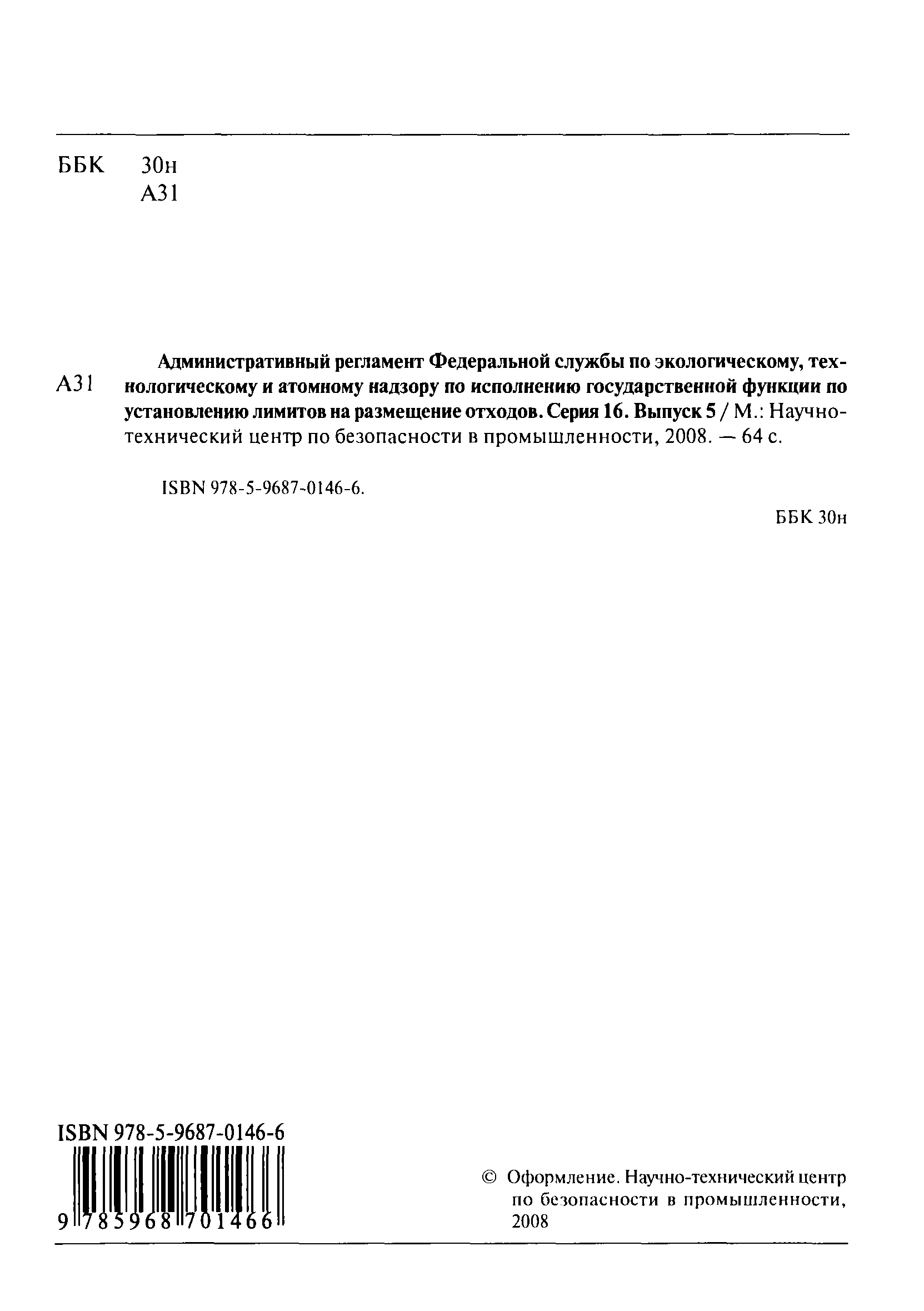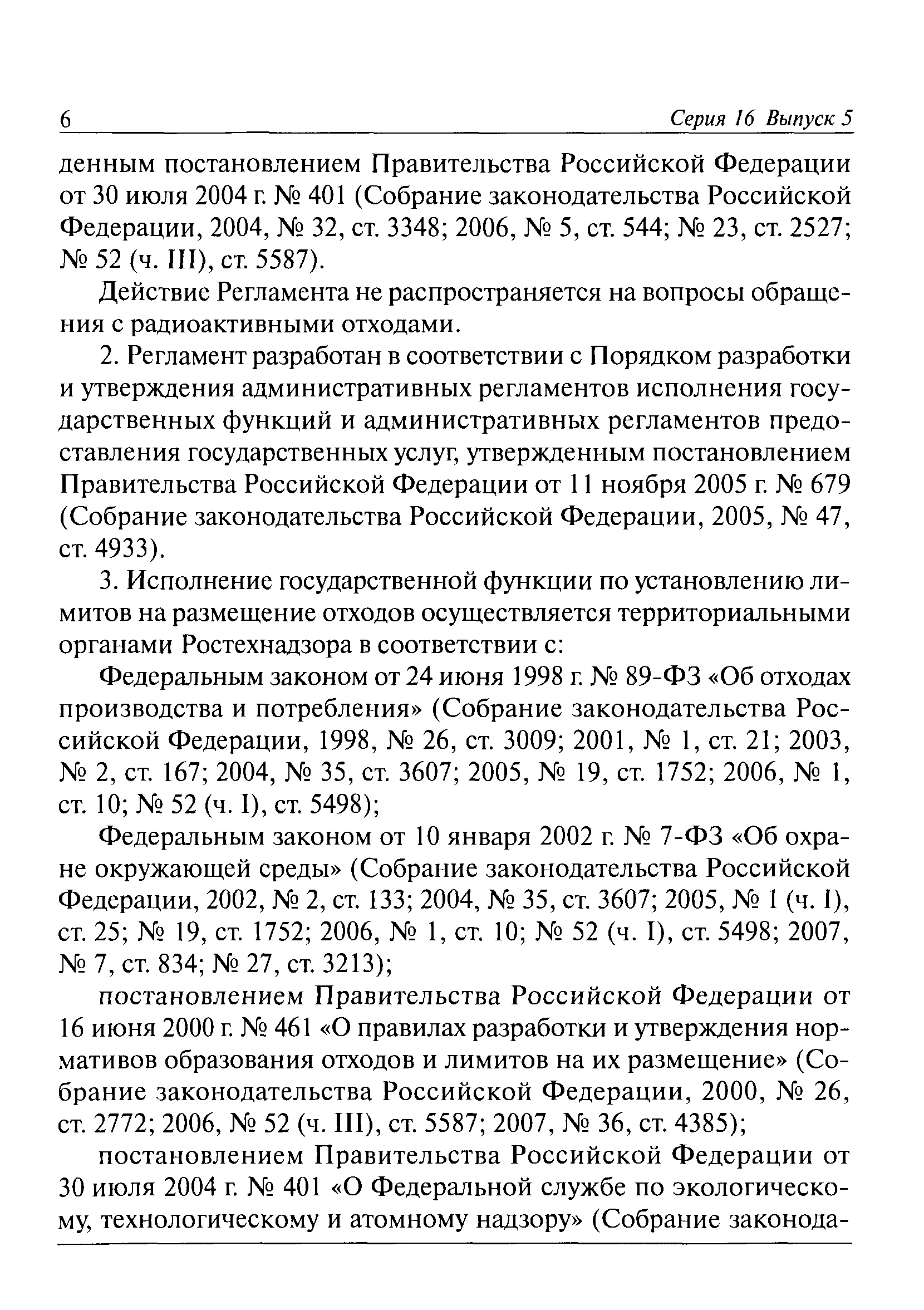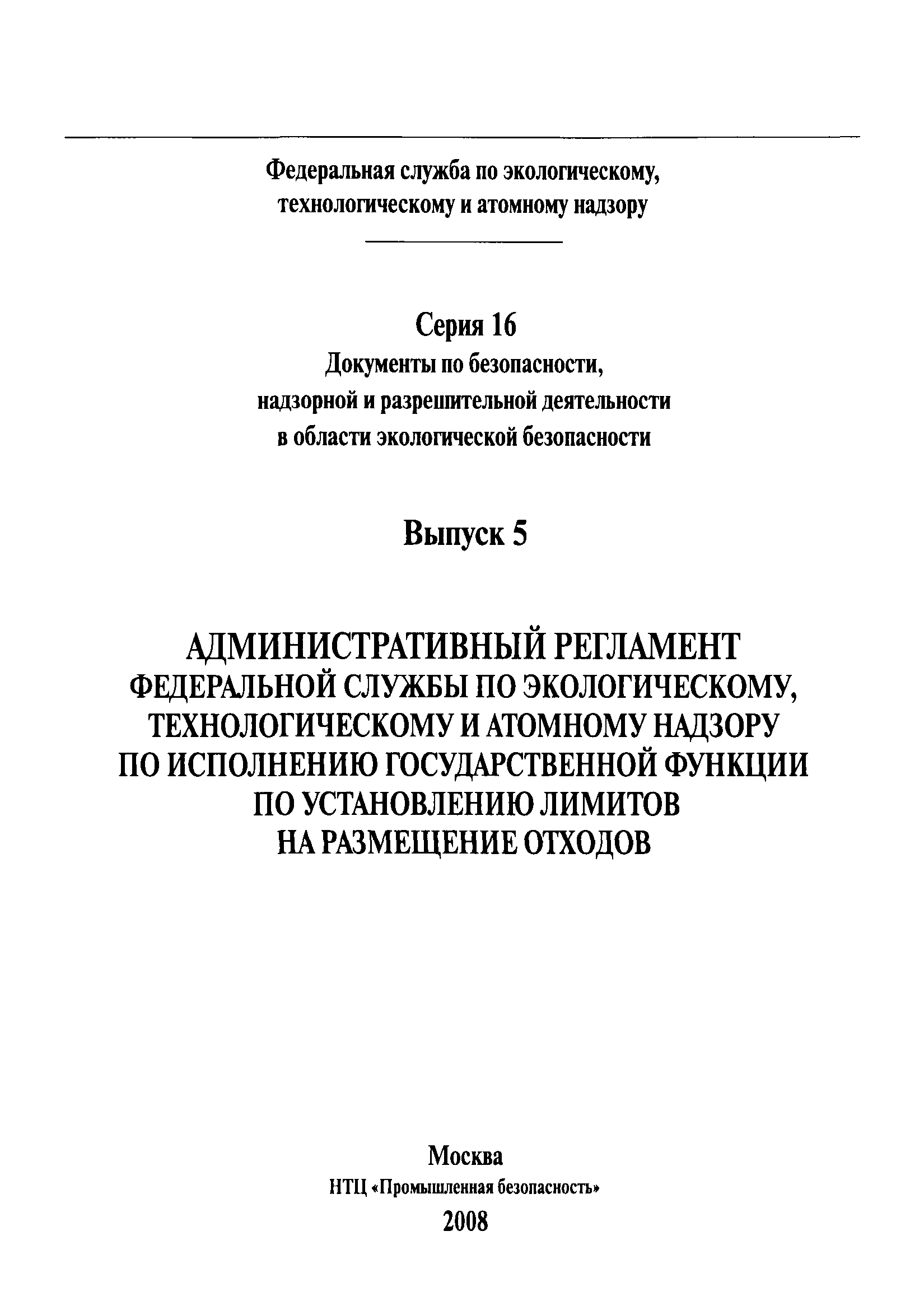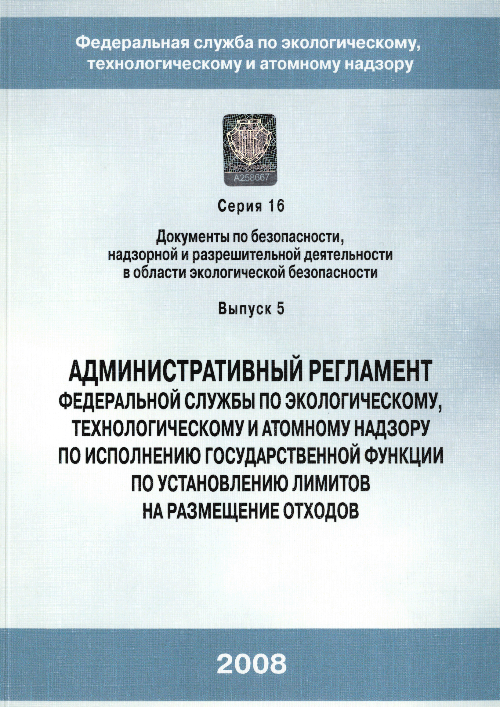 | Название рус.: | Административный регламент Федеральной службы по экологическому, технологическому и атомному надзору по исполнению государственной функции по установлению лимитов на размещение отходов |