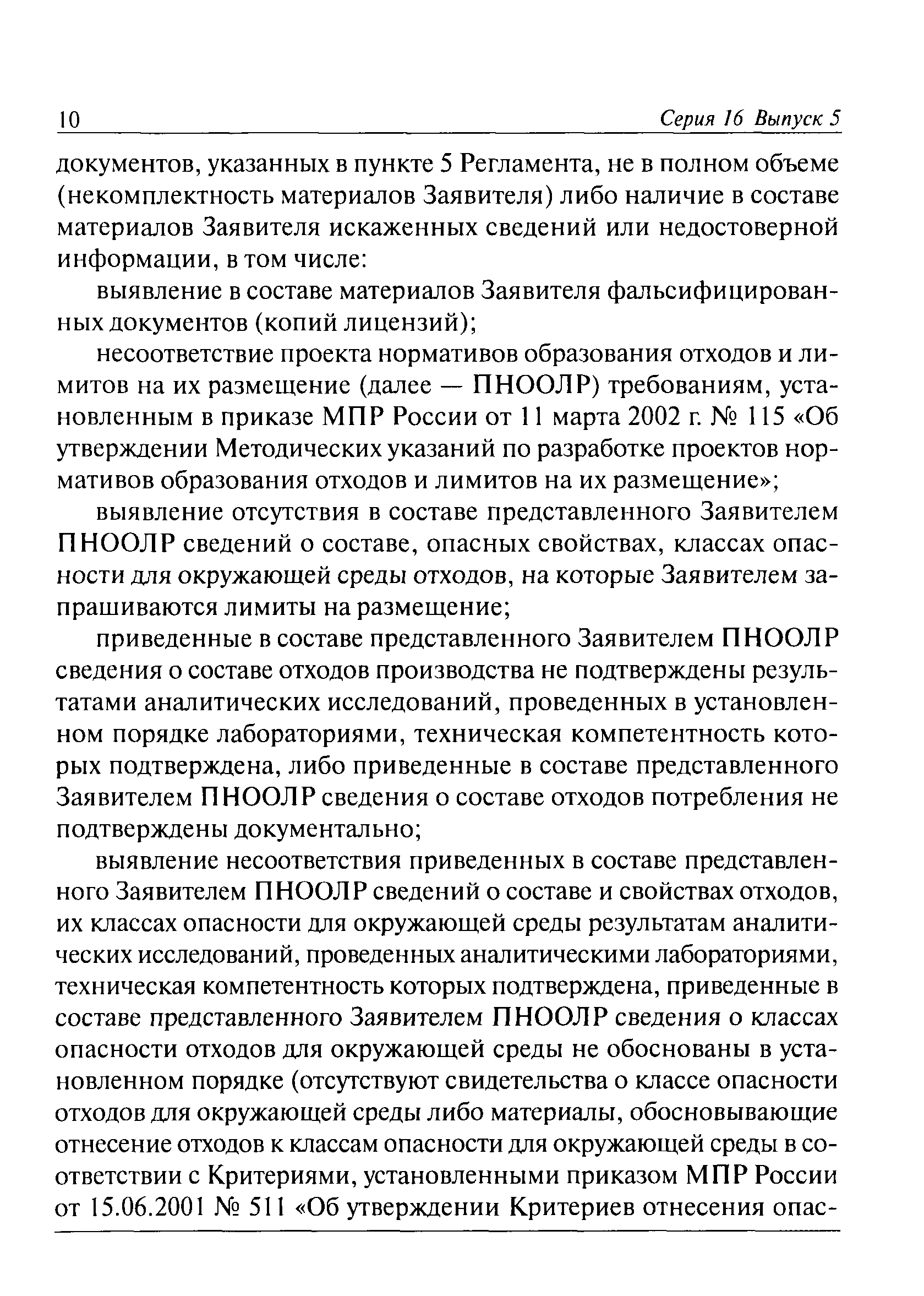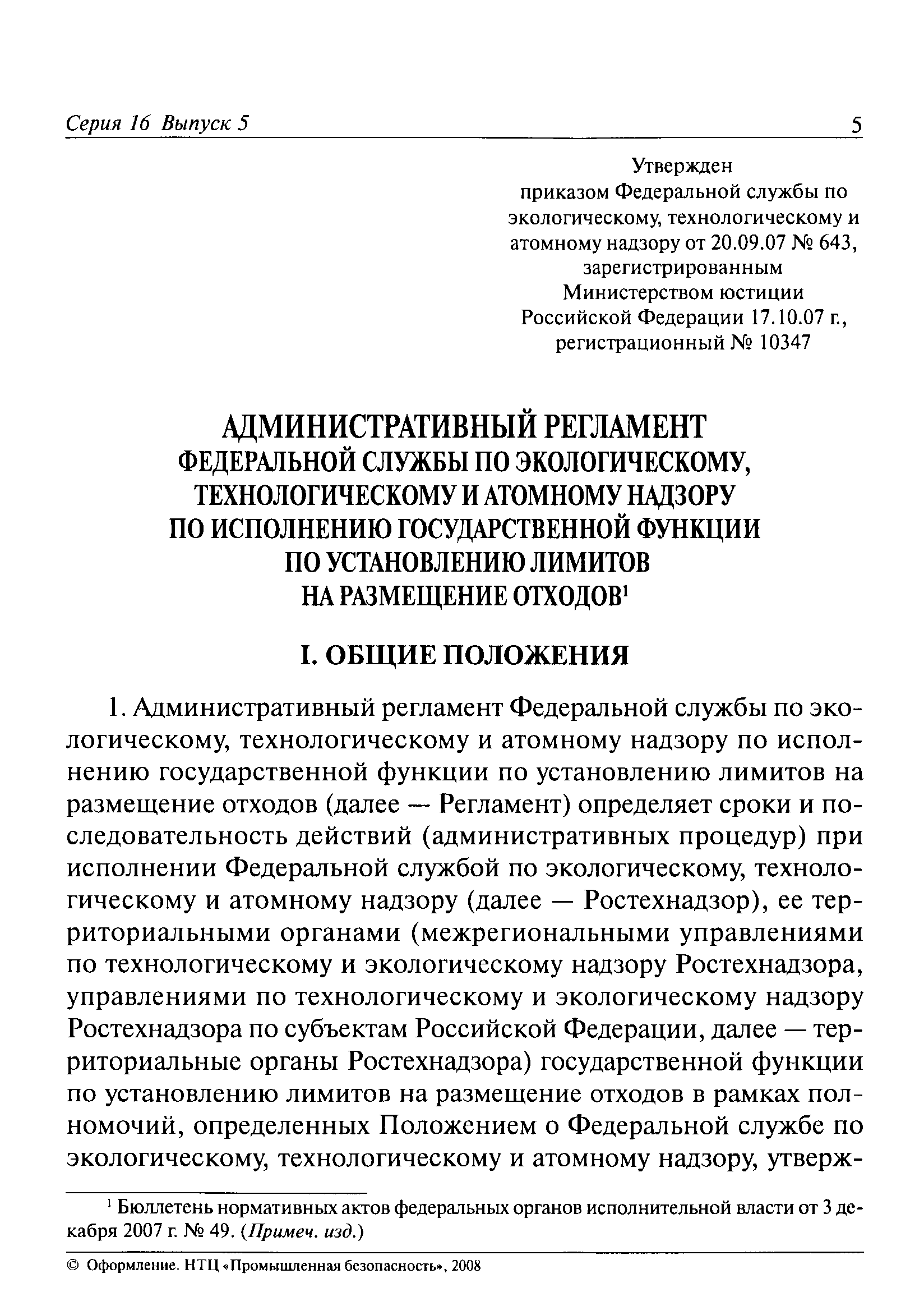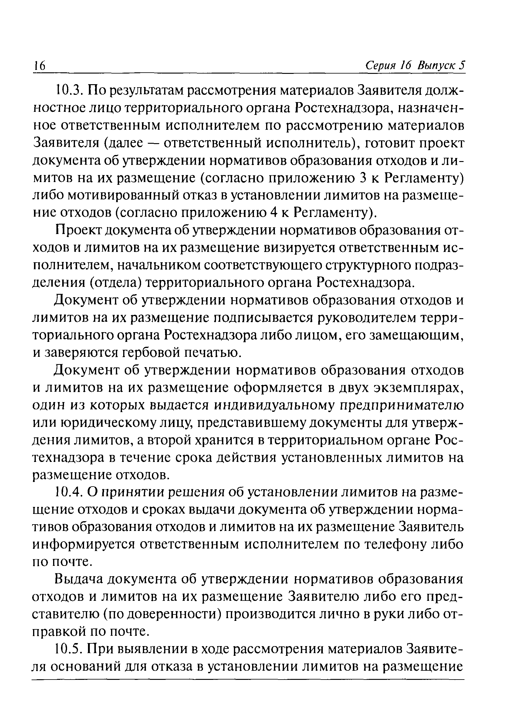 | Область применения: | Регламент определяет сроки и последовательность действий (административных процедур) при исполнении Федеральной службой по экологическому, технологическому и атомному надзору, ее территориальными органами (межрегиональными управлениями по технологическому и экологическому надзору Ростехнадзора, управлениями по технологическому и экологическому надзору Ростехнадзора по субъектам Российской Федерации) государственной функции по установлению лимитов на размещение отходов в рамках полномочий. Действие Регламента не распространяется на вопросы обращения с радиоактивными отходами. |