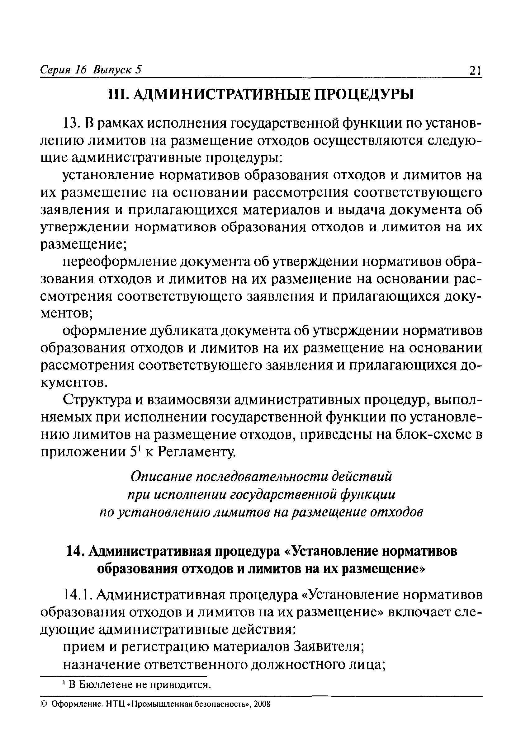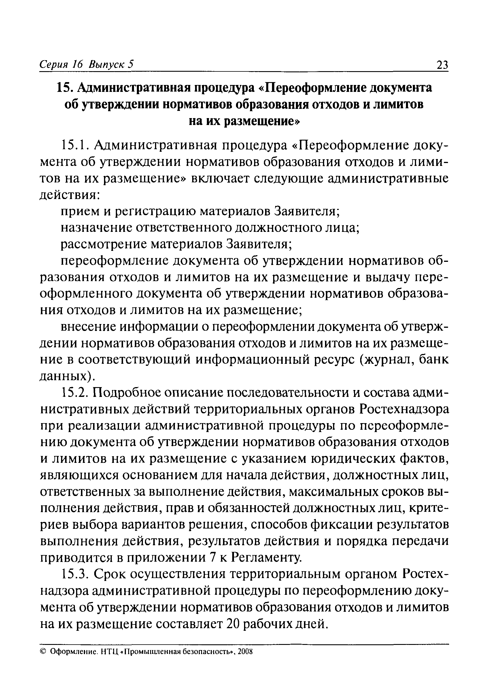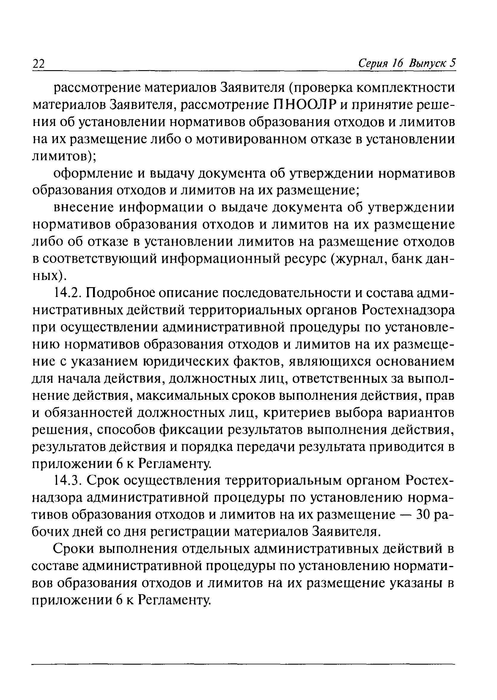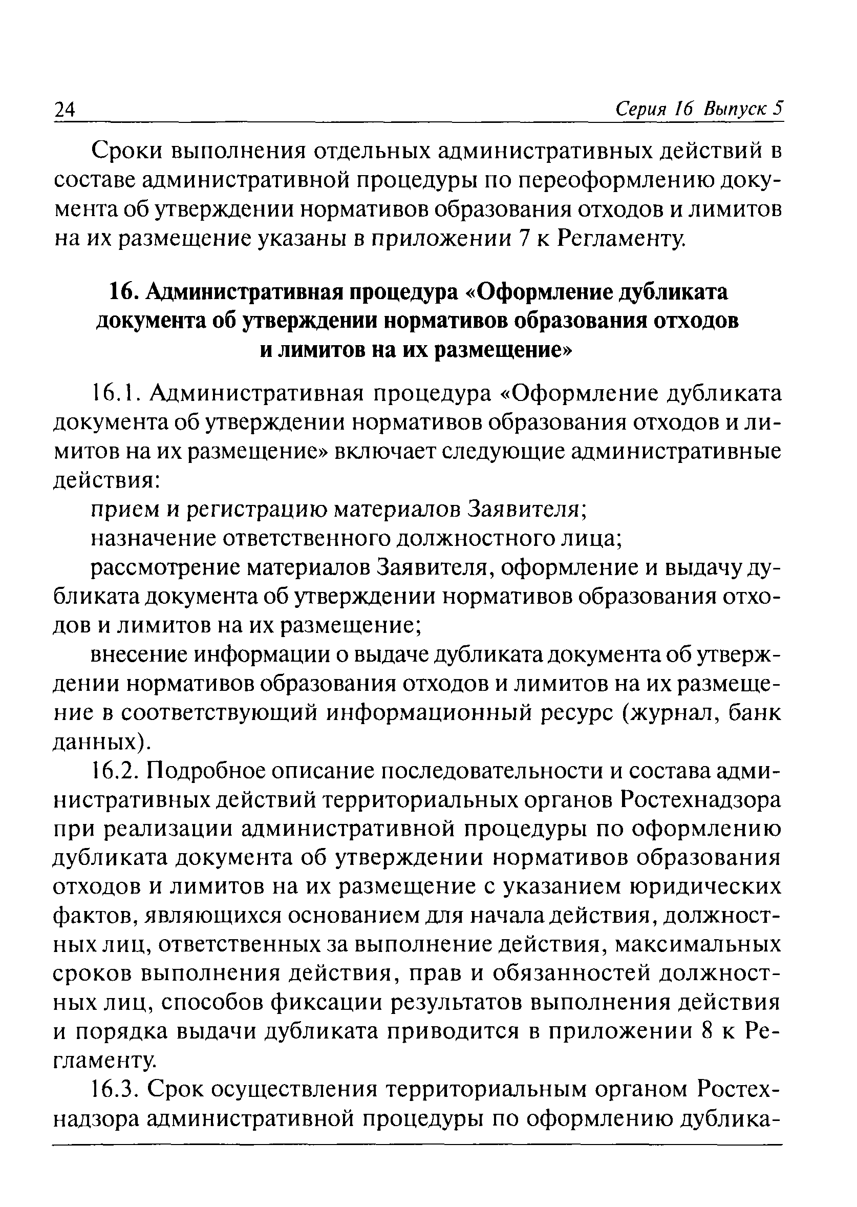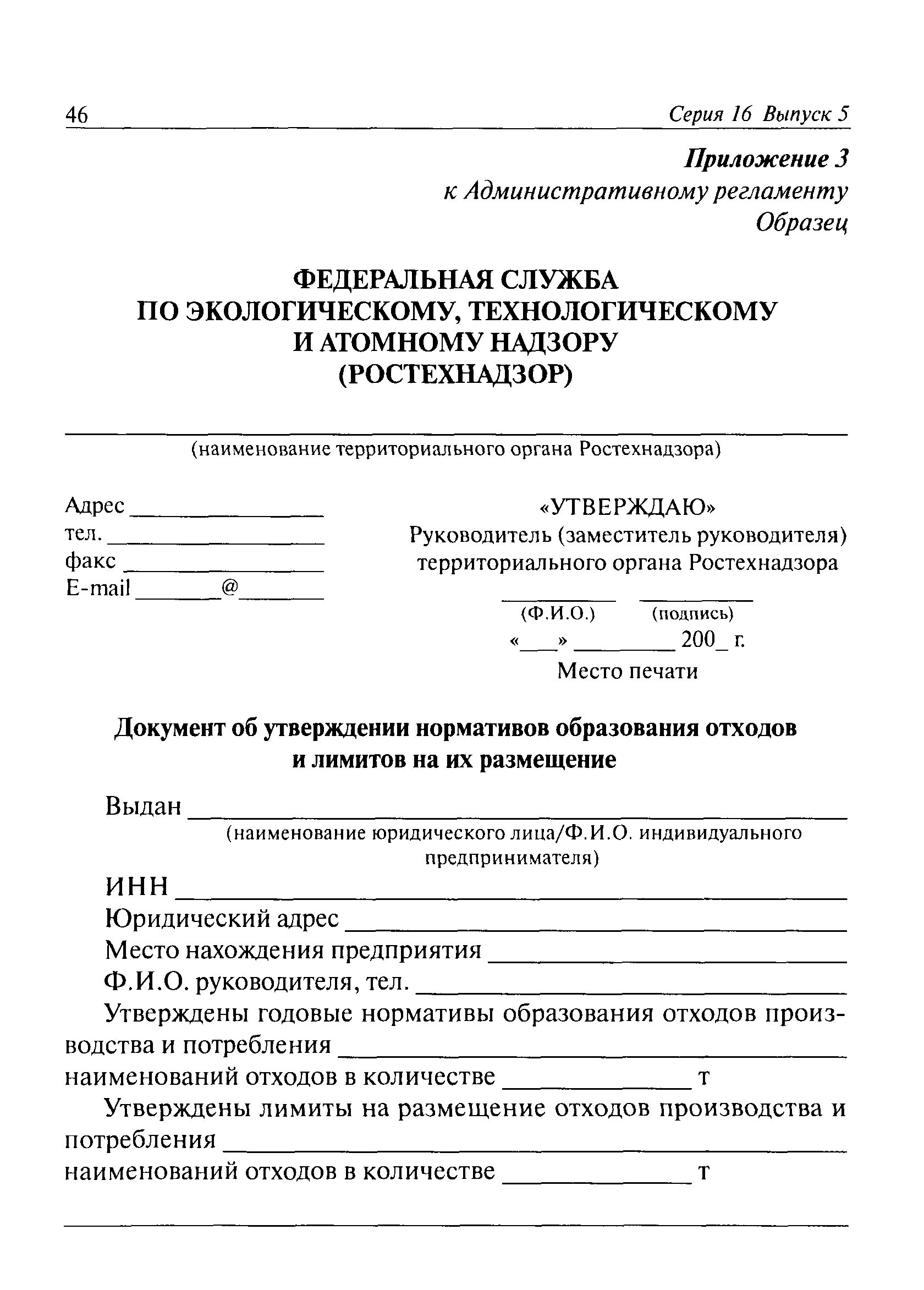 | Оглавление: | I. Общие положения II. Требования к порядку исполнения государственной функции по установлению лимитов на размещение отходов III. Административные процедуры IV. Обжалование действий (бездействий) должностных лиц в ходе выполнения административных процедур при исполнении государственной функции по установлению лимитов на размещение отходов Приложение 1. Список территориальных органов Ростехнадзора Приложение 2. Образцы Заявлений об установлении нормативов образования отходов и лимитов на их размещение, о переоформлении документа, о выдаче дубликата документа об утверждении нормативов образования отходов и лимитов на их размещение Приложение 3. Образец Документа об утверждении нормативов образования отходов и лимитов на их размещение Приложение к Документу об утверждении нормативов образования отходов и лимитов на их размещение "Нормативы образования отходов и лимиты на их размещение" Приложение 4. Образцы Письма об отказе в установлении лимитов на размещение отходов и Письма об отказе в переоформлении документа об утверждении нормативов образования отходов и лимитов на их размещение Приложение 5. Взаимосвязь административных процедур и блок-схемы последовательности действий при исполнении государственной функции по установлению лимитов на размещение отходов Приложение 6. Описание последовательности и состава административных действий территориального органа Ростехнадзора при осуществлении административной процедуры по установлению нормативов образования отходов и лимитов на их размещение Приложение 7. Описание последовательности и состава административных действий территориального органа Ростехнадзора при осуществлении административной процедуры по переоформлению документа об утверждении нормативов образования отходов и лимитов на их размещение Приложение 8. Описание последовательности и состава административных действий территориального органа Ростехнадзора при осуществлении административной процедуры по выдаче дубликата документа об утверждении нормативов образования отходов и лимитов на их размещение |