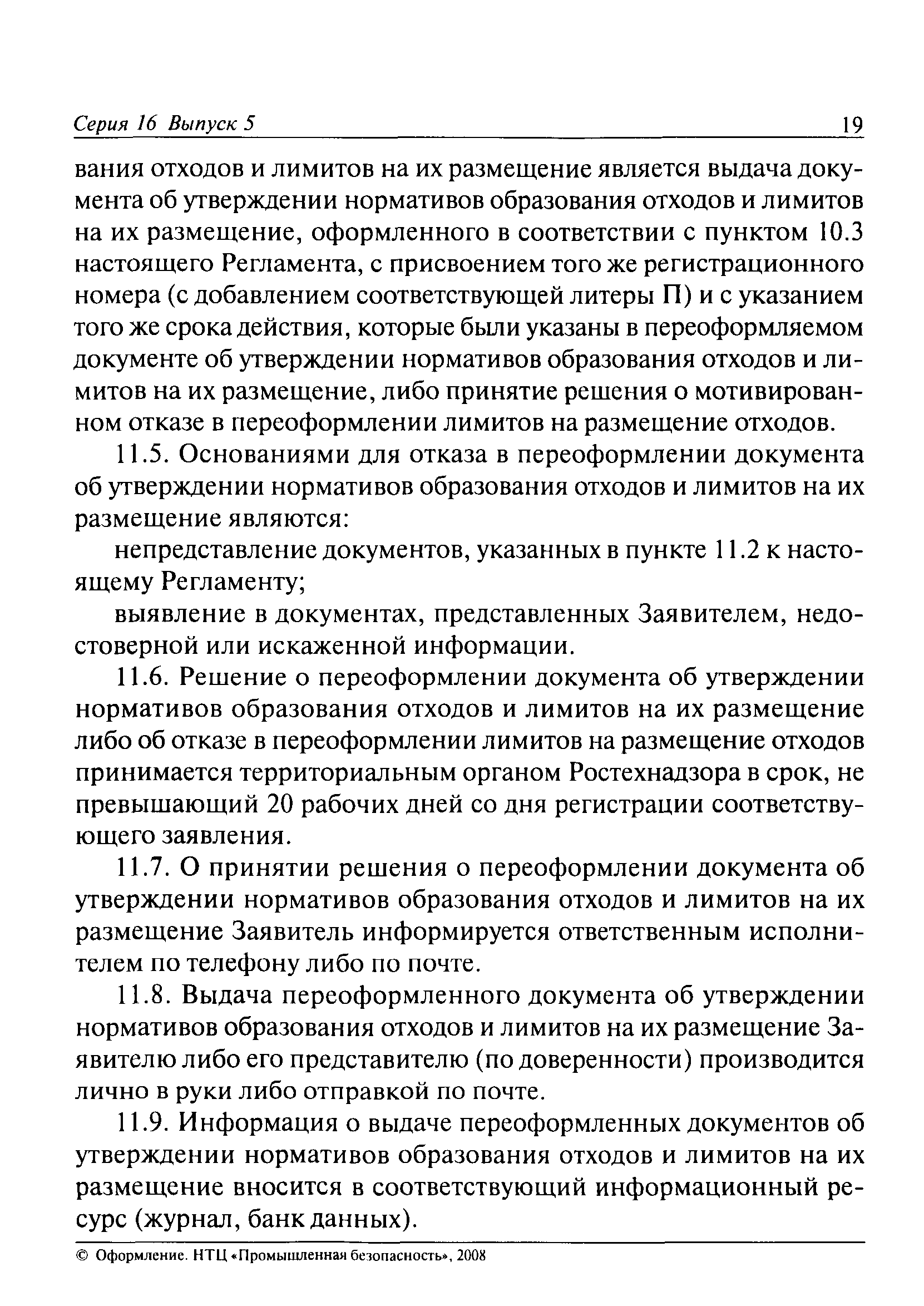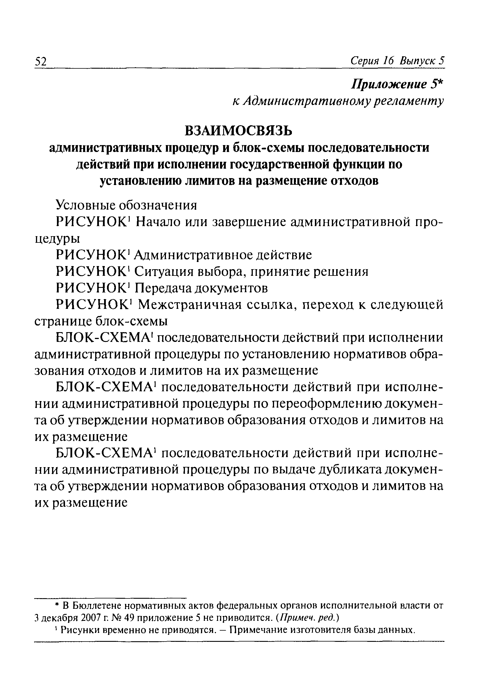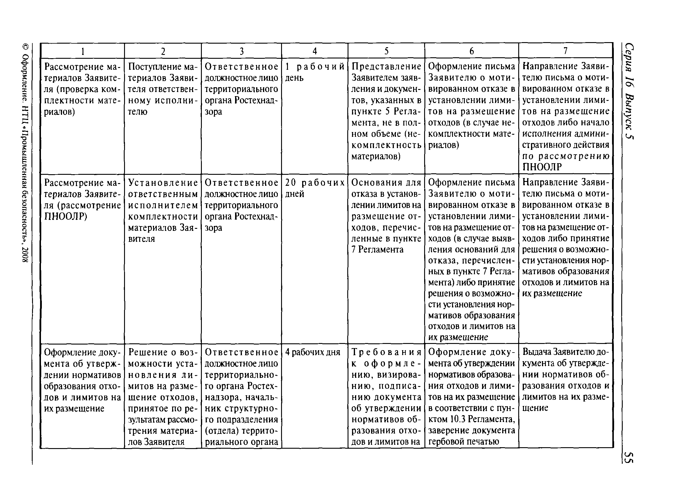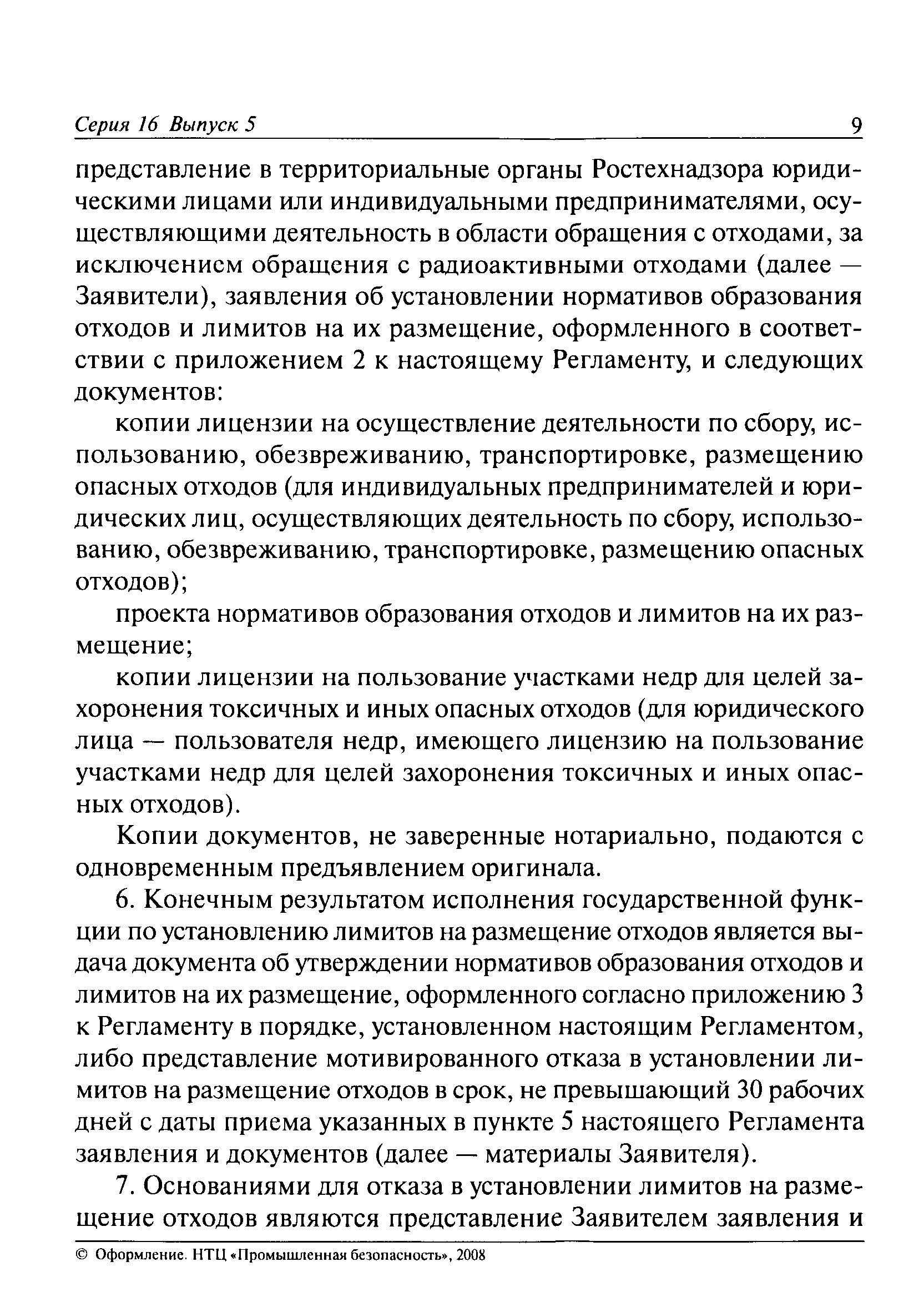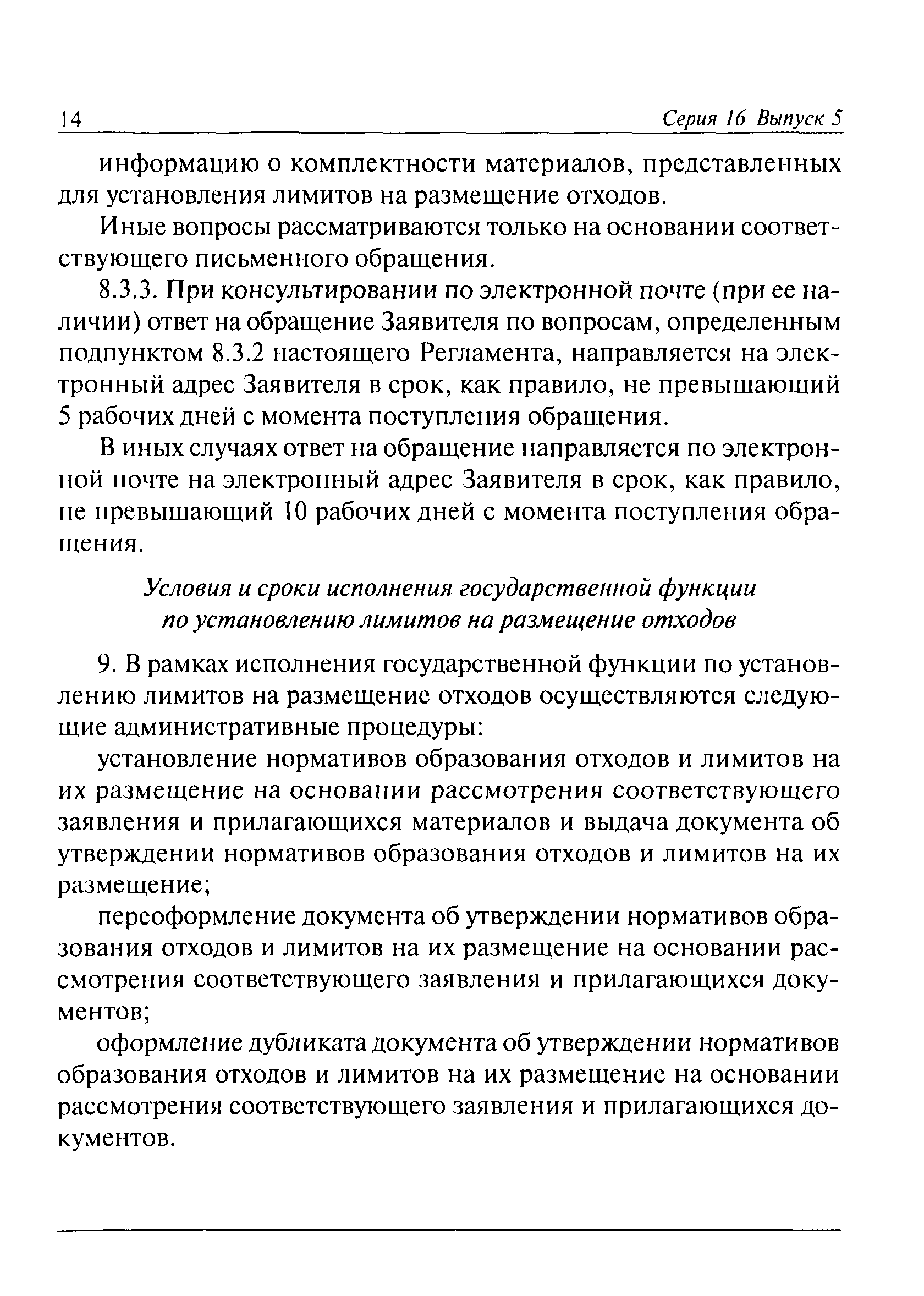 | Оглавление: | I. Общие положения II. Требования к порядку исполнения государственной функции по установлению лимитов на размещение отходов III. Административные процедуры IV. Обжалование действий (бездействий) должностных лиц в ходе выполнения административных процедур при исполнении государственной функции по установлению лимитов на размещение отходов Приложение 1. Список территориальных органов Ростехнадзора Приложение 2. Образцы Заявлений об установлении нормативов образования отходов и лимитов на их размещение, о переоформлении документа, о выдаче дубликата документа об утверждении нормативов образования отходов и лимитов на их размещение Приложение 3. Образец Документа об утверждении нормативов образования отходов и лимитов на их размещение Приложение к Документу об утверждении нормативов образования отходов и лимитов на их размещение "Нормативы образования отходов и лимиты на их размещение" Приложение 4. Образцы Письма об отказе в установлении лимитов на размещение отходов и Письма об отказе в переоформлении документа об утверждении нормативов образования отходов и лимитов на их размещение Приложение 5. Взаимосвязь административных процедур и блок-схемы последовательности действий при исполнении государственной функции по установлению лимитов на размещение отходов Приложение 6. Описание последовательности и состава административных действий территориального органа Ростехнадзора при осуществлении административной процедуры по установлению нормативов образования отходов и лимитов на их размещение Приложение 7. Описание последовательности и состава административных действий территориального органа Ростехнадзора при осуществлении административной процедуры по переоформлению документа об утверждении нормативов образования отходов и лимитов на их размещение Приложение 8. Описание последовательности и состава административных действий территориального органа Ростехнадзора при осуществлении административной процедуры по выдаче дубликата документа об утверждении нормативов образования отходов и лимитов на их размещение |