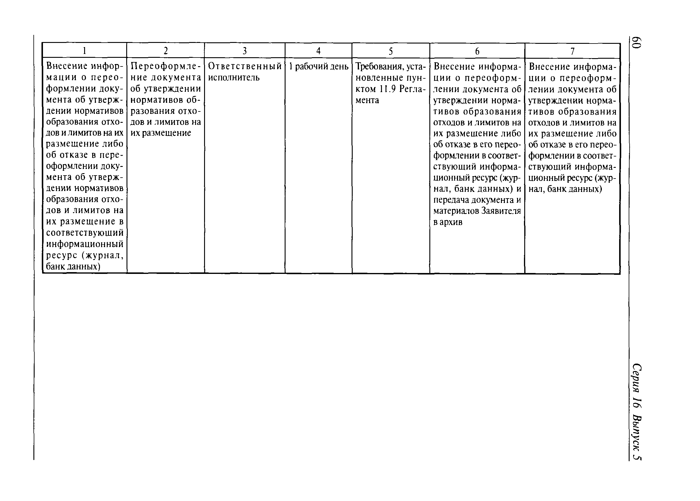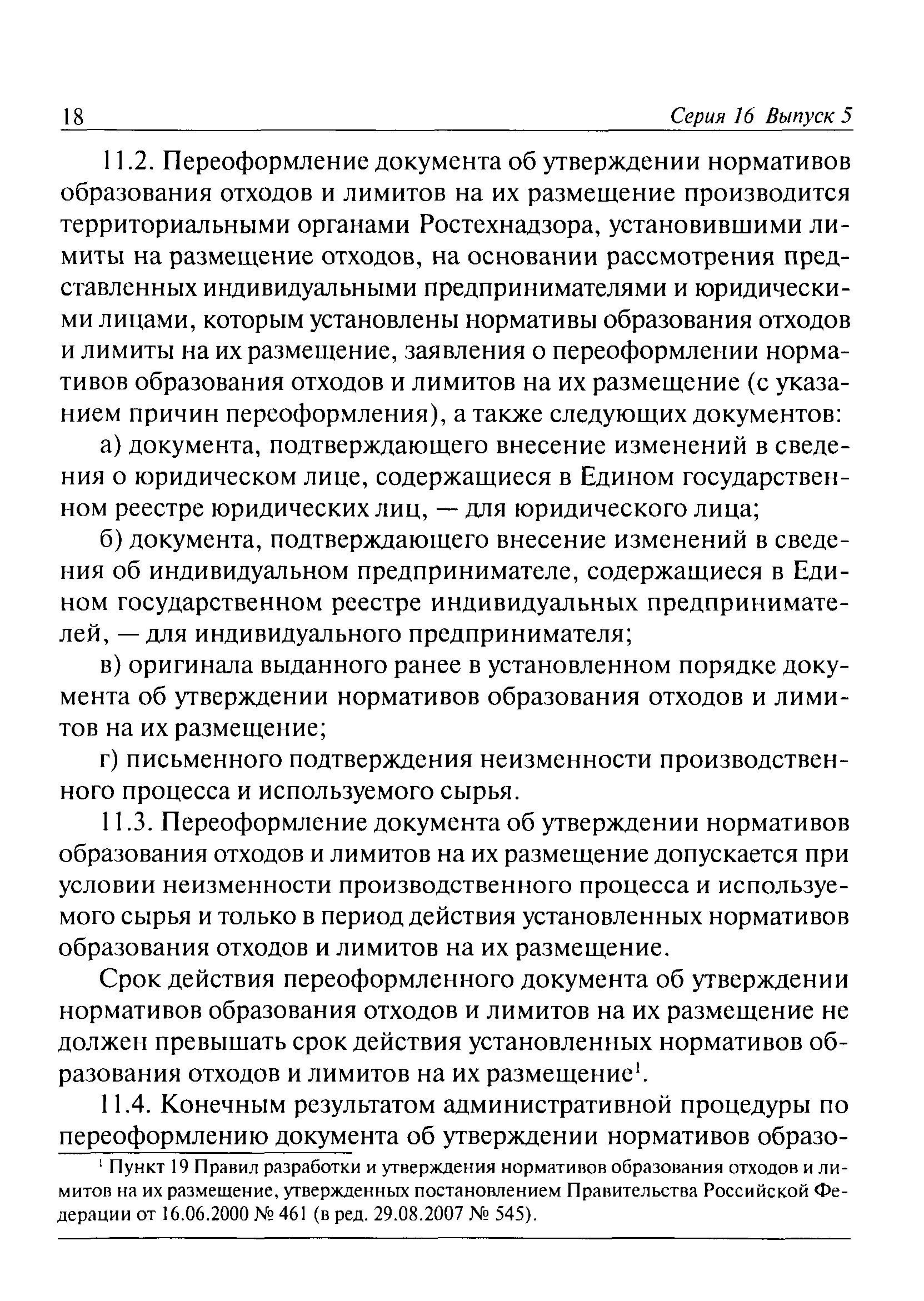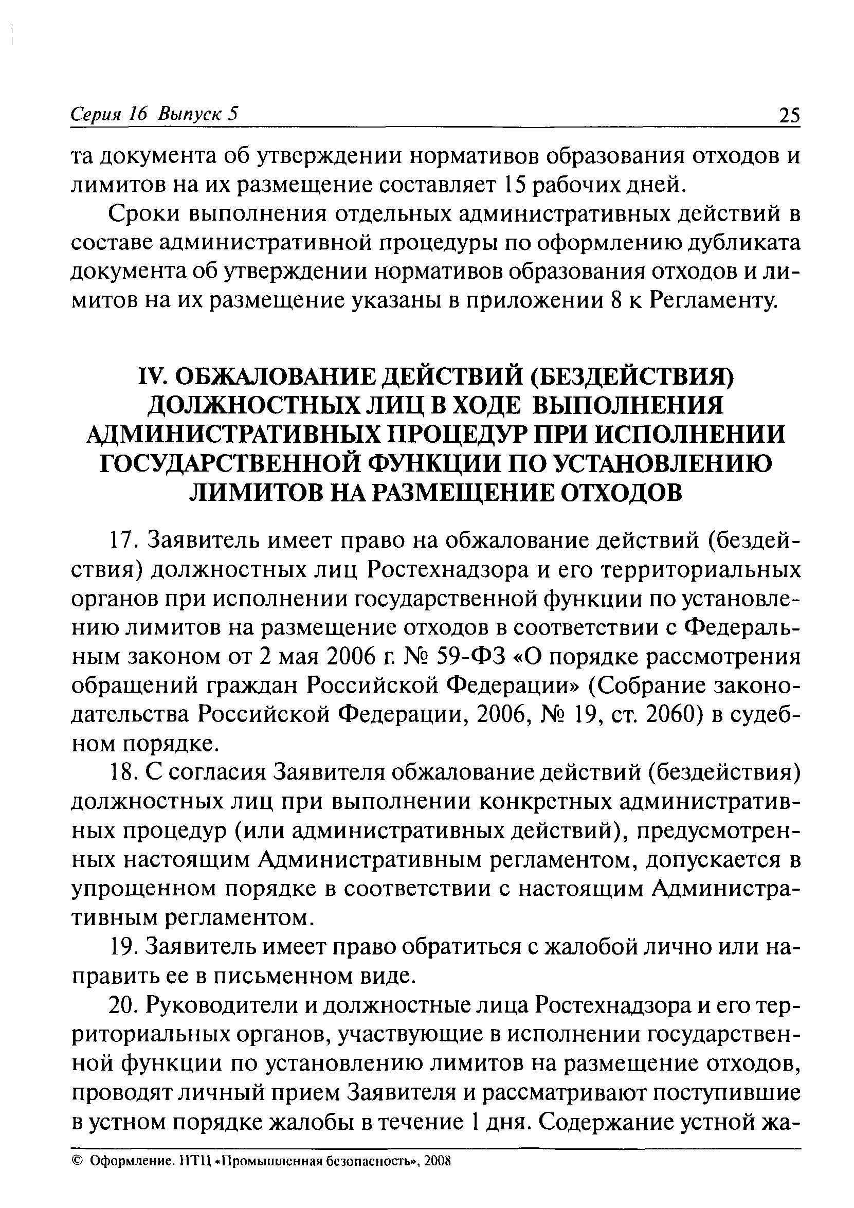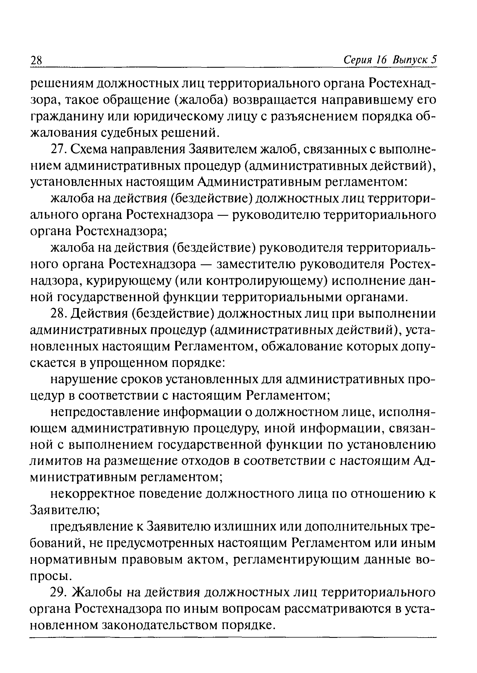 | Оглавление: | I. Общие положения II. Требования к порядку исполнения государственной функции по установлению лимитов на размещение отходов III. Административные процедуры IV. Обжалование действий (бездействий) должностных лиц в ходе выполнения административных процедур при исполнении государственной функции по установлению лимитов на размещение отходов Приложение 1. Список территориальных органов Ростехнадзора Приложение 2. Образцы Заявлений об установлении нормативов образования отходов и лимитов на их размещение, о переоформлении документа, о выдаче дубликата документа об утверждении нормативов образования отходов и лимитов на их размещение Приложение 3. Образец Документа об утверждении нормативов образования отходов и лимитов на их размещение Приложение к Документу об утверждении нормативов образования отходов и лимитов на их размещение "Нормативы образования отходов и лимиты на их размещение" Приложение 4. Образцы Письма об отказе в установлении лимитов на размещение отходов и Письма об отказе в переоформлении документа об утверждении нормативов образования отходов и лимитов на их размещение Приложение 5. Взаимосвязь административных процедур и блок-схемы последовательности действий при исполнении государственной функции по установлению лимитов на размещение отходов Приложение 6. Описание последовательности и состава административных действий территориального органа Ростехнадзора при осуществлении административной процедуры по установлению нормативов образования отходов и лимитов на их размещение Приложение 7. Описание последовательности и состава административных действий территориального органа Ростехнадзора при осуществлении административной процедуры по переоформлению документа об утверждении нормативов образования отходов и лимитов на их размещение Приложение 8. Описание последовательности и состава административных действий территориального органа Ростехнадзора при осуществлении административной процедуры по выдаче дубликата документа об утверждении нормативов образования отходов и лимитов на их размещение |