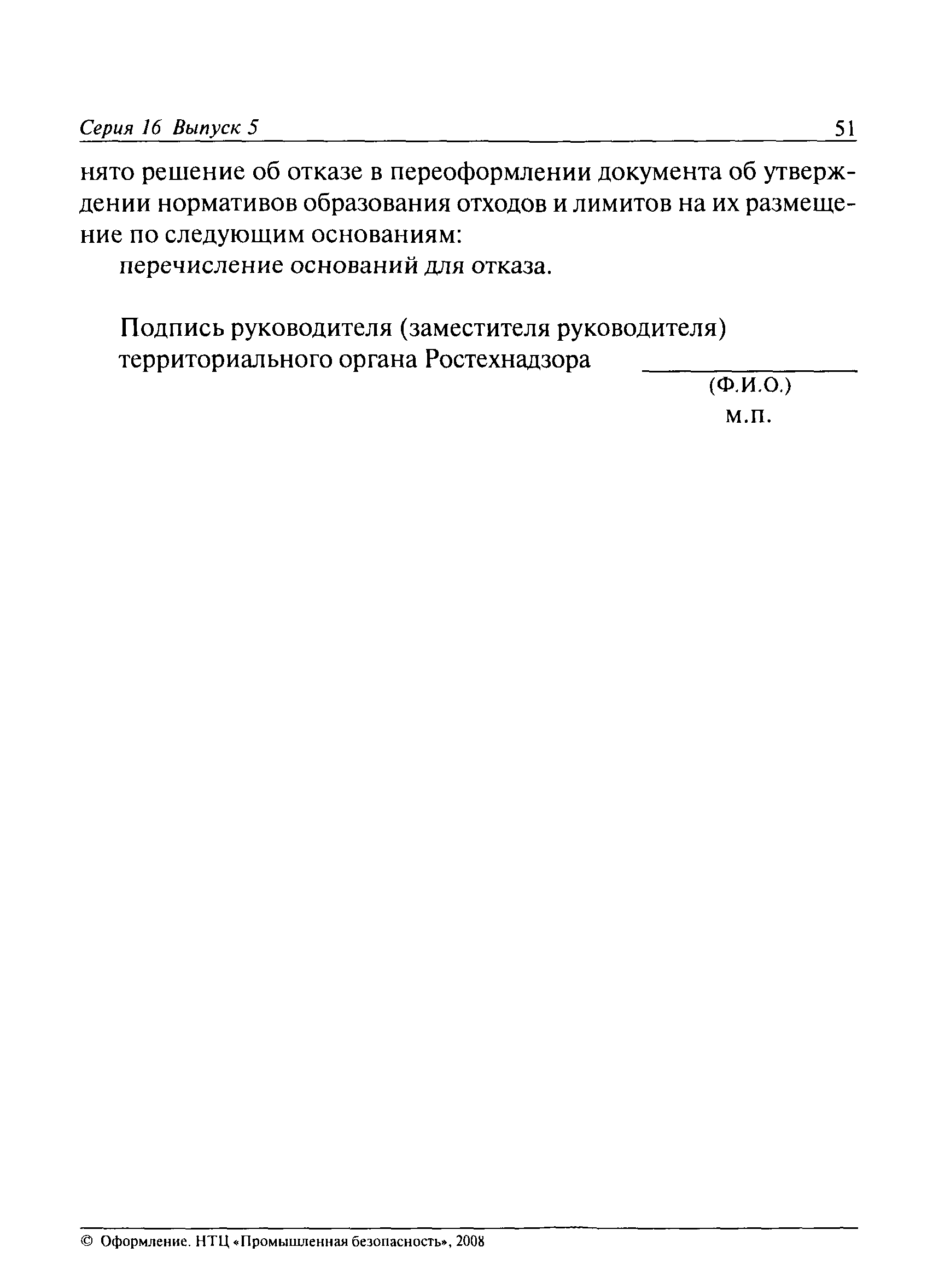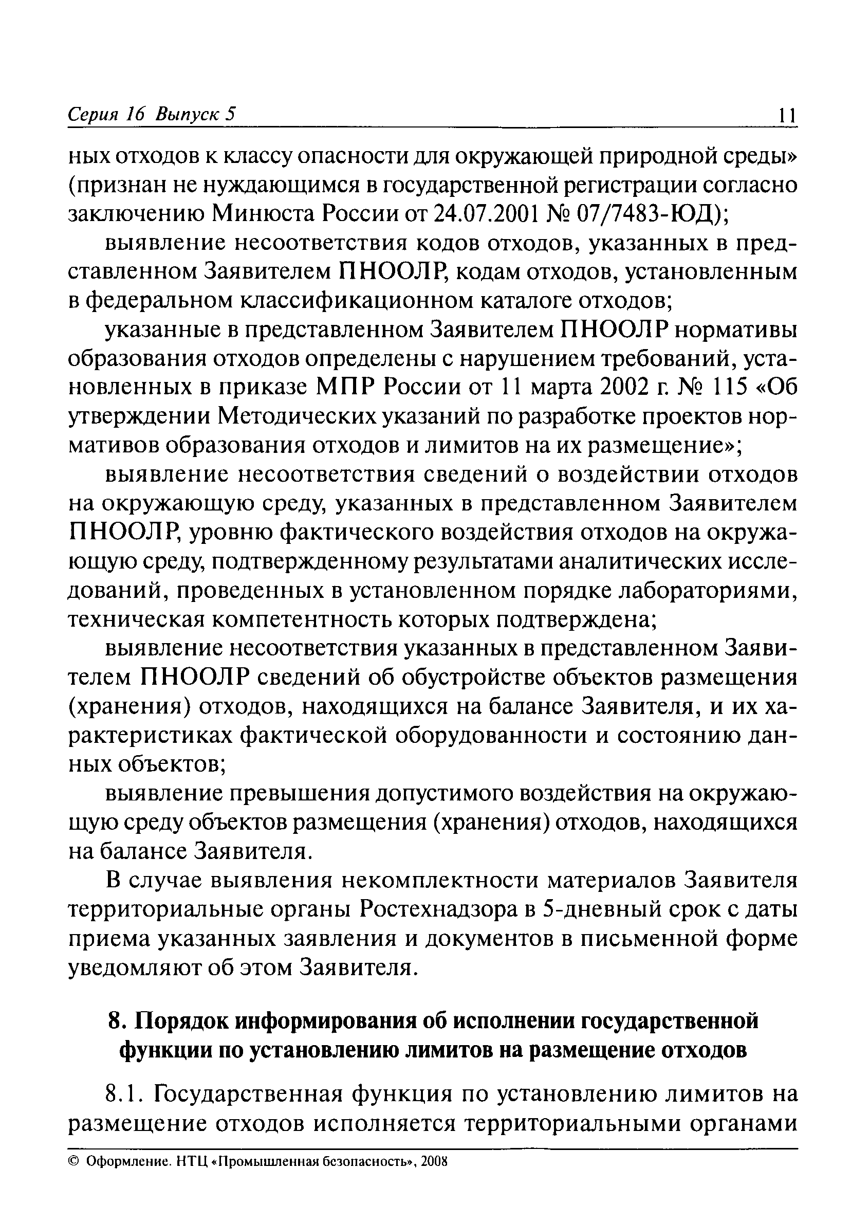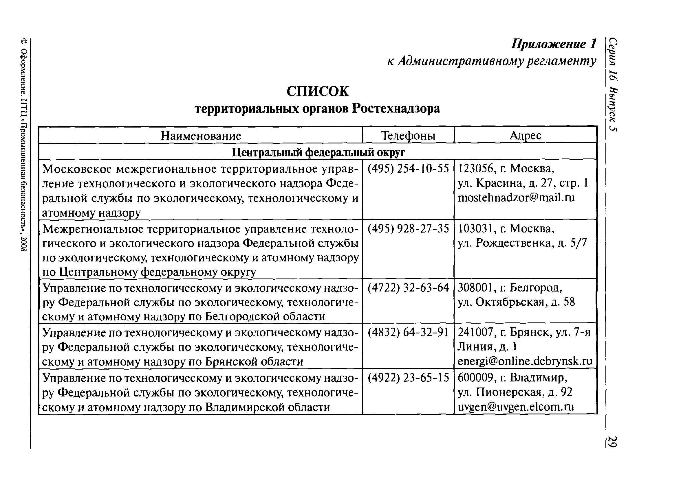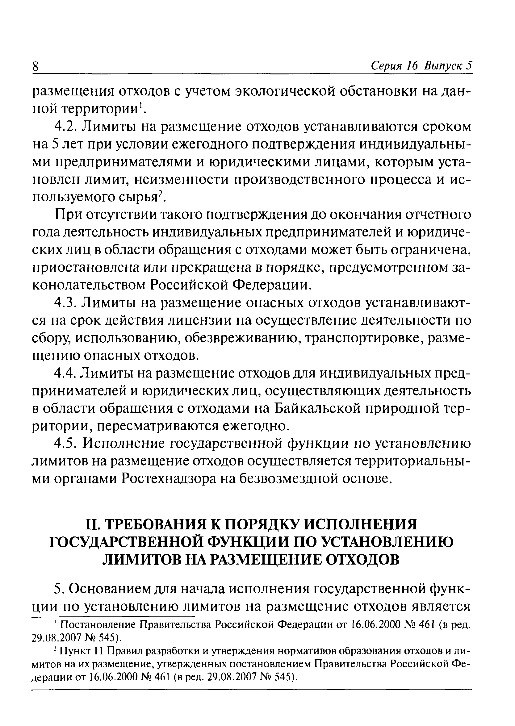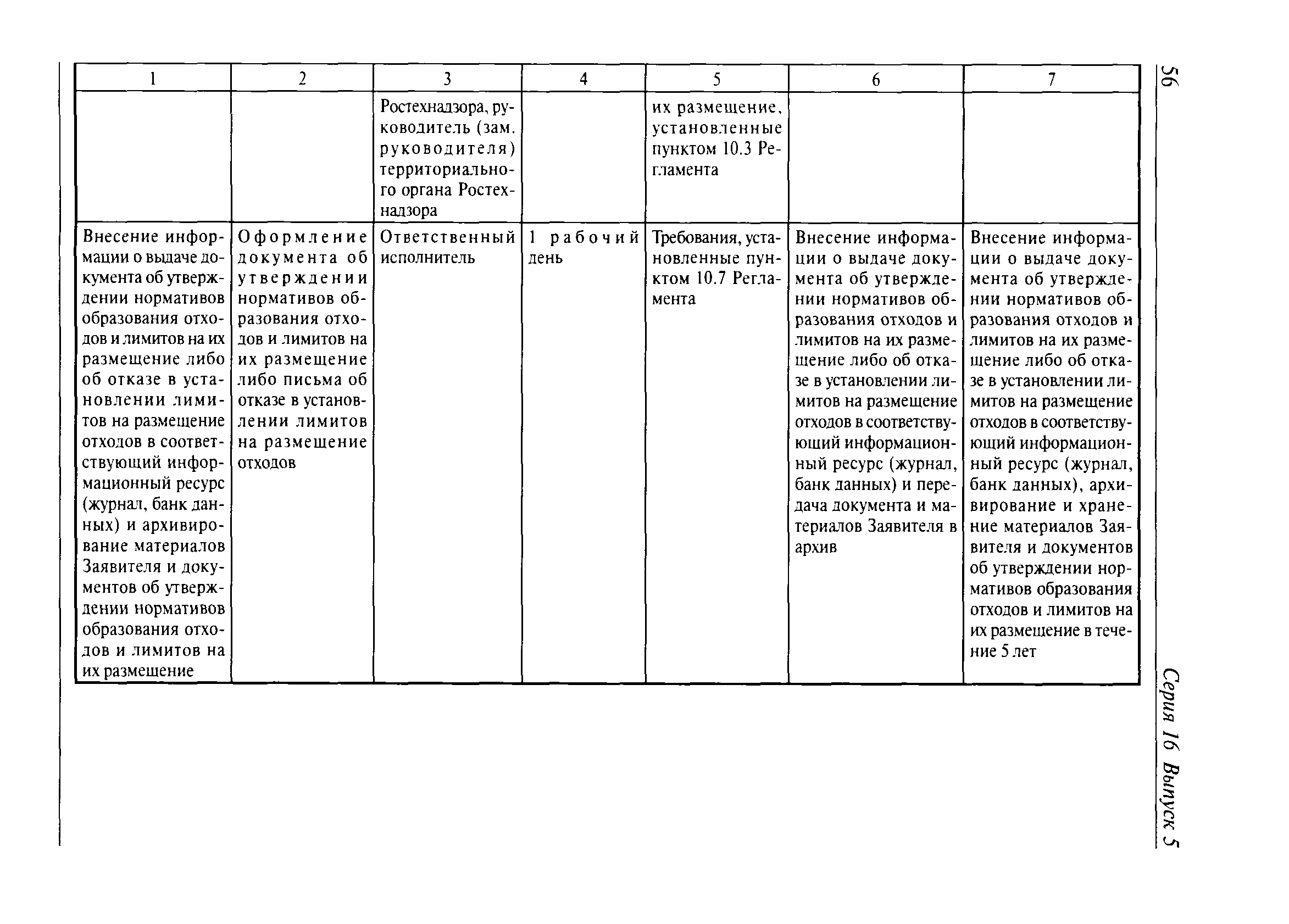 | Оглавление: | I. Общие положения II. Требования к порядку исполнения государственной функции по установлению лимитов на размещение отходов III. Административные процедуры IV. Обжалование действий (бездействий) должностных лиц в ходе выполнения административных процедур при исполнении государственной функции по установлению лимитов на размещение отходов Приложение 1. Список территориальных органов Ростехнадзора Приложение 2. Образцы Заявлений об установлении нормативов образования отходов и лимитов на их размещение, о переоформлении документа, о выдаче дубликата документа об утверждении нормативов образования отходов и лимитов на их размещение Приложение 3. Образец Документа об утверждении нормативов образования отходов и лимитов на их размещение Приложение к Документу об утверждении нормативов образования отходов и лимитов на их размещение "Нормативы образования отходов и лимиты на их размещение" Приложение 4. Образцы Письма об отказе в установлении лимитов на размещение отходов и Письма об отказе в переоформлении документа об утверждении нормативов образования отходов и лимитов на их размещение Приложение 5. Взаимосвязь административных процедур и блок-схемы последовательности действий при исполнении государственной функции по установлению лимитов на размещение отходов Приложение 6. Описание последовательности и состава административных действий территориального органа Ростехнадзора при осуществлении административной процедуры по установлению нормативов образования отходов и лимитов на их размещение Приложение 7. Описание последовательности и состава административных действий территориального органа Ростехнадзора при осуществлении административной процедуры по переоформлению документа об утверждении нормативов образования отходов и лимитов на их размещение Приложение 8. Описание последовательности и состава административных действий территориального органа Ростехнадзора при осуществлении административной процедуры по выдаче дубликата документа об утверждении нормативов образования отходов и лимитов на их размещение |