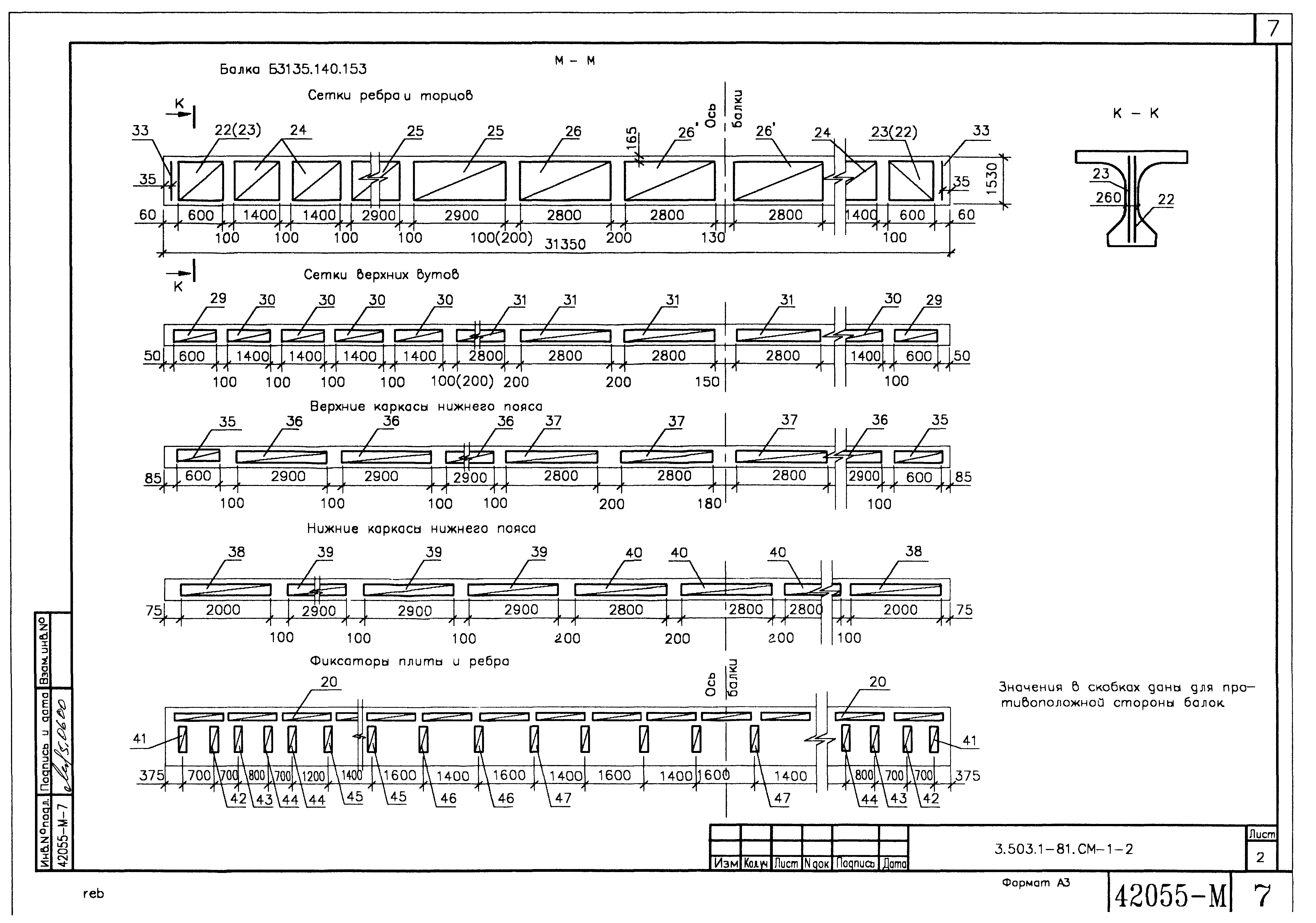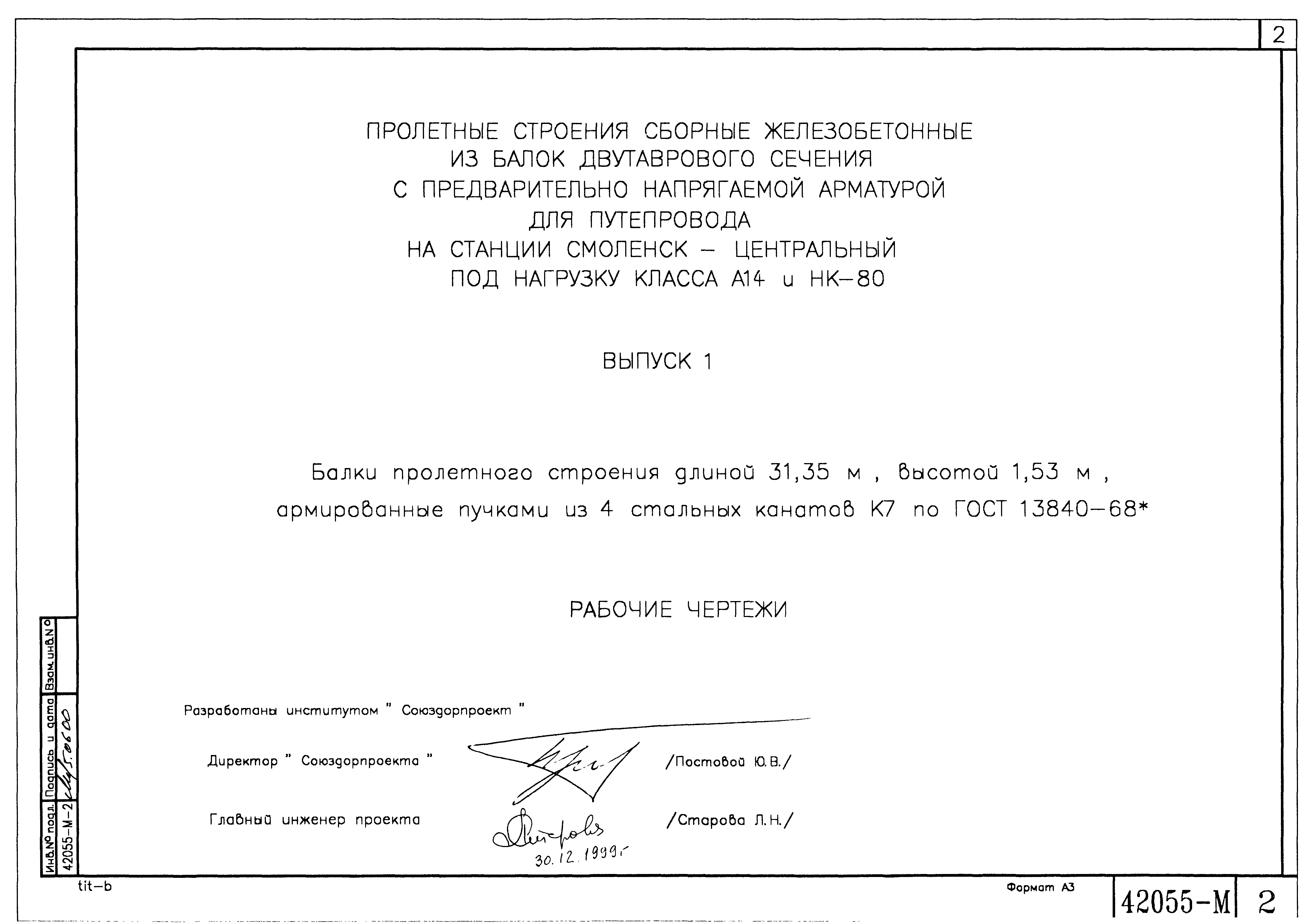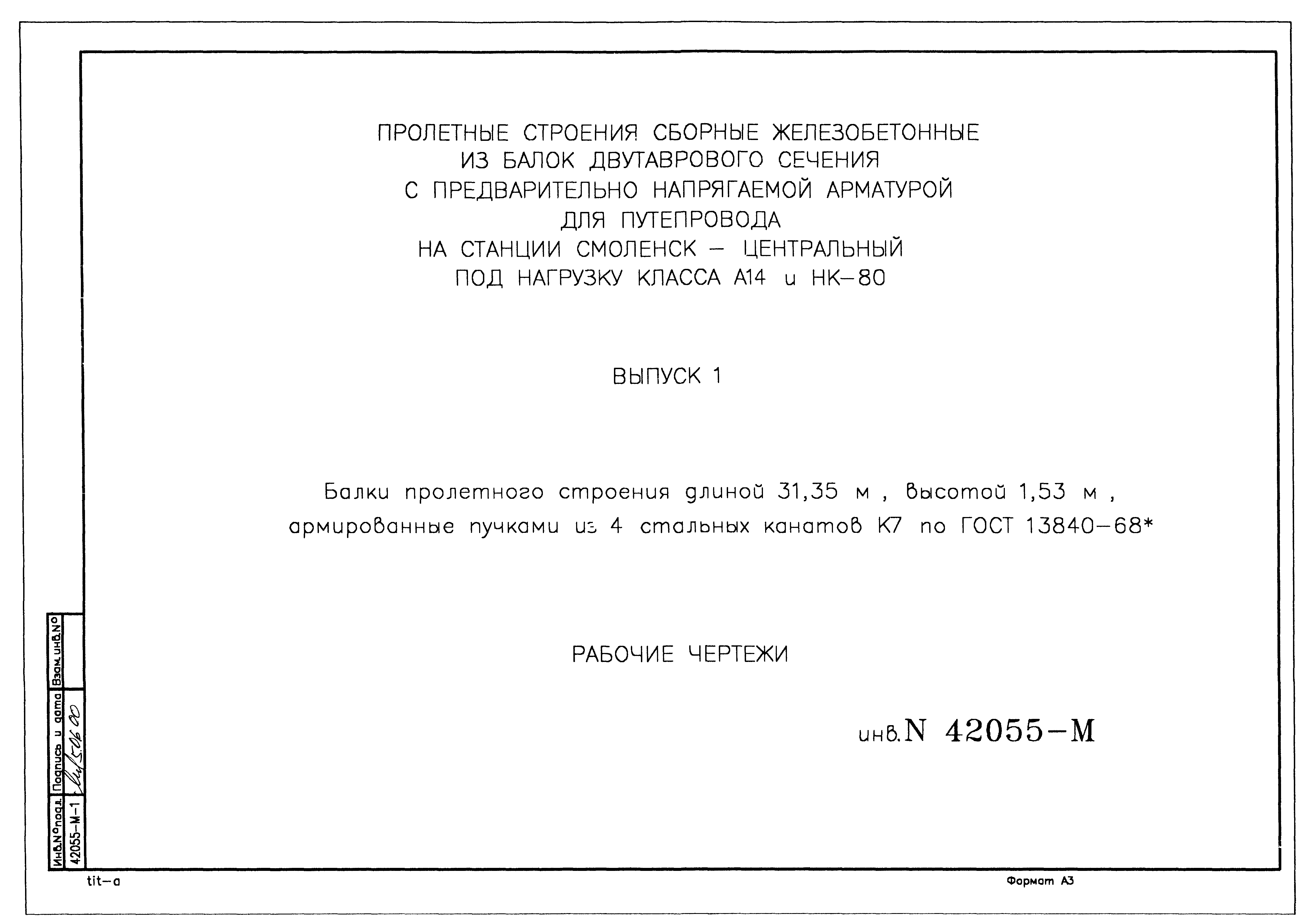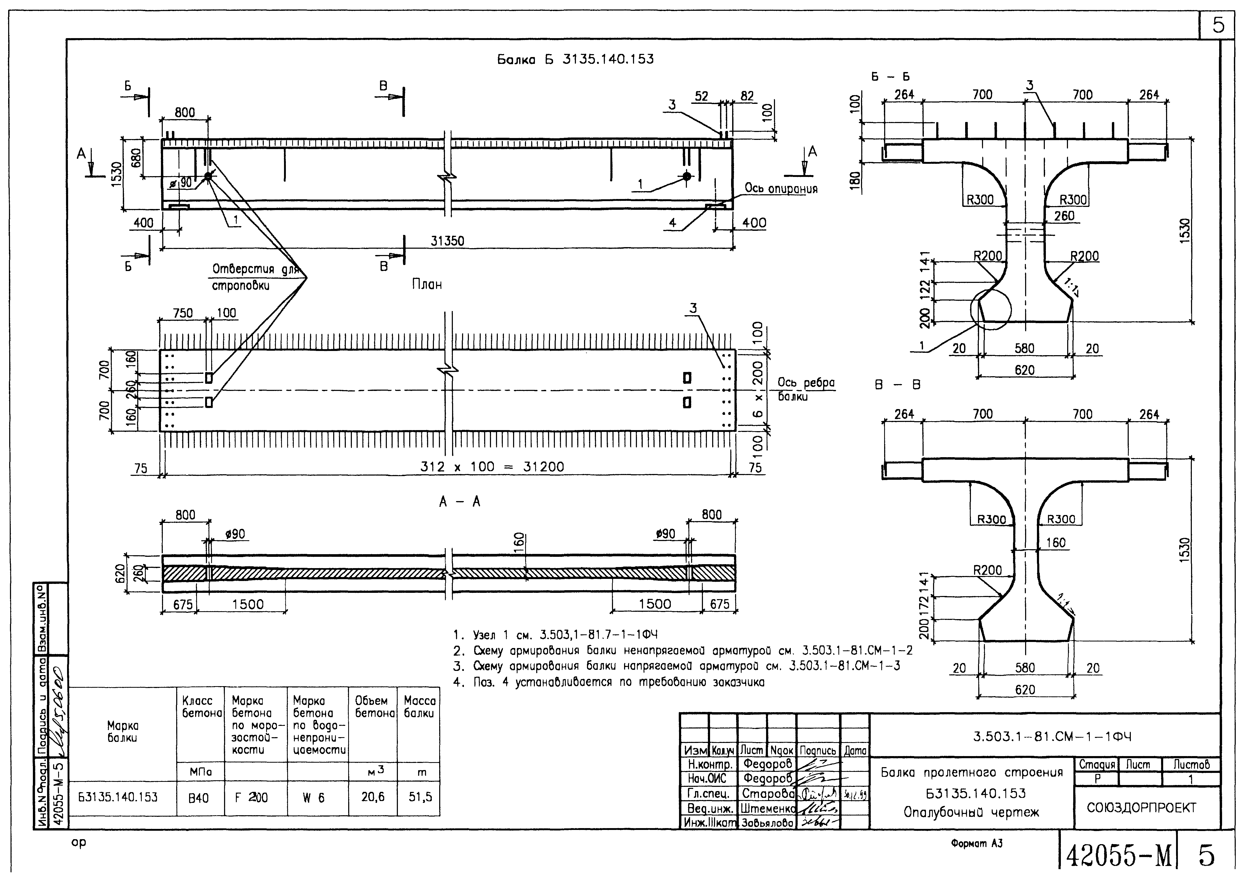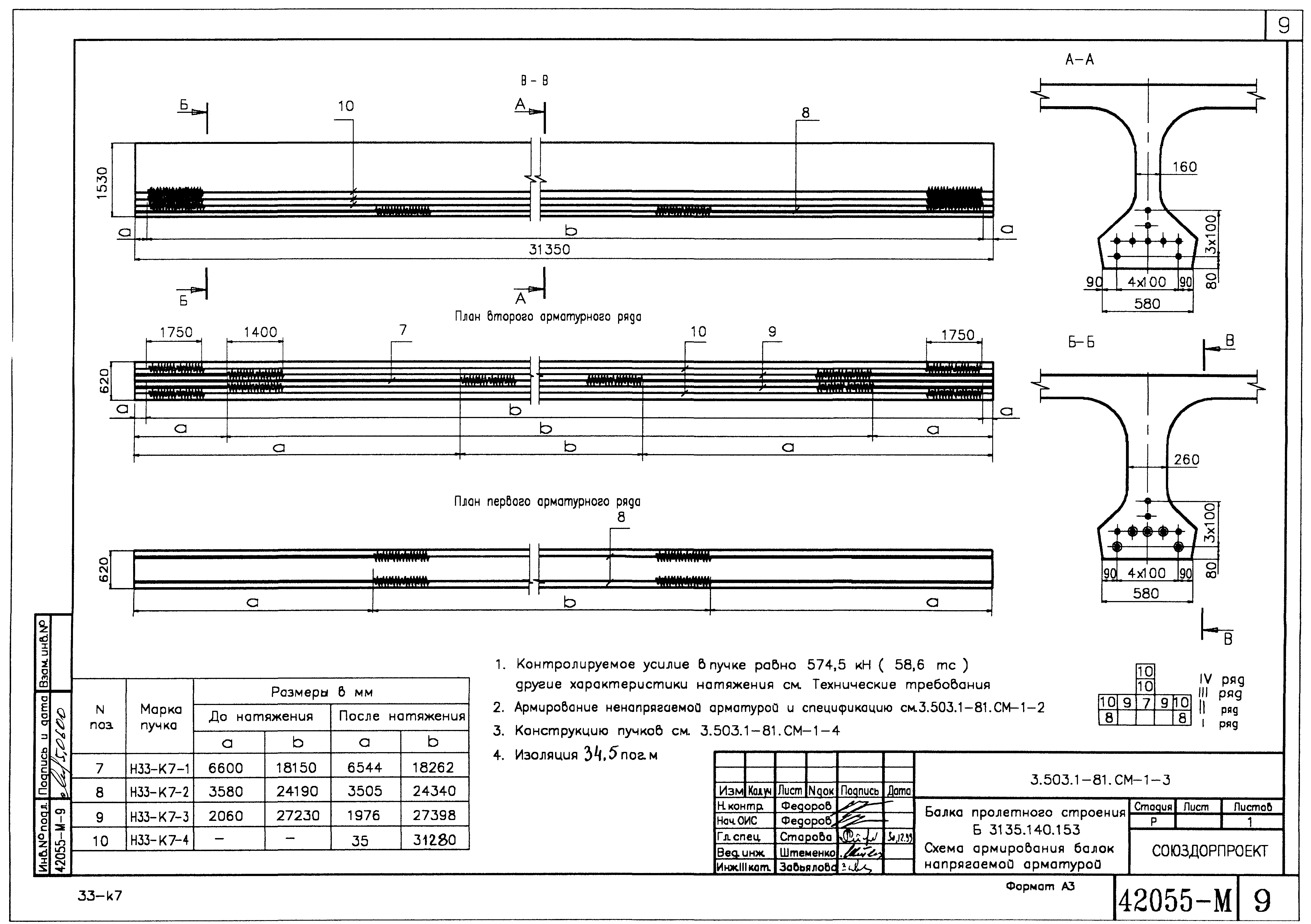 Скачать Выпуск 1. Балки пролетного строения 31,35 м, высотой 1,53 м, армированные пучками из 4 стальных канатов К7 по ГОСТ 13840-68*. Рабочие чертежиДата актуализации: 01.01.2021