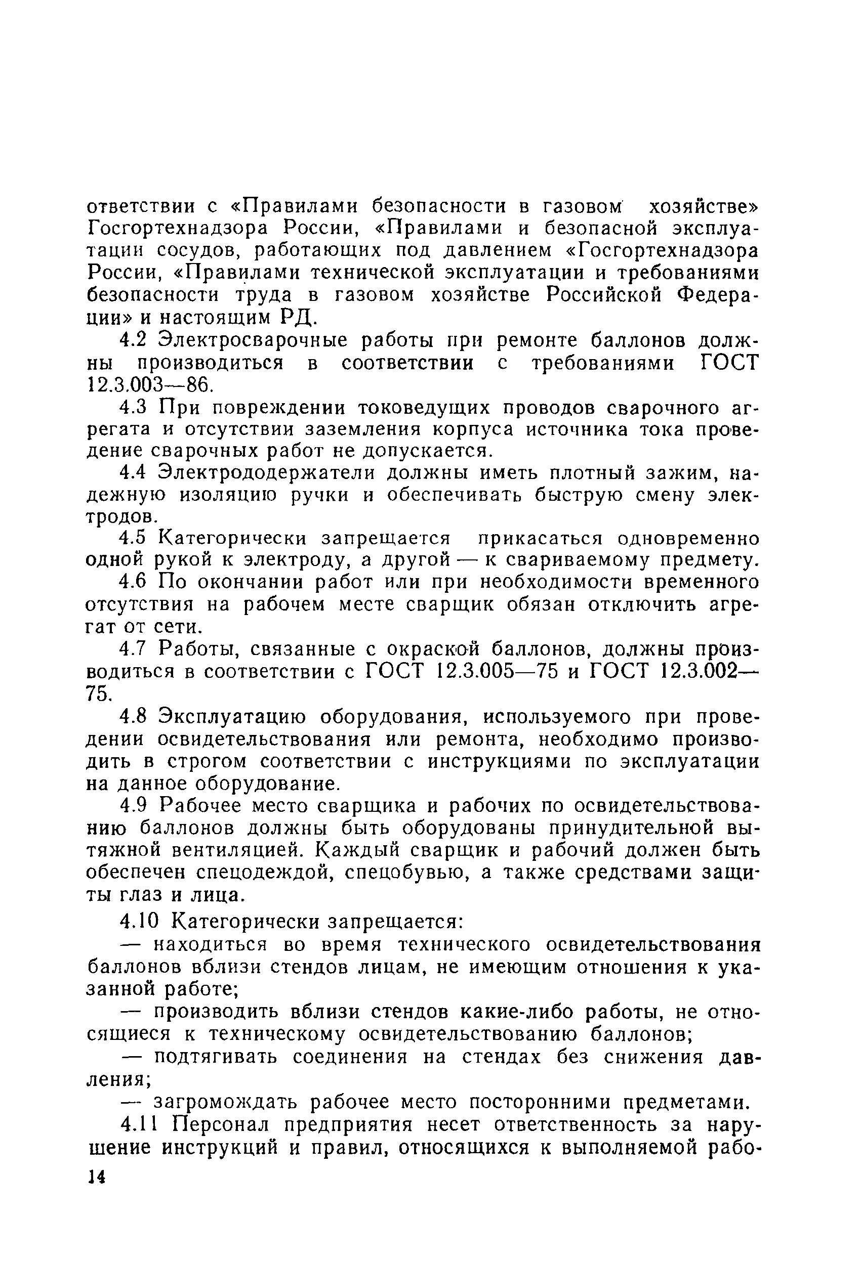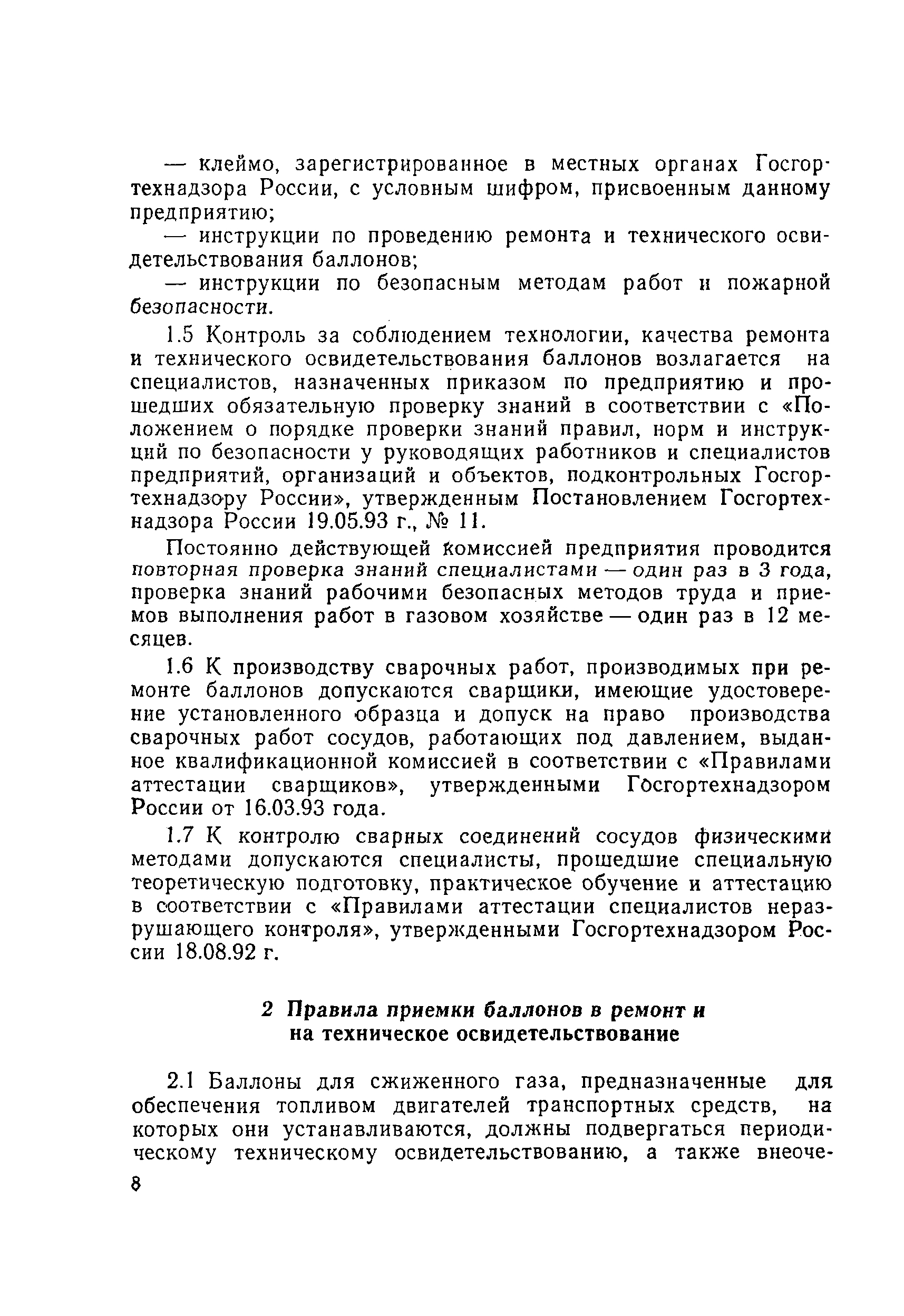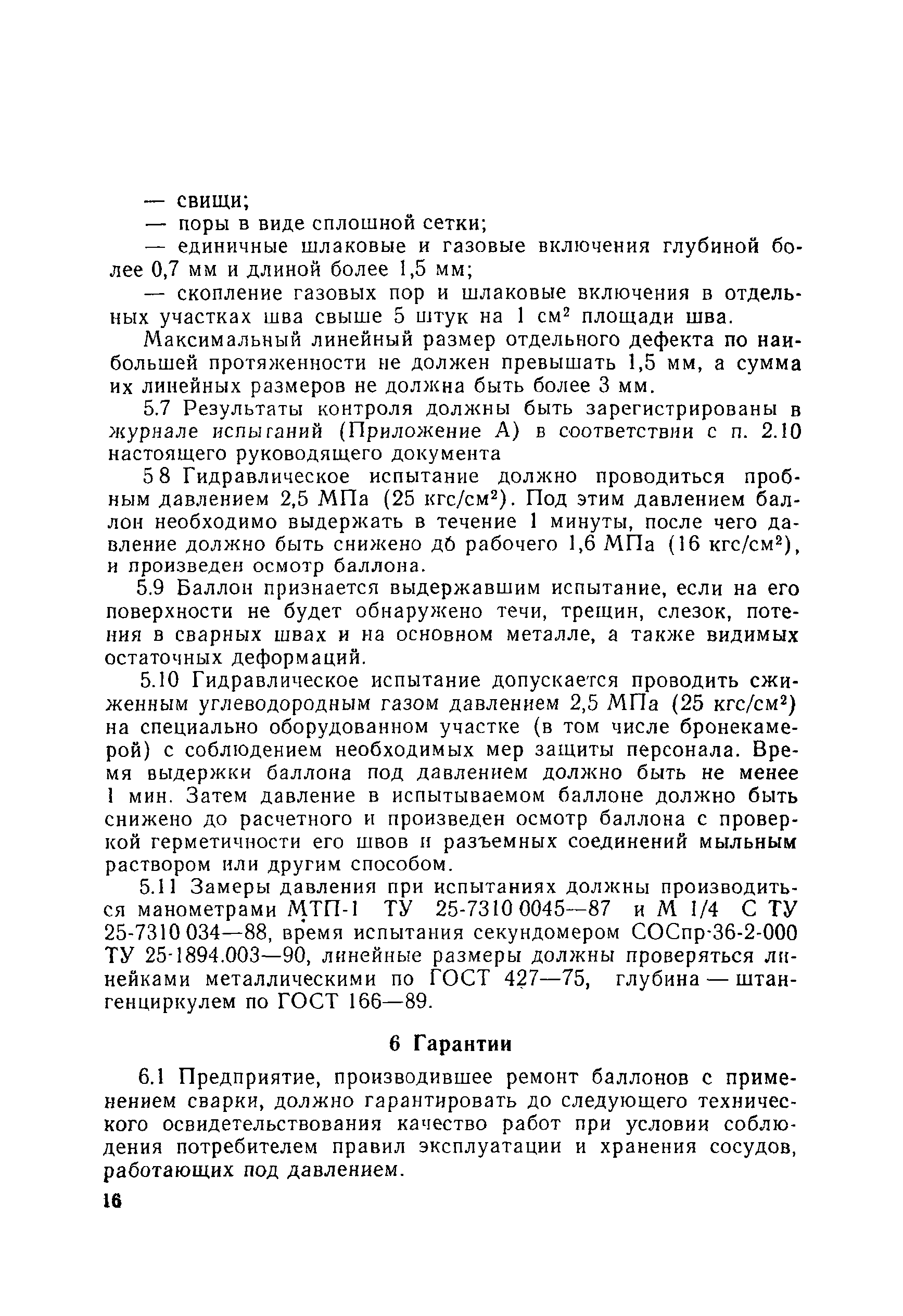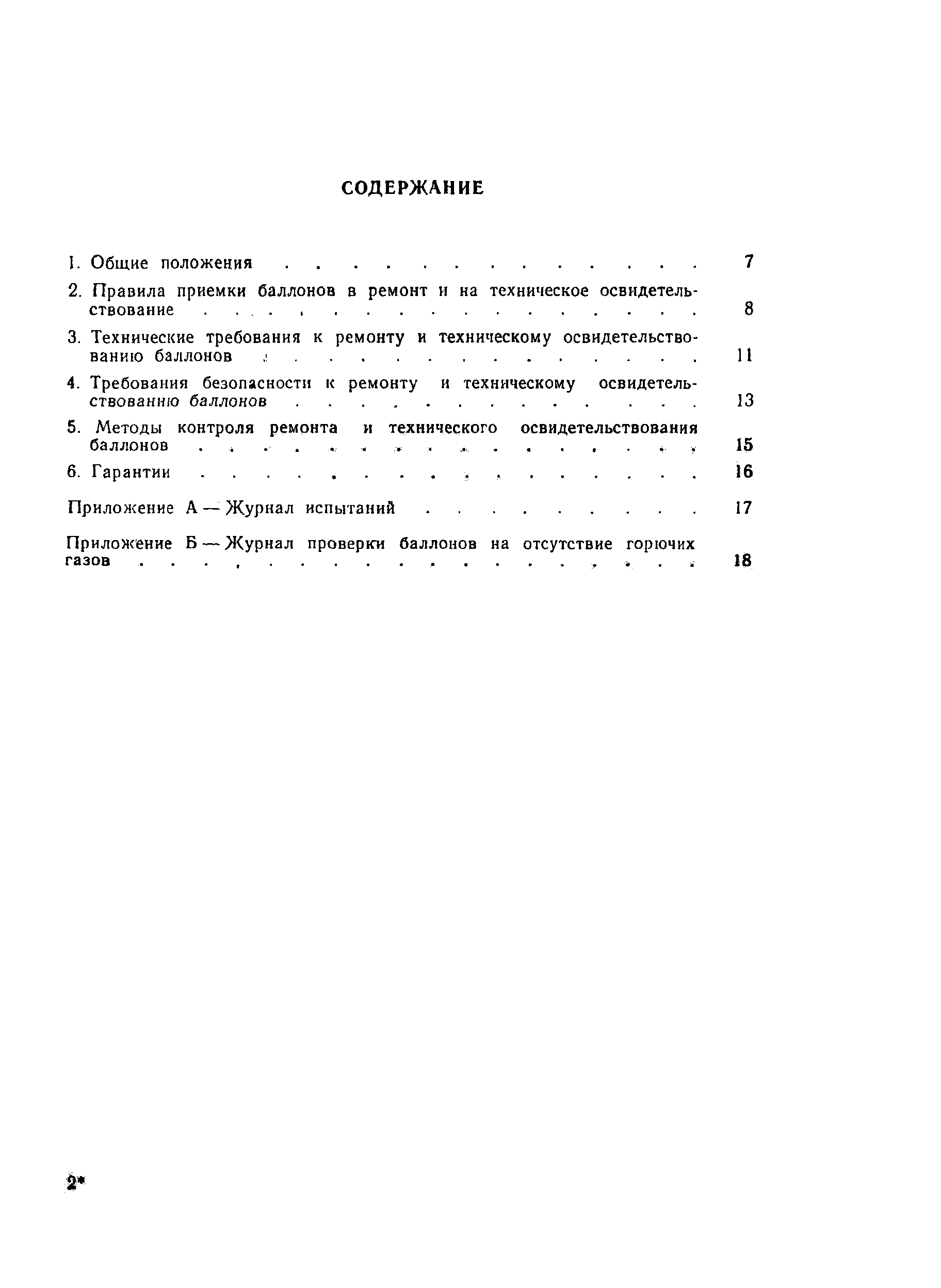 | Оглавление: | 1. Общие положения 2. Правила приемки баллонов в ремонт и на техническое освидетельствование 3. Технические требования к ремонту и техническому освидетельствованию баллонов 4. Требования безопасности к ремонту и техническому освидетельствованию баллонов 5. Методы контроля ремонта и технического освидетельствования баллонов 6. Гарантии Приложение А - Журнал испытаний Приложение Б - Журнал проверки баллонов на отсутствие горючих газов |
