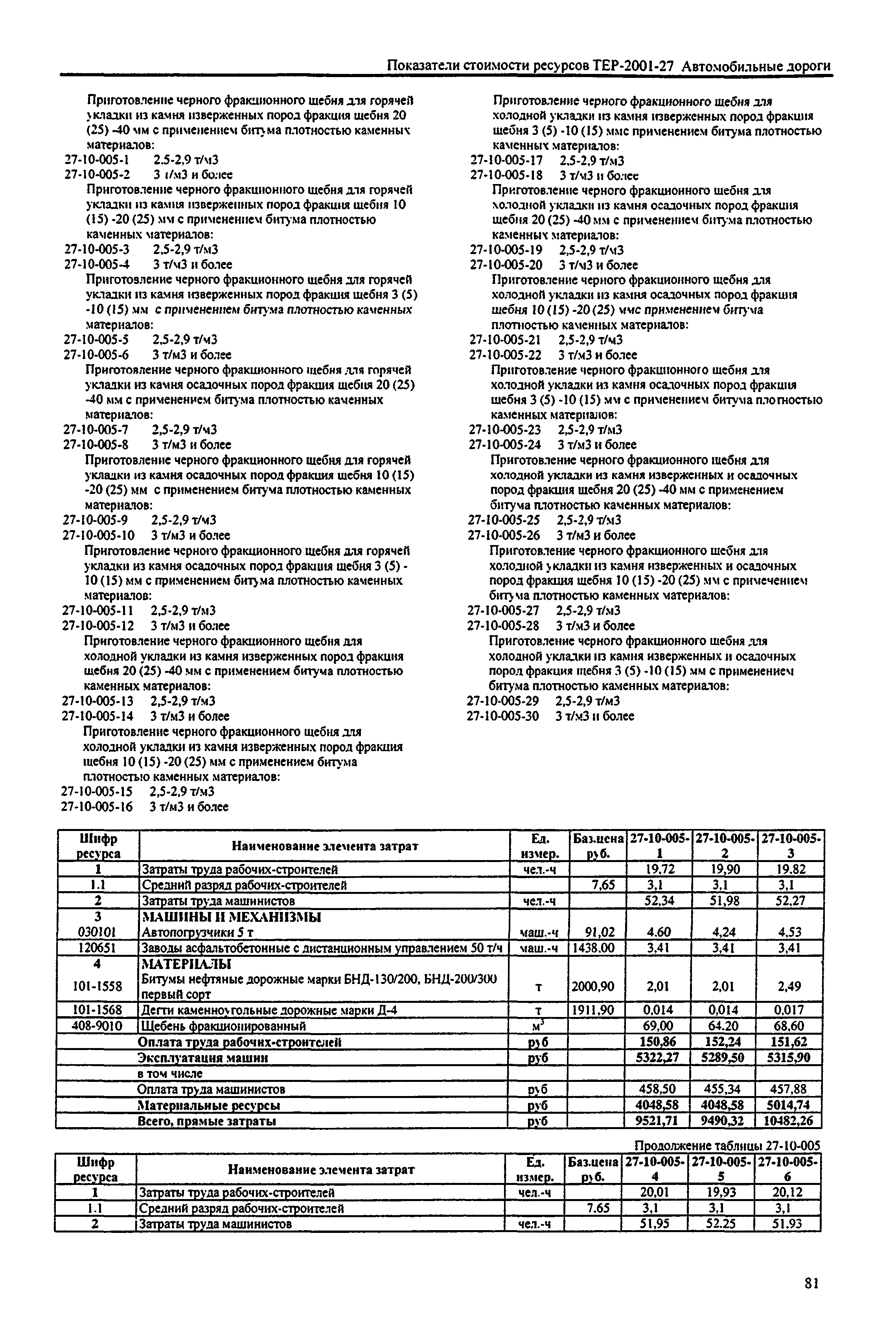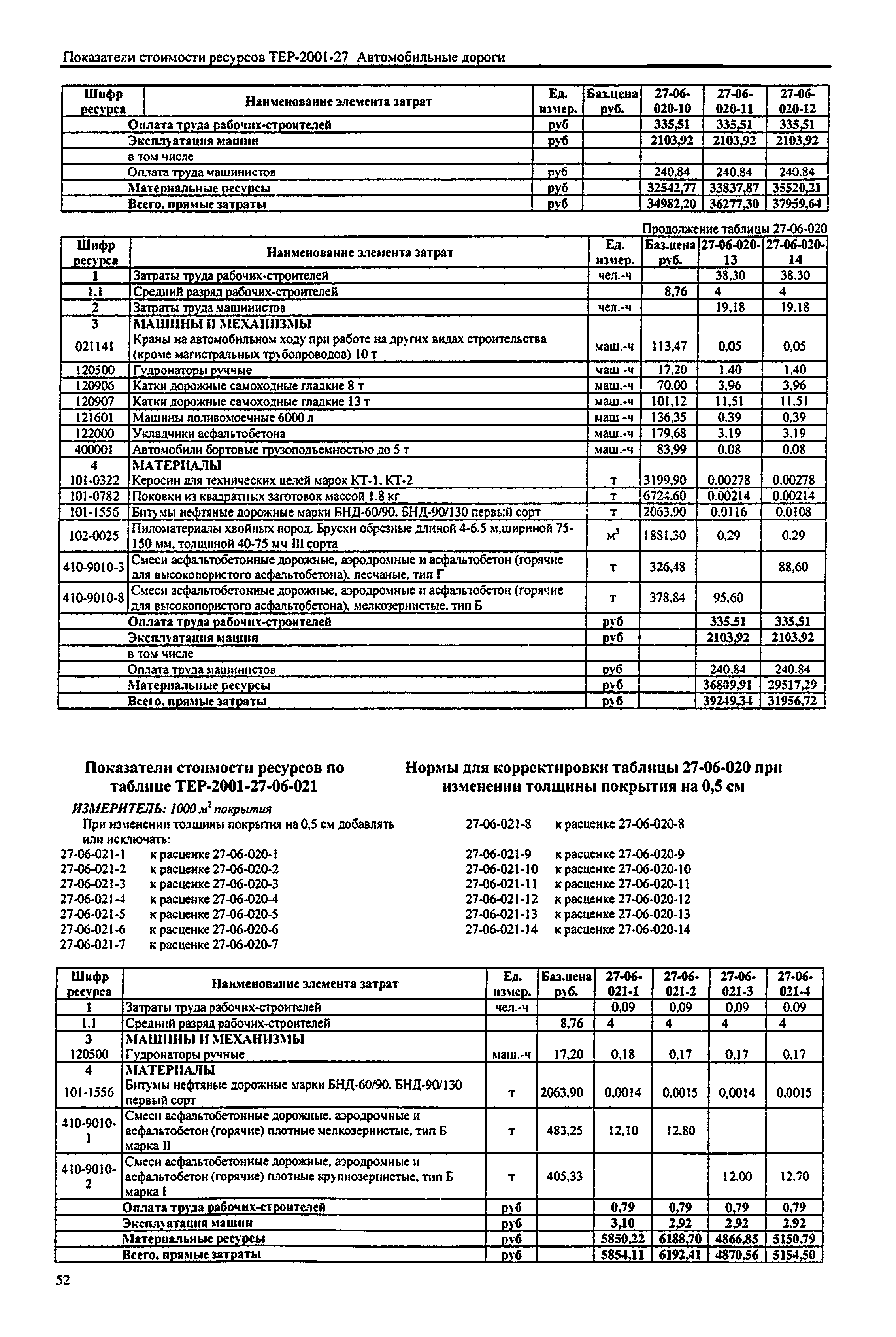 | Оглавление: | Техническая часть 1. Общие указания 2. Затраты на оплату труда 3. Затраты на эксплуатацию машин и механизмов 4. Затраты на материалы, изделия и конструкции Раздел 01. Основания и покрытия из грунтов, укрепляемых вяжущими материалами 1. Основания и покрытия из грунтов, укрепляемых органическими вяжущими материалами 27-01-001 Укрепление грунтов однослойных оснований и покрытий толщиной до 20 см 27-01-002 Устройство оснований и покрытий из готовой битумно-грунтовой смеси 2. Основания и покрытия из грунтов, укрепляемых неорганическими вяжущими материалами 27-01-003 Укрепление грунтов однослойных оснований и покрытий толщиной до 20 см смешением с цементом навесными фрезами 27-01-004 Устройство оснований и покрытий из готовой цементно-грунтовой смеси толщиной 15 см Раздел 02. Дренажные и водосбросные устройства 27-02-001 Устройство дренажей 27-02-002 Устройство сбросов воды из продольных дренажей 27-02-003 Устройство дренажных воронок под обочинами 27-02-004 Устройство водосбросных сооружений с проезжей части из лотков в откосах насыпи 27-02-005 Устройство водосбросных сооружений с проезжей части из продольных лотков из сборного бетона 27-02-006 Устройство водосбросных сооружений с проезжей части из водоприемных колодцев 27-02-007 Устройство водосбросных сооружений с проезжей части из открытых лотков на обочинах 27-02-008 Устройство водосбросных сооружений с проезжей части из гасителей 27-02-009 Укрепление площадки за шпорами гасителя сборными бетонными плитами при размываемых грунтах 27-02-010 Установка бортовых камней Раздел 03. Подготовка существующих оснований и покрытий под черные щебеночные (гравийные) и асфальтобетонные покрытия (при реконструкции) 1. Исправление профиля оснований 27-03-001 Исправление профиля щебеночных и гравийных оснований 27-03-002 Исправление профиля песчано-гравийных оснований и покрытий 27-03-003 Нормы для корректировки таблицы 27-03-002 при изменении толщины слоя основания или покрытия 27-03-004 Устройство выравнивающего слоя из асфальтобетонной смеси 2. Разборка существующих сооружений 27-03-008 Разборка покрытий и оснований 27-03-009 Срезка поверхностного слоя асфальтобетонных дорожных покрытий методом холодного фрезерования 27-03-010 Разборка бортовых камней Раздел 04. Подстилающие, выравнивающие слои основания и покрытия 1. Подстилающие и выравнивающие слои основания 27-04-001 Устройство подстилающих и выравнивающих слоев оснований 2. Основания и покрытия из гравийных, песчано-гравийных и щебеночно-песчаных смесей 27-04-003 Устройство оснований и покрытий из песчано-гравийных смесей или щебеночно-песчаных смесей 3. Основания и покрытия из щебеночных материалов 27-04-005 Устройство оснований из щебня фракции 40-70 мм при укатке каменных материалов с пределом прочности на сжатие свыше 98,1 МПа (1000 кгс/см2) 27-04-006 Устройство оснований из щебня фракции 40-70 мм при укатке каменных материалов с пределом прочности на сжатие свыше 68,6 до 98.1 МПа (свыше 700 до 1000 кгс/см2) 27-04-007 Устройство основания из щебня фракции 40-70 мм при укатке каменных материалов с пределом прочности на сжатие до 68,6 МПа (700 кгс/см2) 27-04-008 Нормы для корректировки таблиц 27-04-005, 27-04-006 и 27-04-007 при использовании однослойных и верхнего слоя двухслойных оснований под движение транспорта до полного окончания работ 27-04-009 Устройство оснований толщиной 12 см из щебня фракции 70-120 мм 27-04-010 Нормы для корректировки таблицы 27-04-009