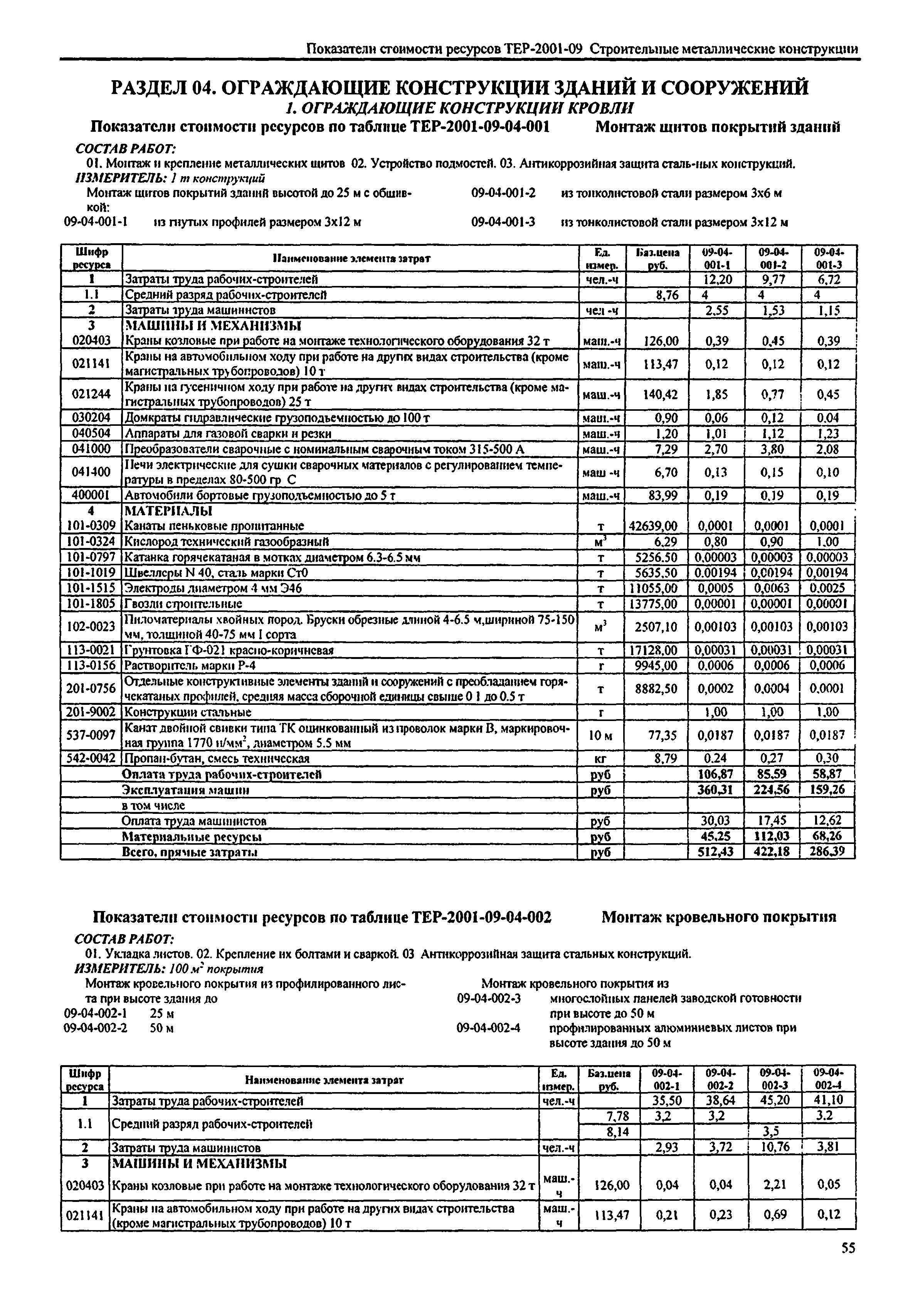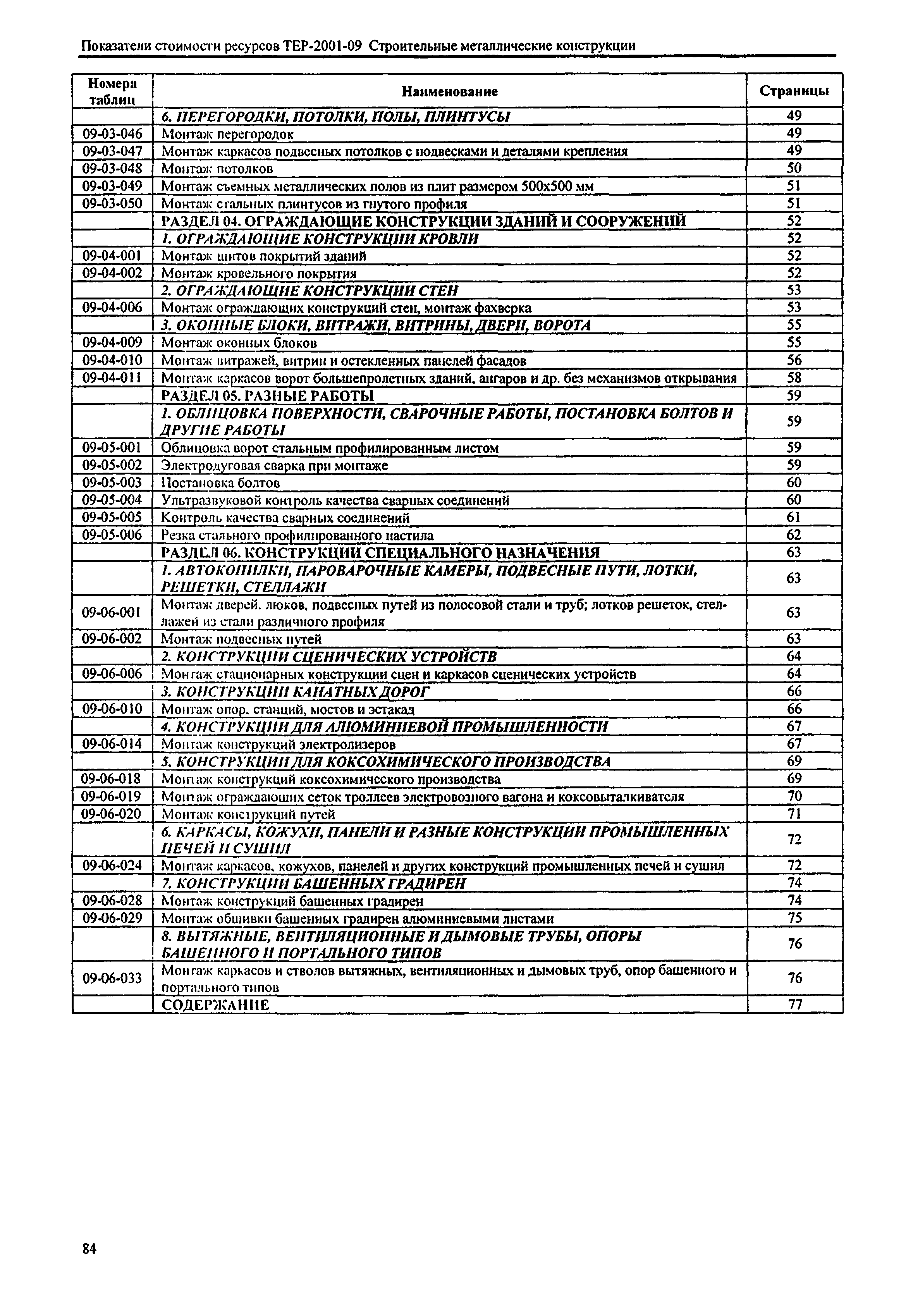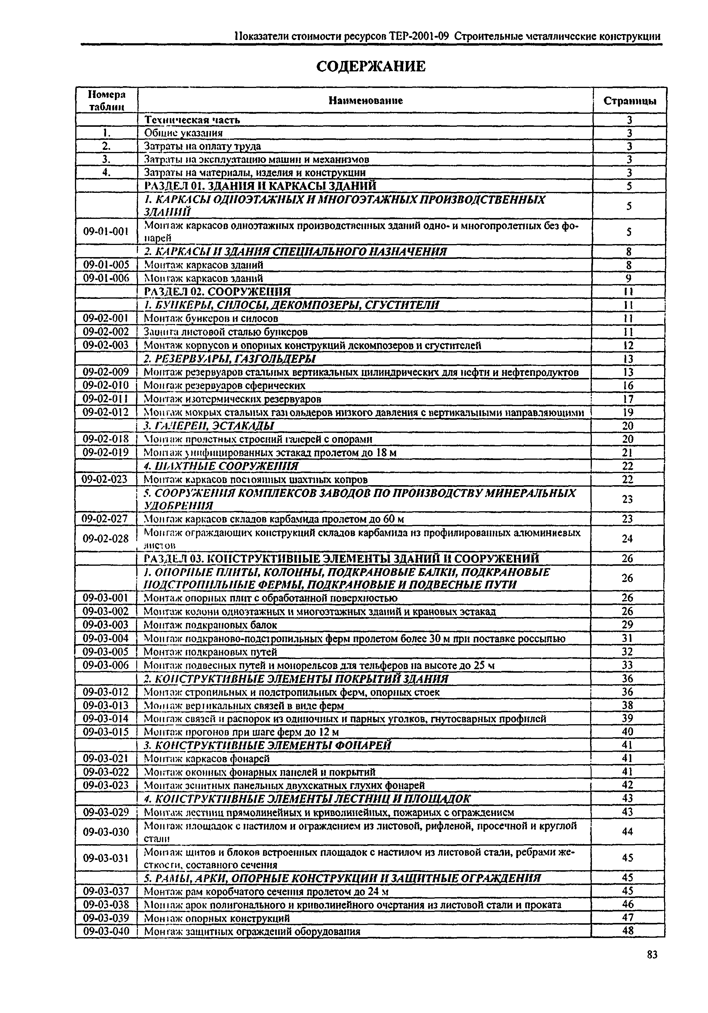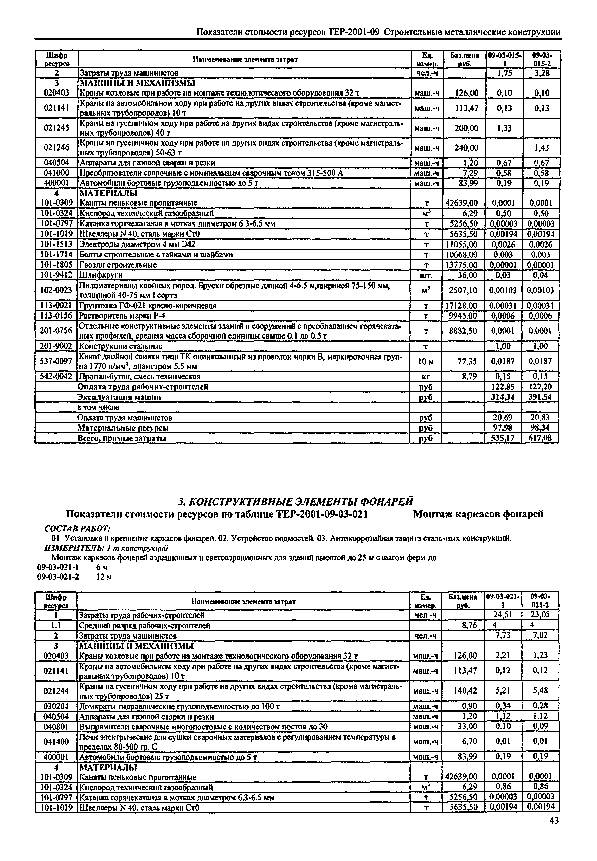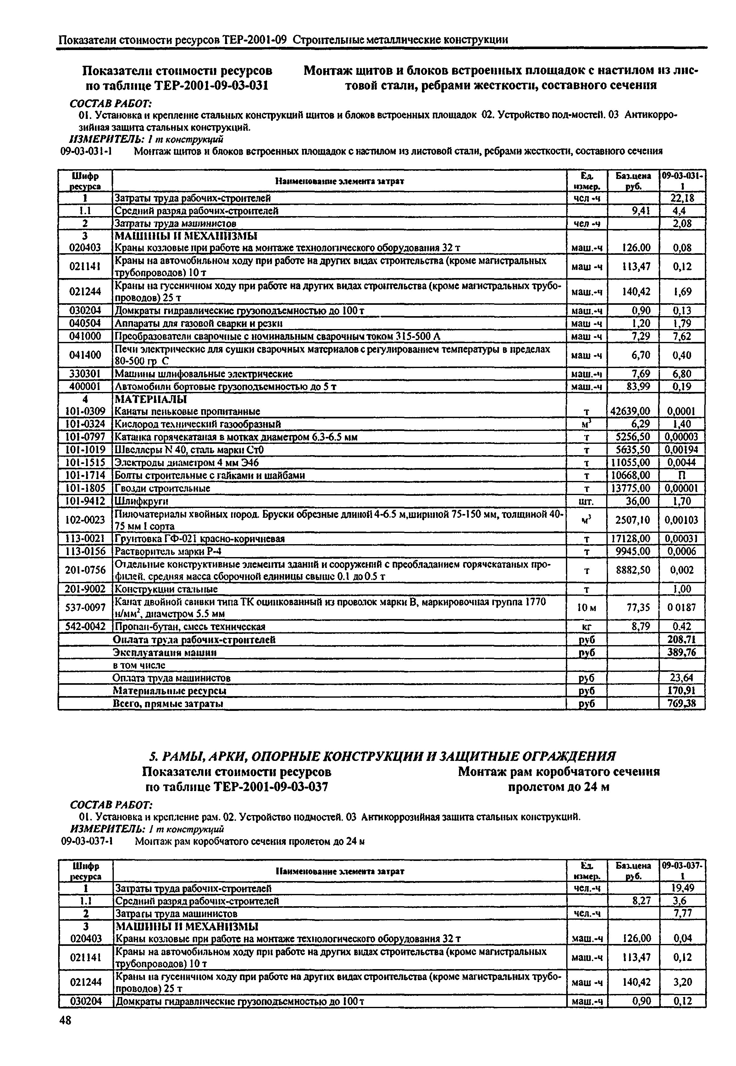 | Оглавление: | Техническая часть 1. Общие указания 2. Затраты на оплату труда 3. Затраты на эксплуатацию машин и механизмов 4. Затраты на материалы, изделия и конструкции Раздел 01. Здания и каркасы зданий 1. Каркасы одноэтажных и многоэтажных производственных зданий 09-01-001 Монтаж каркасов одноэтажных производственных зданий одно- и многопролетных без фонарей 2. Каркасы издания специального назначения 09-01-005 Монтаж каркасов зданий 09-01-006 Монтаж каркасов зданий Раздел 02. Сооружения 1. Бункеры, силосы, декомпозеры, сгустители 09-02-001 Монтаж бункеров и силосов 09-02-002 Защита листовой сталью бункеров 09-02-003 Монтаж корпусов и опорных конструкций декомпозеров и сгустителей 2. Резервуары, газгольдеры 09-02-009 Монтаж резервуаров стальных вертикальных цилиндрических для нефти и нефтепродуктов 09-02-010 Монтаж резервуаров сферических 09-02-011 Монтаж изотермических резервуаров 09-02-012 Монтаж мокрых стальных газгольдеров низкого давления с вертикальными направляющими 3. Галереи, эстакады 09-02-018 Монтаж пролетных строений галерей с опорами 09-02-019 Монтаж унифицированных эстакад пролетом до 18 м 4. Шахтные сооружения 09-02-023 Монтаж каркасов постоянных шахтных копров 5. Сооружения комплексов заводов по производству минеральных удобрения 09-02-027 Монтаж каркасов складов карбамида пролетом до 60 м 09-02-028 Монтаж ограждающих конструкций складов карбамида из профилированных алюминиевых листов Раздел 03. Конструктивные элементы зданий и сооружений 1. Опорные плиты, колонны, подкрановые балки, подкрановые подстропильные фермы, подкрановые и подвесные пути 09-03-001 Монтаж опорных плит с обработанной поверхностью 09-03-002 Монтаж колонн одноэтажных и многоэтажных зданий и крановых эстакад 09-03-003 Монтаж подкрановых балок 09-03-004 Монтаж подкраново-подстропильных ферм пролетом более 30 м при поставке россыпью 09-03-005 Монтаж подкрановых путей 09-03-006 Монтаж подвесных путей и монорельсов для тельферов на высоте до 25 м 2. Конструктивные элементы покрытий здания 09-03-012 Монтаж стропильных и подстропильных ферм, опорных стоек 09-03-013 Монтаж вертикальных связей в виде ферм 09-03-014 Монтаж связей и распорок из одиночных и парных уголков, гнутосварных профилей 09-03-015 Монтаж прогонов при шаге ферм до 12 м 3. Конструктивные элементы фонарей 09-03-021 Монтаж каркасов фонарей 09-03-022 Монтаж оконных фонарных панелей и покрытий 09-03-023 Монтаж зенитных панельных двухскатных глухих фонарей 4. Конструктивные элементы лестниц и площадок 09-03-029 Монтаж лестниц прямолинейных и криволинейных, пожарных с ограждением 09-03-030 Монтаж площадок с настилом и ограждением из листовой, рифленой, просечной и круглой стали 09-03-031 Монтаж щитов и блоков встроенных площадок с настилом из листовой стали, ребрами жесткости, составного сечения 5. Рамы, арки, опорные конструкции и защитные ограждения 09-03-037 Монтаж рам коробчатого сечения пролетом до 24 м 09-03-038 Монтаж арок полигонального и криволинейного очертания из листовой стали и проката 09-03-039 Монтаж опорных конструкций 09-03-040 Монтаж защитных ограждений оборудования 6. Перегородки, потолки, полы, плинтусы 09-03-046 Монтаж перегородок 09-03-047 Монтаж каркасов подвесных потолков с подвесками и деталями крепления 09-03-048 Монтаж потолков 09-03-049 Монтаж съемных металлических полов из плит размером 500x500 мм 09-03-050 Монтаж стальных плинтусов из гнутого профиля Раздел 04. Ограждающие конструкции зданий и сооружений 1. О
