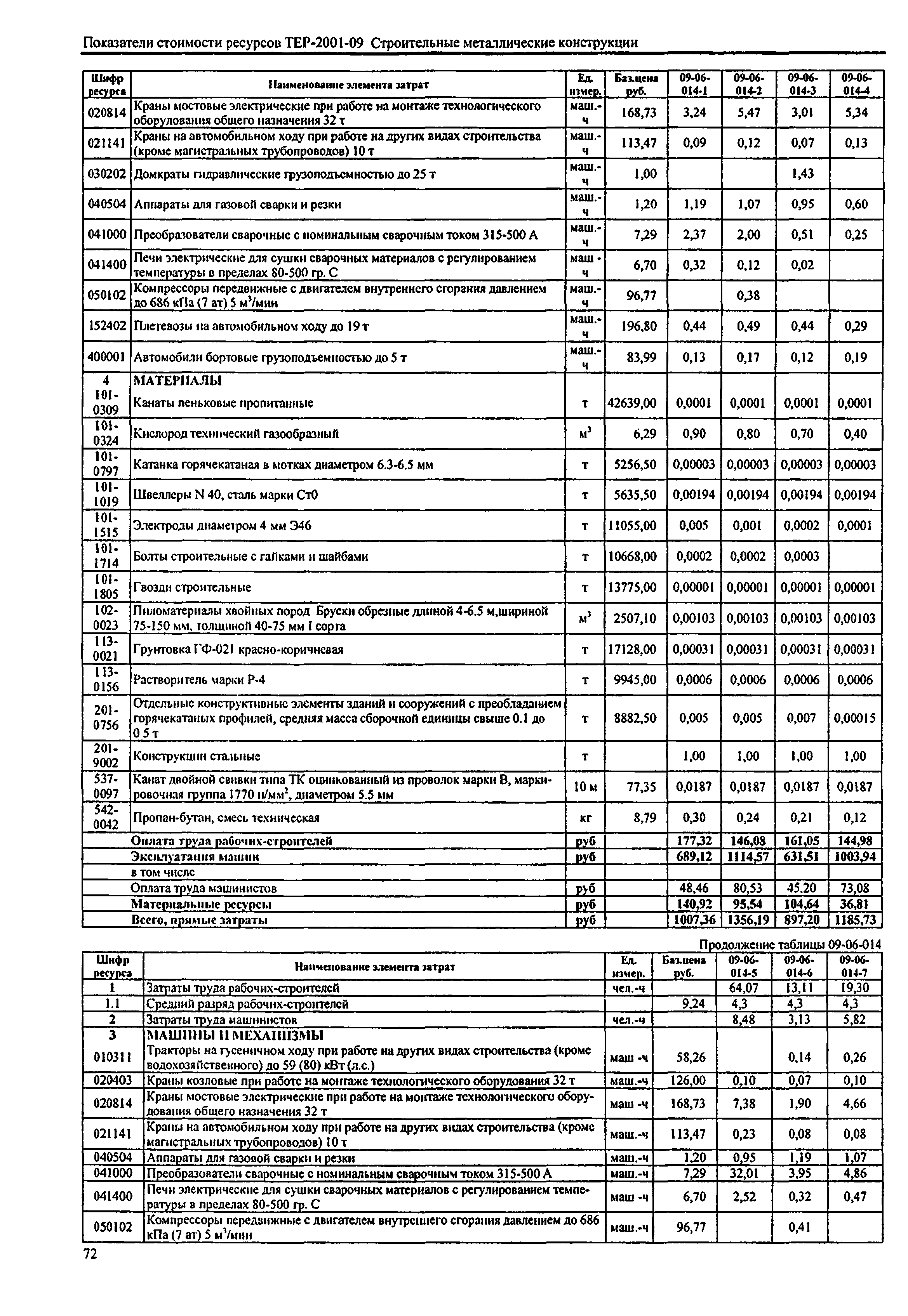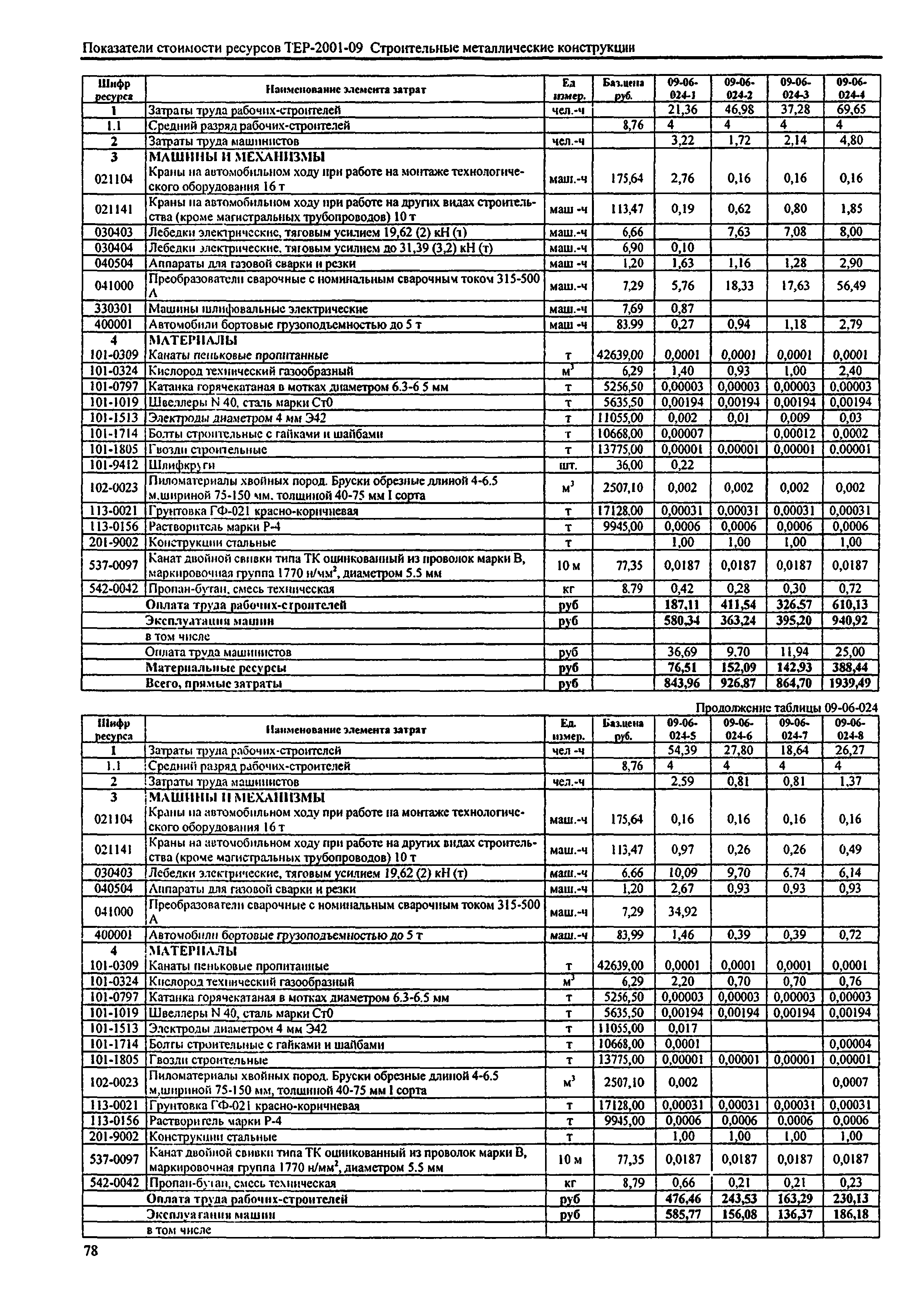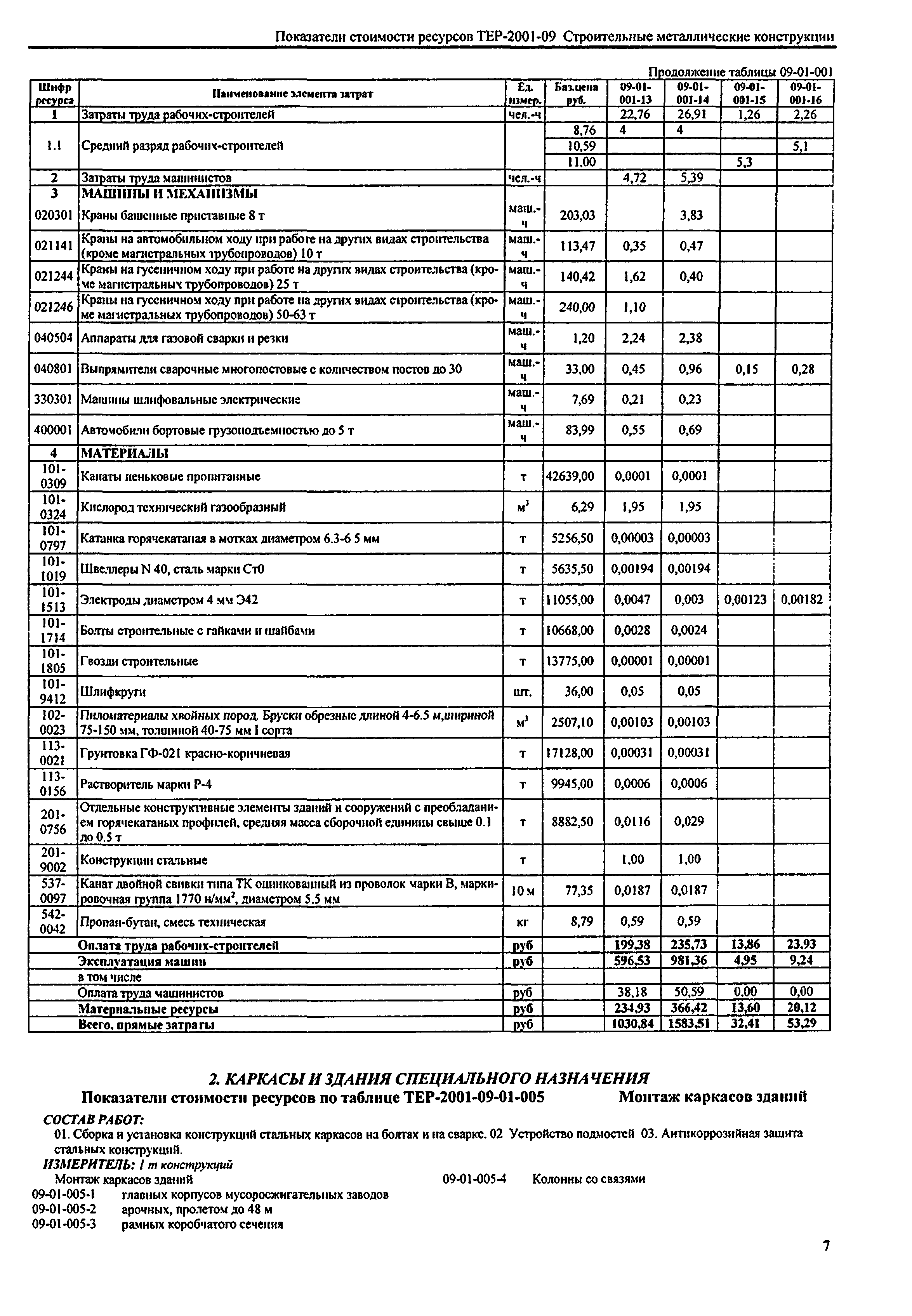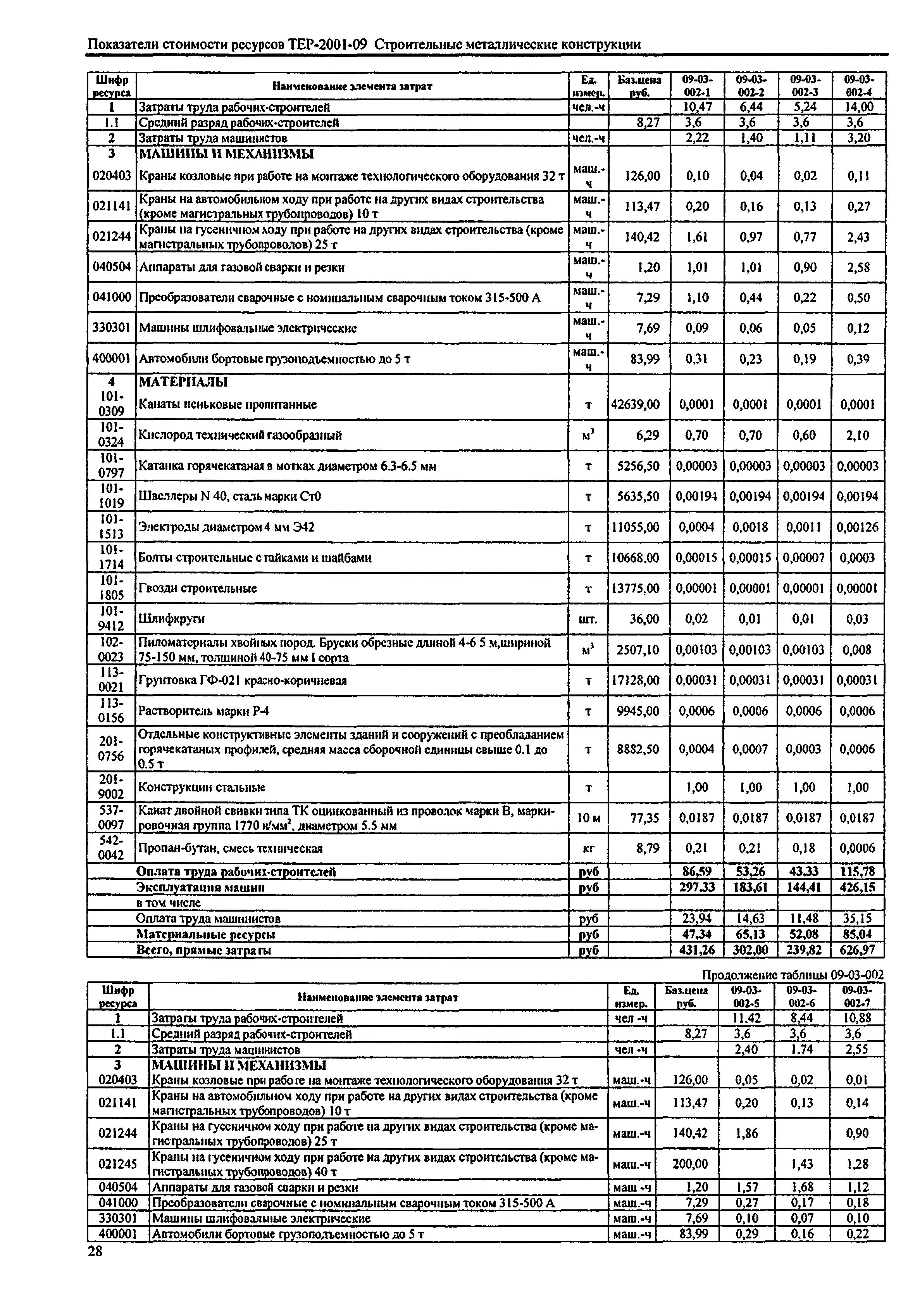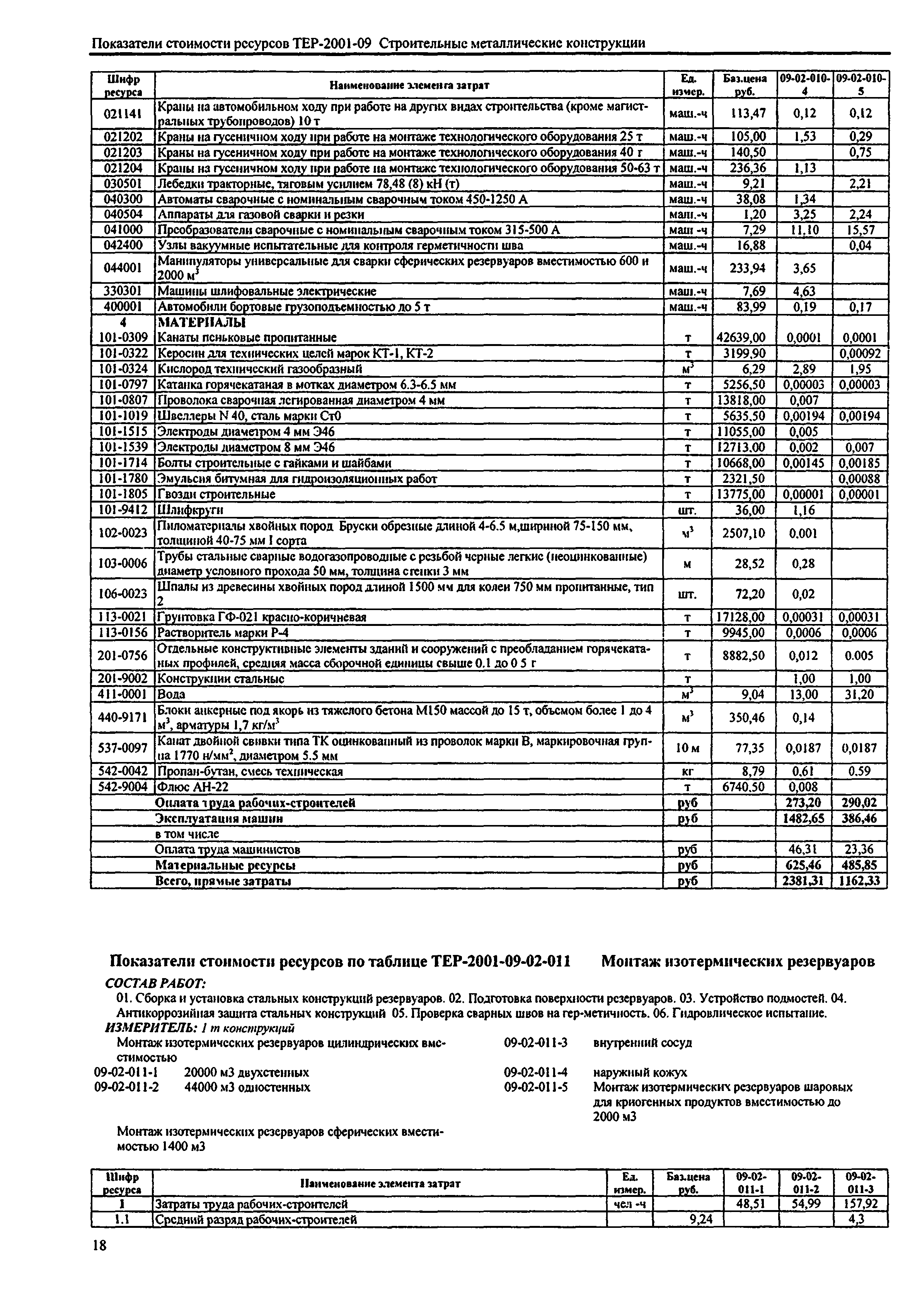 | Оглавление: | Техническая часть 1. Общие указания 2. Затраты на оплату труда 3. Затраты на эксплуатацию машин и механизмов 4. Затраты на материалы, изделия и конструкции Раздел 01. Здания и каркасы зданий 1. Каркасы одноэтажных и многоэтажных производственных зданий 09-01-001 Монтаж каркасов одноэтажных производственных зданий одно- и многопролетных без фонарей 2. Каркасы издания специального назначения 09-01-005 Монтаж каркасов зданий 09-01-006 Монтаж каркасов зданий Раздел 02. Сооружения 1. Бункеры, силосы, декомпозеры, сгустители 09-02-001 Монтаж бункеров и силосов 09-02-002 Защита листовой сталью бункеров 09-02-003 Монтаж корпусов и опорных конструкций декомпозеров и сгустителей 2. Резервуары, газгольдеры 09-02-009 Монтаж резервуаров стальных вертикальных цилиндрических для нефти и нефтепродуктов 09-02-010 Монтаж резервуаров сферических 09-02-011 Монтаж изотермических резервуаров 09-02-012 Монтаж мокрых стальных газгольдеров низкого давления с вертикальными направляющими 3. Галереи, эстакады 09-02-018 Монтаж пролетных строений галерей с опорами 09-02-019 Монтаж унифицированных эстакад пролетом до 18 м 4. Шахтные сооружения 09-02-023 Монтаж каркасов постоянных шахтных копров 5. Сооружения комплексов заводов по производству минеральных удобрения 09-02-027 Монтаж каркасов складов карбамида пролетом до 60 м 09-02-028 Монтаж ограждающих конструкций складов карбамида из профилированных алюминиевых листов Раздел 03. Конструктивные элементы зданий и сооружений 1. Опорные плиты, колонны, подкрановые балки, подкрановые подстропильные фермы, подкрановые и подвесные пути 09-03-001 Монтаж опорных плит с обработанной поверхностью 09-03-002 Монтаж колонн одноэтажных и многоэтажных зданий и крановых эстакад 09-03-003 Монтаж подкрановых балок 09-03-004 Монтаж подкраново-подстропильных ферм пролетом более 30 м при поставке россыпью 09-03-005 Монтаж подкрановых путей 09-03-006 Монтаж подвесных путей и монорельсов для тельферов на высоте до 25 м 2. Конструктивные элементы покрытий здания 09-03-012 Монтаж стропильных и подстропильных ферм, опорных стоек 09-03-013 Монтаж вертикальных связей в виде ферм 09-03-014 Монтаж связей и распорок из одиночных и парных уголков, гнутосварных профилей 09-03-015 Монтаж прогонов при шаге ферм до 12 м 3. Конструктивные элементы фонарей 09-03-021 Монтаж каркасов фонарей 09-03-022 Монтаж оконных фонарных панелей и покрытий 09-03-023 Монтаж зенитных панельных двухскатных глухих фонарей 4. Конструктивные элементы лестниц и площадок 09-03-029 Монтаж лестниц прямолинейных и криволинейных, пожарных с ограждением 09-03-030 Монтаж площадок с настилом и ограждением из листовой, рифленой, просечной и круглой стали 09-03-031 Монтаж щитов и блоков встроенных площадок с настилом из листовой стали, ребрами жесткости, составного сечения 5. Рамы, арки, опорные конструкции и защитные ограждения 09-03-037 Монтаж рам коробчатого сечения пролетом до 24 м 09-03-038 Монтаж арок полигонального и криволинейного очертания из листовой стали и проката 09-03-039 Монтаж опорных конструкций 09-03-040 Монтаж защитных ограждений оборудования 6. Перегородки, потолки, полы, плинтусы 09-03-046 Монтаж перегородок 09-03-047 Монтаж каркасов подвесных потолков с подвесками и деталями крепления 09-03-048 Монтаж потолков 09-03-049 Монтаж съемных металлических полов из плит размером 500x500 мм 09-03-050 Монтаж стальных плинтусов из гнутого профиля Раздел 04. Ограждающие конструкции зданий и сооружений 1. О