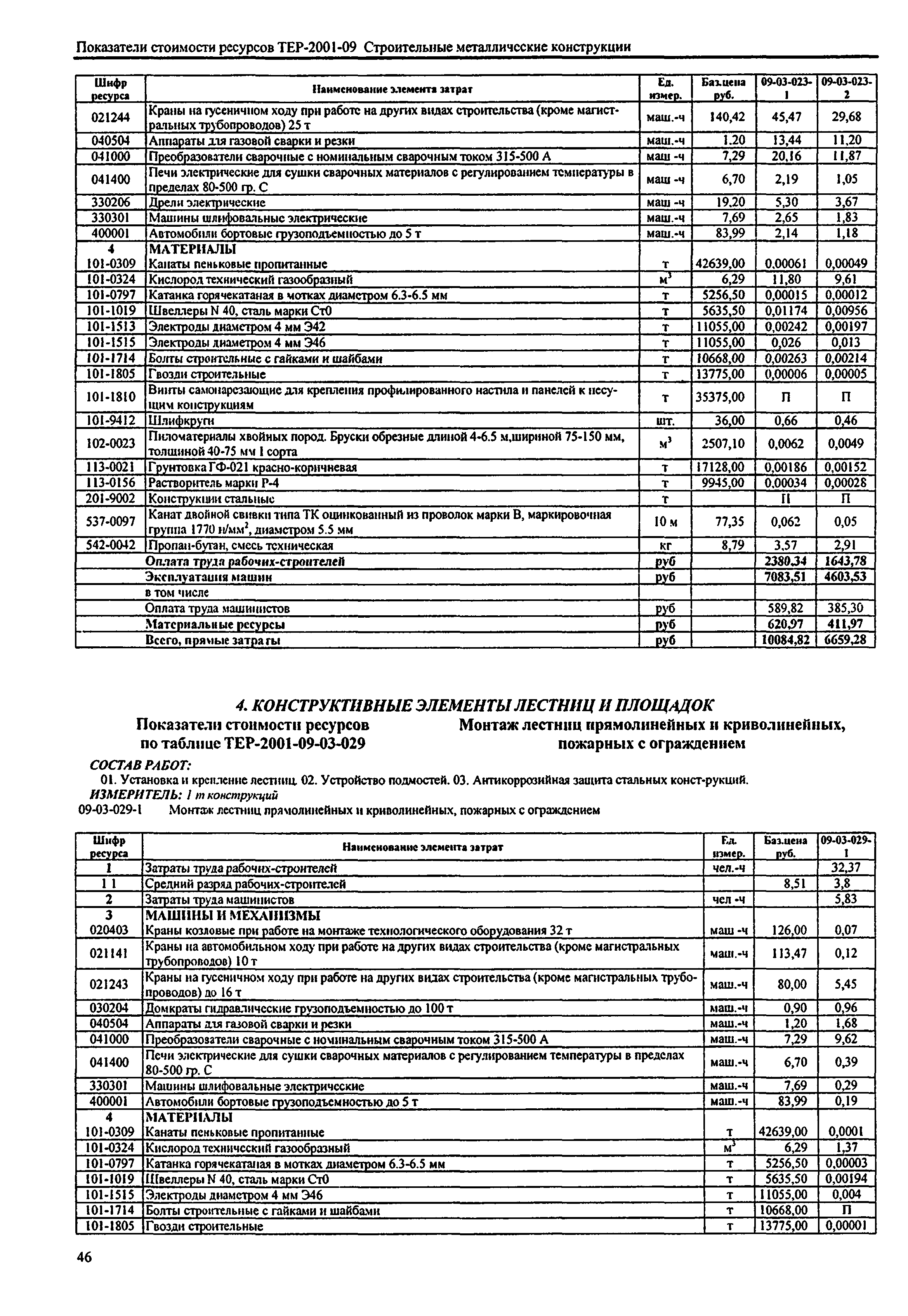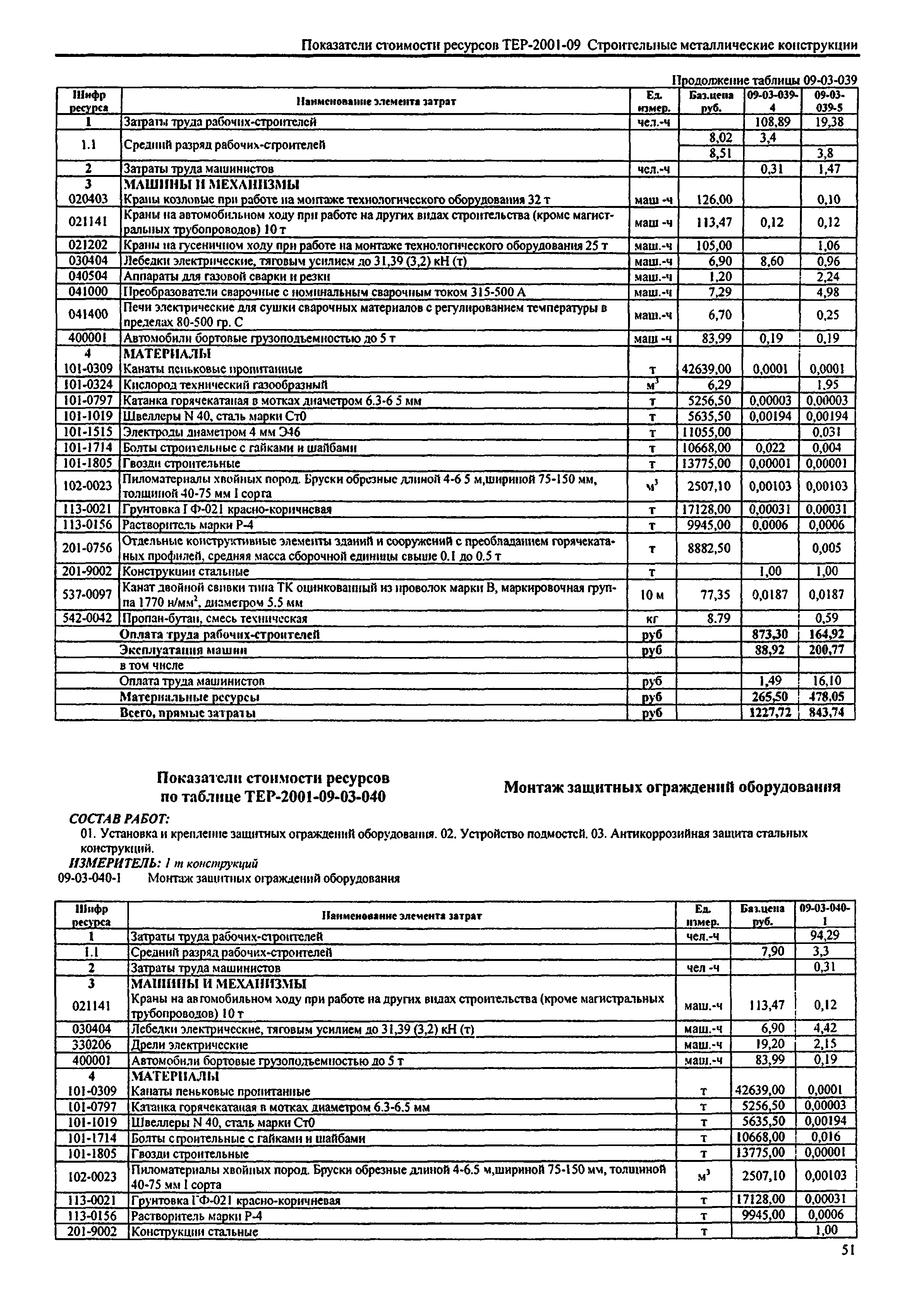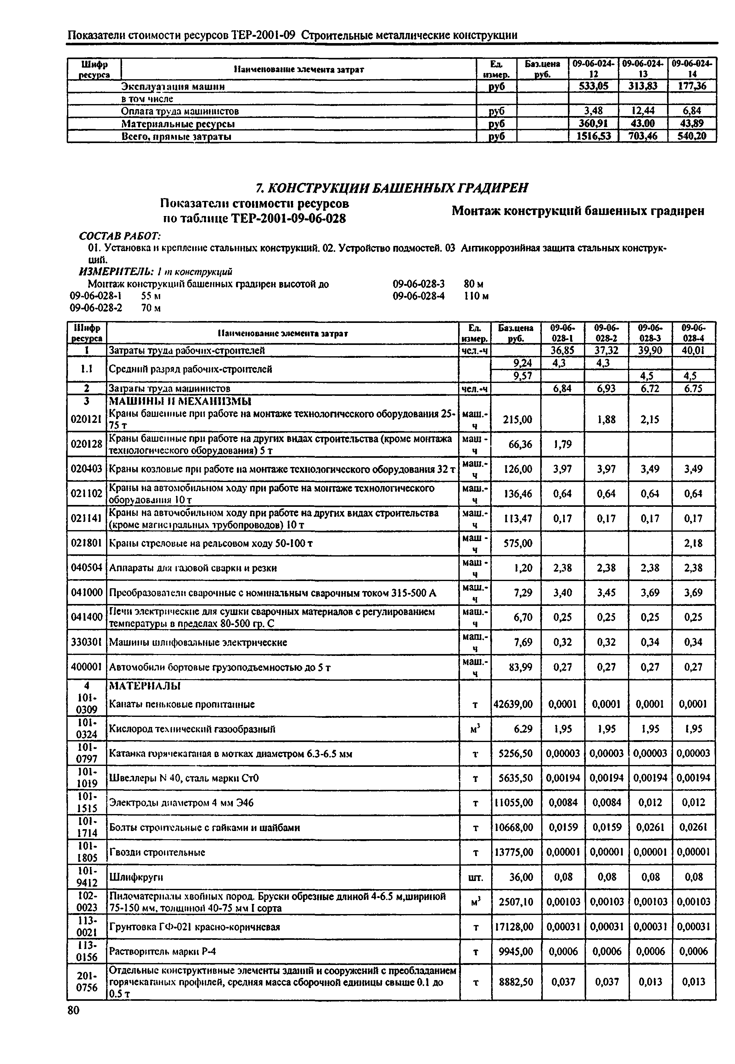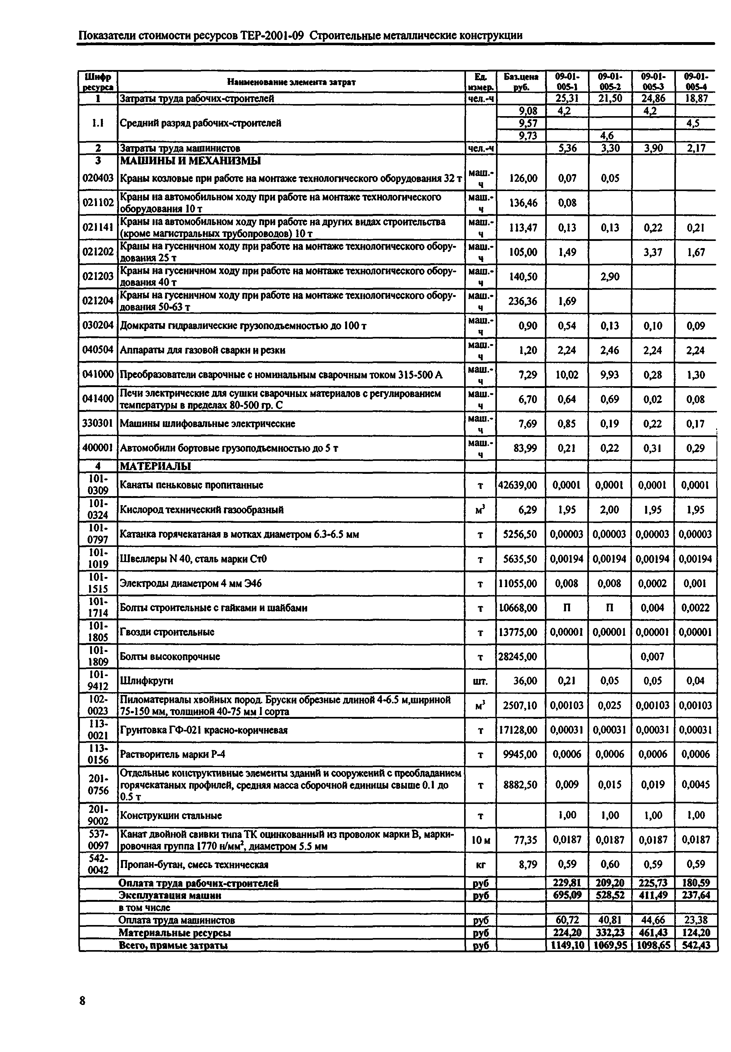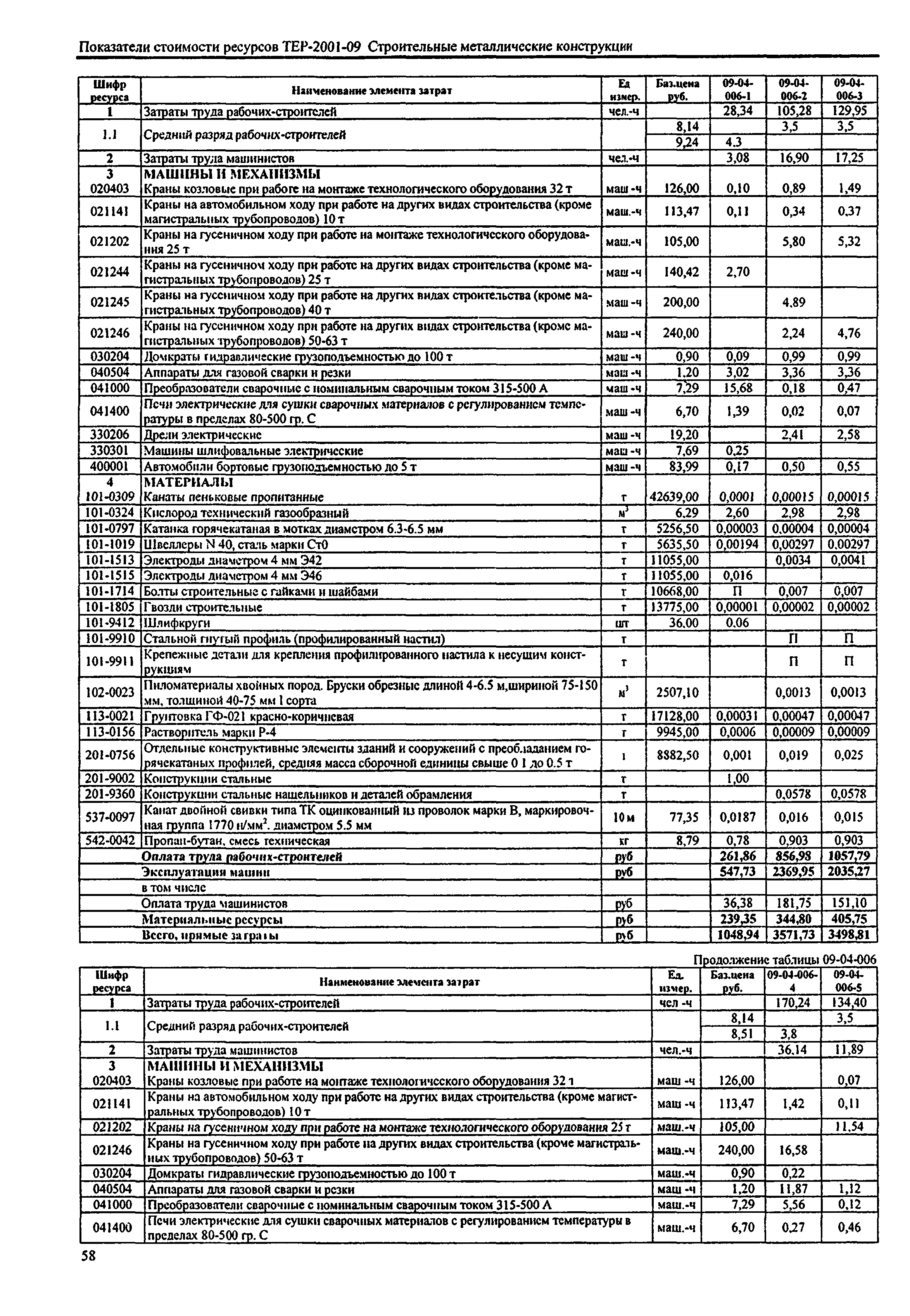 | Оглавление: | Техническая часть 1. Общие указания 2. Затраты на оплату труда 3. Затраты на эксплуатацию машин и механизмов 4. Затраты на материалы, изделия и конструкции Раздел 01. Здания и каркасы зданий 1. Каркасы одноэтажных и многоэтажных производственных зданий 09-01-001 Монтаж каркасов одноэтажных производственных зданий одно- и многопролетных без фонарей 2. Каркасы издания специального назначения 09-01-005 Монтаж каркасов зданий 09-01-006 Монтаж каркасов зданий Раздел 02. Сооружения 1. Бункеры, силосы, декомпозеры, сгустители 09-02-001 Монтаж бункеров и силосов 09-02-002 Защита листовой сталью бункеров 09-02-003 Монтаж корпусов и опорных конструкций декомпозеров и сгустителей 2. Резервуары, газгольдеры 09-02-009 Монтаж резервуаров стальных вертикальных цилиндрических для нефти и нефтепродуктов 09-02-010 Монтаж резервуаров сферических 09-02-011 Монтаж изотермических резервуаров 09-02-012 Монтаж мокрых стальных газгольдеров низкого давления с вертикальными направляющими 3. Галереи, эстакады 09-02-018 Монтаж пролетных строений галерей с опорами 09-02-019 Монтаж унифицированных эстакад пролетом до 18 м 4. Шахтные сооружения 09-02-023 Монтаж каркасов постоянных шахтных копров 5. Сооружения комплексов заводов по производству минеральных удобрения 09-02-027 Монтаж каркасов складов карбамида пролетом до 60 м 09-02-028 Монтаж ограждающих конструкций складов карбамида из профилированных алюминиевых листов Раздел 03. Конструктивные элементы зданий и сооружений 1. Опорные плиты, колонны, подкрановые балки, подкрановые подстропильные фермы, подкрановые и подвесные пути 09-03-001 Монтаж опорных плит с обработанной поверхностью 09-03-002 Монтаж колонн одноэтажных и многоэтажных зданий и крановых эстакад 09-03-003 Монтаж подкрановых балок 09-03-004 Монтаж подкраново-подстропильных ферм пролетом более 30 м при поставке россыпью 09-03-005 Монтаж подкрановых путей 09-03-006 Монтаж подвесных путей и монорельсов для тельферов на высоте до 25 м 2. Конструктивные элементы покрытий здания 09-03-012 Монтаж стропильных и подстропильных ферм, опорных стоек 09-03-013 Монтаж вертикальных связей в виде ферм 09-03-014 Монтаж связей и распорок из одиночных и парных уголков, гнутосварных профилей 09-03-015 Монтаж прогонов при шаге ферм до 12 м 3. Конструктивные элементы фонарей 09-03-021 Монтаж каркасов фонарей 09-03-022 Монтаж оконных фонарных панелей и покрытий 09-03-023 Монтаж зенитных панельных двухскатных глухих фонарей 4. Конструктивные элементы лестниц и площадок 09-03-029 Монтаж лестниц прямолинейных и криволинейных, пожарных с ограждением 09-03-030 Монтаж площадок с настилом и ограждением из листовой, рифленой, просечной и круглой стали 09-03-031 Монтаж щитов и блоков встроенных площадок с настилом из листовой стали, ребрами жесткости, составного сечения 5. Рамы, арки, опорные конструкции и защитные ограждения 09-03-037 Монтаж рам коробчатого сечения пролетом до 24 м 09-03-038 Монтаж арок полигонального и криволинейного очертания из листовой стали и проката 09-03-039 Монтаж опорных конструкций 09-03-040 Монтаж защитных ограждений оборудования 6. Перегородки, потолки, полы, плинтусы 09-03-046 Монтаж перегородок 09-03-047 Монтаж каркасов подвесных потолков с подвесками и деталями крепления 09-03-048 Монтаж потолков 09-03-049 Монтаж съемных металлических полов из плит размером 500x500 мм 09-03-050 Монтаж стальных плинтусов из гнутого профиля Раздел 04. Ограждающие конструкции зданий и сооружений 1. О