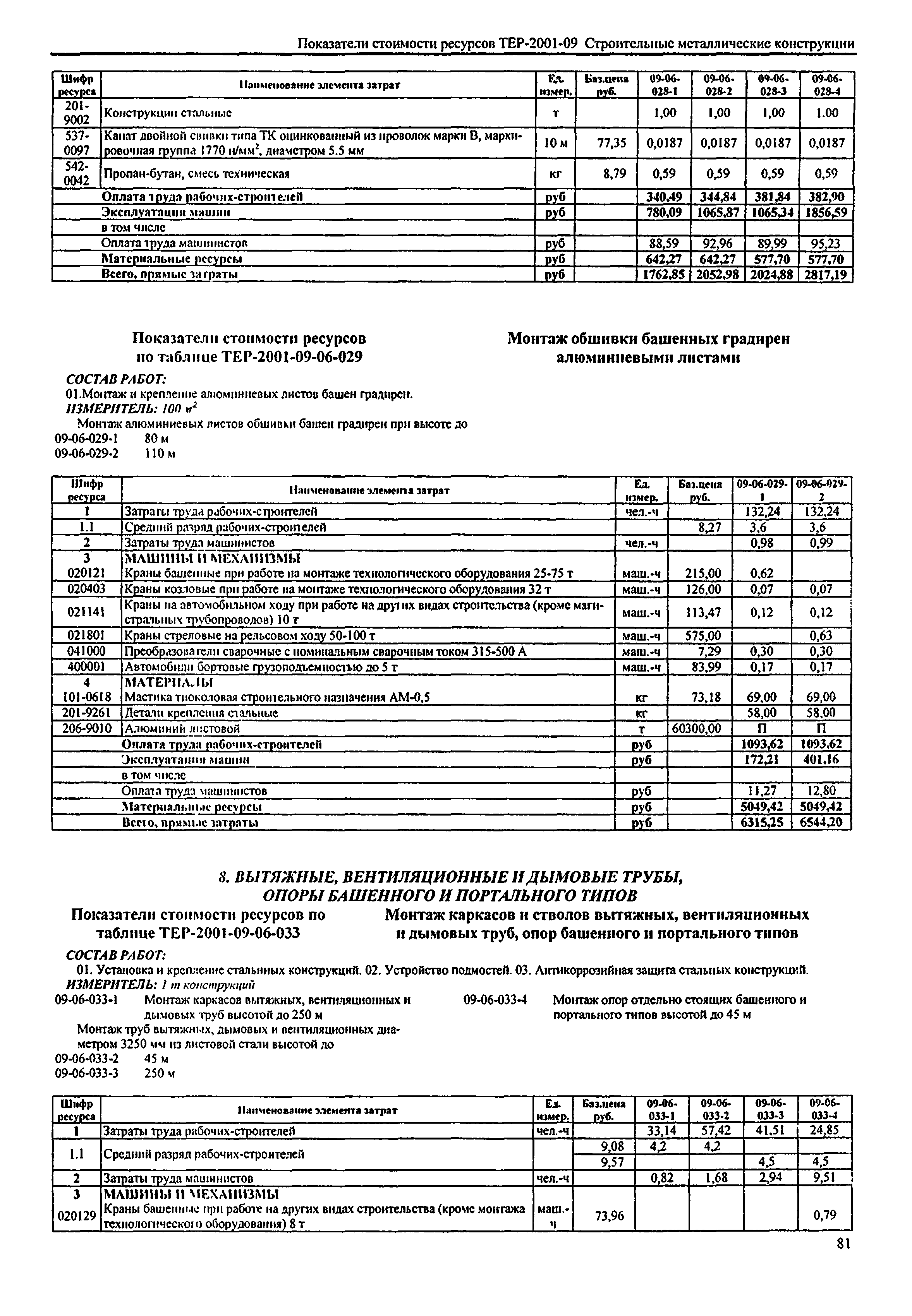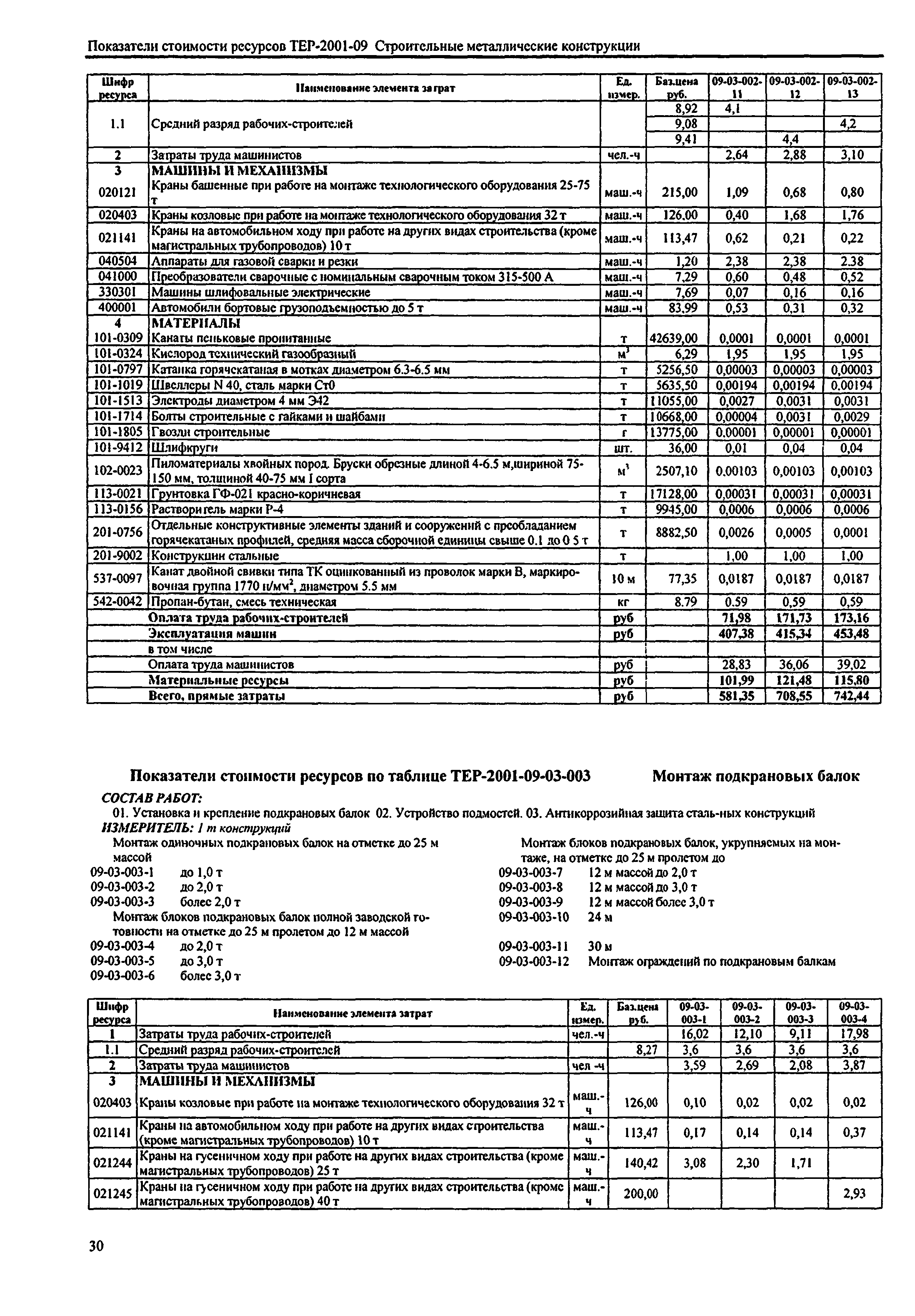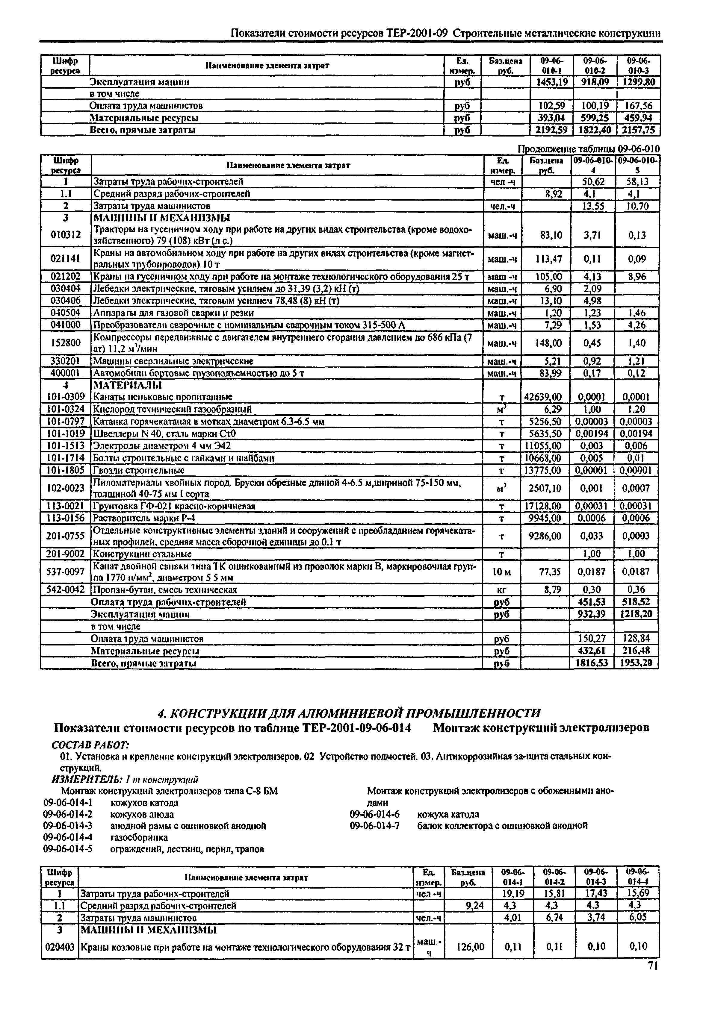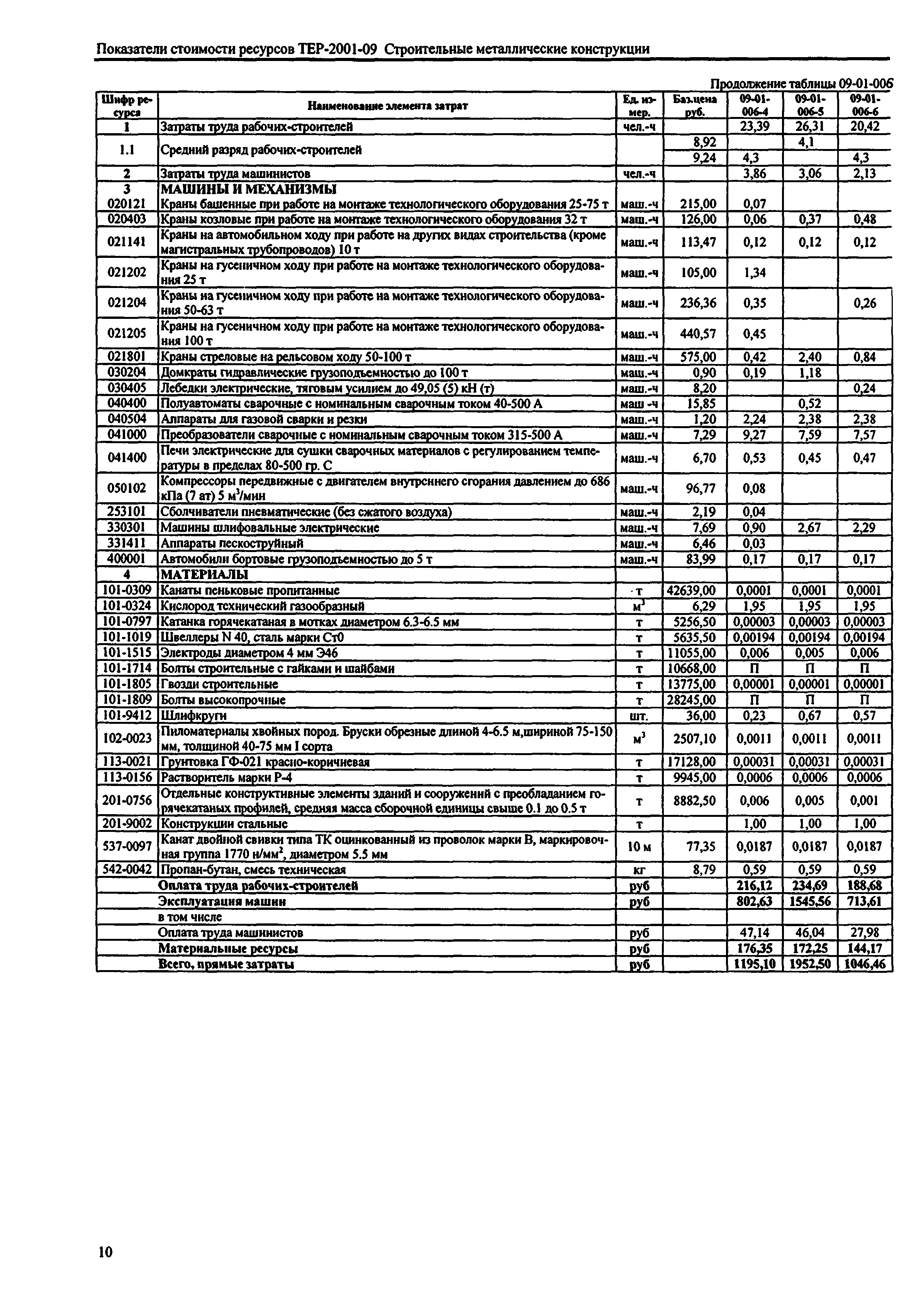 | Оглавление: | Техническая часть 1. Общие указания 2. Затраты на оплату труда 3. Затраты на эксплуатацию машин и механизмов 4. Затраты на материалы, изделия и конструкции Раздел 01. Здания и каркасы зданий 1. Каркасы одноэтажных и многоэтажных производственных зданий 09-01-001 Монтаж каркасов одноэтажных производственных зданий одно- и многопролетных без фонарей 2. Каркасы издания специального назначения 09-01-005 Монтаж каркасов зданий 09-01-006 Монтаж каркасов зданий Раздел 02. Сооружения 1. Бункеры, силосы, декомпозеры, сгустители 09-02-001 Монтаж бункеров и силосов 09-02-002 Защита листовой сталью бункеров 09-02-003 Монтаж корпусов и опорных конструкций декомпозеров и сгустителей 2. Резервуары, газгольдеры 09-02-009 Монтаж резервуаров стальных вертикальных цилиндрических для нефти и нефтепродуктов 09-02-010 Монтаж резервуаров сферических 09-02-011 Монтаж изотермических резервуаров 09-02-012 Монтаж мокрых стальных газгольдеров низкого давления с вертикальными направляющими 3. Галереи, эстакады 09-02-018 Монтаж пролетных строений галерей с опорами 09-02-019 Монтаж унифицированных эстакад пролетом до 18 м 4. Шахтные сооружения 09-02-023 Монтаж каркасов постоянных шахтных копров 5. Сооружения комплексов заводов по производству минеральных удобрения 09-02-027 Монтаж каркасов складов карбамида пролетом до 60 м 09-02-028 Монтаж ограждающих конструкций складов карбамида из профилированных алюминиевых листов Раздел 03. Конструктивные элементы зданий и сооружений 1. Опорные плиты, колонны, подкрановые балки, подкрановые подстропильные фермы, подкрановые и подвесные пути 09-03-001 Монтаж опорных плит с обработанной поверхностью 09-03-002 Монтаж колонн одноэтажных и многоэтажных зданий и крановых эстакад 09-03-003 Монтаж подкрановых балок 09-03-004 Монтаж подкраново-подстропильных ферм пролетом более 30 м при поставке россыпью 09-03-005 Монтаж подкрановых путей 09-03-006 Монтаж подвесных путей и монорельсов для тельферов на высоте до 25 м 2. Конструктивные элементы покрытий здания 09-03-012 Монтаж стропильных и подстропильных ферм, опорных стоек 09-03-013 Монтаж вертикальных связей в виде ферм 09-03-014 Монтаж связей и распорок из одиночных и парных уголков, гнутосварных профилей 09-03-015 Монтаж прогонов при шаге ферм до 12 м 3. Конструктивные элементы фонарей 09-03-021 Монтаж каркасов фонарей 09-03-022 Монтаж оконных фонарных панелей и покрытий 09-03-023 Монтаж зенитных панельных двухскатных глухих фонарей 4. Конструктивные элементы лестниц и площадок 09-03-029 Монтаж лестниц прямолинейных и криволинейных, пожарных с ограждением 09-03-030 Монтаж площадок с настилом и ограждением из листовой, рифленой, просечной и круглой стали 09-03-031 Монтаж щитов и блоков встроенных площадок с настилом из листовой стали, ребрами жесткости, составного сечения 5. Рамы, арки, опорные конструкции и защитные ограждения 09-03-037 Монтаж рам коробчатого сечения пролетом до 24 м 09-03-038 Монтаж арок полигонального и криволинейного очертания из листовой стали и проката 09-03-039 Монтаж опорных конструкций 09-03-040 Монтаж защитных ограждений оборудования 6. Перегородки, потолки, полы, плинтусы 09-03-046 Монтаж перегородок 09-03-047 Монтаж каркасов подвесных потолков с подвесками и деталями крепления 09-03-048 Монтаж потолков 09-03-049 Монтаж съемных металлических полов из плит размером 500x500 мм 09-03-050 Монтаж стальных плинтусов из гнутого профиля Раздел 04. Ограждающие конструкции зданий и сооружений 1. О