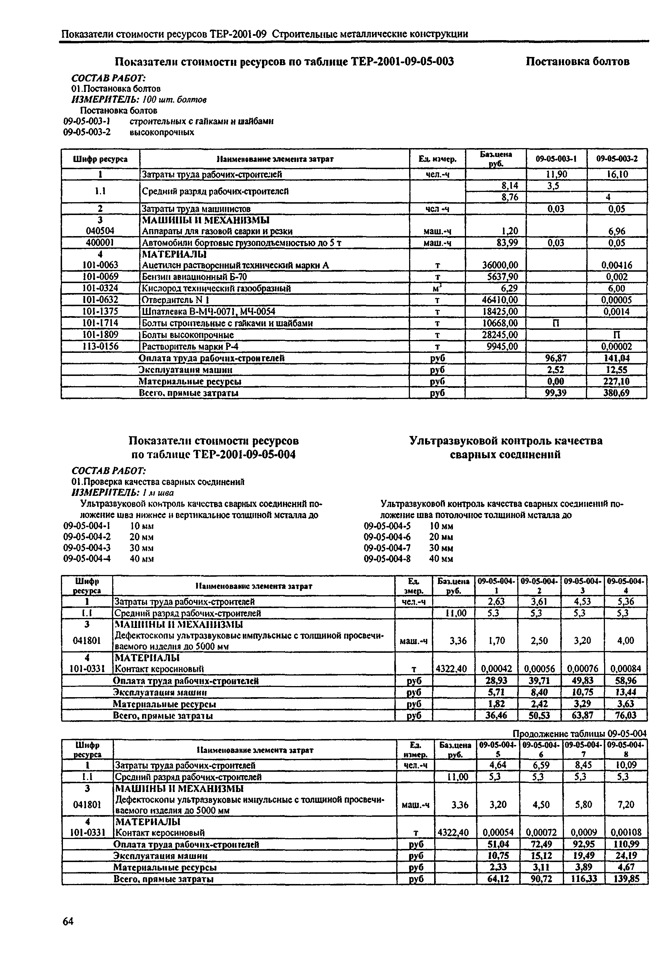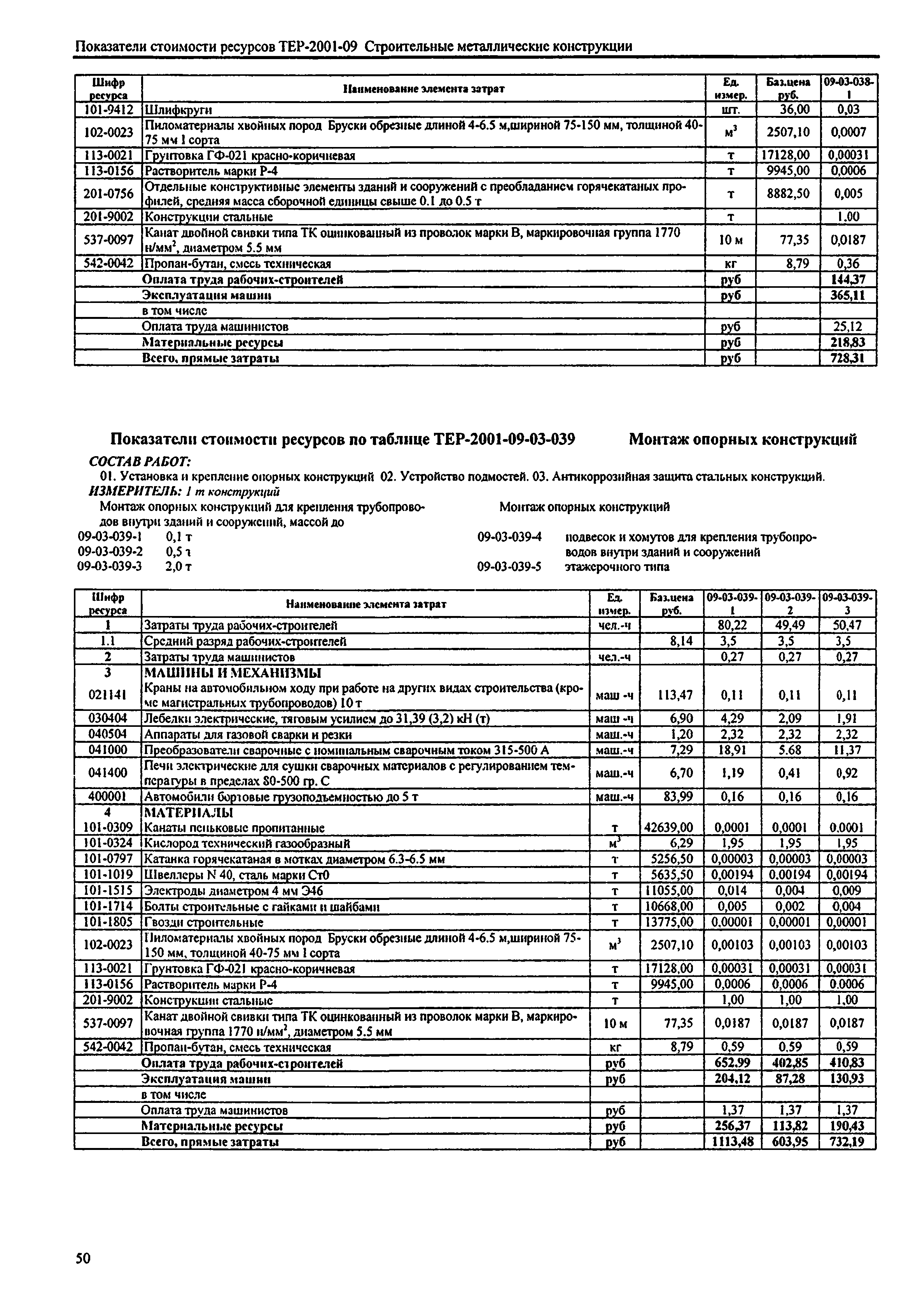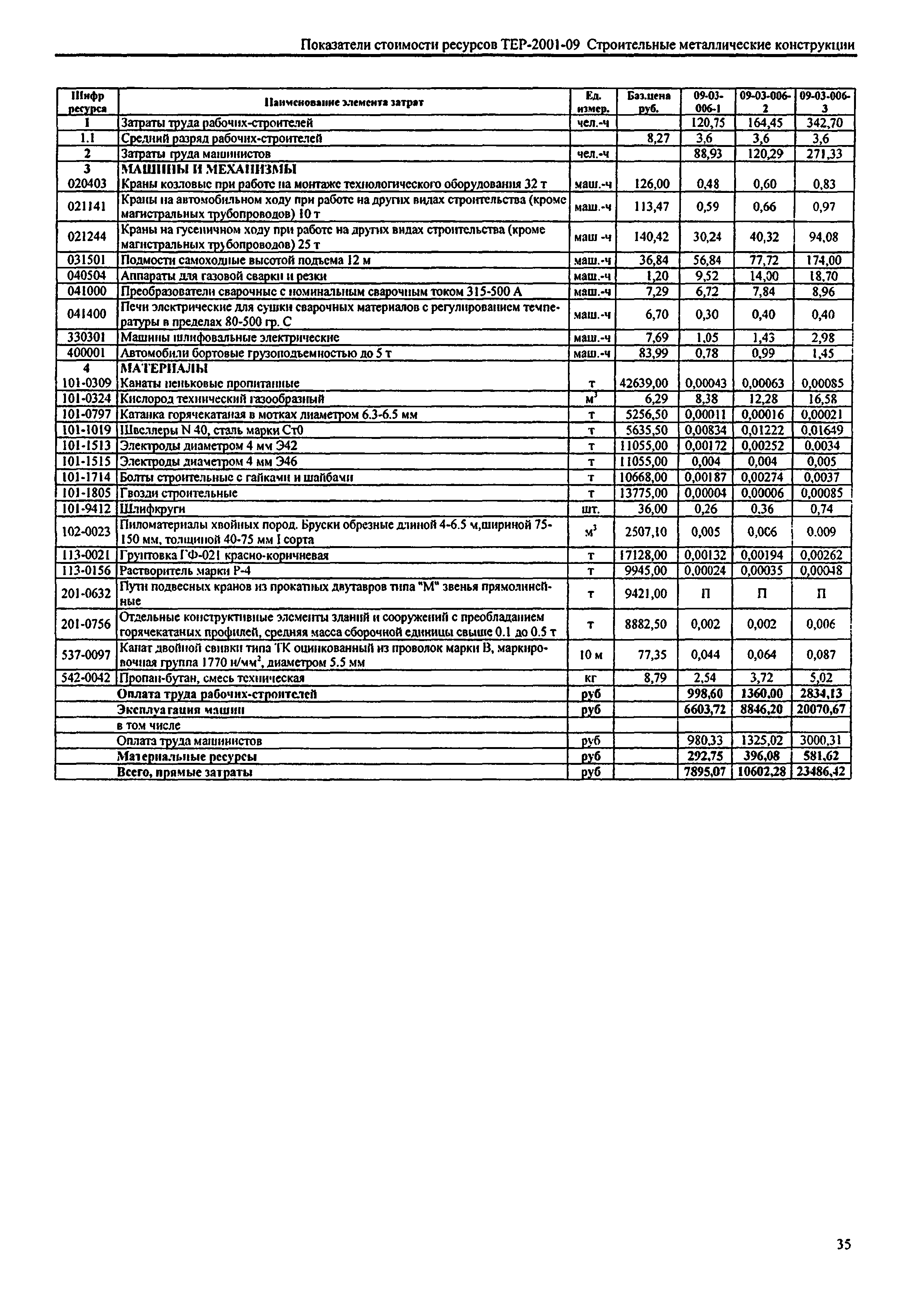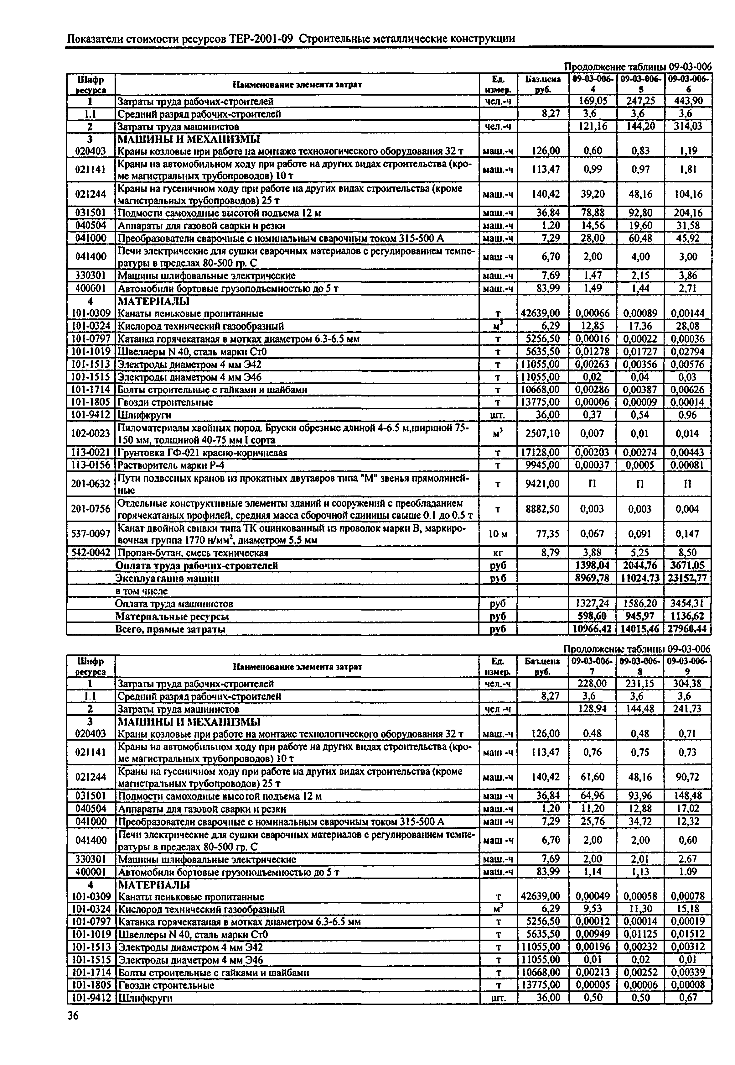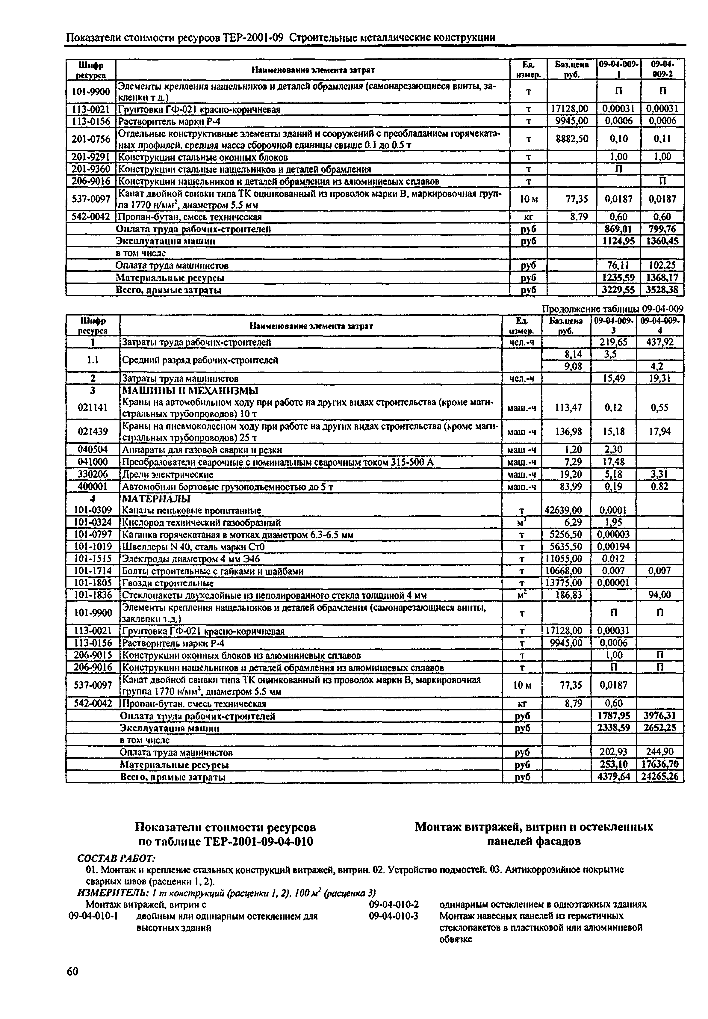 | Оглавление: | Техническая часть 1. Общие указания 2. Затраты на оплату труда 3. Затраты на эксплуатацию машин и механизмов 4. Затраты на материалы, изделия и конструкции Раздел 01. Здания и каркасы зданий 1. Каркасы одноэтажных и многоэтажных производственных зданий 09-01-001 Монтаж каркасов одноэтажных производственных зданий одно- и многопролетных без фонарей 2. Каркасы издания специального назначения 09-01-005 Монтаж каркасов зданий 09-01-006 Монтаж каркасов зданий Раздел 02. Сооружения 1. Бункеры, силосы, декомпозеры, сгустители 09-02-001 Монтаж бункеров и силосов 09-02-002 Защита листовой сталью бункеров 09-02-003 Монтаж корпусов и опорных конструкций декомпозеров и сгустителей 2. Резервуары, газгольдеры 09-02-009 Монтаж резервуаров стальных вертикальных цилиндрических для нефти и нефтепродуктов 09-02-010 Монтаж резервуаров сферических 09-02-011 Монтаж изотермических резервуаров 09-02-012 Монтаж мокрых стальных газгольдеров низкого давления с вертикальными направляющими 3. Галереи, эстакады 09-02-018 Монтаж пролетных строений галерей с опорами 09-02-019 Монтаж унифицированных эстакад пролетом до 18 м 4. Шахтные сооружения 09-02-023 Монтаж каркасов постоянных шахтных копров 5. Сооружения комплексов заводов по производству минеральных удобрения 09-02-027 Монтаж каркасов складов карбамида пролетом до 60 м 09-02-028 Монтаж ограждающих конструкций складов карбамида из профилированных алюминиевых листов Раздел 03. Конструктивные элементы зданий и сооружений 1. Опорные плиты, колонны, подкрановые балки, подкрановые подстропильные фермы, подкрановые и подвесные пути 09-03-001 Монтаж опорных плит с обработанной поверхностью 09-03-002 Монтаж колонн одноэтажных и многоэтажных зданий и крановых эстакад 09-03-003 Монтаж подкрановых балок 09-03-004 Монтаж подкраново-подстропильных ферм пролетом более 30 м при поставке россыпью 09-03-005 Монтаж подкрановых путей 09-03-006 Монтаж подвесных путей и монорельсов для тельферов на высоте до 25 м 2. Конструктивные элементы покрытий здания 09-03-012 Монтаж стропильных и подстропильных ферм, опорных стоек 09-03-013 Монтаж вертикальных связей в виде ферм 09-03-014 Монтаж связей и распорок из одиночных и парных уголков, гнутосварных профилей 09-03-015 Монтаж прогонов при шаге ферм до 12 м 3. Конструктивные элементы фонарей 09-03-021 Монтаж каркасов фонарей 09-03-022 Монтаж оконных фонарных панелей и покрытий 09-03-023 Монтаж зенитных панельных двухскатных глухих фонарей 4. Конструктивные элементы лестниц и площадок 09-03-029 Монтаж лестниц прямолинейных и криволинейных, пожарных с ограждением 09-03-030 Монтаж площадок с настилом и ограждением из листовой, рифленой, просечной и круглой стали 09-03-031 Монтаж щитов и блоков встроенных площадок с настилом из листовой стали, ребрами жесткости, составного сечения 5. Рамы, арки, опорные конструкции и защитные ограждения 09-03-037 Монтаж рам коробчатого сечения пролетом до 24 м 09-03-038 Монтаж арок полигонального и криволинейного очертания из листовой стали и проката 09-03-039 Монтаж опорных конструкций 09-03-040 Монтаж защитных ограждений оборудования 6. Перегородки, потолки, полы, плинтусы 09-03-046 Монтаж перегородок 09-03-047 Монтаж каркасов подвесных потолков с подвесками и деталями крепления 09-03-048 Монтаж потолков 09-03-049 Монтаж съемных металлических полов из плит размером 500x500 мм 09-03-050 Монтаж стальных плинтусов из гнутого профиля Раздел 04. Ограждающие конструкции зданий и сооружений 1. О