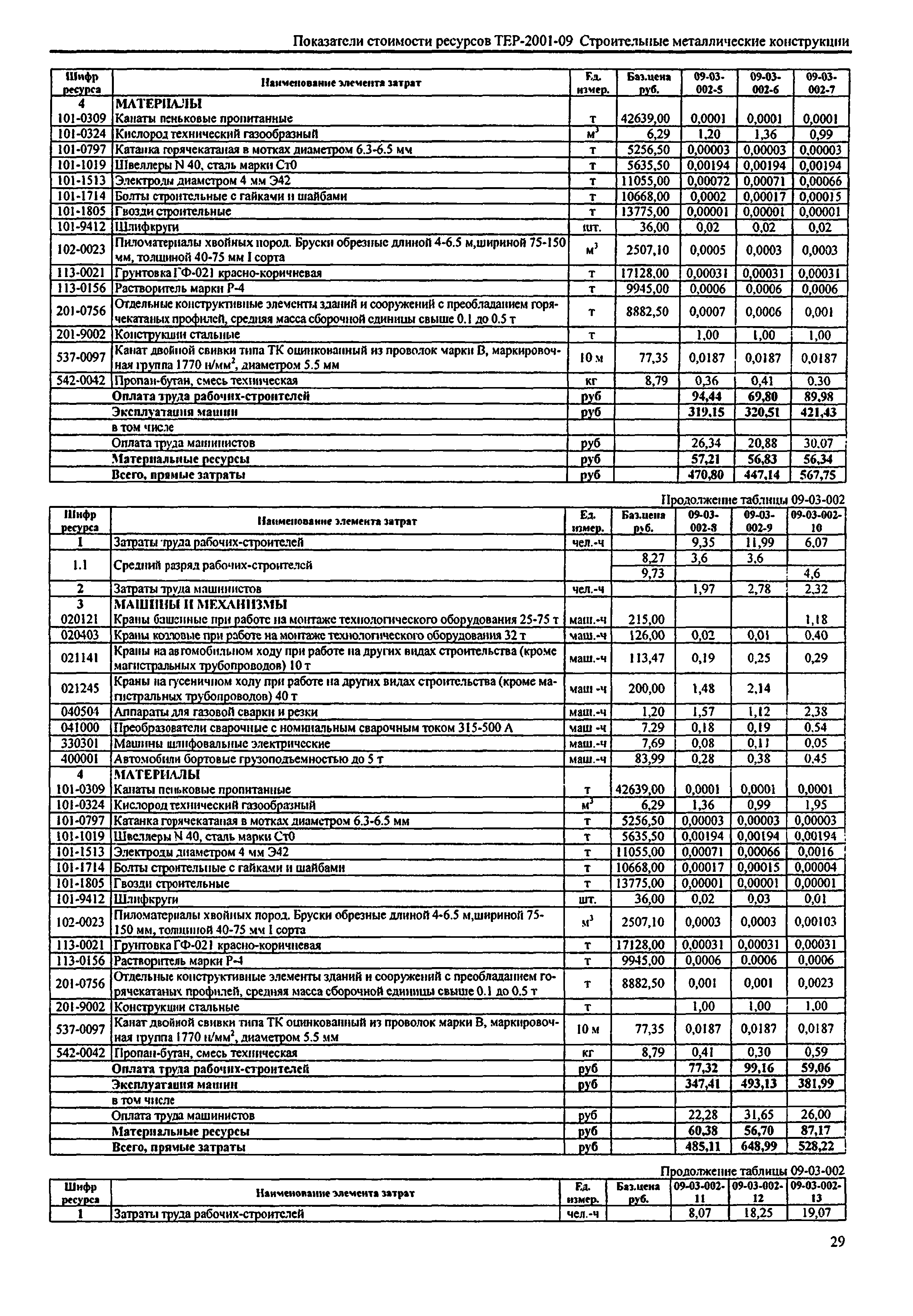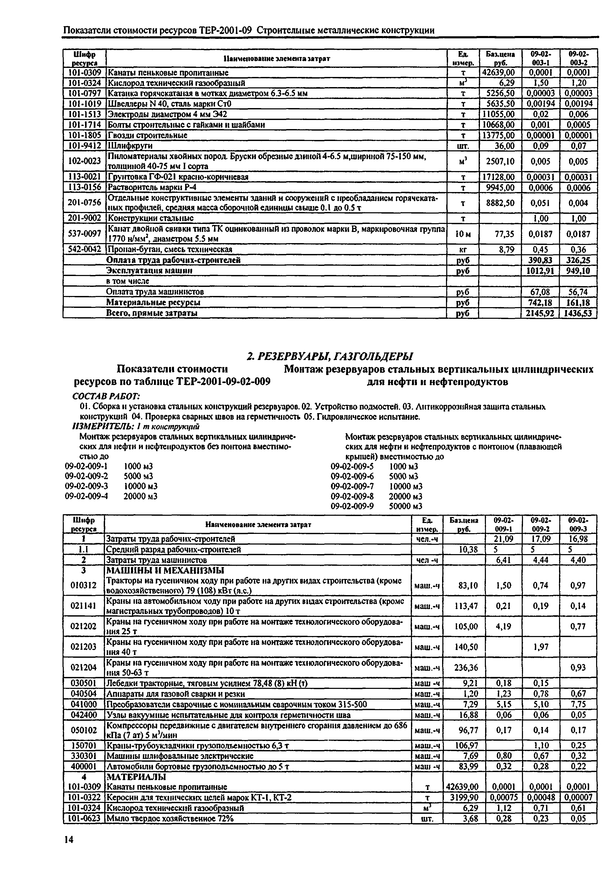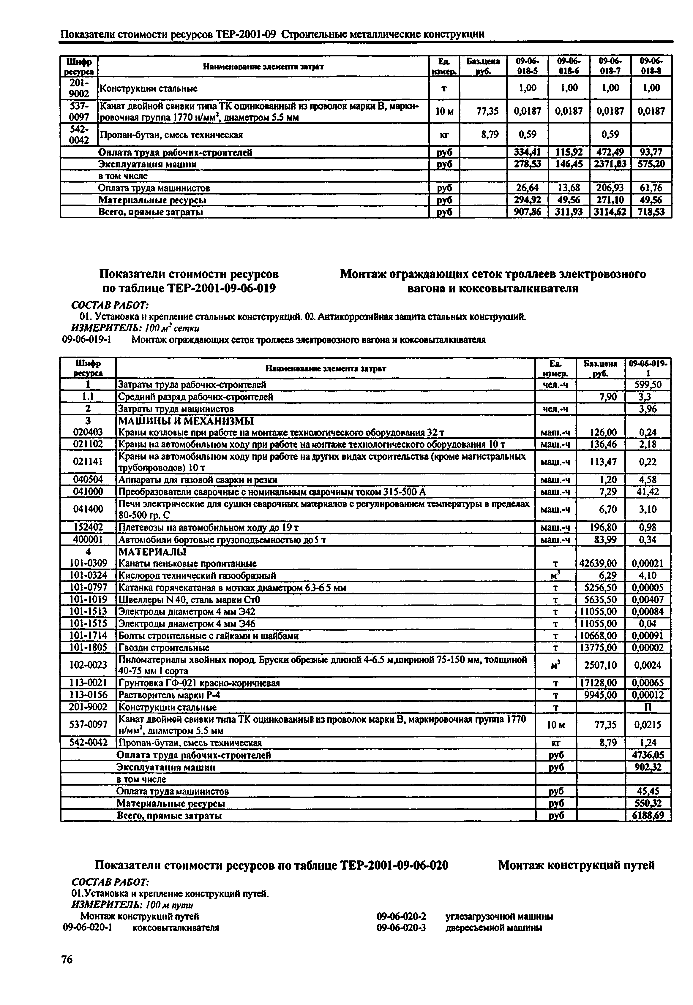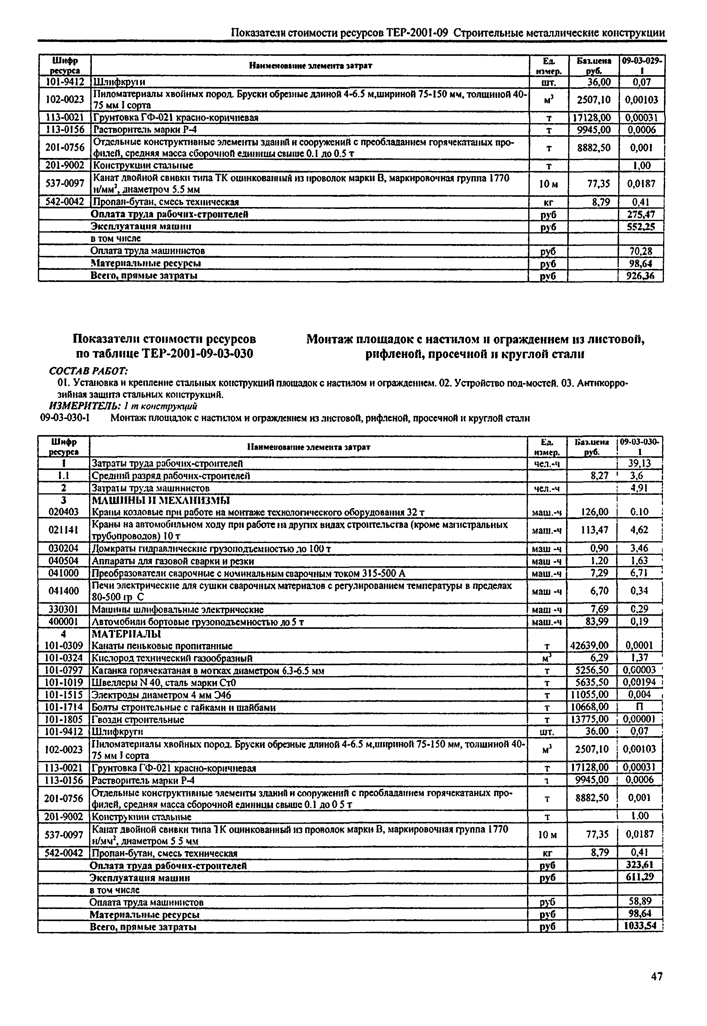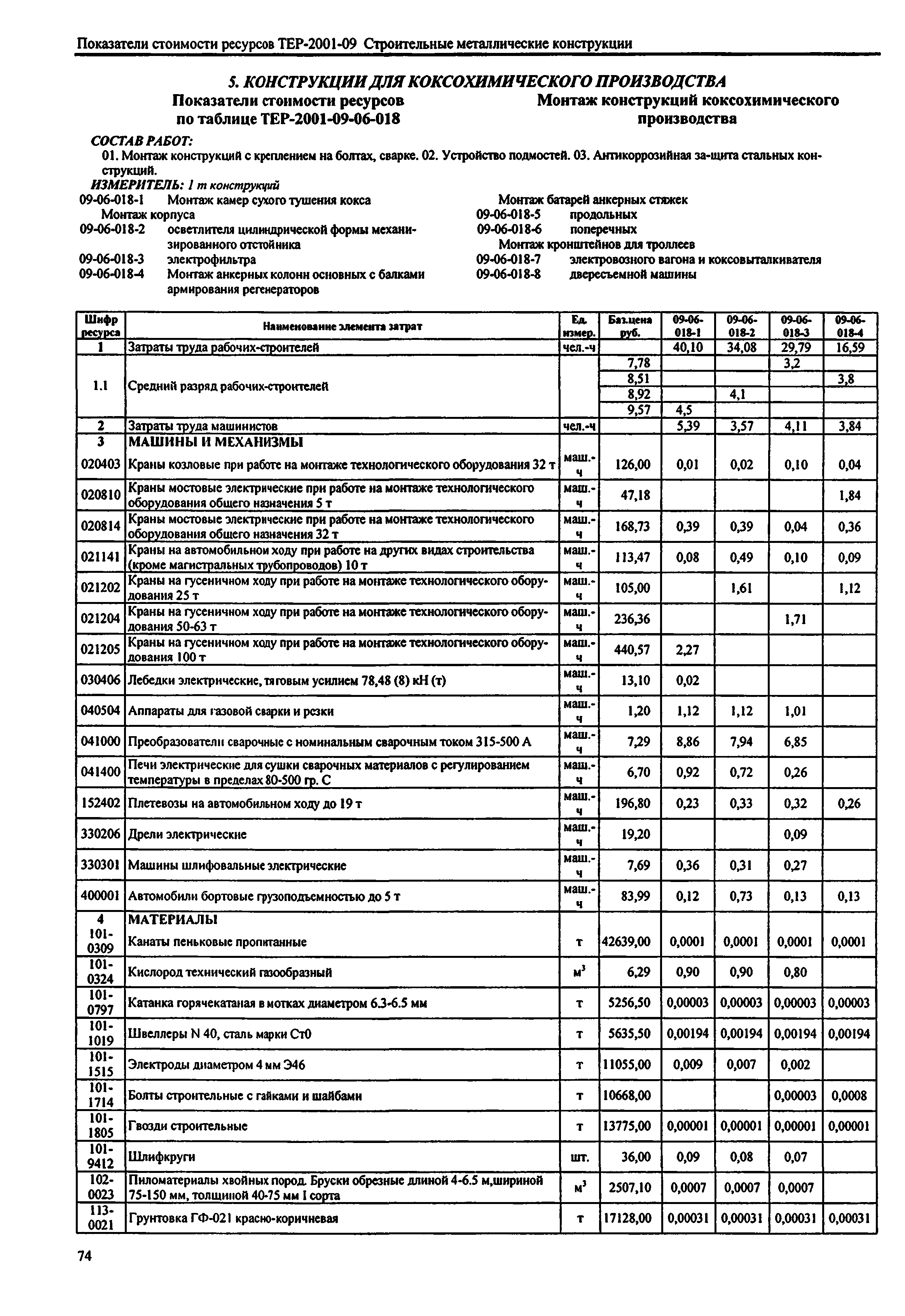 | Оглавление: | Техническая часть 1. Общие указания 2. Затраты на оплату труда 3. Затраты на эксплуатацию машин и механизмов 4. Затраты на материалы, изделия и конструкции Раздел 01. Здания и каркасы зданий 1. Каркасы одноэтажных и многоэтажных производственных зданий 09-01-001 Монтаж каркасов одноэтажных производственных зданий одно- и многопролетных без фонарей 2. Каркасы издания специального назначения 09-01-005 Монтаж каркасов зданий 09-01-006 Монтаж каркасов зданий Раздел 02. Сооружения 1. Бункеры, силосы, декомпозеры, сгустители 09-02-001 Монтаж бункеров и силосов 09-02-002 Защита листовой сталью бункеров 09-02-003 Монтаж корпусов и опорных конструкций декомпозеров и сгустителей 2. Резервуары, газгольдеры 09-02-009 Монтаж резервуаров стальных вертикальных цилиндрических для нефти и нефтепродуктов 09-02-010 Монтаж резервуаров сферических 09-02-011 Монтаж изотермических резервуаров 09-02-012 Монтаж мокрых стальных газгольдеров низкого давления с вертикальными направляющими 3. Галереи, эстакады 09-02-018 Монтаж пролетных строений галерей с опорами 09-02-019 Монтаж унифицированных эстакад пролетом до 18 м 4. Шахтные сооружения 09-02-023 Монтаж каркасов постоянных шахтных копров 5. Сооружения комплексов заводов по производству минеральных удобрения 09-02-027 Монтаж каркасов складов карбамида пролетом до 60 м 09-02-028 Монтаж ограждающих конструкций складов карбамида из профилированных алюминиевых листов Раздел 03. Конструктивные элементы зданий и сооружений 1. Опорные плиты, колонны, подкрановые балки, подкрановые подстропильные фермы, подкрановые и подвесные пути 09-03-001 Монтаж опорных плит с обработанной поверхностью 09-03-002 Монтаж колонн одноэтажных и многоэтажных зданий и крановых эстакад 09-03-003 Монтаж подкрановых балок 09-03-004 Монтаж подкраново-подстропильных ферм пролетом более 30 м при поставке россыпью 09-03-005 Монтаж подкрановых путей 09-03-006 Монтаж подвесных путей и монорельсов для тельферов на высоте до 25 м 2. Конструктивные элементы покрытий здания 09-03-012 Монтаж стропильных и подстропильных ферм, опорных стоек 09-03-013 Монтаж вертикальных связей в виде ферм 09-03-014 Монтаж связей и распорок из одиночных и парных уголков, гнутосварных профилей 09-03-015 Монтаж прогонов при шаге ферм до 12 м 3. Конструктивные элементы фонарей 09-03-021 Монтаж каркасов фонарей 09-03-022 Монтаж оконных фонарных панелей и покрытий 09-03-023 Монтаж зенитных панельных двухскатных глухих фонарей 4. Конструктивные элементы лестниц и площадок 09-03-029 Монтаж лестниц прямолинейных и криволинейных, пожарных с ограждением 09-03-030 Монтаж площадок с настилом и ограждением из листовой, рифленой, просечной и круглой стали 09-03-031 Монтаж щитов и блоков встроенных площадок с настилом из листовой стали, ребрами жесткости, составного сечения 5. Рамы, арки, опорные конструкции и защитные ограждения 09-03-037 Монтаж рам коробчатого сечения пролетом до 24 м 09-03-038 Монтаж арок полигонального и криволинейного очертания из листовой стали и проката 09-03-039 Монтаж опорных конструкций 09-03-040 Монтаж защитных ограждений оборудования 6. Перегородки, потолки, полы, плинтусы 09-03-046 Монтаж перегородок 09-03-047 Монтаж каркасов подвесных потолков с подвесками и деталями крепления 09-03-048 Монтаж потолков 09-03-049 Монтаж съемных металлических полов из плит размером 500x500 мм 09-03-050 Монтаж стальных плинтусов из гнутого профиля Раздел 04. Ограждающие конструкции зданий и сооружений 1. О
