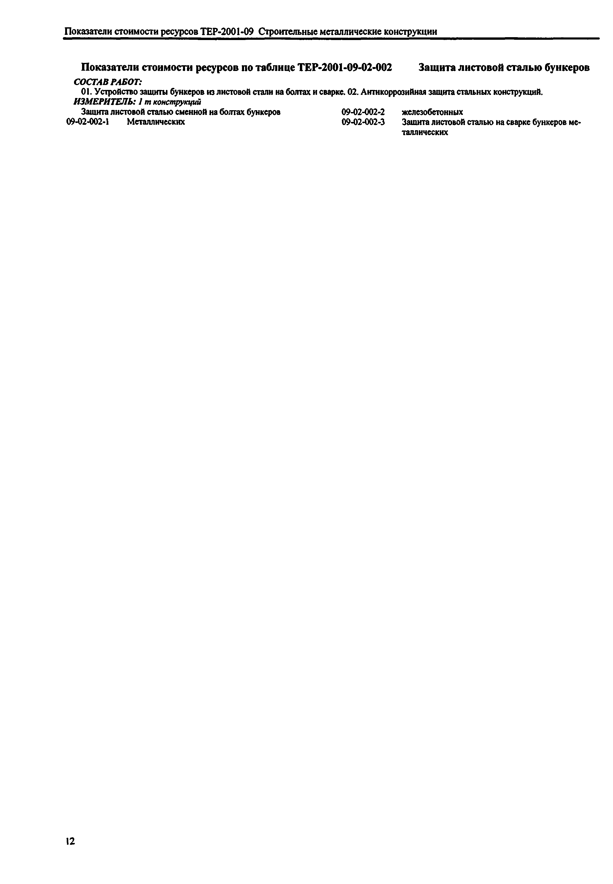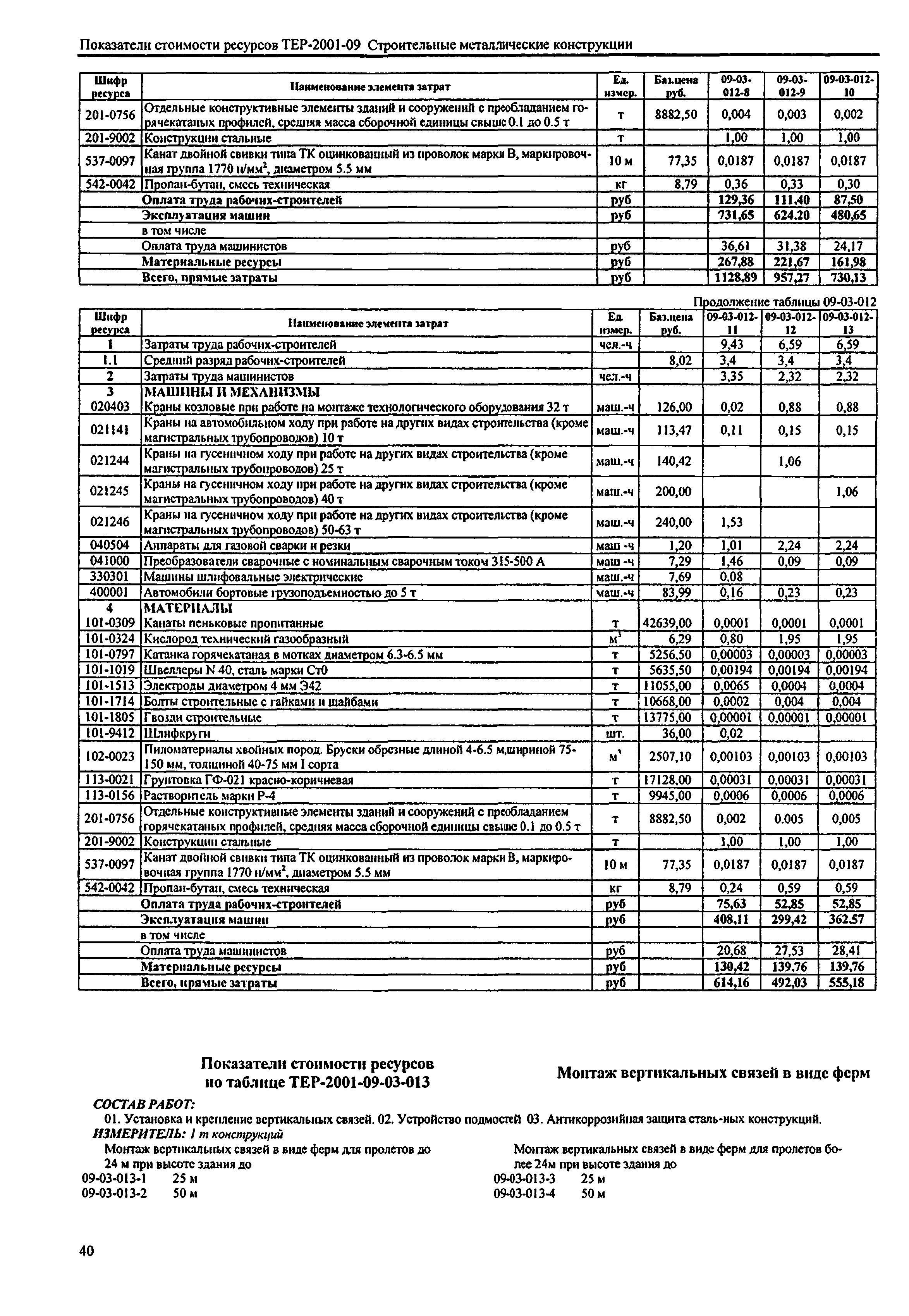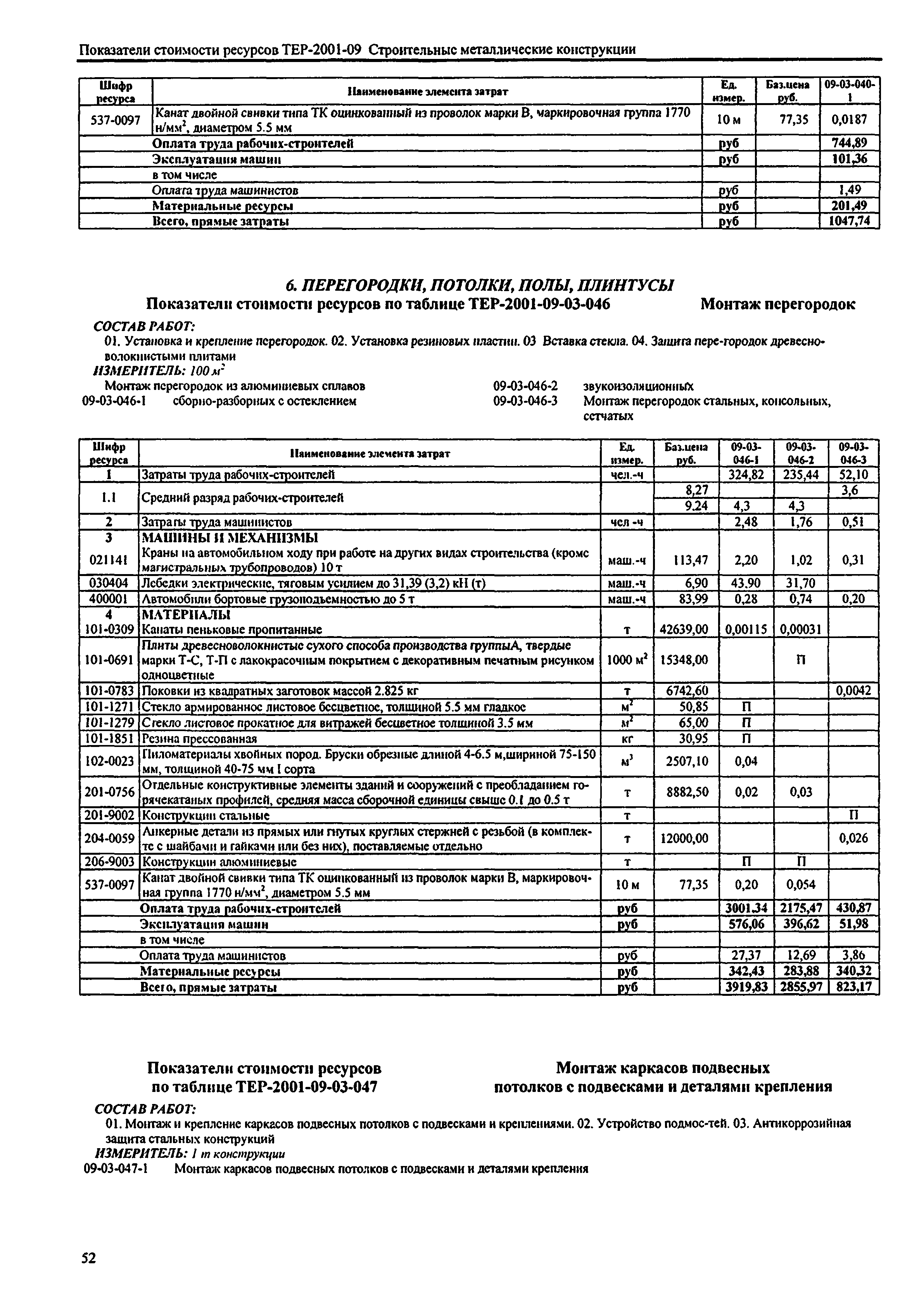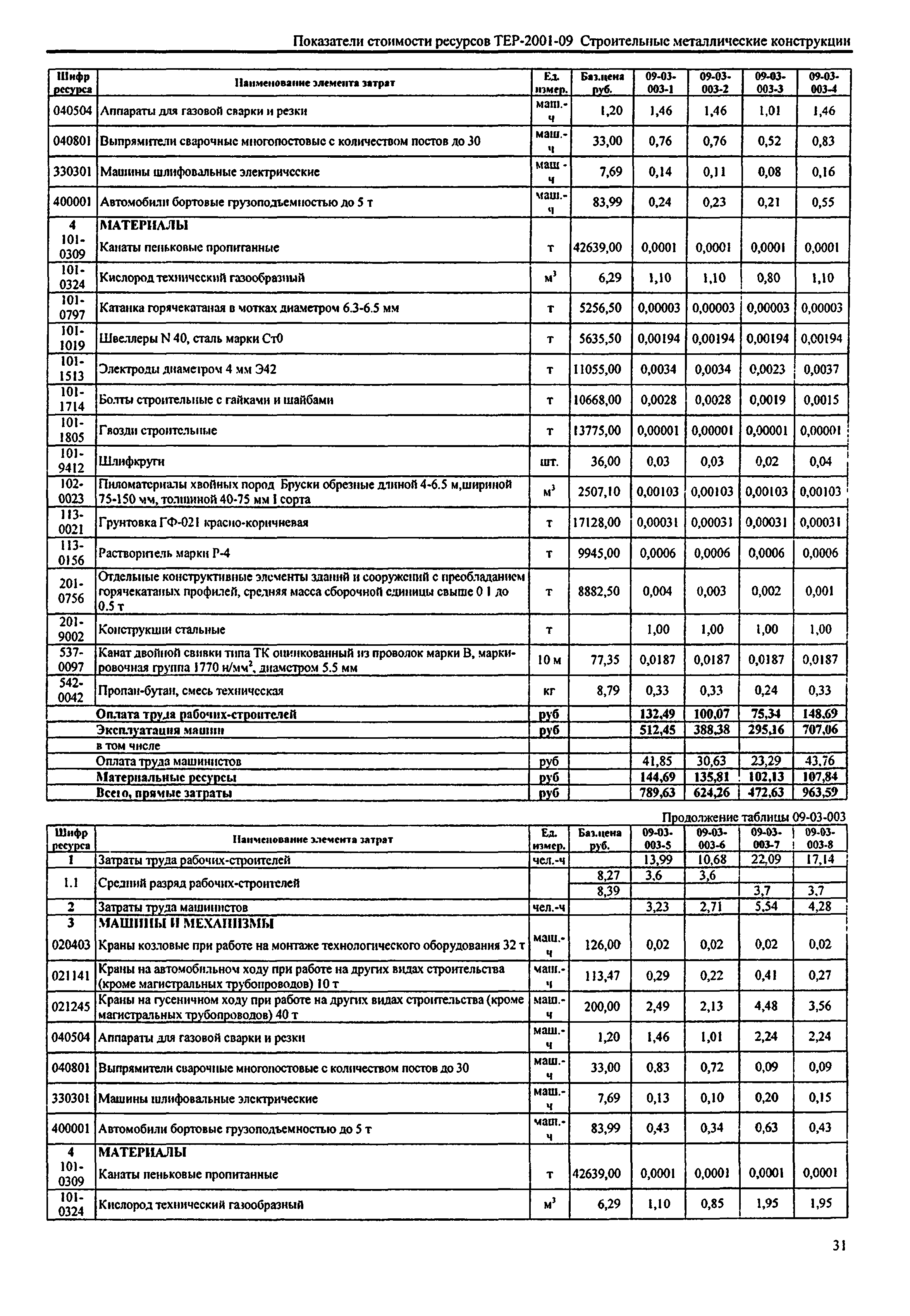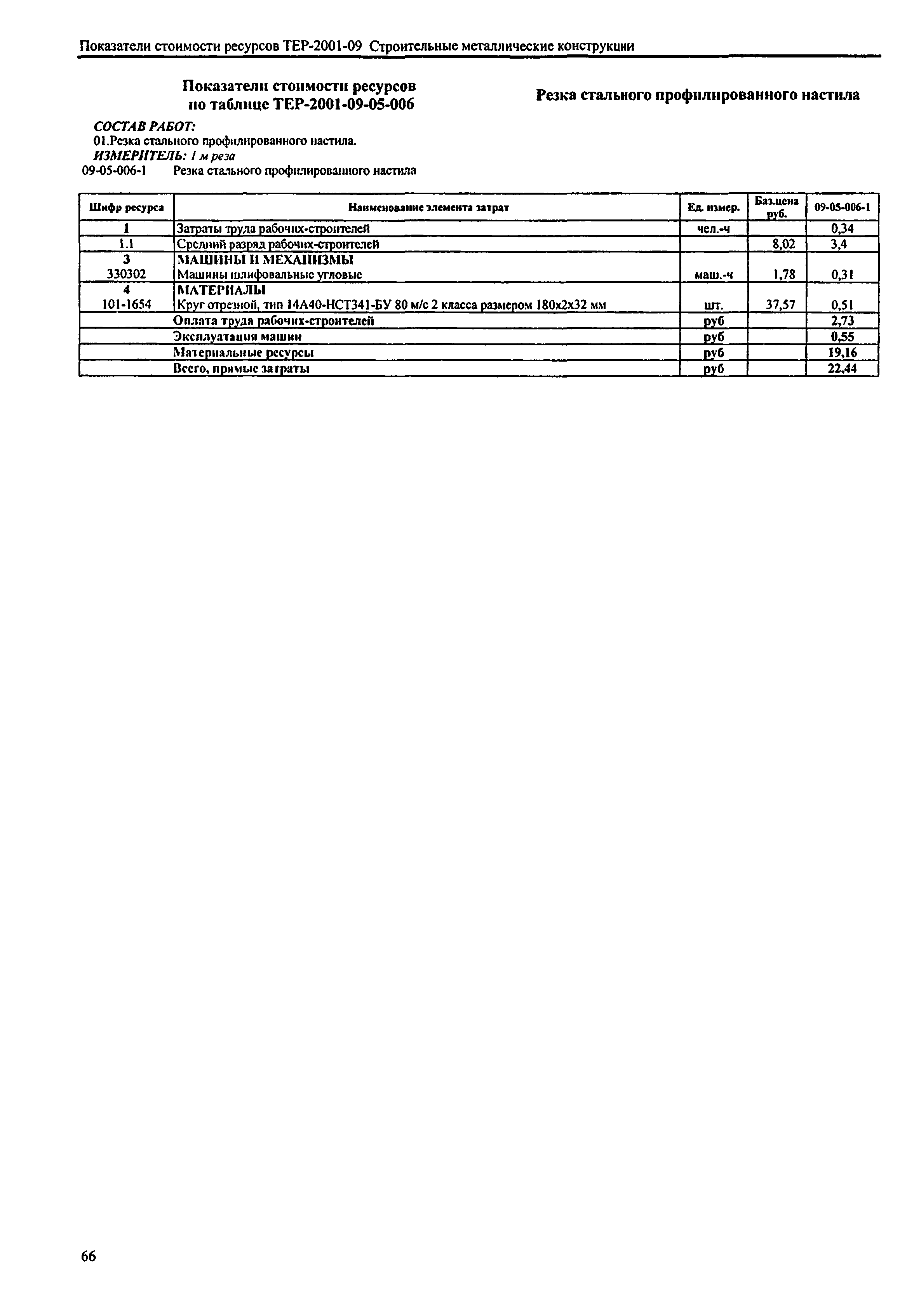 | Оглавление: | Техническая часть 1. Общие указания 2. Затраты на оплату труда 3. Затраты на эксплуатацию машин и механизмов 4. Затраты на материалы, изделия и конструкции Раздел 01. Здания и каркасы зданий 1. Каркасы одноэтажных и многоэтажных производственных зданий 09-01-001 Монтаж каркасов одноэтажных производственных зданий одно- и многопролетных без фонарей 2. Каркасы издания специального назначения 09-01-005 Монтаж каркасов зданий 09-01-006 Монтаж каркасов зданий Раздел 02. Сооружения 1. Бункеры, силосы, декомпозеры, сгустители 09-02-001 Монтаж бункеров и силосов 09-02-002 Защита листовой сталью бункеров 09-02-003 Монтаж корпусов и опорных конструкций декомпозеров и сгустителей 2. Резервуары, газгольдеры 09-02-009 Монтаж резервуаров стальных вертикальных цилиндрических для нефти и нефтепродуктов 09-02-010 Монтаж резервуаров сферических 09-02-011 Монтаж изотермических резервуаров 09-02-012 Монтаж мокрых стальных газгольдеров низкого давления с вертикальными направляющими 3. Галереи, эстакады 09-02-018 Монтаж пролетных строений галерей с опорами 09-02-019 Монтаж унифицированных эстакад пролетом до 18 м 4. Шахтные сооружения 09-02-023 Монтаж каркасов постоянных шахтных копров 5. Сооружения комплексов заводов по производству минеральных удобрения 09-02-027 Монтаж каркасов складов карбамида пролетом до 60 м 09-02-028 Монтаж ограждающих конструкций складов карбамида из профилированных алюминиевых листов Раздел 03. Конструктивные элементы зданий и сооружений 1. Опорные плиты, колонны, подкрановые балки, подкрановые подстропильные фермы, подкрановые и подвесные пути 09-03-001 Монтаж опорных плит с обработанной поверхностью 09-03-002 Монтаж колонн одноэтажных и многоэтажных зданий и крановых эстакад 09-03-003 Монтаж подкрановых балок 09-03-004 Монтаж подкраново-подстропильных ферм пролетом более 30 м при поставке россыпью 09-03-005 Монтаж подкрановых путей 09-03-006 Монтаж подвесных путей и монорельсов для тельферов на высоте до 25 м 2. Конструктивные элементы покрытий здания 09-03-012 Монтаж стропильных и подстропильных ферм, опорных стоек 09-03-013 Монтаж вертикальных связей в виде ферм 09-03-014 Монтаж связей и распорок из одиночных и парных уголков, гнутосварных профилей 09-03-015 Монтаж прогонов при шаге ферм до 12 м 3. Конструктивные элементы фонарей 09-03-021 Монтаж каркасов фонарей 09-03-022 Монтаж оконных фонарных панелей и покрытий 09-03-023 Монтаж зенитных панельных двухскатных глухих фонарей 4. Конструктивные элементы лестниц и площадок 09-03-029 Монтаж лестниц прямолинейных и криволинейных, пожарных с ограждением 09-03-030 Монтаж площадок с настилом и ограждением из листовой, рифленой, просечной и круглой стали 09-03-031 Монтаж щитов и блоков встроенных площадок с настилом из листовой стали, ребрами жесткости, составного сечения 5. Рамы, арки, опорные конструкции и защитные ограждения 09-03-037 Монтаж рам коробчатого сечения пролетом до 24 м 09-03-038 Монтаж арок полигонального и криволинейного очертания из листовой стали и проката 09-03-039 Монтаж опорных конструкций 09-03-040 Монтаж защитных ограждений оборудования 6. Перегородки, потолки, полы, плинтусы 09-03-046 Монтаж перегородок 09-03-047 Монтаж каркасов подвесных потолков с подвесками и деталями крепления 09-03-048 Монтаж потолков 09-03-049 Монтаж съемных металлических полов из плит размером 500x500 мм 09-03-050 Монтаж стальных плинтусов из гнутого профиля Раздел 04. Ограждающие конструкции зданий и сооружений 1. О