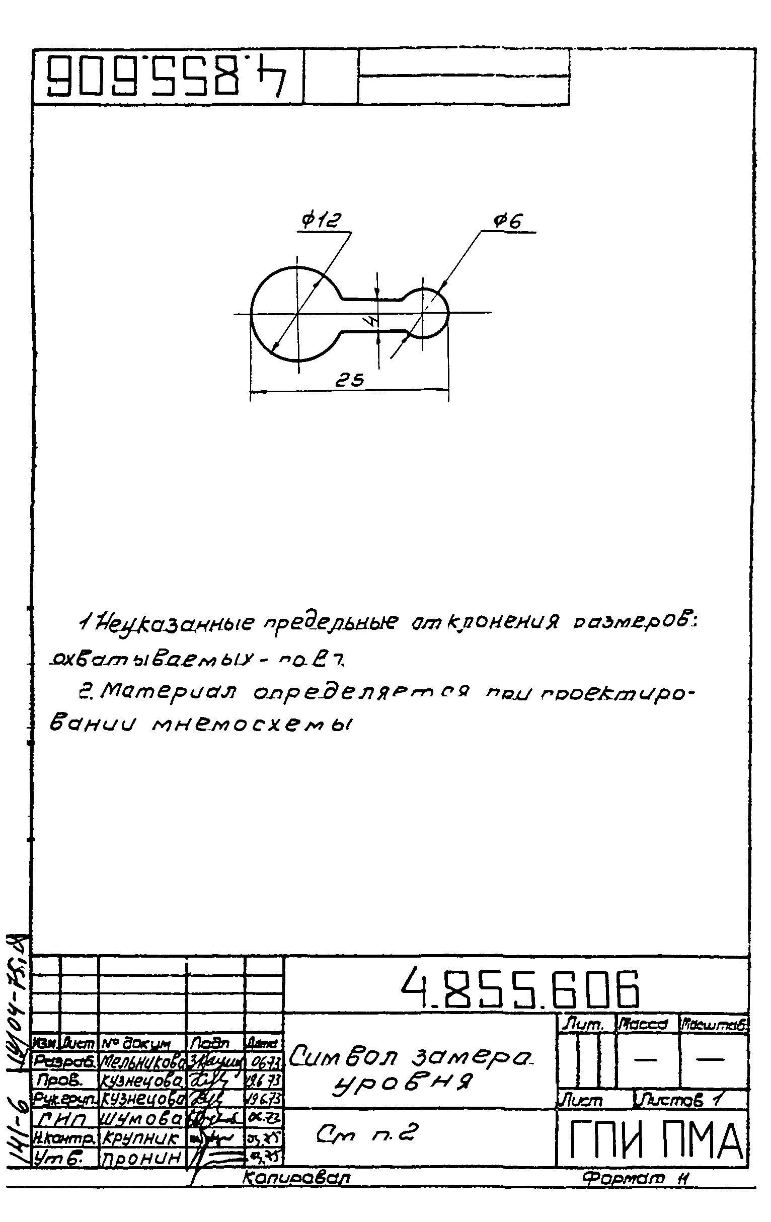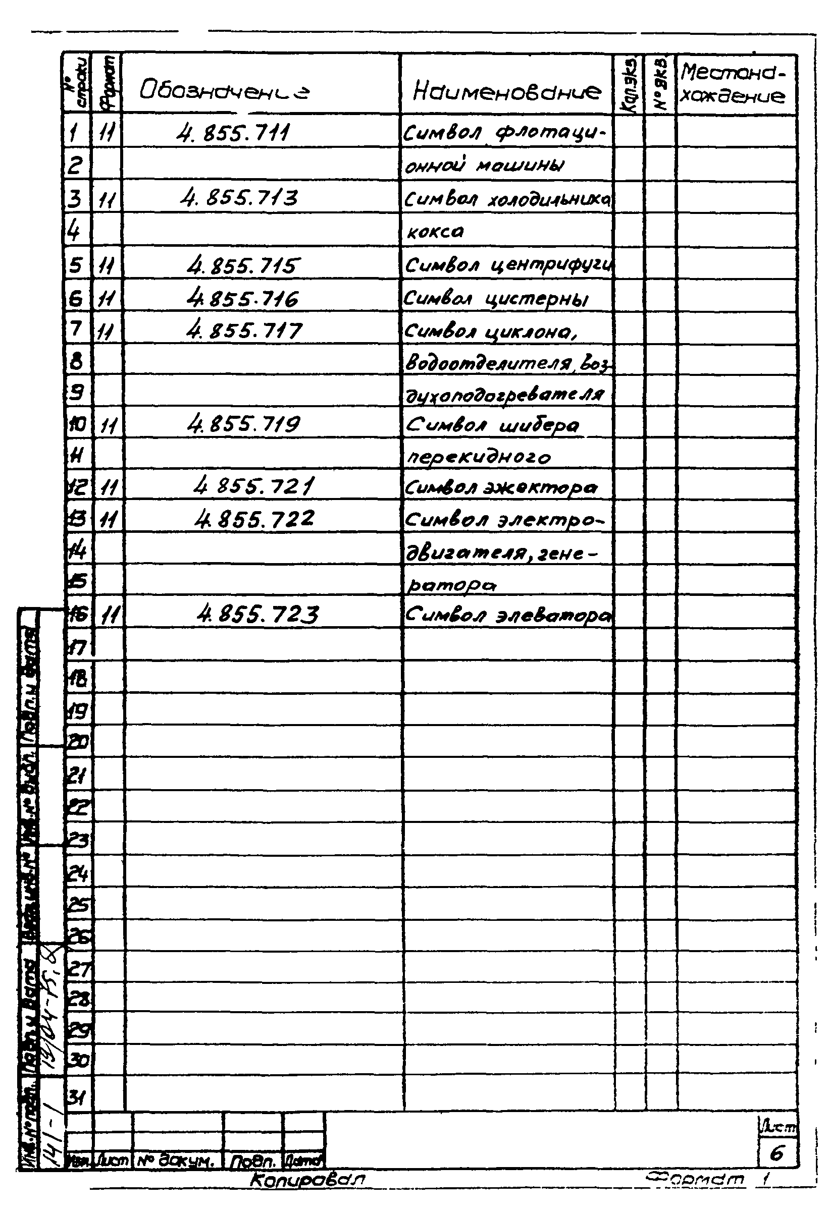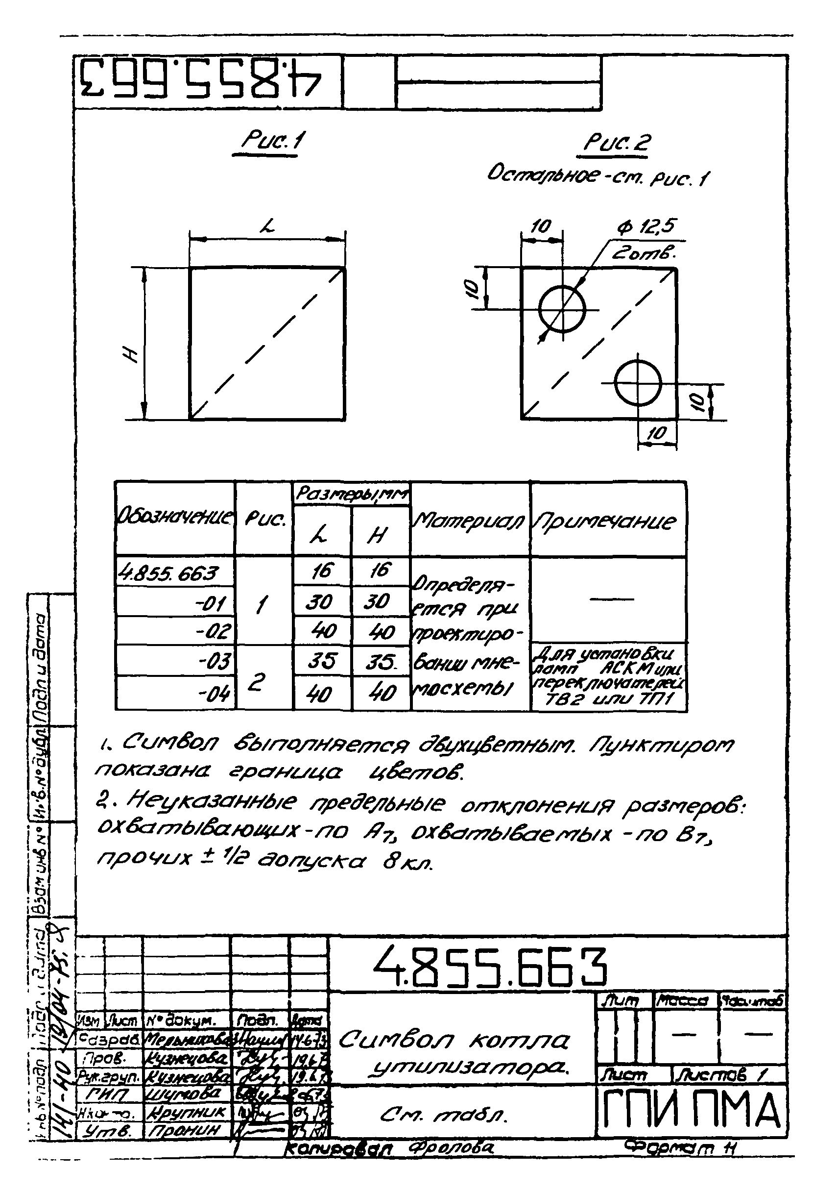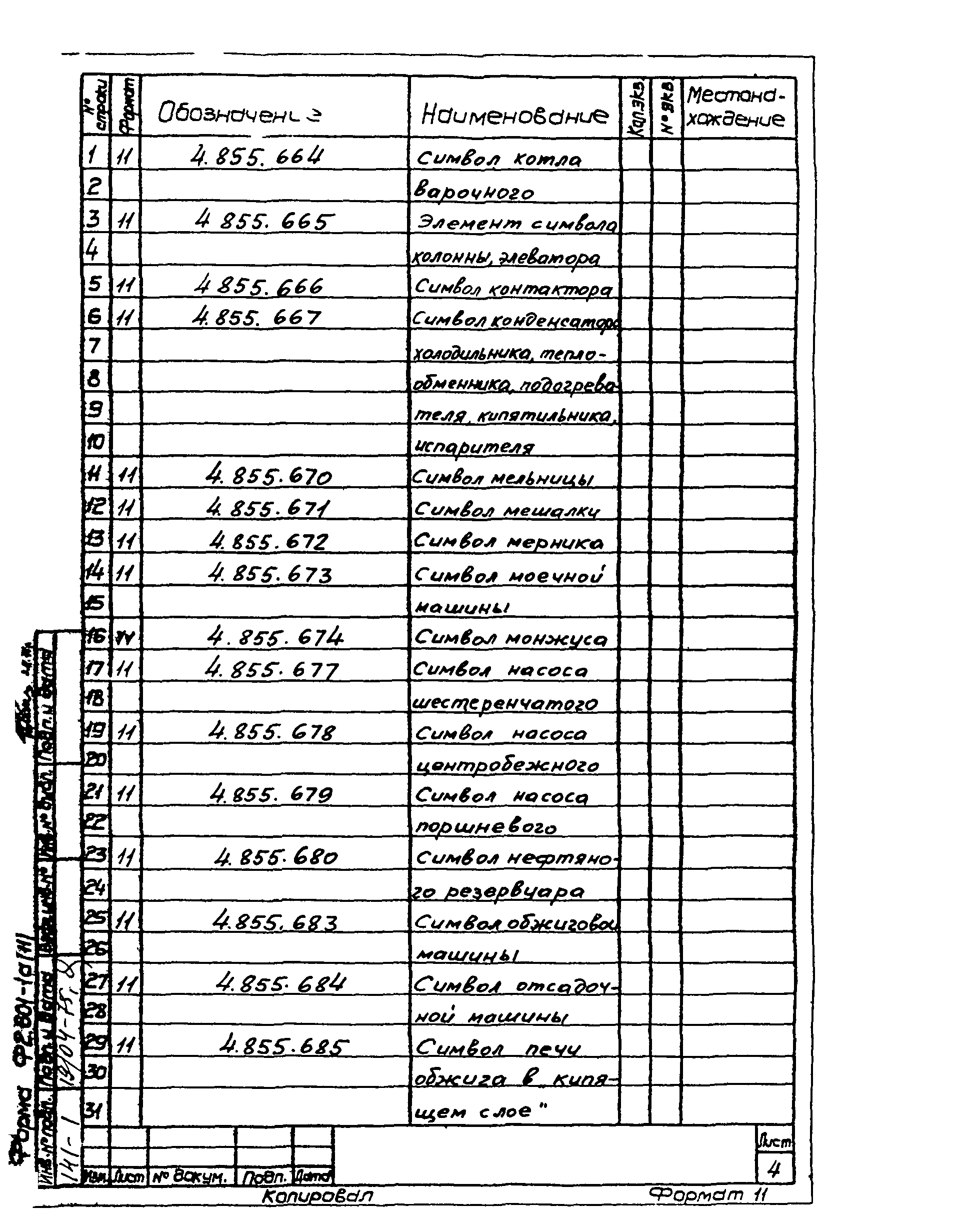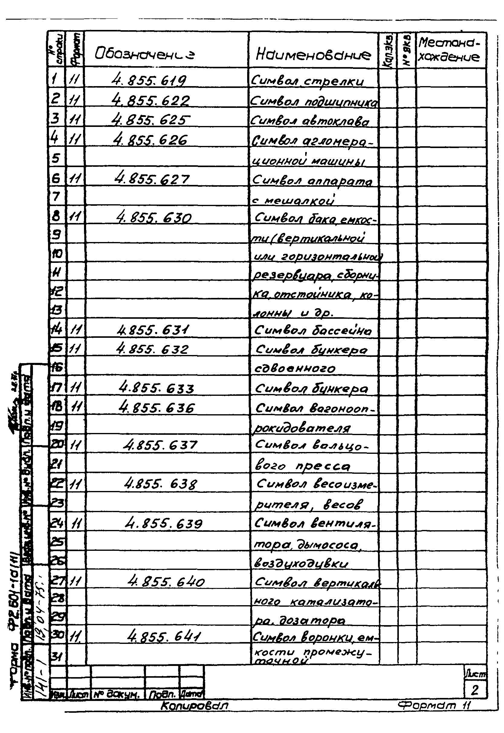 Символы элементов мнемосхем щитов и пультов управления. Рабочая документация| Статус: | действует | | Название рус.: | Символы элементов мнемосхем щитов и пультов управления. Рабочая документация | | Дата добавления в базу: | 01.09.2013 | | Дата актуализации: | 01.01.2021 | | Оглавление: | 4.855.600 Символ вентиля углового 4.855.601 Символ вентиля, прямого клапана, задвижки 4.855.602 Символ вентиля трехходового, клапана 4.855.605 Символ замера температуры 4.855.606 Символ замера уровня 4.855.607 Символ затвора поворотного, шибера, заслонки 4.855.610 Символ отбора давления 4.855.611 Символ отбора пробы 4.855.614 Символ поворота 4.855.615 Символ потока, трубопровода, транспортера, шнека 4.855.618 Символ сужающего устройства 4.855.619 Символ стрелки 4.855.622 Символ подшипника 4.855.625 Символ автоклава 4.855.626 Символ агломерационной машины 4.855.627 Символ аппарата с мешалкой 4.855.630 Символ бака емкости (вертикальной или горизонтальной) резервуара, сборника, отстойника, колонны и др. 4.855.631 Символ бассейна 4.855.632 Символ бункера сдвоенного 4.855.633 Символ бункера 4.855.636 Символ вагоноопрокидователя 4.855.637 Символ вальцового пресса 4.855.638 Символ весоизмерителя, весов 4.855.639 Символ вентилятора, дымососа, воздуходувки 4.855.640 Символ вертикального катализатора, дозатора 4.855.641 Символ воронки, емкости промежуточной 4.855.644 Символ гаража размораживания (элемент 4.855.645 Символ газгольдера мокрого, башни окислительной, эвапоратора 4.855.646 Символ газгольдера, ресивера, баллона, резервуара воздушного 4.855.647 Символ глинорезательной машины 4.855.648 Символ гранулятора 4.855.649 Символ градирни 4.855.650 Символ грохота 4.855.653 Символ деаэратора 4.855.654 Символ дробилки 4.855.657 Символ емкости шаровой 4.855.659 Символ железнодорожного вагона, вагонетки 4.855.661 Символ компрессора 4.855.662 Символ конвейерного сушила 4.855.663 Символ котла утилизатора 4.855.664 Символ котла варочного 4.855.665 Элемент символа колонны, элеватора 4.855.666 Символ контактора 4.855.667 Символ конденсатора холодильника, теплообменника, подогревателя, кипятильника, испарителя 4.855.670 Символ мельницы 4.855.671 Символ мешалки 4.855.672 Символ мерника 4.855.673 Символ моечной машины 4.855.674 Символ монжуса 4.855.677 Символ насоса шестеренчатого 4.855.678 Символ насоса центробежного 4.855.679 Символ насоса поршневого 4.855.680 Символ нефтяного резервуара 4.855.683 Символ обжиговой машины 4.855.684 Символ отсадочной машины 4.855.685 Символ печи обжига в кипящем слое 4.855.686 Символ печи 4.855.687 Символ перколятора 4.855.688 Символ питателя 4.855.689 Символ плавильника 4.855.690 Символ пресса 4.855.693 Символ реактора 4.855.694 Символ регенератора катализатора 4.855.695 Символ рекуператора 4.855.696 Символ ротаметра 4.855.699 Символ сгустителя, вакуумфильтр 4.855.700 Символ сепаратора 4.855.701 Символ скребкового кристаллизатора 4.855.702 Символ скруббера 4.855.703 Символ склада 4.855.704 Символ смесителя, скомкователя, сортировки 4.855.705 Символ сушила барабанного 4.855.706 Символ топки под давлением 4.855.707 Символ турбины 4.855.709 Символ фильтра 4.855.711 Символ флотационной машины 4.855.713 Символ холодильника кокса 4.855.715 Символ центрифуги 4.855.716 Символ цистерны 4.855.717 Символ циклона, водоотделителя, воздухоподогревателя 4.855.719 Символ шибера перекидного 4.855.721 Символ эжектора 4.855.722 Символ электродвигателя, генератора 4.855.723 Символ элеватора | | Разработан: | ГПКИ Проектмонтажавтоматика