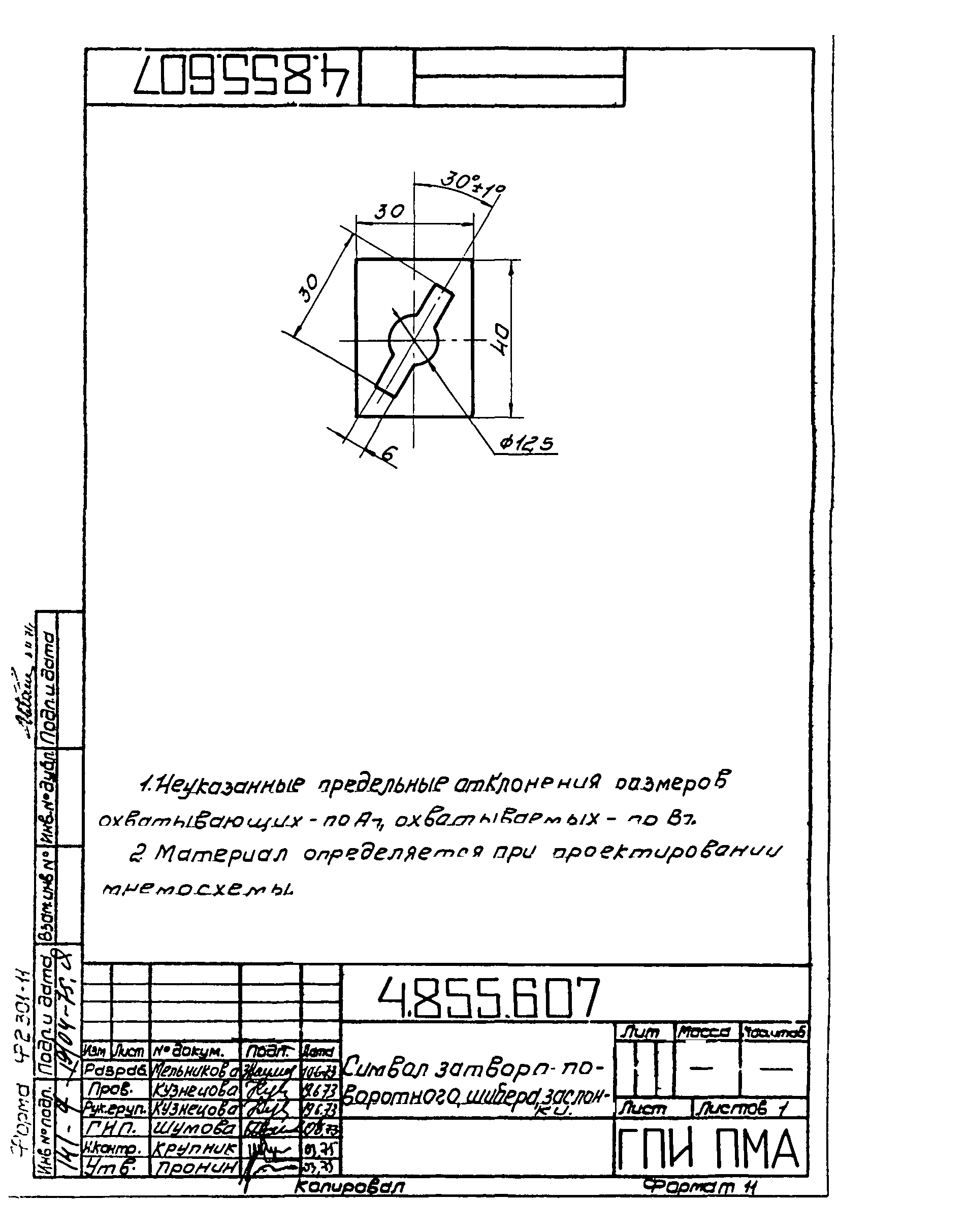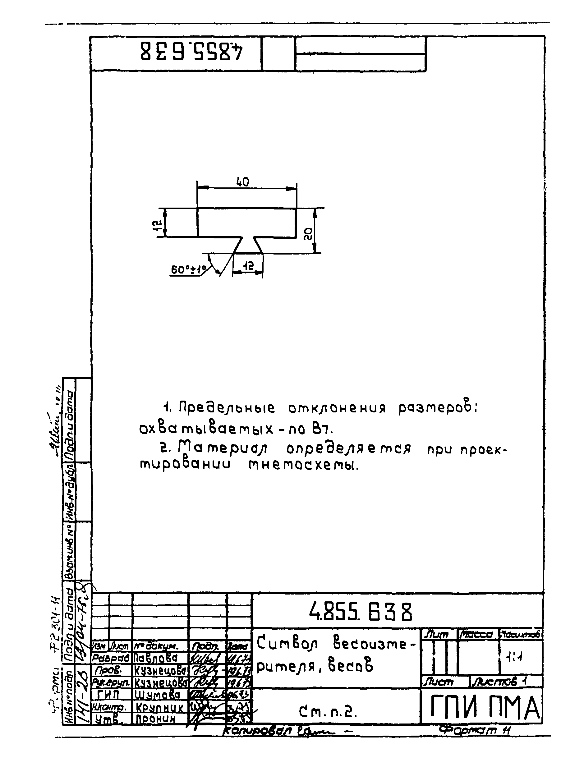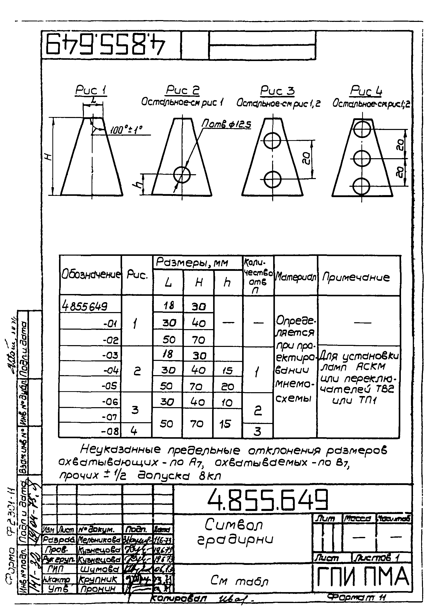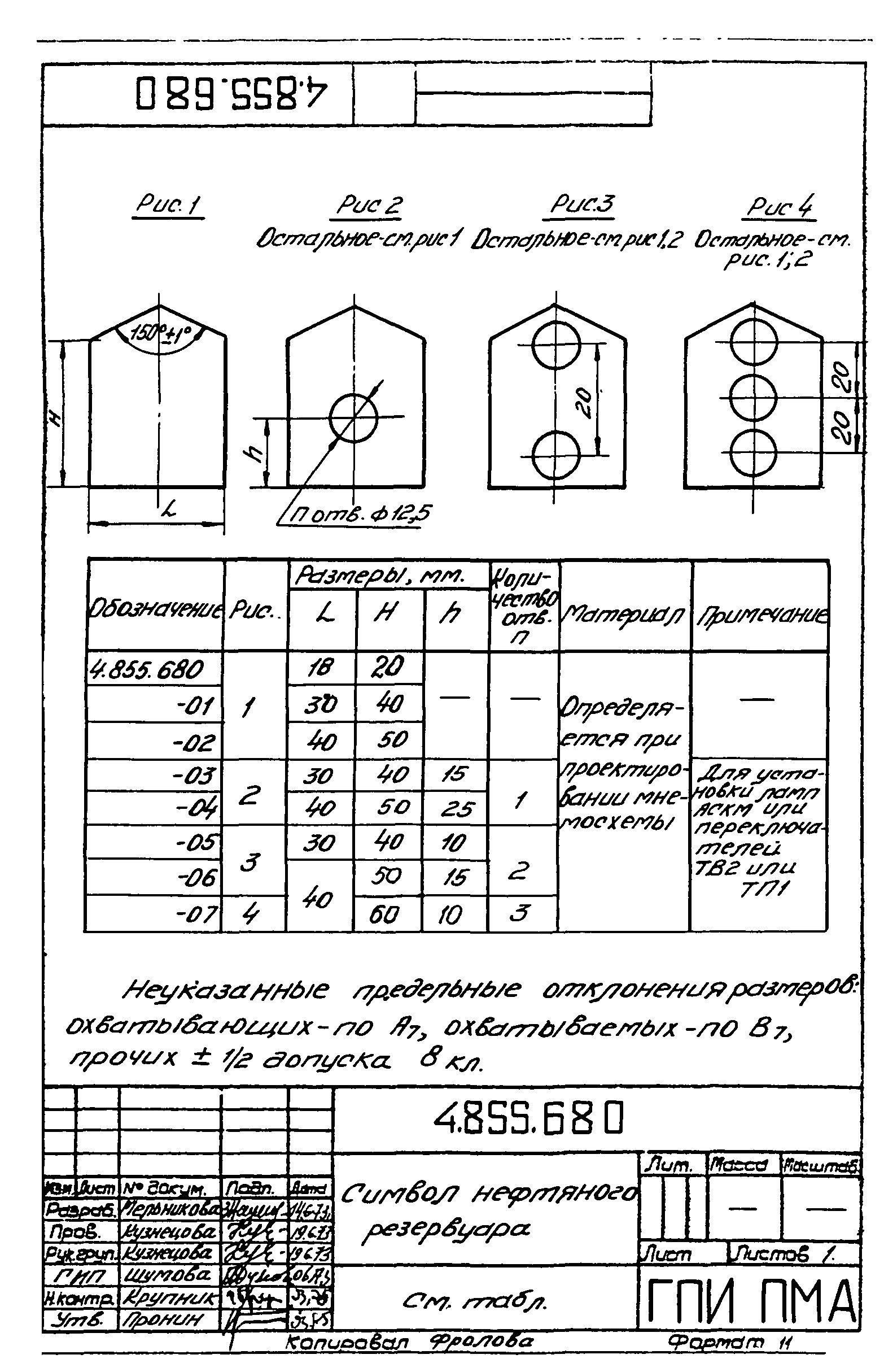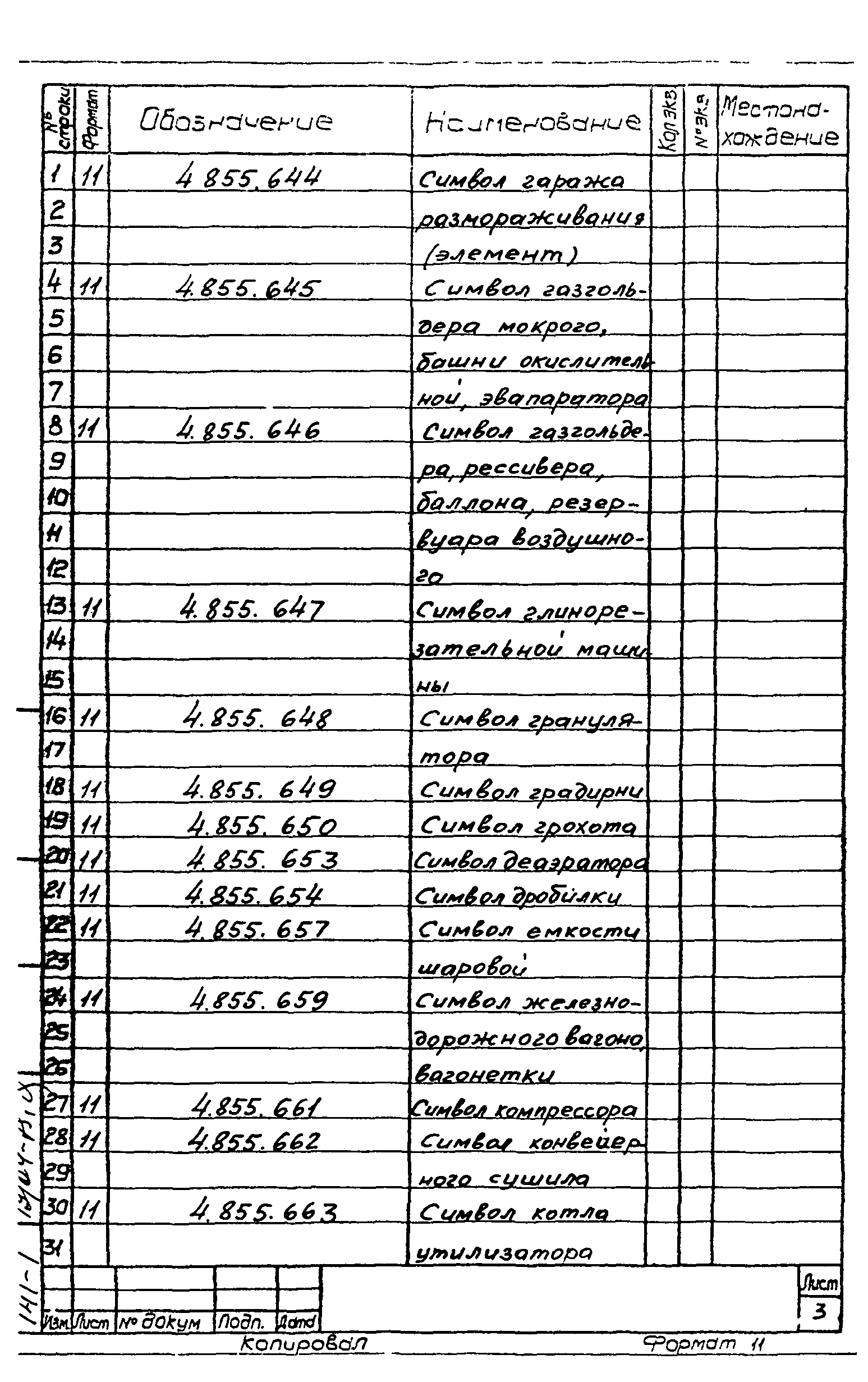 Символы элементов мнемосхем щитов и пультов управления. Рабочая документация| Статус: | действует | | Название рус.: | Символы элементов мнемосхем щитов и пультов управления. Рабочая документация | | Дата добавления в базу: | 01.09.2013 | | Дата актуализации: | 01.01.2021 | | Оглавление: | 4.855.600 Символ вентиля углового 4.855.601 Символ вентиля, прямого клапана, задвижки 4.855.602 Символ вентиля трехходового, клапана 4.855.605 Символ замера температуры 4.855.606 Символ замера уровня 4.855.607 Символ затвора поворотного, шибера, заслонки 4.855.610 Символ отбора давления 4.855.611 Символ отбора пробы 4.855.614 Символ поворота 4.855.615 Символ потока, трубопровода, транспортера, шнека 4.855.618 Символ сужающего устройства 4.855.619 Символ стрелки 4.855.622 Символ подшипника 4.855.625 Символ автоклава 4.855.626 Символ агломерационной машины 4.855.627 Символ аппарата с мешалкой 4.855.630 Символ бака емкости (вертикальной или горизонтальной) резервуара, сборника, отстойника, колонны и др. 4.855.631 Символ бассейна 4.855.632 Символ бункера сдвоенного 4.855.633 Символ бункера 4.855.636 Символ вагоноопрокидователя 4.855.637 Символ вальцового пресса 4.855.638 Символ весоизмерителя, весов 4.855.639 Символ вентилятора, дымососа, воздуходувки 4.855.640 Символ вертикального катализатора, дозатора 4.855.641 Символ воронки, емкости промежуточной 4.855.644 Символ гаража размораживания (элемент 4.855.645 Символ газгольдера мокрого, башни окислительной, эвапоратора 4.855.646 Символ газгольдера, ресивера, баллона, резервуара воздушного 4.855.647 Символ глинорезательной машины 4.855.648 Символ гранулятора 4.855.649 Символ градирни 4.855.650 Символ грохота 4.855.653 Символ деаэратора 4.855.654 Символ дробилки 4.855.657 Символ емкости шаровой 4.855.659 Символ железнодорожного вагона, вагонетки 4.855.661 Символ компрессора 4.855.662 Символ конвейерного сушила 4.855.663 Символ котла утилизатора 4.855.664 Символ котла варочного 4.855.665 Элемент символа колонны, элеватора 4.855.666 Символ контактора 4.855.667 Символ конденсатора холодильника, теплообменника, подогревателя, кипятильника, испарителя 4.855.670 Символ мельницы 4.855.671 Символ мешалки 4.855.672 Символ мерника 4.855.673 Символ моечной машины 4.855.674 Символ монжуса 4.855.677 Символ насоса шестеренчатого 4.855.678 Символ насоса центробежного 4.855.679 Символ насоса поршневого 4.855.680 Символ нефтяного резервуара 4.855.683 Символ обжиговой машины 4.855.684 Символ отсадочной машины 4.855.685 Символ печи обжига в кипящем слое 4.855.686 Символ печи 4.855.687 Символ перколятора 4.855.688 Символ питателя 4.855.689 Символ плавильника 4.855.690 Символ пресса 4.855.693 Символ реактора 4.855.694 Символ регенератора катализатора 4.855.695 Символ рекуператора 4.855.696 Символ ротаметра 4.855.699 Символ сгустителя, вакуумфильтр 4.855.700 Символ сепаратора 4.855.701 Символ скребкового кристаллизатора 4.855.702 Символ скруббера 4.855.703 Символ склада 4.855.704 Символ смесителя, скомкователя, сортировки 4.855.705 Символ сушила барабанного 4.855.706 Символ топки под давлением 4.855.707 Символ турбины 4.855.709 Символ фильтра 4.855.711 Символ флотационной машины 4.855.713 Символ холодильника кокса 4.855.715 Символ центрифуги 4.855.716 Символ цистерны 4.855.717 Символ циклона, водоотделителя, воздухоподогревателя 4.855.719 Символ шибера перекидного 4.855.721 Символ эжектора 4.855.722 Символ электродвигателя, генератора 4.855.723 Символ элеватора | | Разработан: | ГПКИ Проектмонтажавтоматика