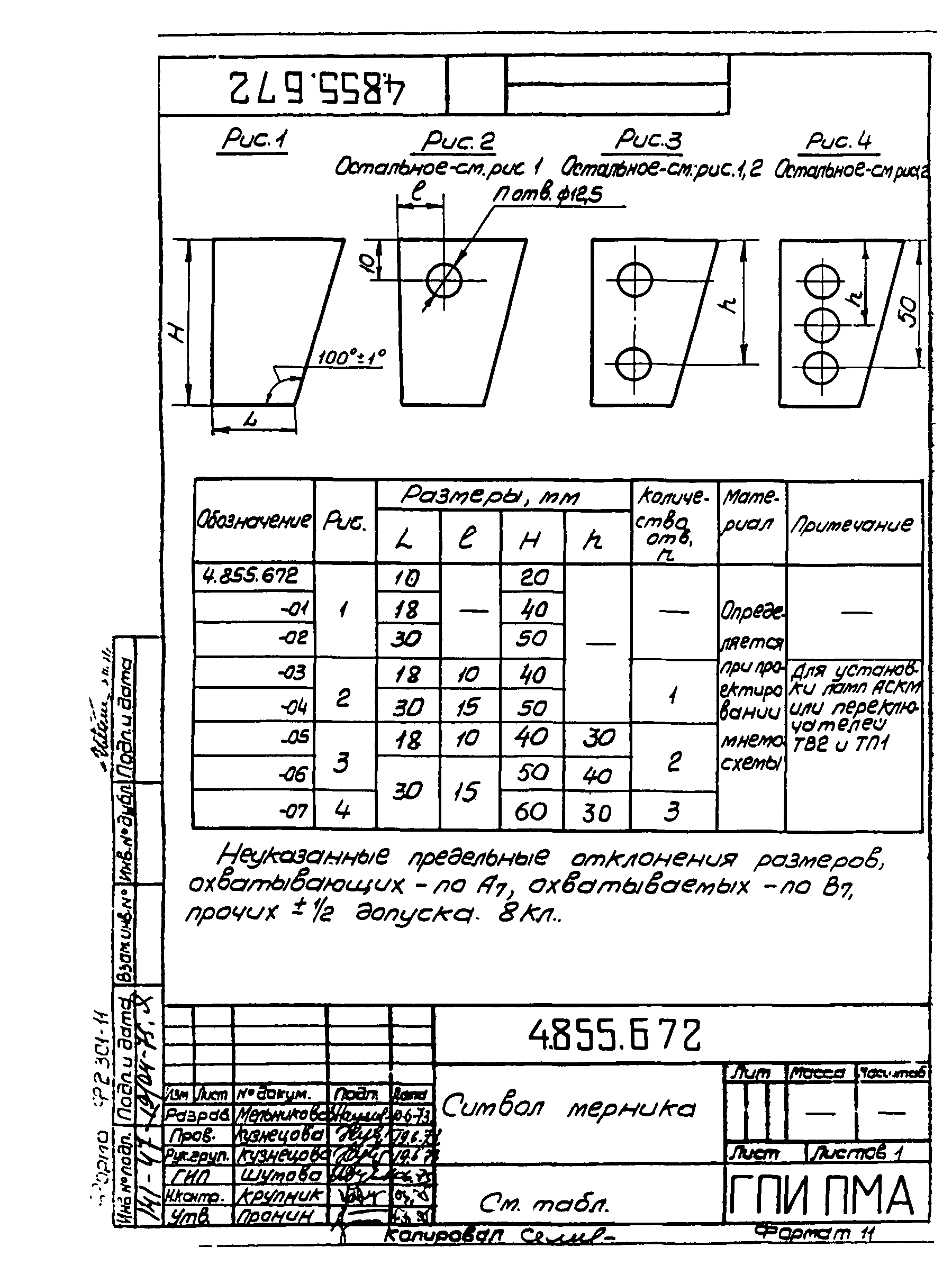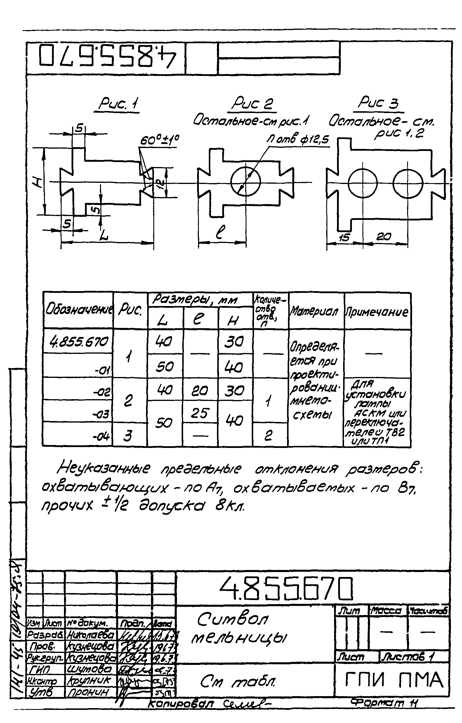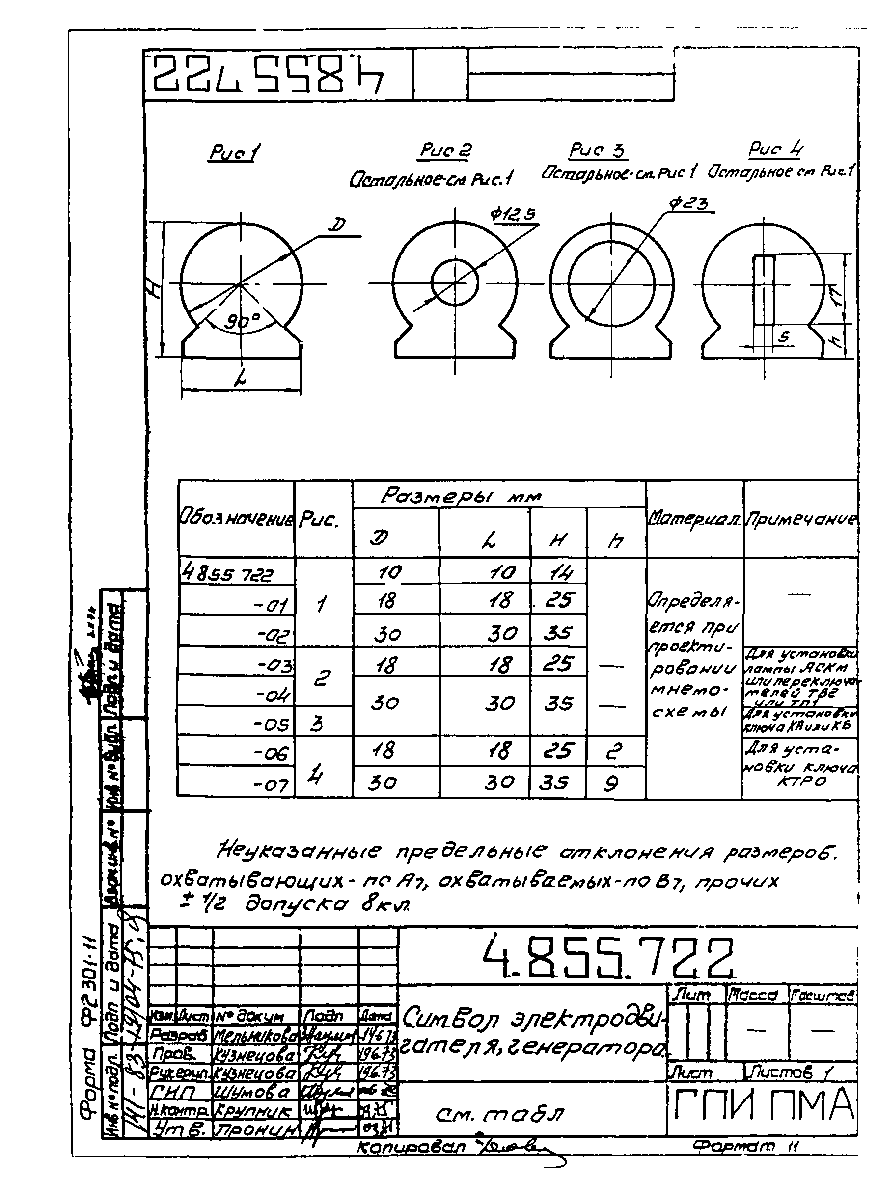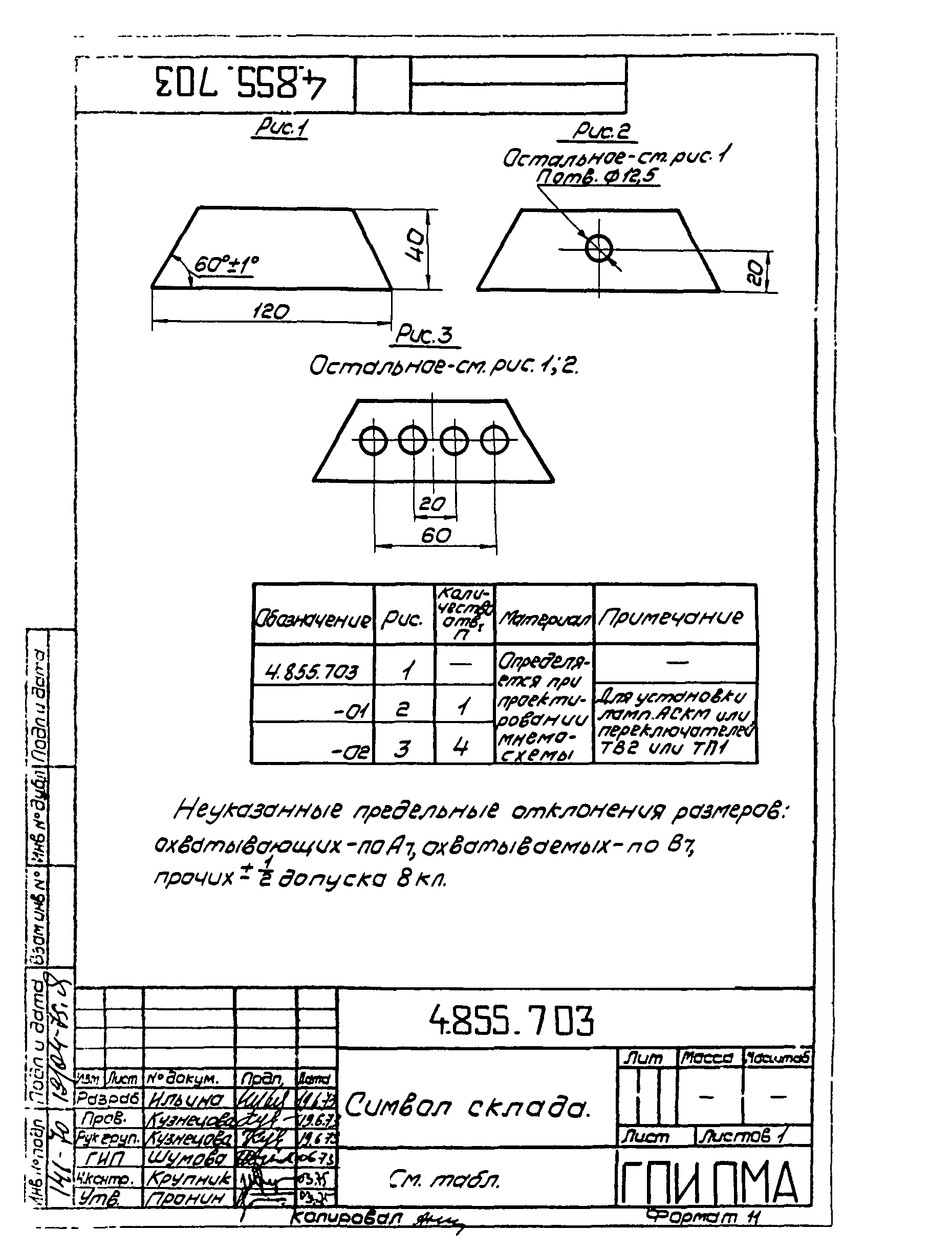 Символы элементов мнемосхем щитов и пультов управления. Рабочая документация| Статус: | действует | | Название рус.: | Символы элементов мнемосхем щитов и пультов управления. Рабочая документация | | Дата добавления в базу: | 01.09.2013 | | Дата актуализации: | 01.01.2021 | | Оглавление: | 4.855.600 Символ вентиля углового 4.855.601 Символ вентиля, прямого клапана, задвижки 4.855.602 Символ вентиля трехходового, клапана 4.855.605 Символ замера температуры 4.855.606 Символ замера уровня 4.855.607 Символ затвора поворотного, шибера, заслонки 4.855.610 Символ отбора давления 4.855.611 Символ отбора пробы 4.855.614 Символ поворота 4.855.615 Символ потока, трубопровода, транспортера, шнека 4.855.618 Символ сужающего устройства 4.855.619 Символ стрелки 4.855.622 Символ подшипника 4.855.625 Символ автоклава 4.855.626 Символ агломерационной машины 4.855.627 Символ аппарата с мешалкой 4.855.630 Символ бака емкости (вертикальной или горизонтальной) резервуара, сборника, отстойника, колонны и др. 4.855.631 Символ бассейна 4.855.632 Символ бункера сдвоенного 4.855.633 Символ бункера 4.855.636 Символ вагоноопрокидователя 4.855.637 Символ вальцового пресса 4.855.638 Символ весоизмерителя, весов 4.855.639 Символ вентилятора, дымососа, воздуходувки 4.855.640 Символ вертикального катализатора, дозатора 4.855.641 Символ воронки, емкости промежуточной 4.855.644 Символ гаража размораживания (элемент 4.855.645 Символ газгольдера мокрого, башни окислительной, эвапоратора 4.855.646 Символ газгольдера, ресивера, баллона, резервуара воздушного 4.855.647 Символ глинорезательной машины 4.855.648 Символ гранулятора 4.855.649 Символ градирни 4.855.650 Символ грохота 4.855.653 Символ деаэратора 4.855.654 Символ дробилки 4.855.657 Символ емкости шаровой 4.855.659 Символ железнодорожного вагона, вагонетки 4.855.661 Символ компрессора 4.855.662 Символ конвейерного сушила 4.855.663 Символ котла утилизатора 4.855.664 Символ котла варочного 4.855.665 Элемент символа колонны, элеватора 4.855.666 Символ контактора 4.855.667 Символ конденсатора холодильника, теплообменника, подогревателя, кипятильника, испарителя 4.855.670 Символ мельницы 4.855.671 Символ мешалки 4.855.672 Символ мерника 4.855.673 Символ моечной машины 4.855.674 Символ монжуса 4.855.677 Символ насоса шестеренчатого 4.855.678 Символ насоса центробежного 4.855.679 Символ насоса поршневого 4.855.680 Символ нефтяного резервуара 4.855.683 Символ обжиговой машины 4.855.684 Символ отсадочной машины 4.855.685 Символ печи обжига в кипящем слое 4.855.686 Символ печи 4.855.687 Символ перколятора 4.855.688 Символ питателя 4.855.689 Символ плавильника 4.855.690 Символ пресса 4.855.693 Символ реактора 4.855.694 Символ регенератора катализатора 4.855.695 Символ рекуператора 4.855.696 Символ ротаметра 4.855.699 Символ сгустителя, вакуумфильтр 4.855.700 Символ сепаратора 4.855.701 Символ скребкового кристаллизатора 4.855.702 Символ скруббера 4.855.703 Символ склада 4.855.704 Символ смесителя, скомкователя, сортировки 4.855.705 Символ сушила барабанного 4.855.706 Символ топки под давлением 4.855.707 Символ турбины 4.855.709 Символ фильтра 4.855.711 Символ флотационной машины 4.855.713 Символ холодильника кокса 4.855.715 Символ центрифуги 4.855.716 Символ цистерны 4.855.717 Символ циклона, водоотделителя, воздухоподогревателя 4.855.719 Символ шибера перекидного 4.855.721 Символ эжектора 4.855.722 Символ электродвигателя, генератора 4.855.723 Символ элеватора | | Разработан: | ГПКИ Проектмонтажавтоматика