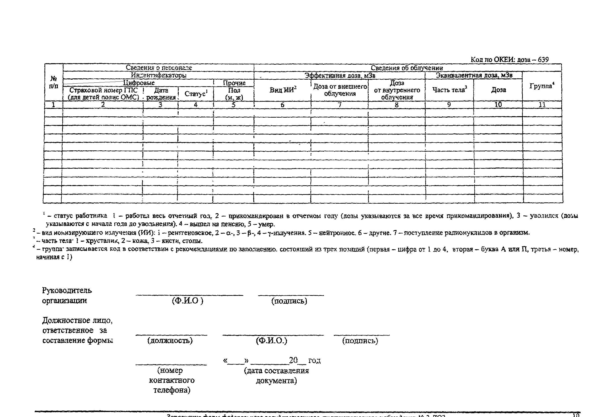 | Область применения: | Методические рекомендации определяют порядок заполнения формы федерального государственного статистического наблюдения N 2-ДОЗ "Сведения о дозах облучения лиц из персонала в условиях радиационной аварии или планируемого повышенного облучения, а также лиц из населения, подвергшегося аварийному облучению". |