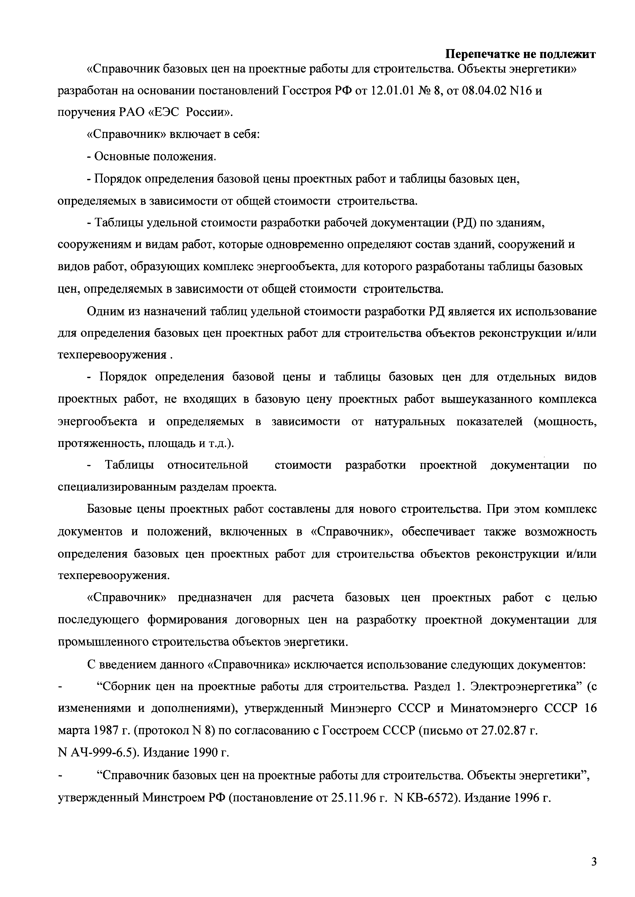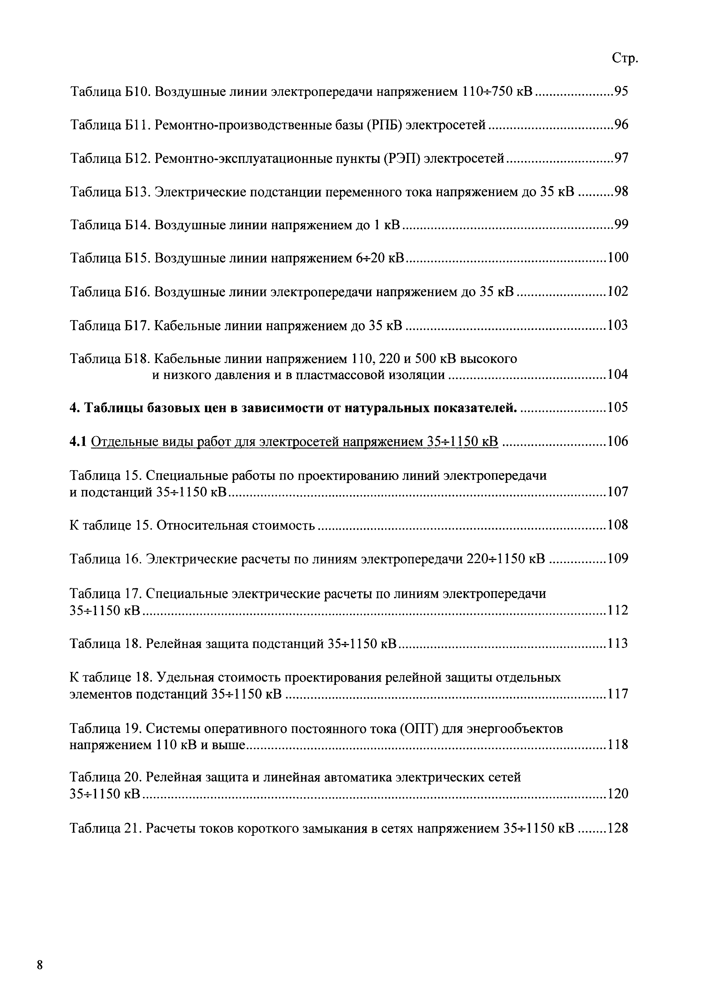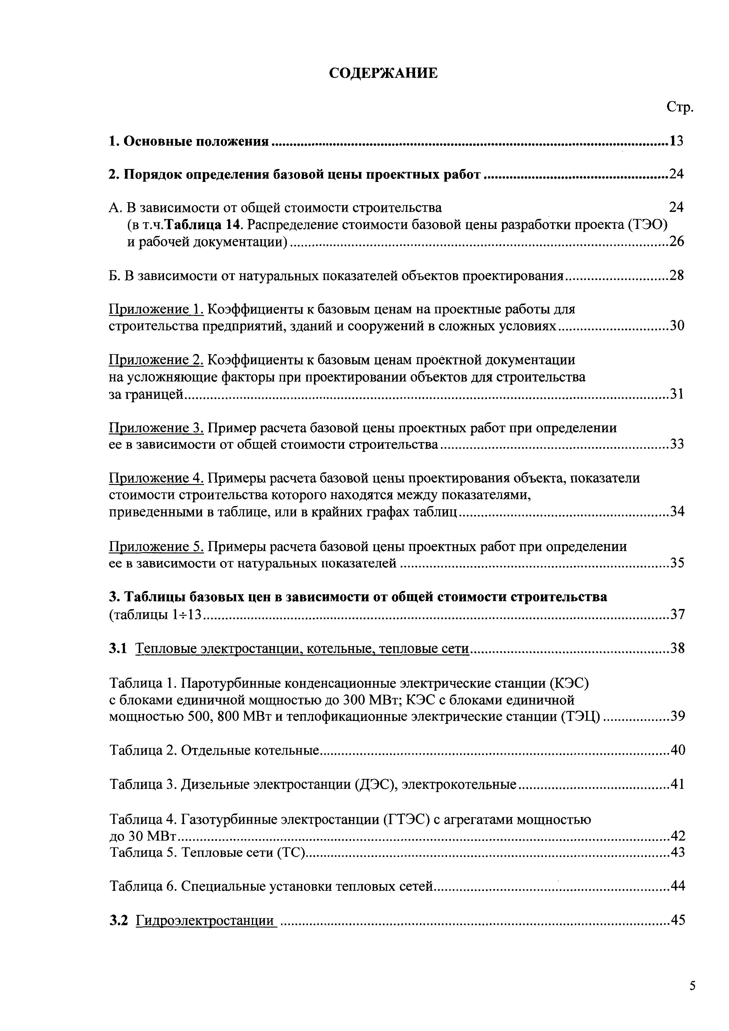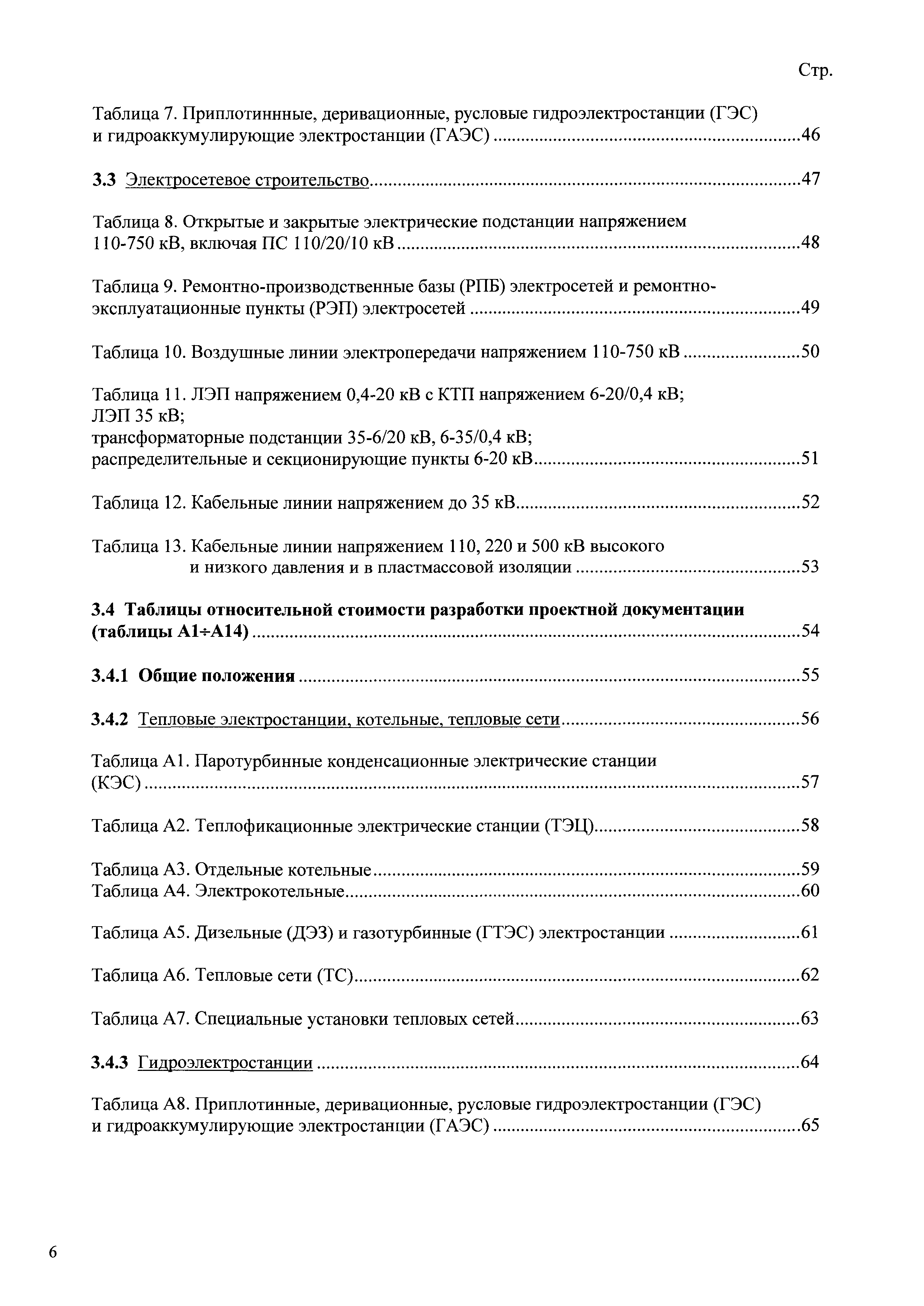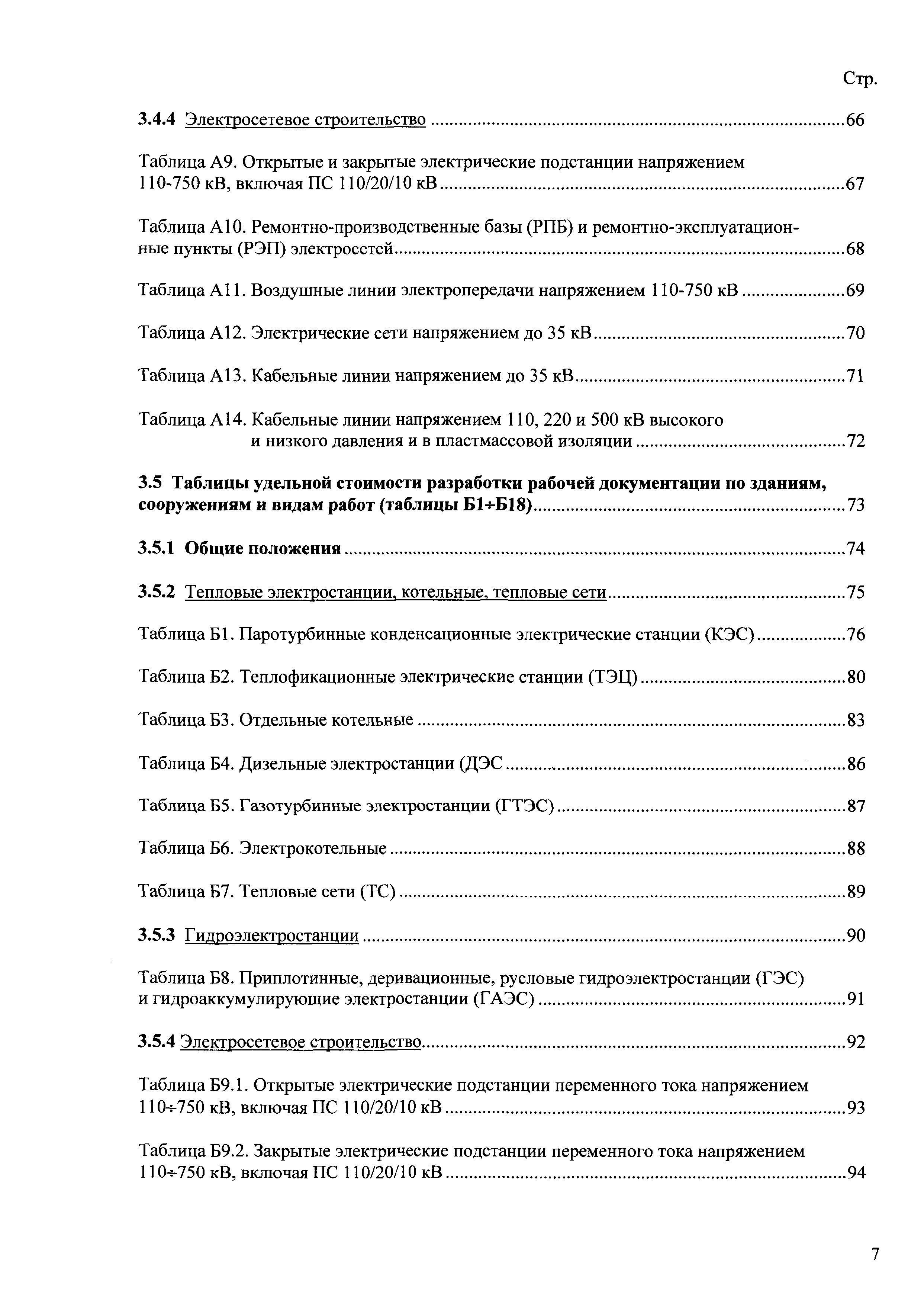 | Оглавление: | 1 Основные положения 2 Порядок определения базовой цены проектных работ 3 Таблицы базовых цен в зависимости от общей стоимости строительства 3.1 Тепловые электростанции, котельные, тепловые пункты 3.2 Гидроэлектростанции 3.3 Электросетевое строительство 3.4 Таблицы относительной стоимости разработки проектной документации 3.5 Таблицы удельной стоимости разработки рабочей документации по зданиям, сооружениям и видам работ 4 Таблицы базовых цен в зависимости от натуральных показателей 4.1 Отдельные виды работ для электросетей напряжением 35-1150 кВ 4.2 Отдельные виды работ для электросетей напряжением до 20 кВ 4.3 Метоприятия, связанные с подготовкой водохранилищ и нижнего бьефа 4.4 Сооружения инженерной защиты сельскохозяйственных низин, населенных пунктов, городов и промышленных предприятий 4.5 Буровзрывные работы в строительстве 4.6 Подземные сооружения энергетических объектов 4.7 Специальные работы в энергетическом строительстве |