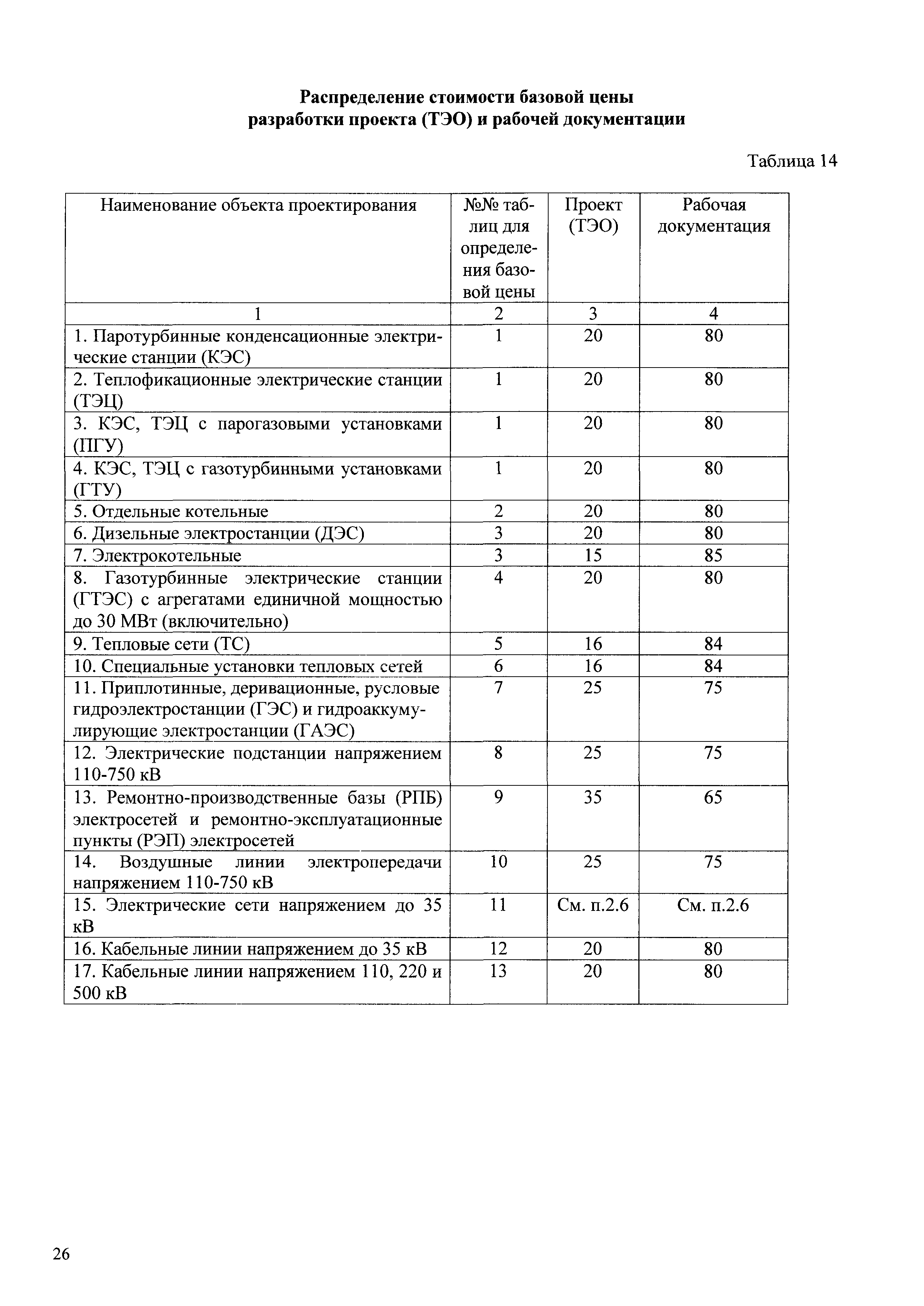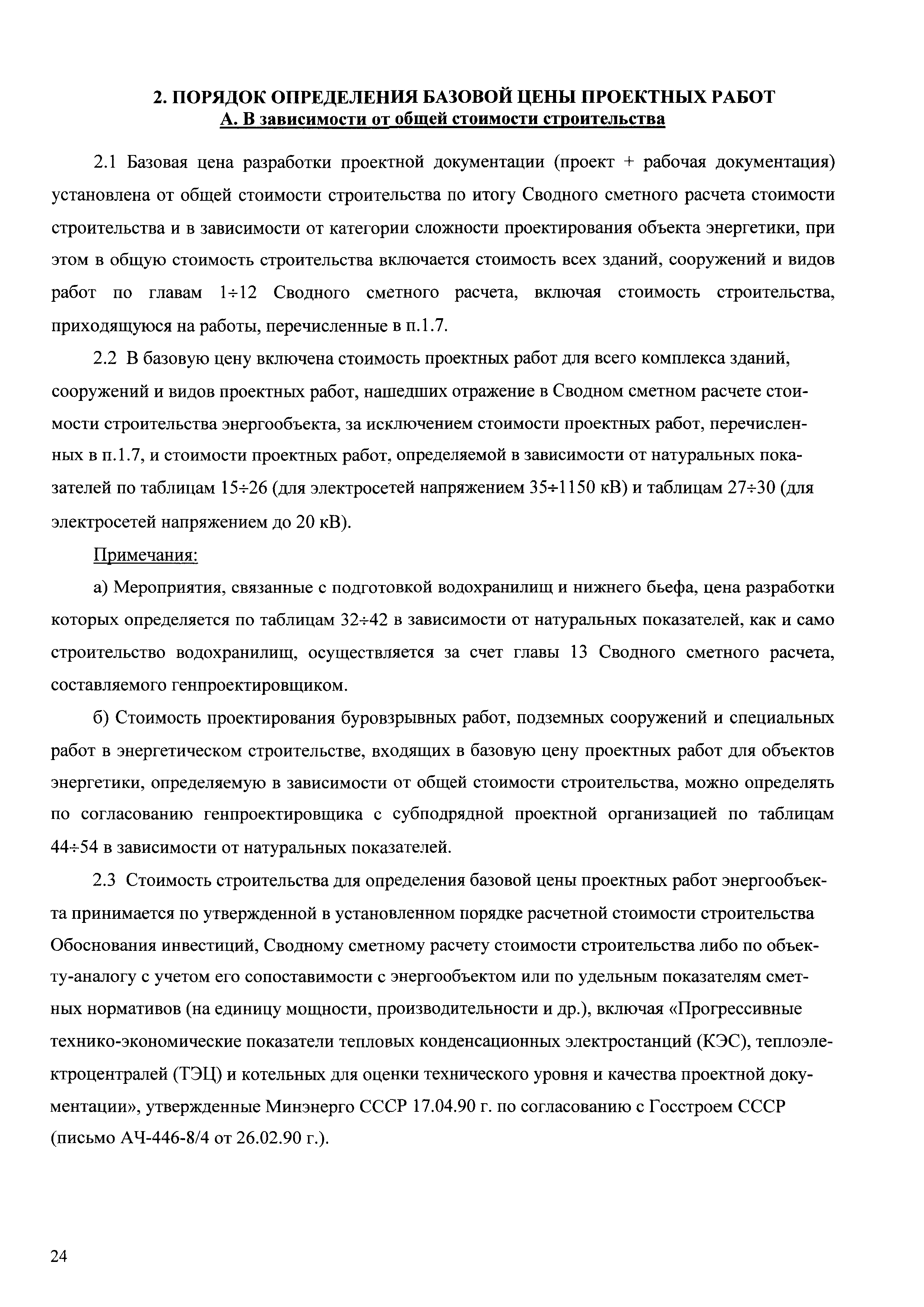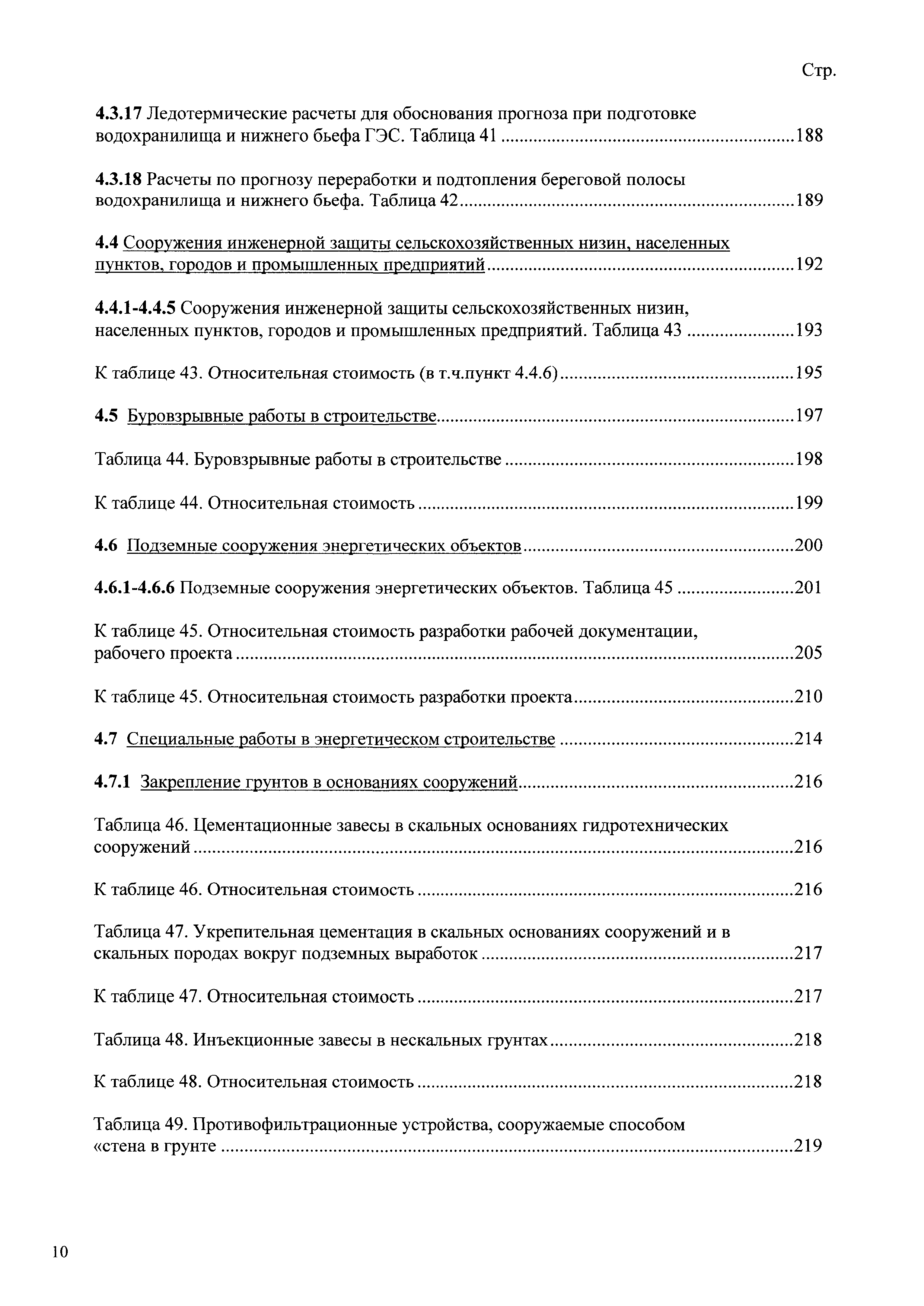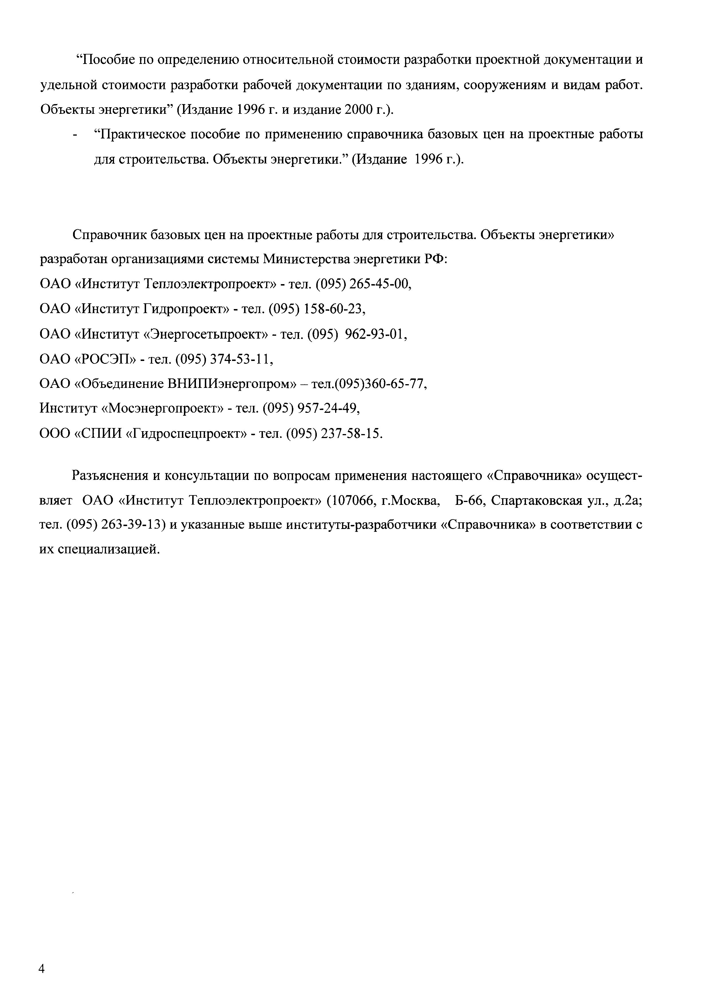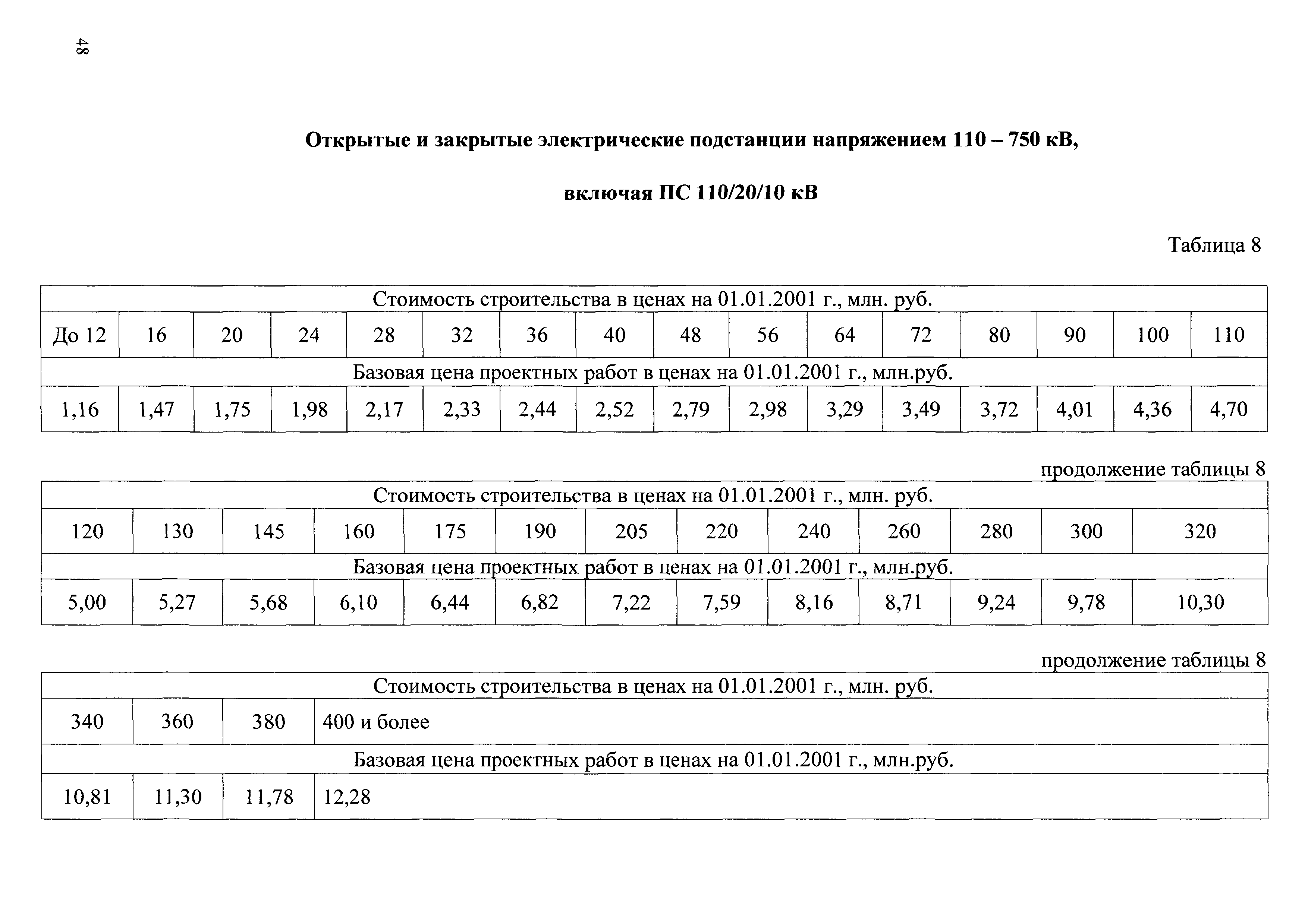 | Оглавление: | 1 Основные положения 2 Порядок определения базовой цены проектных работ 3 Таблицы базовых цен в зависимости от общей стоимости строительства 3.1 Тепловые электростанции, котельные, тепловые пункты 3.2 Гидроэлектростанции 3.3 Электросетевое строительство 3.4 Таблицы относительной стоимости разработки проектной документации 3.5 Таблицы удельной стоимости разработки рабочей документации по зданиям, сооружениям и видам работ 4 Таблицы базовых цен в зависимости от натуральных показателей 4.1 Отдельные виды работ для электросетей напряжением 35-1150 кВ 4.2 Отдельные виды работ для электросетей напряжением до 20 кВ 4.3 Метоприятия, связанные с подготовкой водохранилищ и нижнего бьефа 4.4 Сооружения инженерной защиты сельскохозяйственных низин, населенных пунктов, городов и промышленных предприятий 4.5 Буровзрывные работы в строительстве 4.6 Подземные сооружения энергетических объектов 4.7 Специальные работы в энергетическом строительстве |