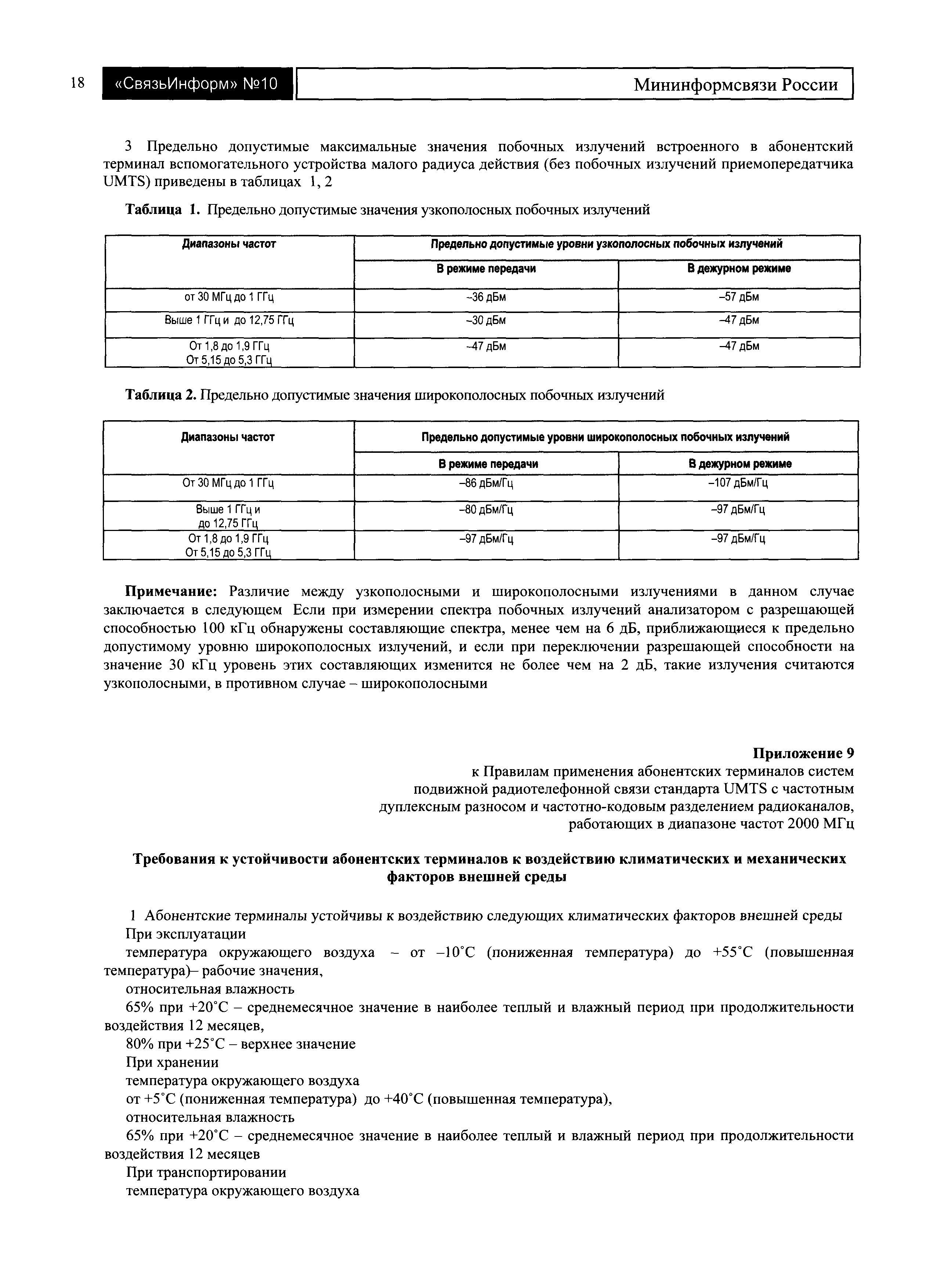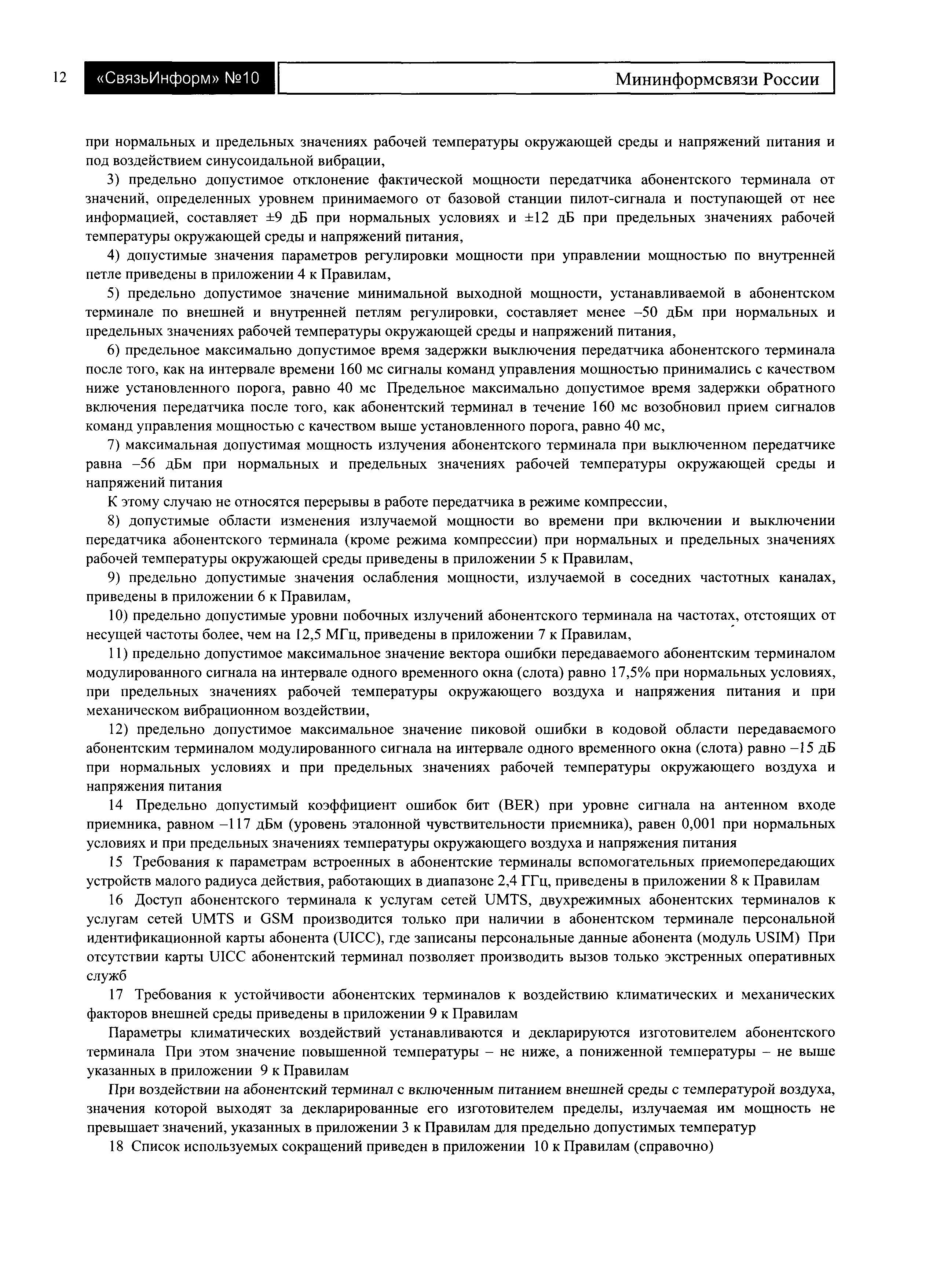 | Оглавление: | I. Общие положения II. Требования к применению абонентских терминалов в сети подвижной радиотелефонной связи стандарта UMTS III. Требования к параметрам абонентских терминалов UMTS Приложение № 1. Типы оборудования, относящегося к абонентским терминалам стандарта UMTS Приложение № 2. Требования к характеристикам радиоинтерфейса системы подвижной радиотелефонной связи стандарта UMTS Приложение № 3. Значения предельно допустимой максимальной мощности для разных классов абонентских терминалов по мощности Приложение № 4. Допустимые значения параметров регулировки мощности при управлении мощностью по внутренней петле Приложение № 5. Допустимые области изменения излучаемой мощности во времени при включении и выключении передатчика абонентского терминала (кроме режима компрессии) при нормальных и предельных значениях рабочей температуры окружающей среды Приложение № 6. Предельно допустимые значения ослабления мощности, излучаемой в соседних частотных каналах Приложение № 7. Предельно допустимые уровни побочных излучений абонентского терминала на частотах, отстоящих от несущей частоты более, чем на 12,5 МГц Приложение № 8. Требования к параметрам встроенных в абонентские терминалы вспомогательных приемопередающих устройств малого радиуса действия, работающих в диапазоне 2,4 ГГц Приложение № 9. Требования к устойчивости абонентских терминалов к воздействию климатических и механических факторов внешней среды |